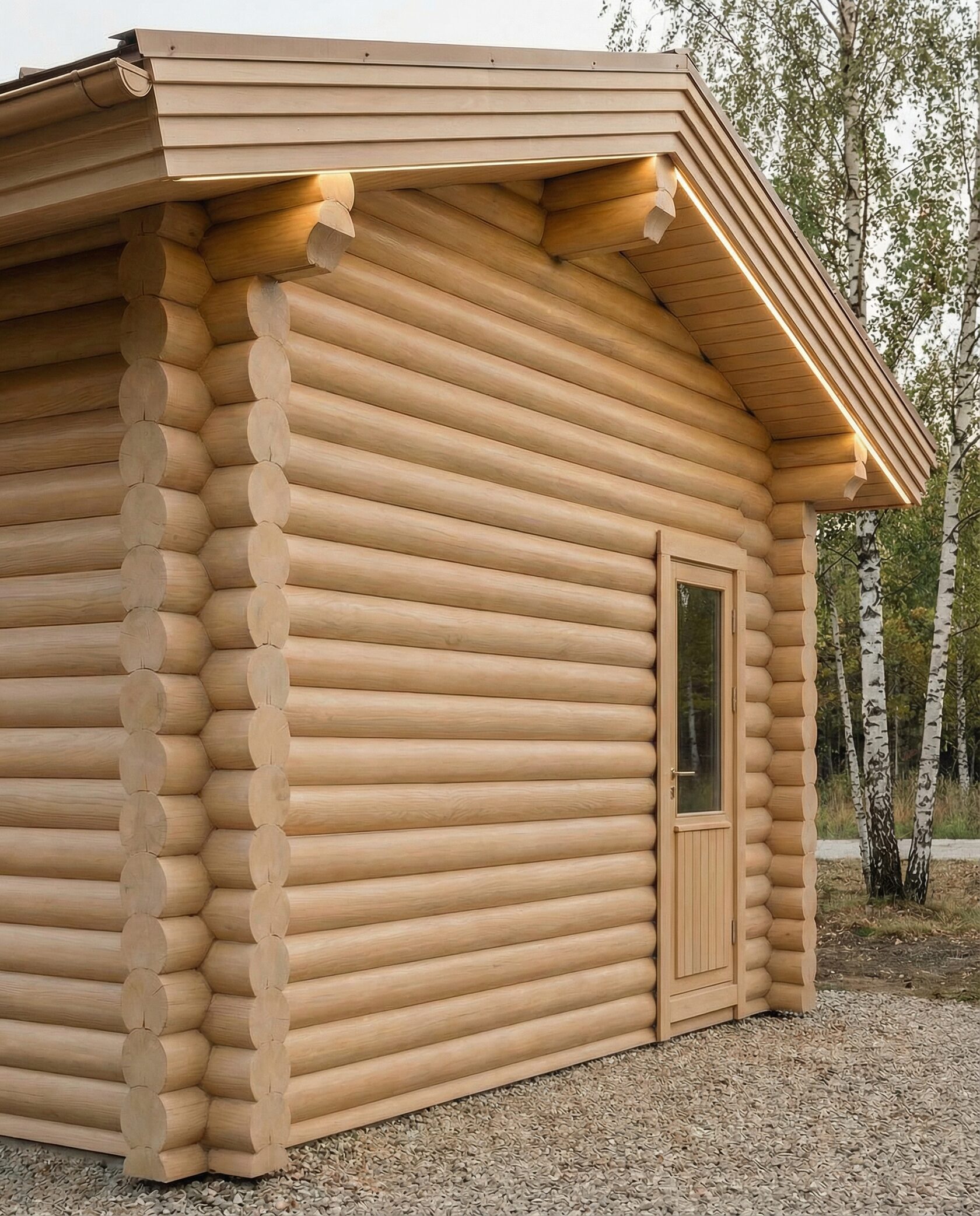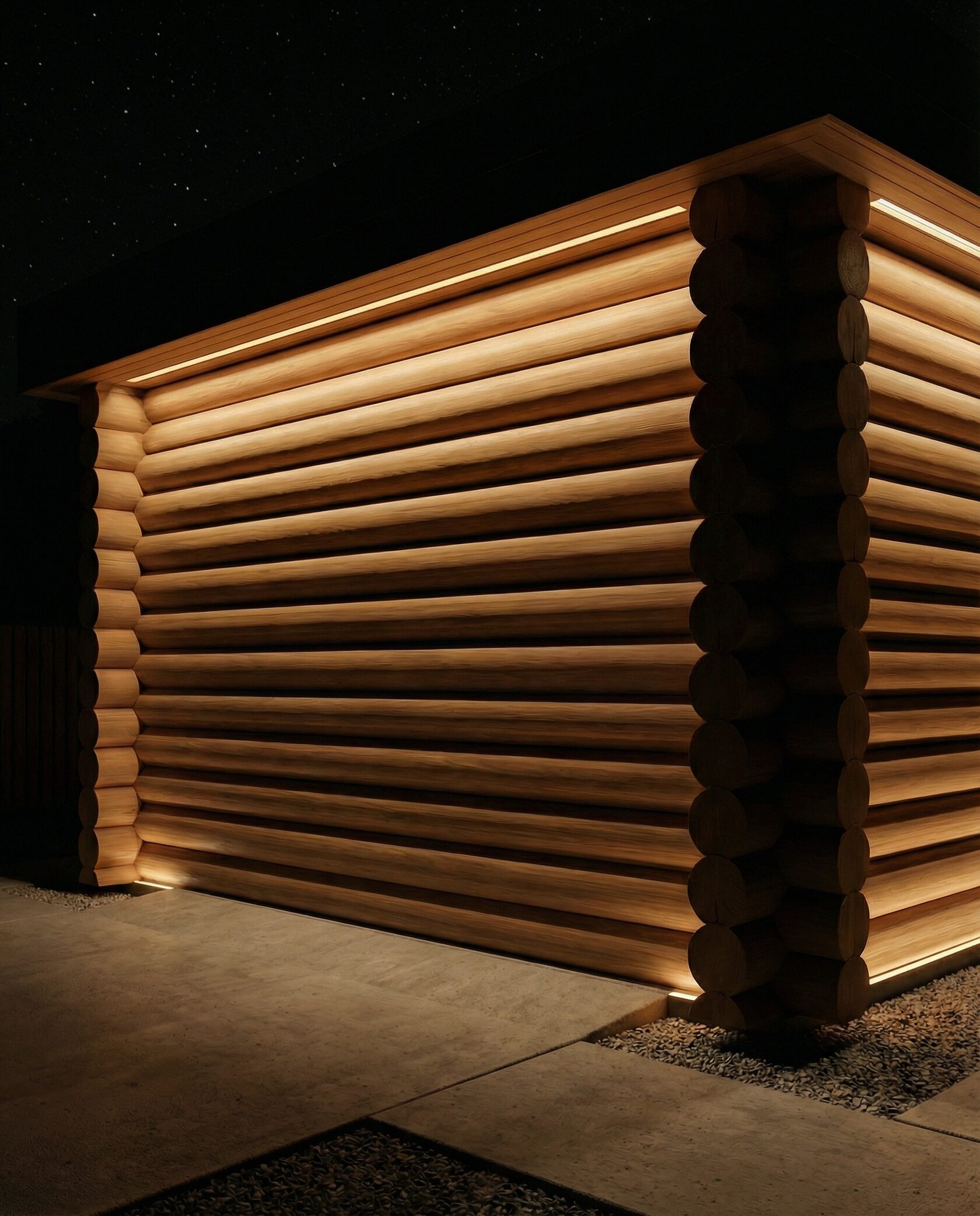 Гараж «Затаи» — компактный и надёжный гараж из цельного бревна с современным минималистичным фасадом. Подходит для хранения автомобиля, инструментов и организации рабочего пространства. Преимущества: функциональность, утепление, автоматические ворота, натуральные материалы и долговечность.