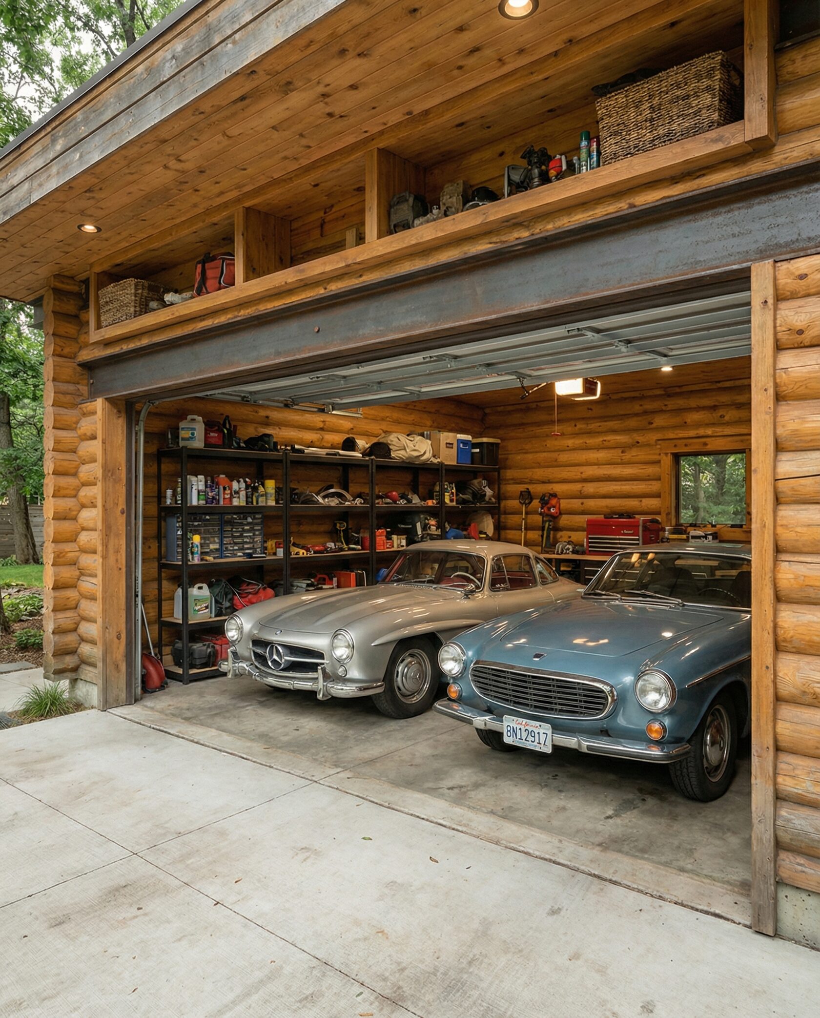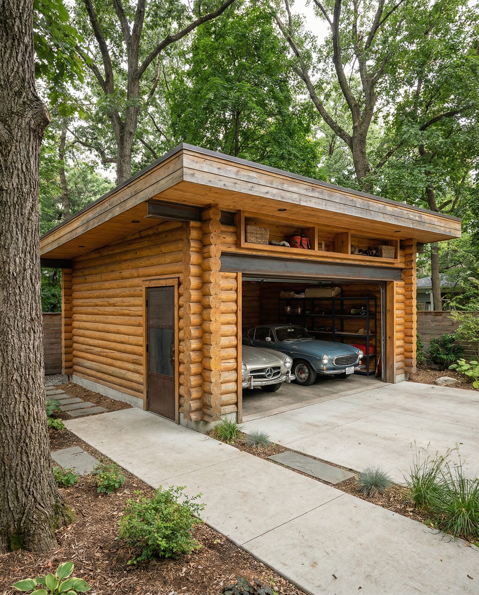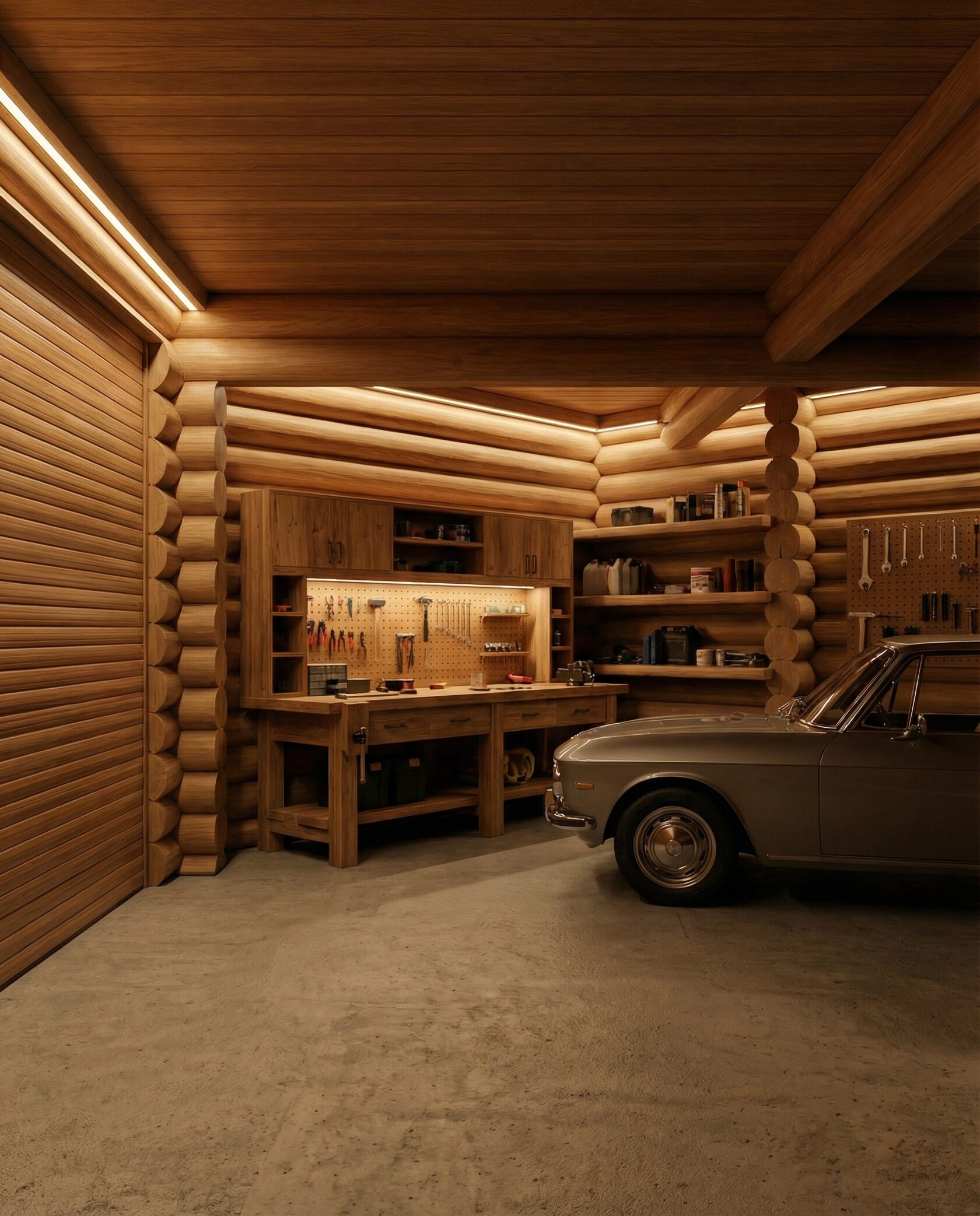 Гараж «Заполье» — современный гараж с лаконичной архитектурой и отделкой из оцилиндрованного бревна. Просторное помещение с естественным освещением подходит для автомобиля, мастерской и хранения. Преимущества: строгий дизайн, функциональная планировка, натуральные материалы, удобство и долговечность.
