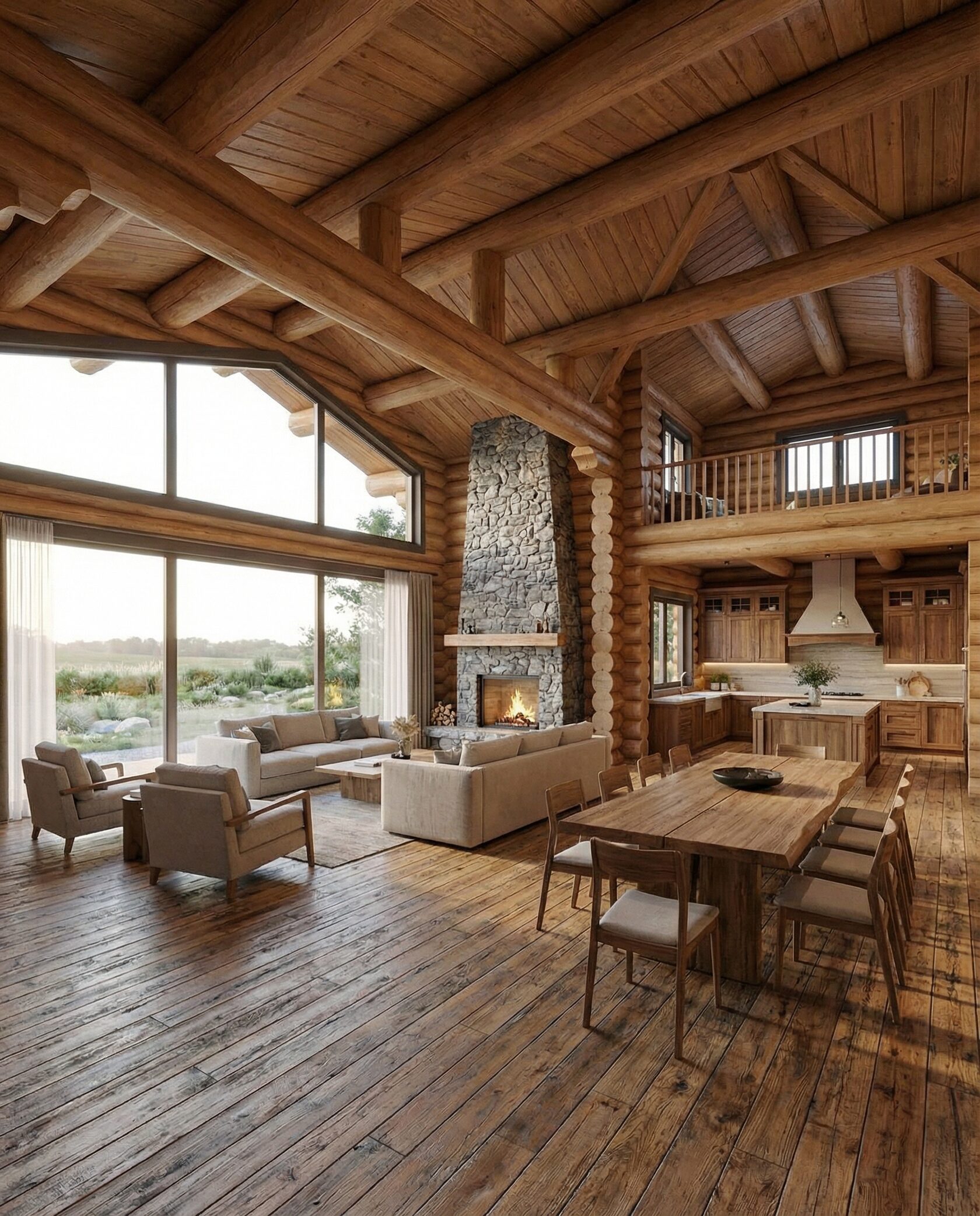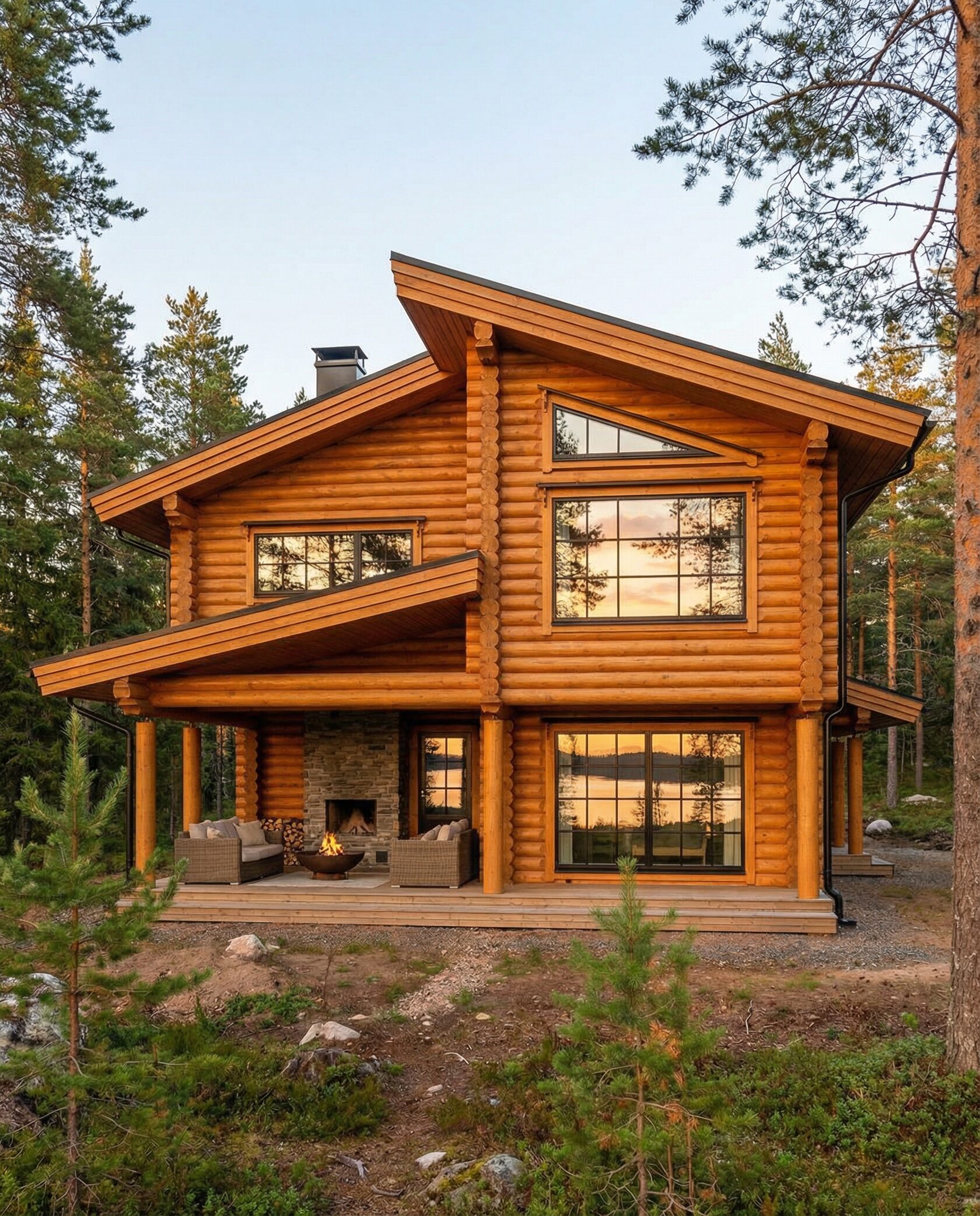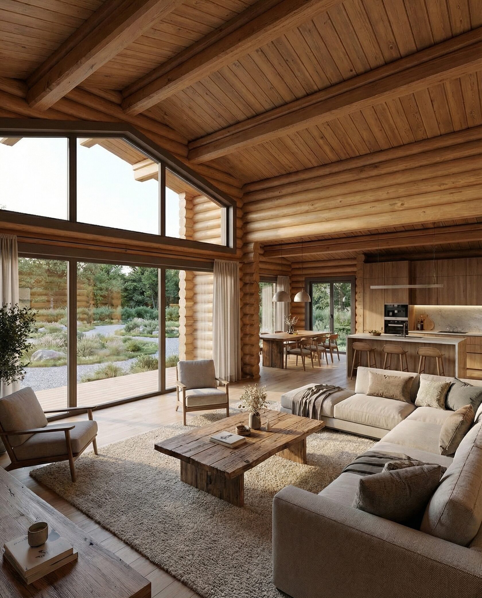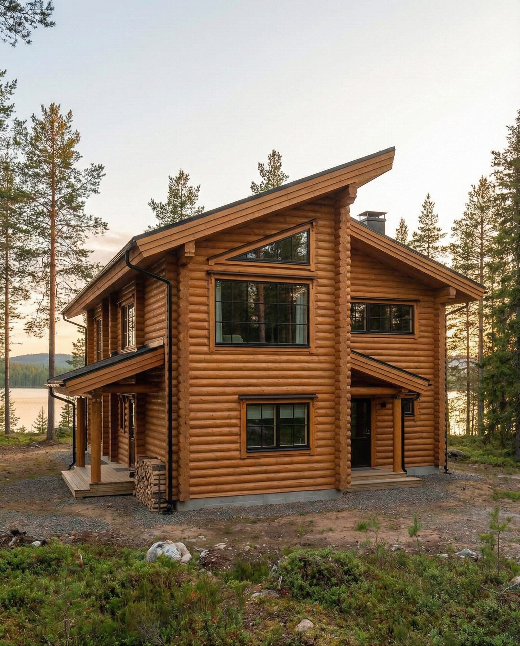 Дом «Алиот» — премиальный двухэтажный дом из оцилиндрованного бревна, где гармонично сочетаются эко-эстетика, свет, простор и технологичность. Панорамные окна на два этажа наполняют интерьер естественным светом и объединяют гостиную с природой, а камин создаёт уютный центр дома. Планировка продумана для максимального комфорта: двусветное пространство, открытая кухня с островом, просторные спальни с балконами, функциональное зонирование и стильные архитектурные элементы. Преимущества: долговечное оцилиндрованное бревно, энергоэффективные окна, шумоизоляция, просторные террасы, экологичные материалы и престижный современный дизайн. Дом «Алиот» — выбор для тех, кто ценит премиальный комфорт, простор и близость к природе.