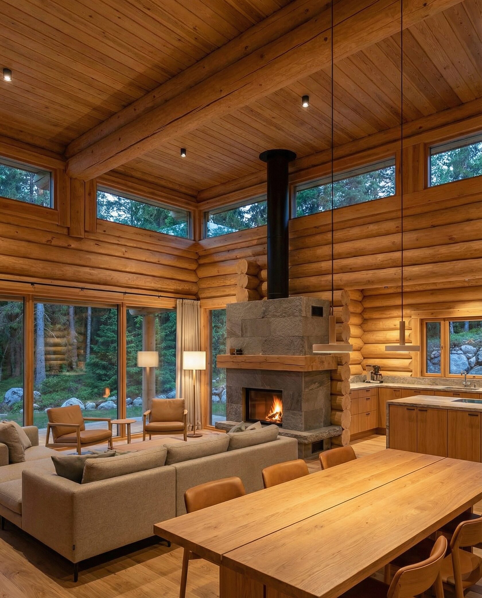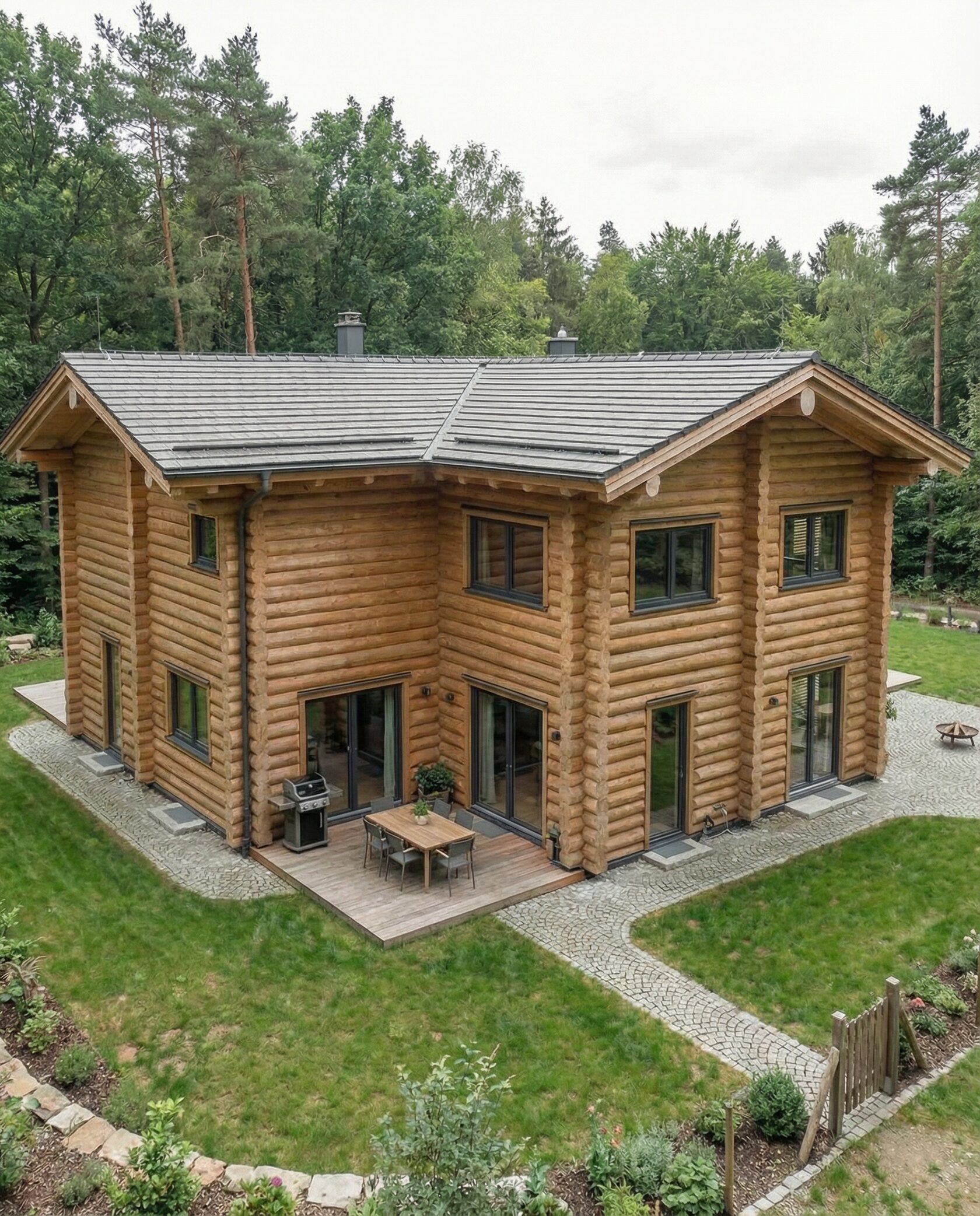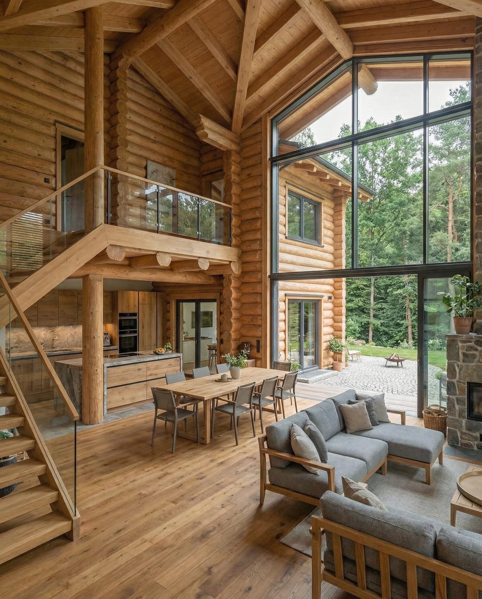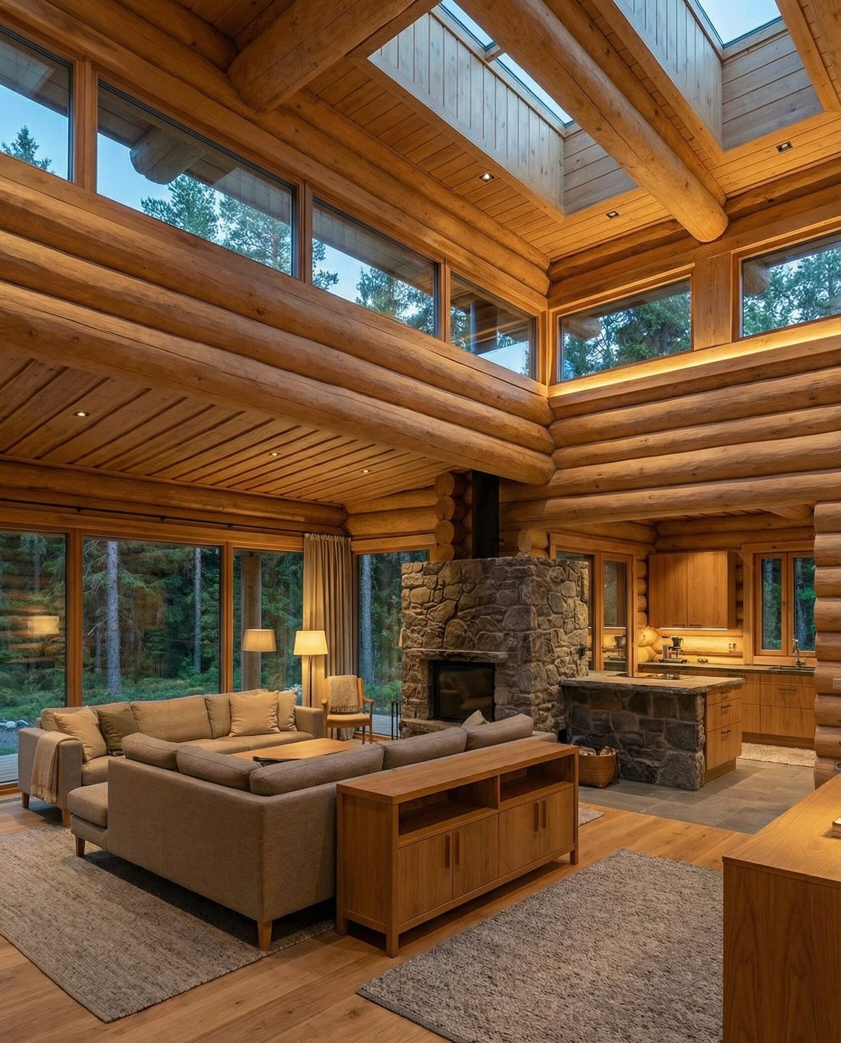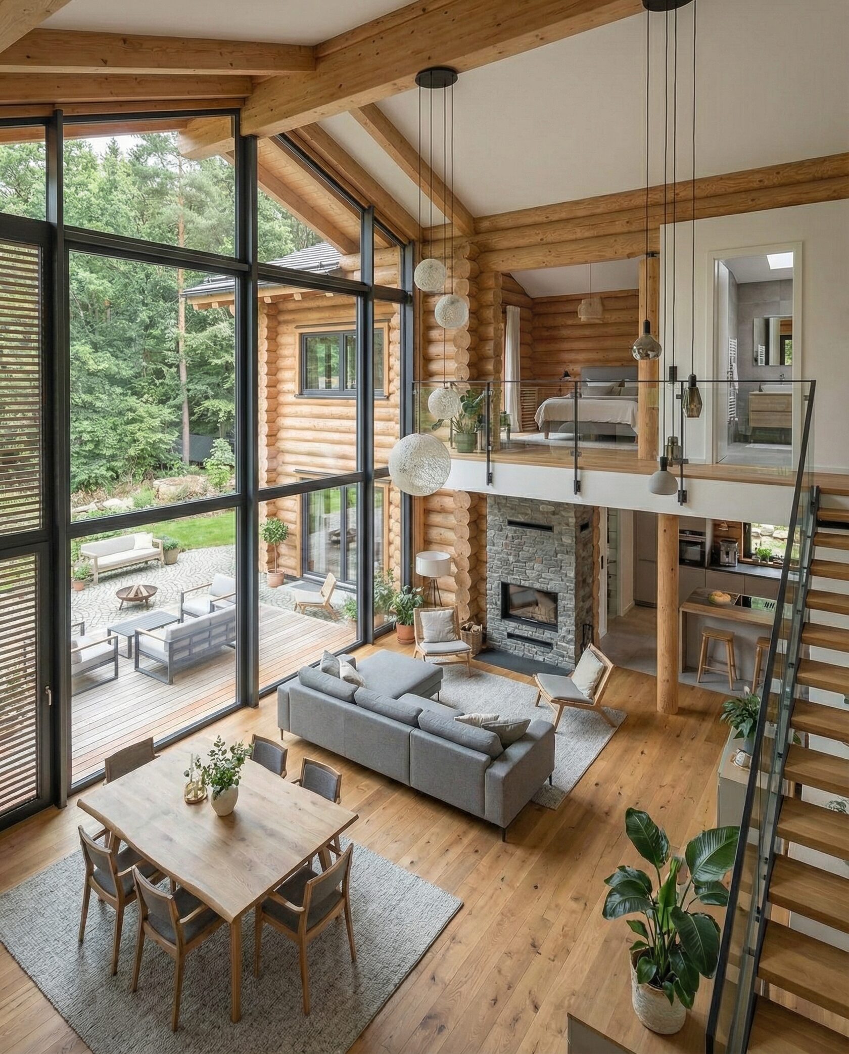 Дом «Алиот» — премиальный двухэтажный дом из оцилиндрованного бревна, где гармонично сочетаются эко-эстетика, свет, простор и технологичность. Панорамные окна на два этажа наполняют интерьер естественным светом и объединяют гостиную с природой, а камин создаёт уютный центр дома. Планировка продумана для максимального комфорта: двусветное пространство, открытая кухня с островом, просторные спальни с балконами, функциональное зонирование и стильные архитектурные элементы. Преимущества: долговечное оцилиндрованное бревно, энергоэффективные окна, шумоизоляция, просторные террасы, экологичные материалы и престижный современный дизайн. Дом «Алиот» — выбор для тех, кто ценит премиальный комфорт, простор и близость к природе.