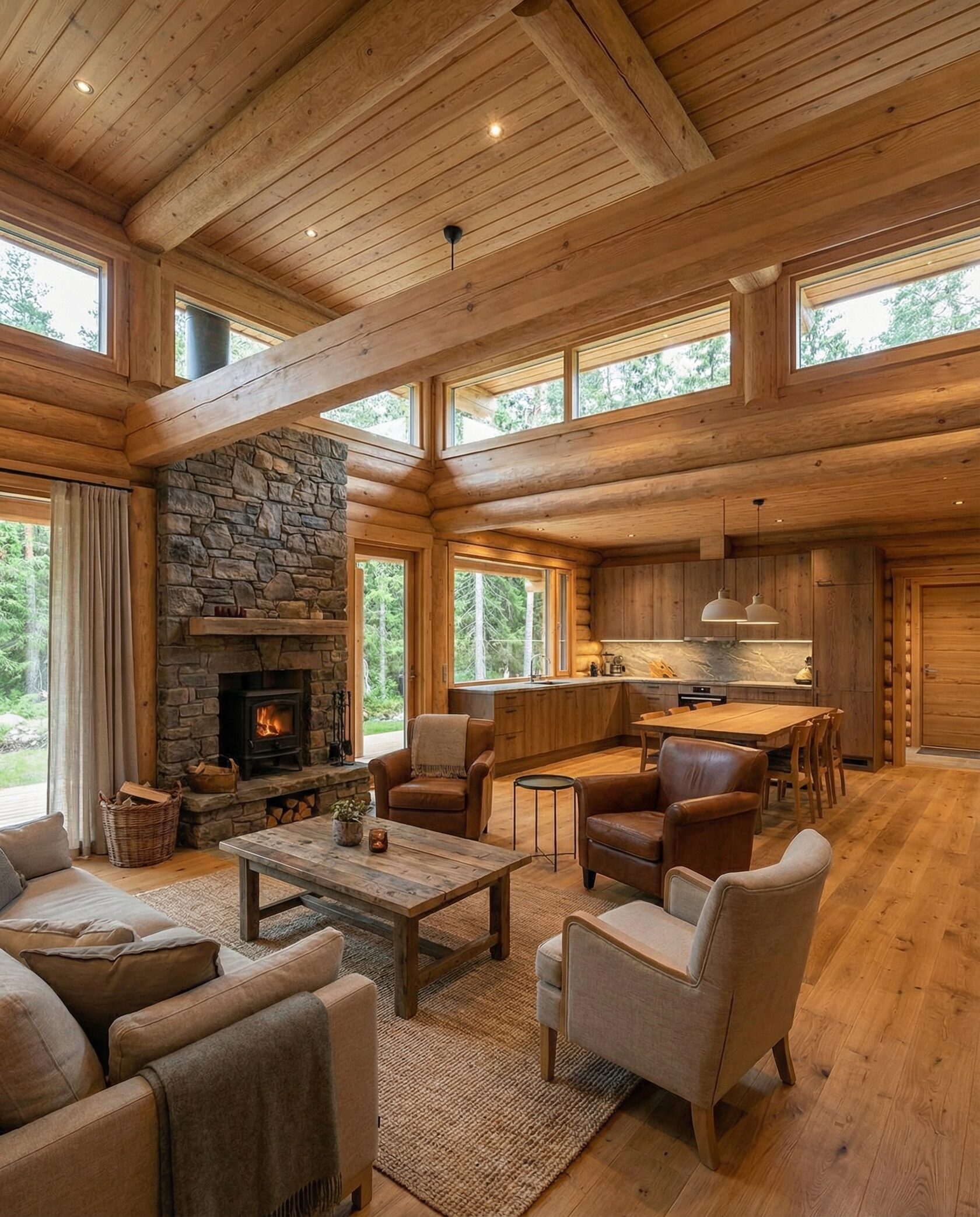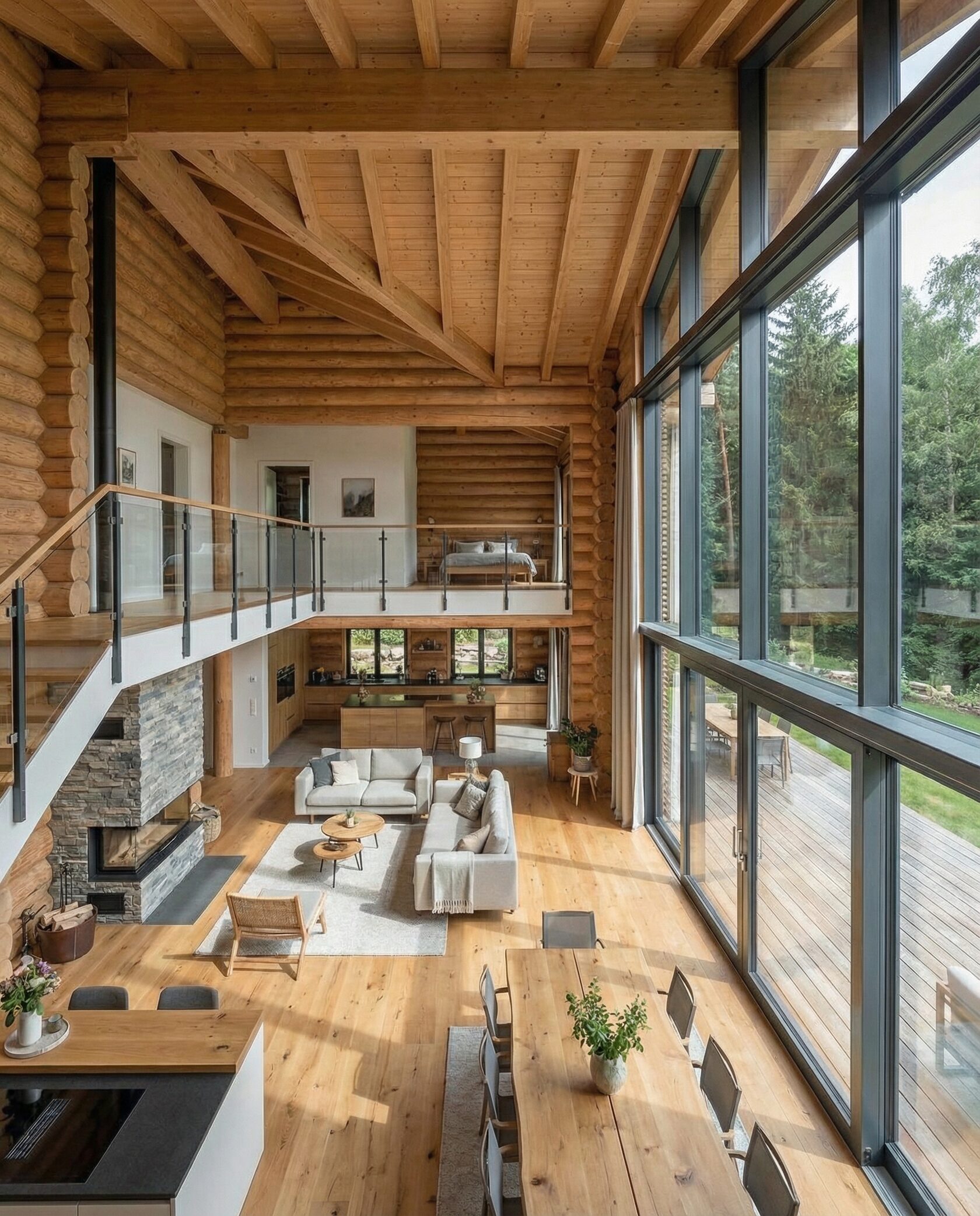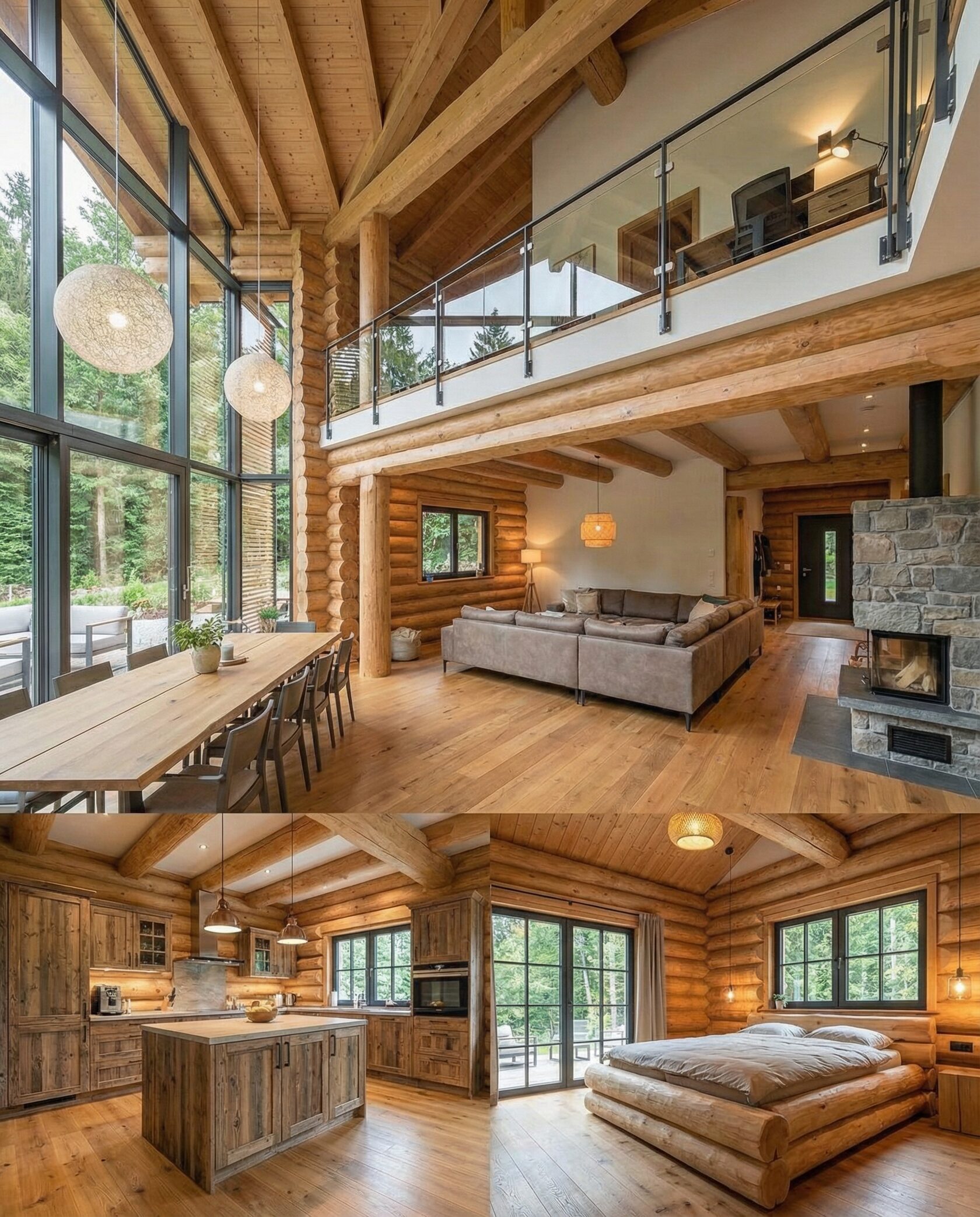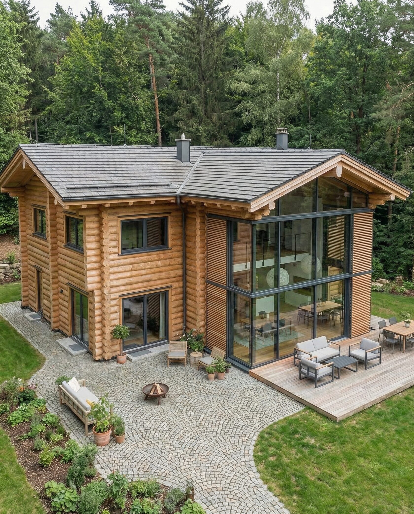 Дом «Алиот» — премиальный двухэтажный дом из оцилиндрованного бревна, где гармонично сочетаются эко-эстетика, свет, простор и технологичность. Панорамные окна на два этажа наполняют интерьер естественным светом и объединяют гостиную с природой, а камин создаёт уютный центр дома. Планировка продумана для максимального комфорта: двусветное пространство, открытая кухня с островом, просторные спальни с балконами, функциональное зонирование и стильные архитектурные элементы. Преимущества: долговечное оцилиндрованное бревно, энергоэффективные окна, шумоизоляция, просторные террасы, экологичные материалы и престижный современный дизайн. Дом «Алиот» — выбор для тех, кто ценит премиальный комфорт, простор и близость к природе.