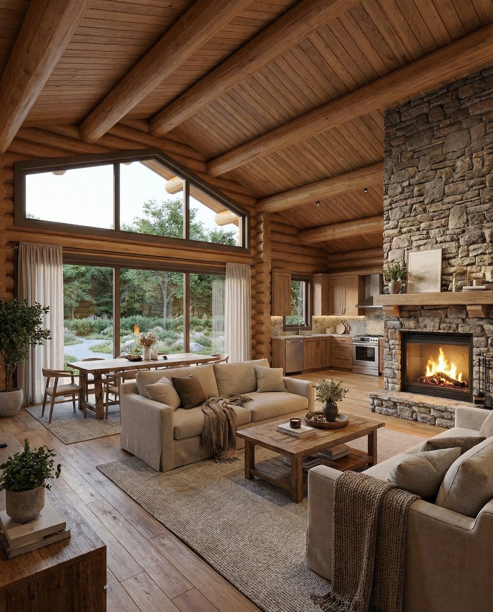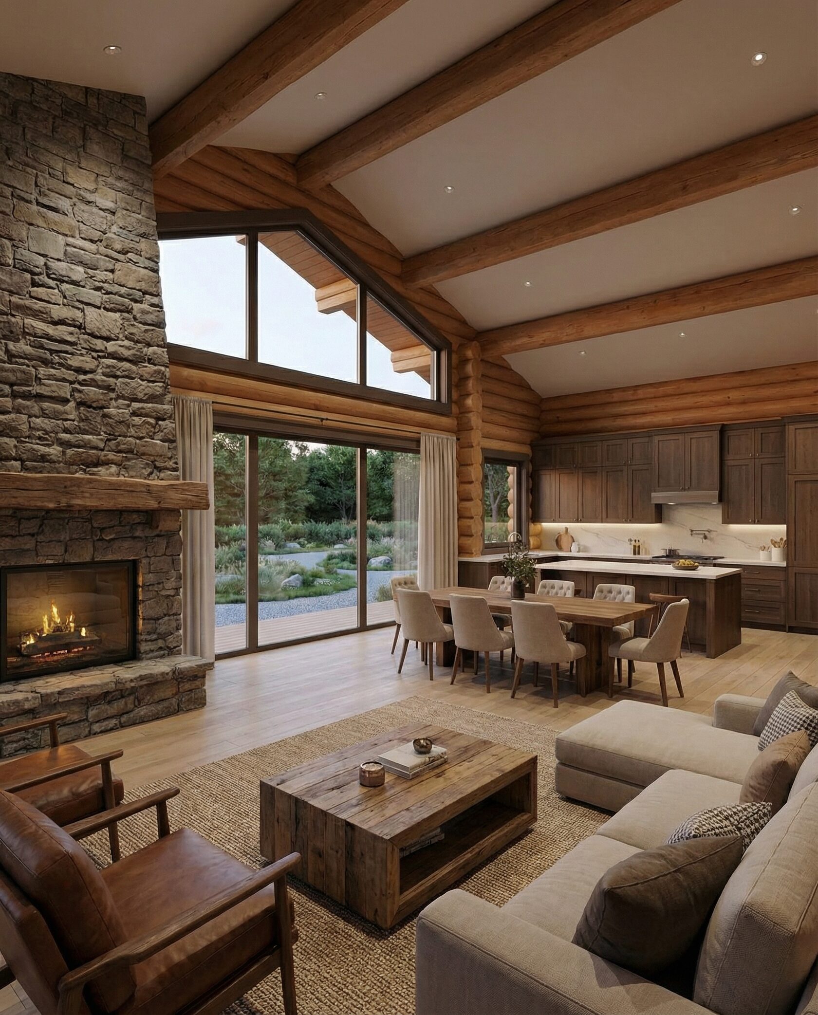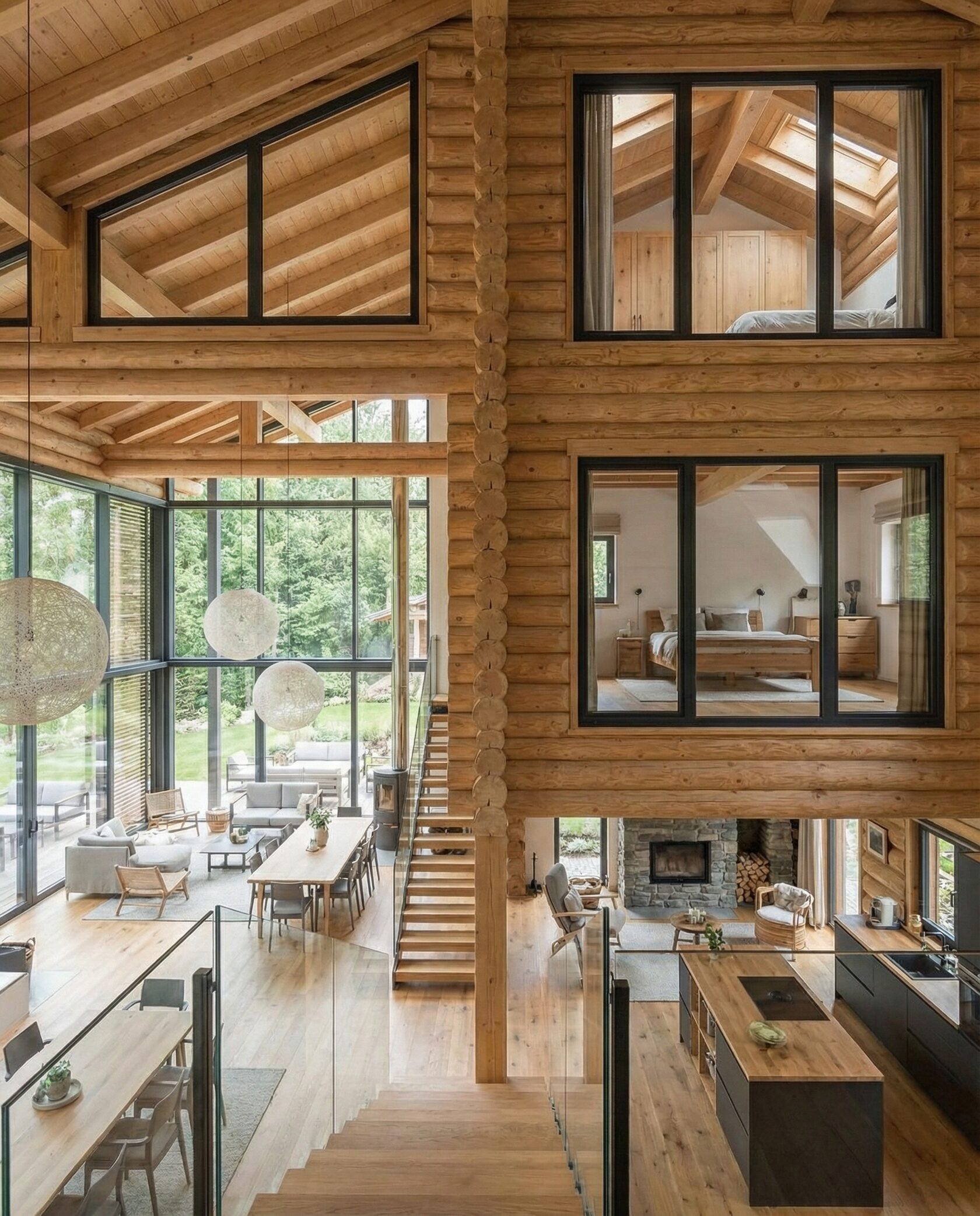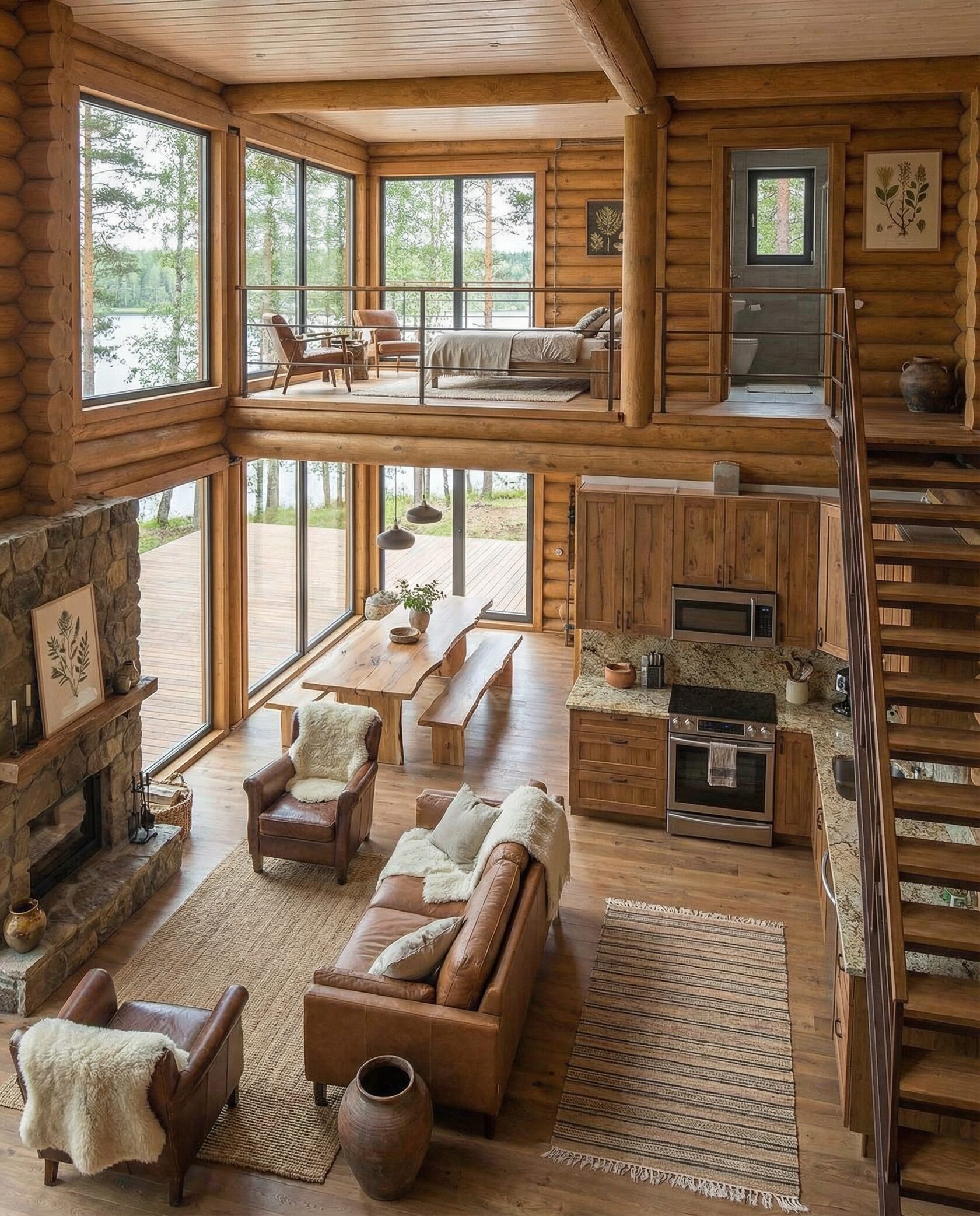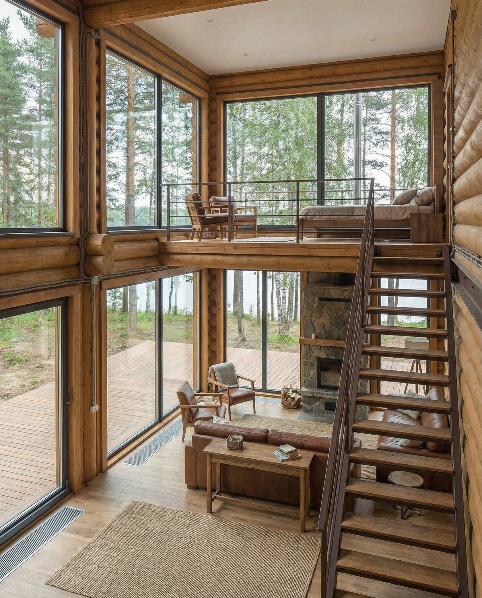 Дом «Алиот» — премиальный двухэтажный дом из оцилиндрованного бревна, где гармонично сочетаются эко-эстетика, свет, простор и технологичность. Панорамные окна на два этажа наполняют интерьер естественным светом и объединяют гостиную с природой, а камин создаёт уютный центр дома. Планировка продумана для максимального комфорта: двусветное пространство, открытая кухня с островом, просторные спальни с балконами, функциональное зонирование и стильные архитектурные элементы. Преимущества: долговечное оцилиндрованное бревно, энергоэффективные окна, шумоизоляция, просторные террасы, экологичные материалы и престижный современный дизайн. Дом «Алиот» — выбор для тех, кто ценит премиальный комфорт, простор и близость к природе.