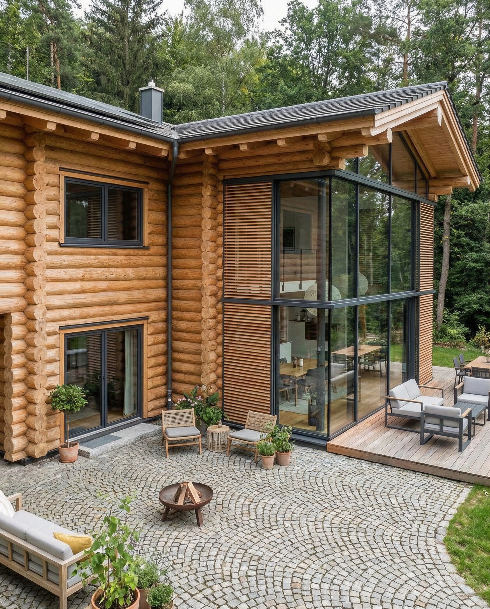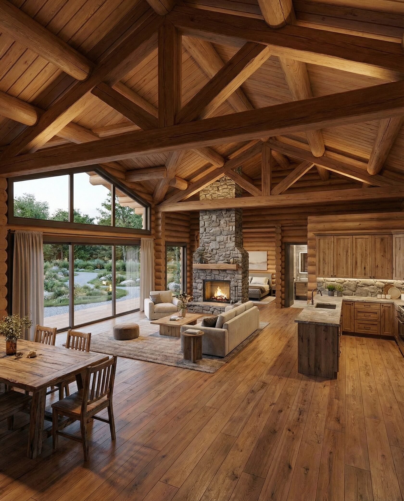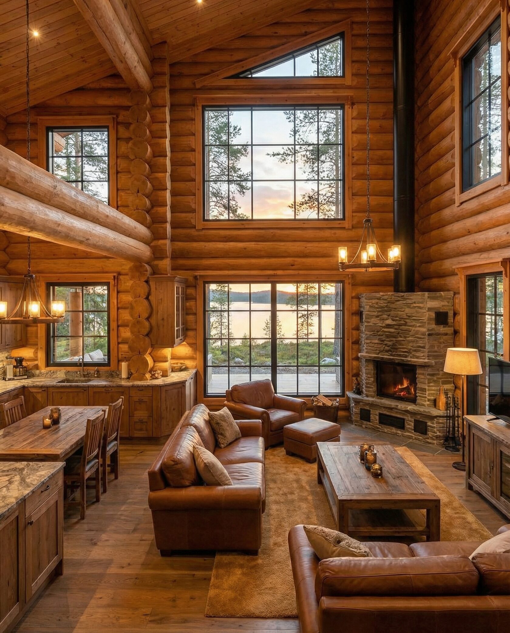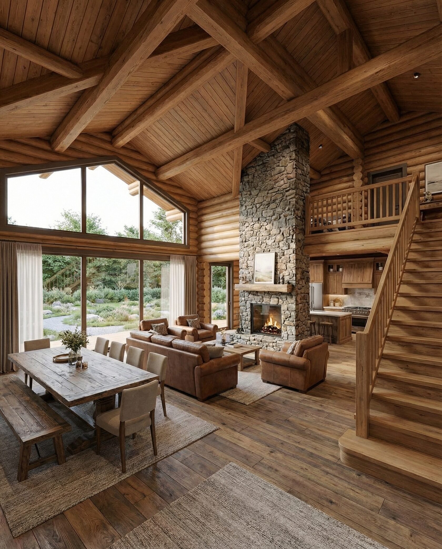Дом «Алиот» — премиальный двухэтажный дом из оцилиндрованного бревна, где гармонично сочетаются эко-эстетика, свет, простор и технологичность. Панорамные окна на два этажа наполняют интерьер естественным светом и объединяют гостиную с природой, а камин создаёт уютный центр дома. Планировка продумана для максимального комфорта: двусветное пространство, открытая кухня с островом, просторные спальни с балконами, функциональное зонирование и стильные архитектурные элементы. Преимущества: долговечное оцилиндрованное бревно, энергоэффективные окна, шумоизоляция, просторные террасы, экологичные материалы и престижный современный дизайн. Дом «Алиот» — выбор для тех, кто ценит премиальный комфорт, простор и близость к природе.