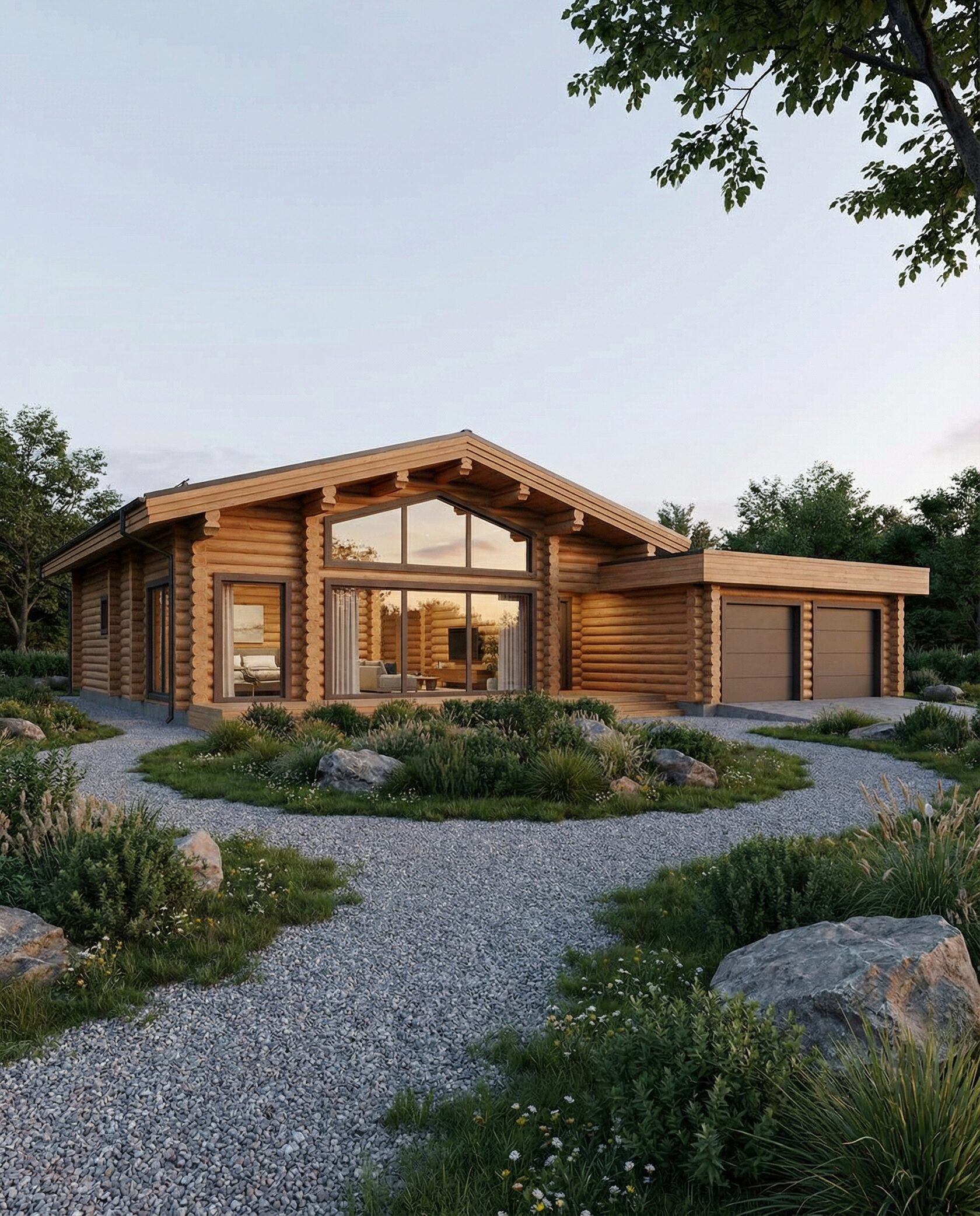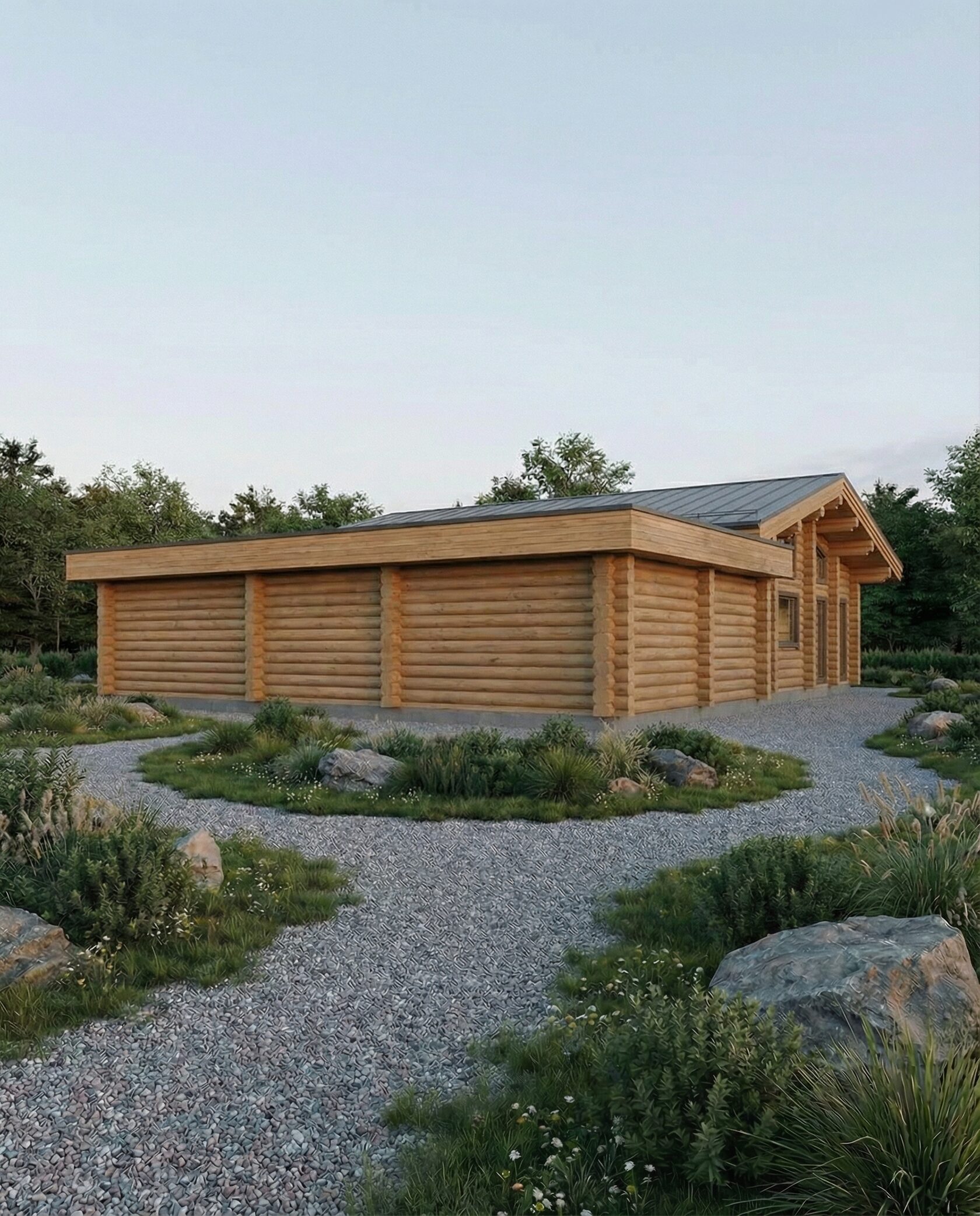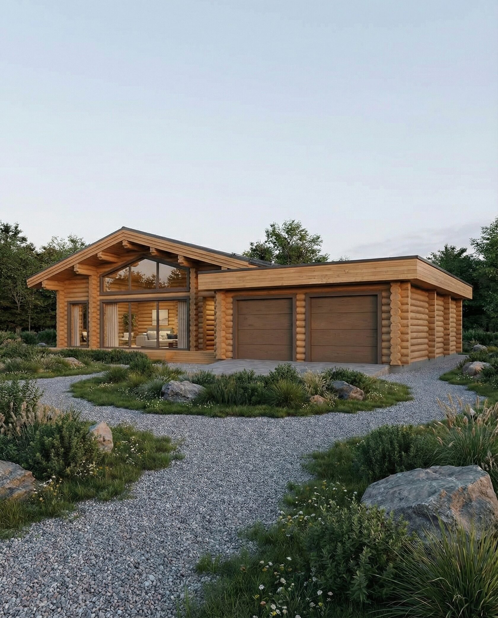 Дом «Мирафед» — современный проект из оцилиндрованного бревна, сочетающий традиционные деревянные технологии и актуальные архитектурные решения. Строгая геометрия фасада и крупное остекление наполняют помещения естественным светом, создавая ощущение единения с природой. Конструкция выполнена из тщательно обработанного бревна с отличной теплоизоляцией, обеспечивая комфортный микроклимат и экономию в отопительный сезон. Натуральное дерево поддерживает оптимальную влажность и стабильную температуру внутри дома. Фасад выдержан в стиле шале: просторная терраса, широкие свесы кровли, выразительные деревянные балки, панорамные окна визуально объединяют интерьер с ландшафтом. Высокие потолки и открытые конструкции стропильной системы создают ощущение простора. В гостиной центральный элемент — камин, подчёркивающий уют. Планировка продумана с точки зрения функциональности: двусветный зал, объединённый с кухней и обеденной зоной, зона отдыха, современный гараж на два автомобиля с местами для хранения. Преимущества проекта: долговечность, энергоэффективность, шумоизоляция, эстетика и стиль, продуманная организация пространства. Дом «Мирафед» — идеальный выбор для тех, кто ищет надёжный, красивый и функциональный загородный дом с уютом и близостью к природе.