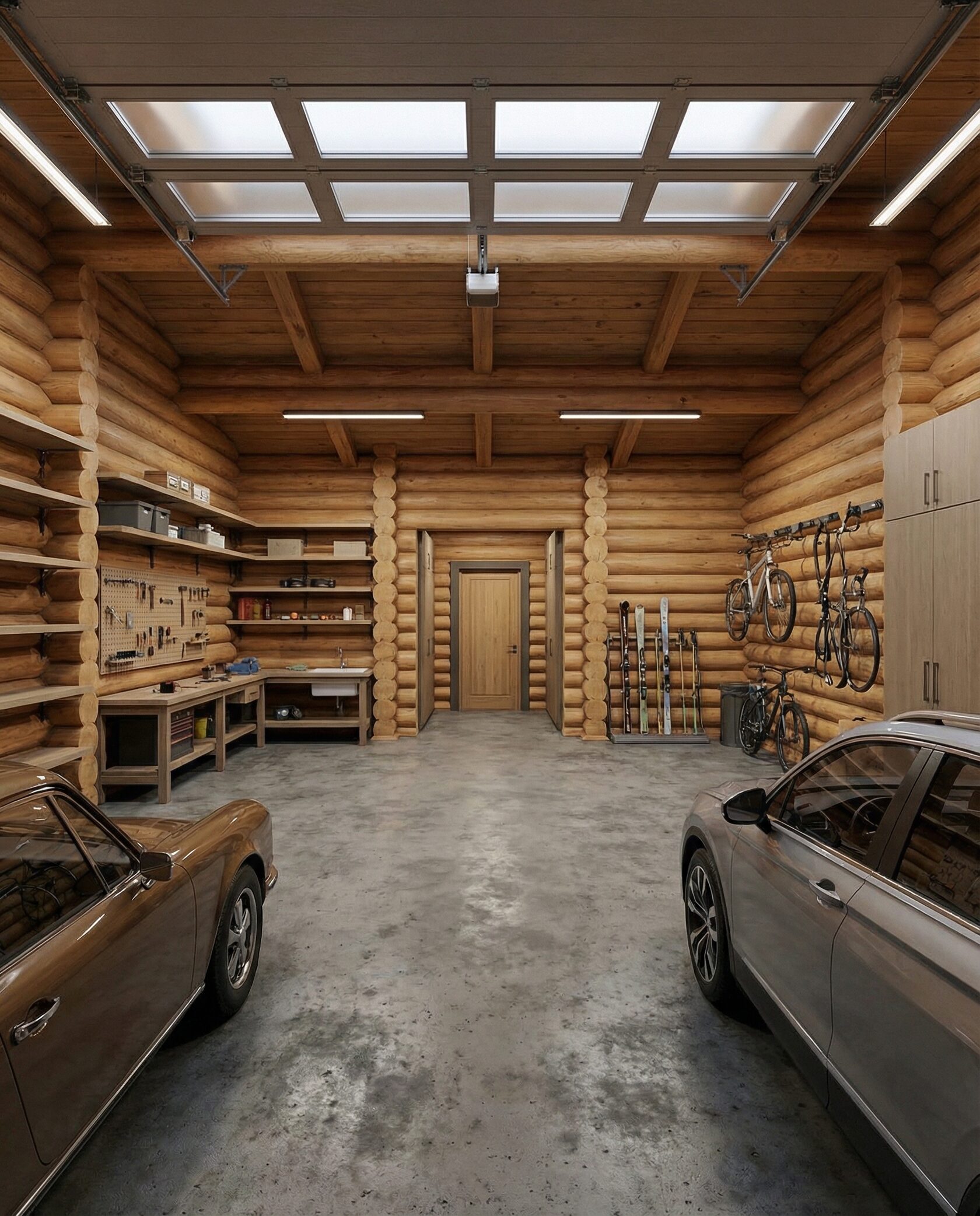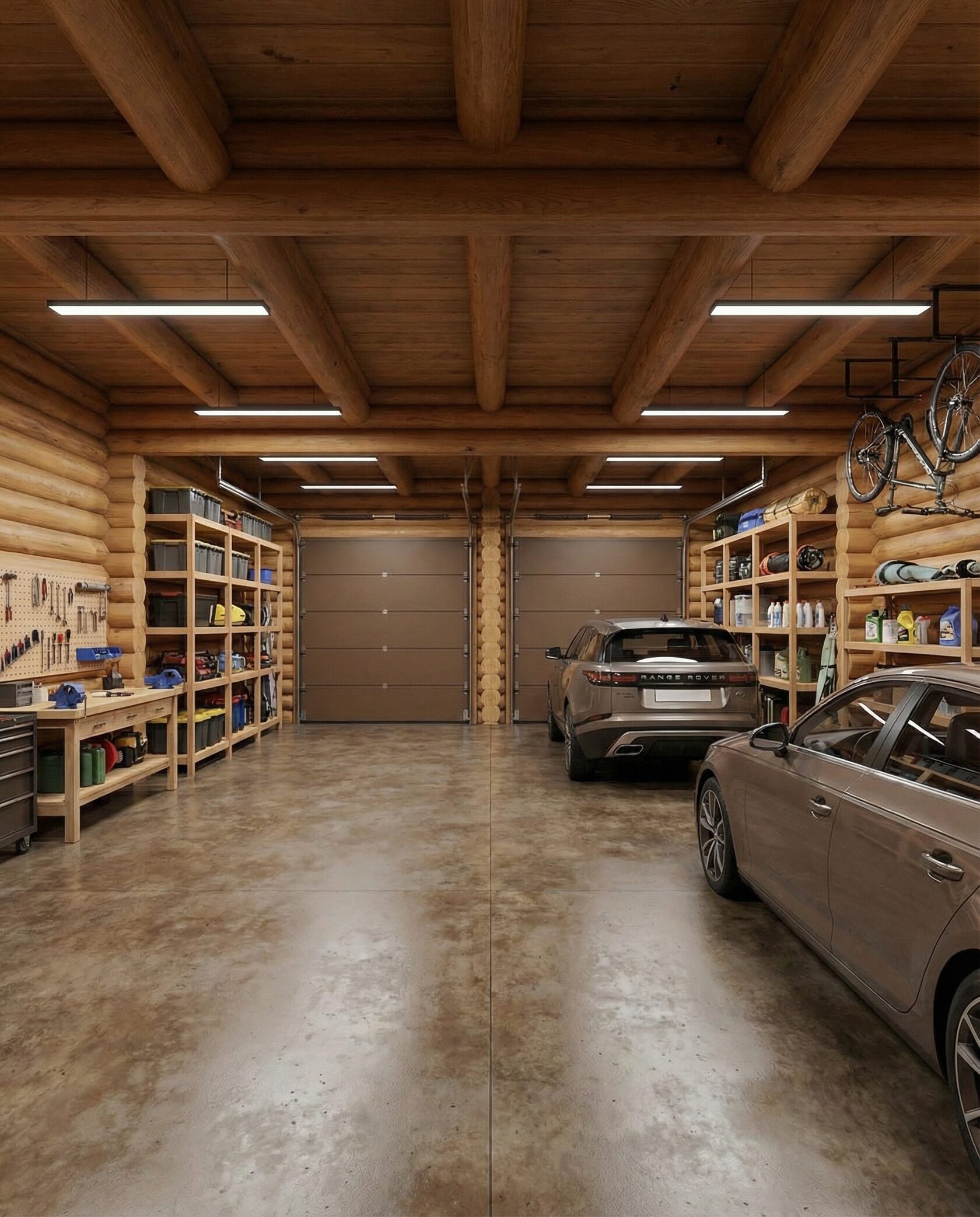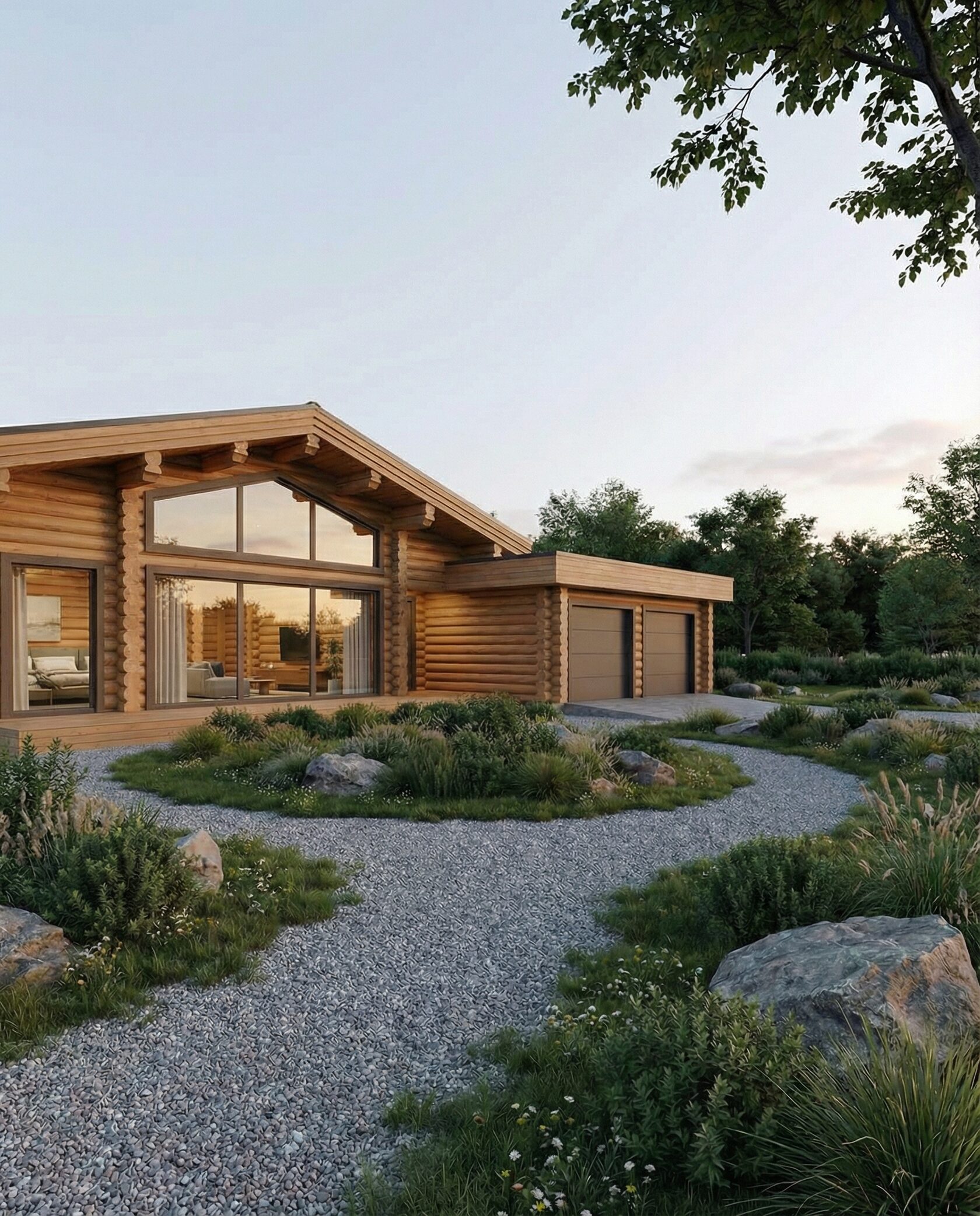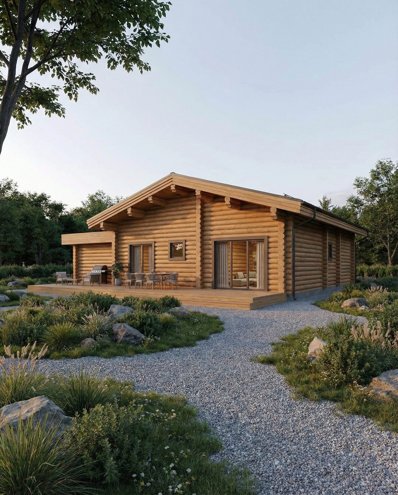 Дом «Мирафед» — современный проект из оцилиндрованного бревна, сочетающий традиционные деревянные технологии и актуальные архитектурные решения. Строгая геометрия фасада и крупное остекление наполняют помещения естественным светом, создавая ощущение единения с природой. Конструкция выполнена из тщательно обработанного бревна с отличной теплоизоляцией, обеспечивая комфортный микроклимат и экономию в отопительный сезон. Натуральное дерево поддерживает оптимальную влажность и стабильную температуру внутри дома. Фасад выдержан в стиле шале: просторная терраса, широкие свесы кровли, выразительные деревянные балки, панорамные окна визуально объединяют интерьер с ландшафтом. Высокие потолки и открытые конструкции стропильной системы создают ощущение простора. В гостиной центральный элемент — камин, подчёркивающий уют. Планировка продумана с точки зрения функциональности: двусветный зал, объединённый с кухней и обеденной зоной, зона отдыха, современный гараж на два автомобиля с местами для хранения. Преимущества проекта: долговечность, энергоэффективность, шумоизоляция, эстетика и стиль, продуманная организация пространства. Дом «Мирафед» — идеальный выбор для тех, кто ищет надёжный, красивый и функциональный загородный дом с уютом и близостью к природе.