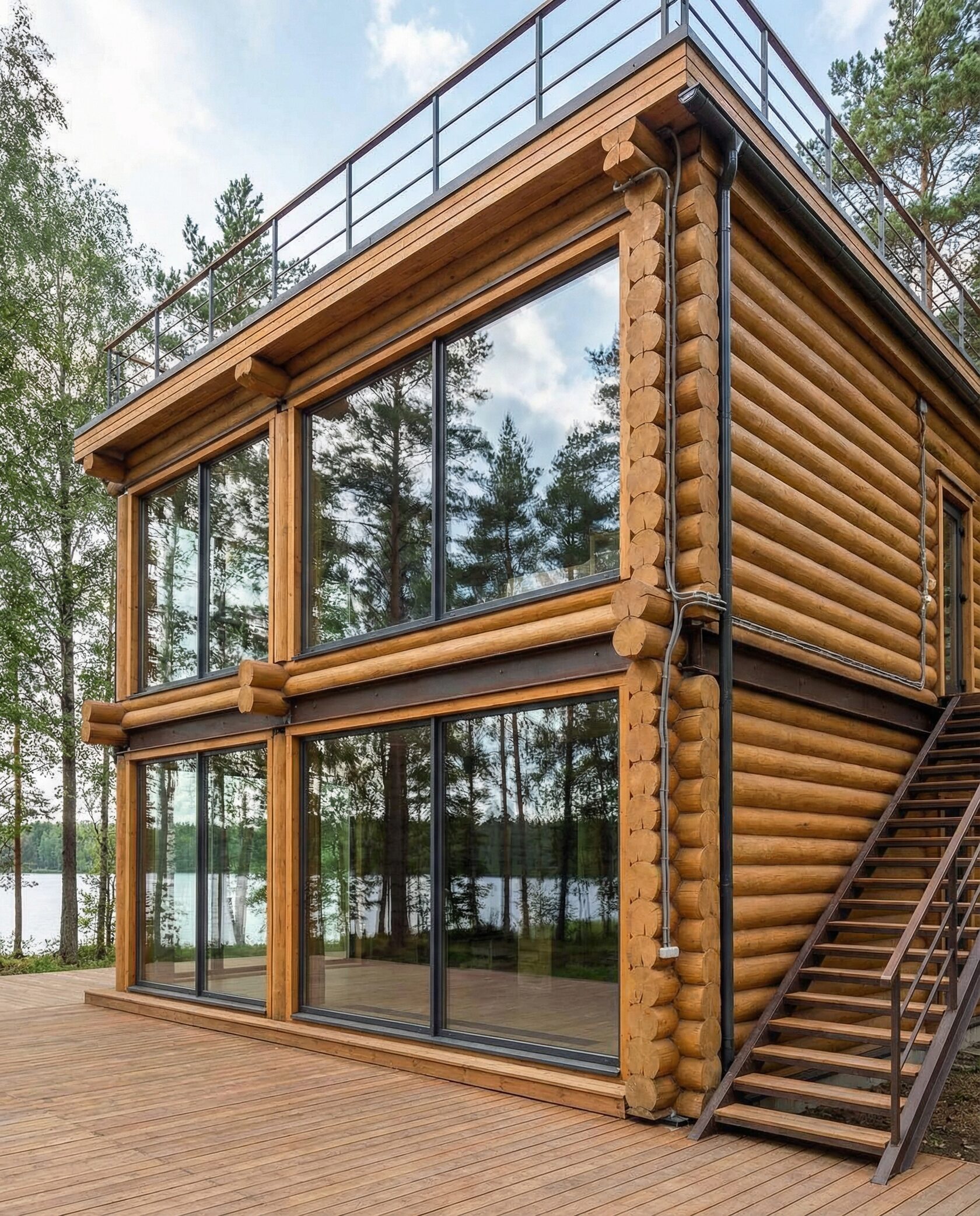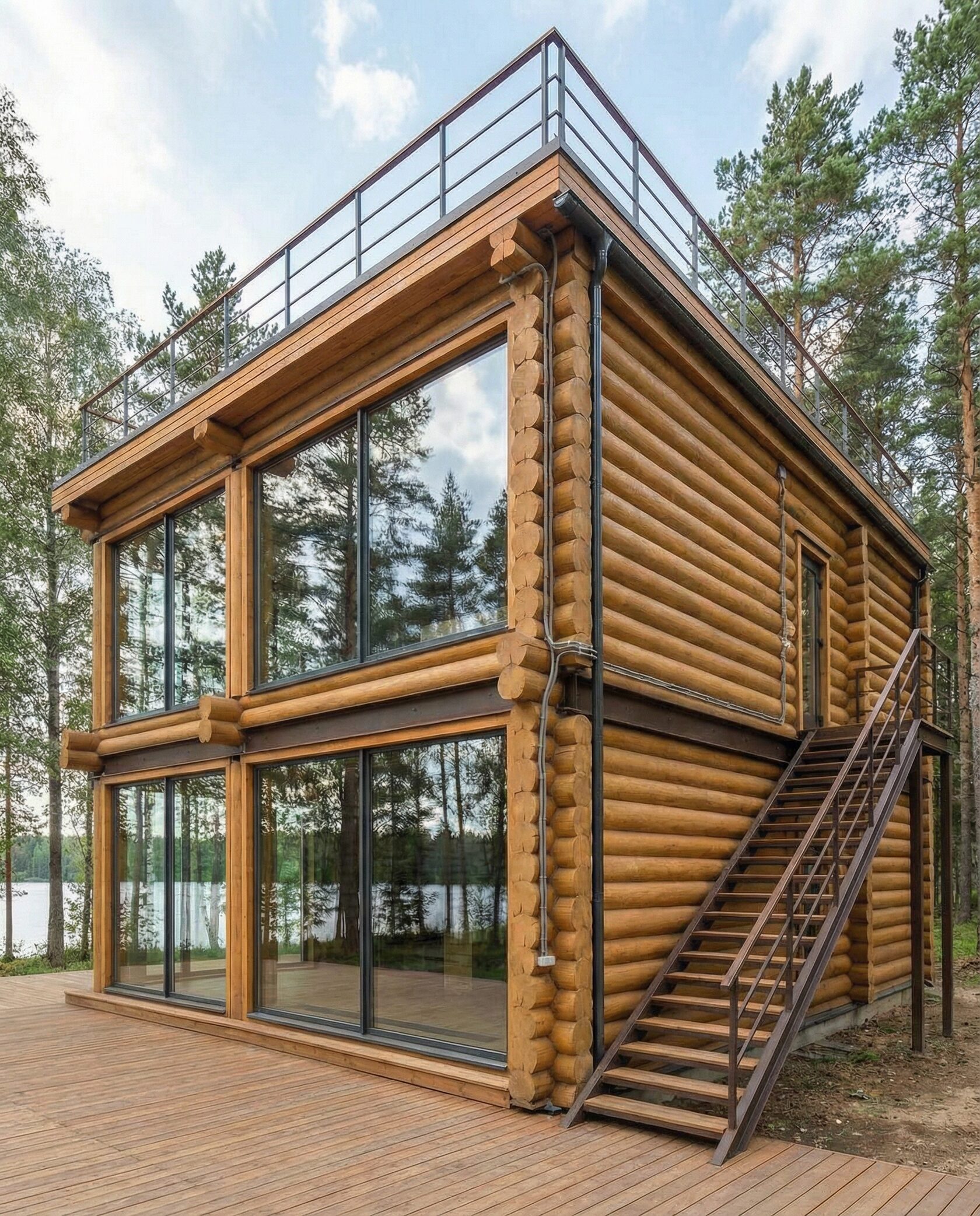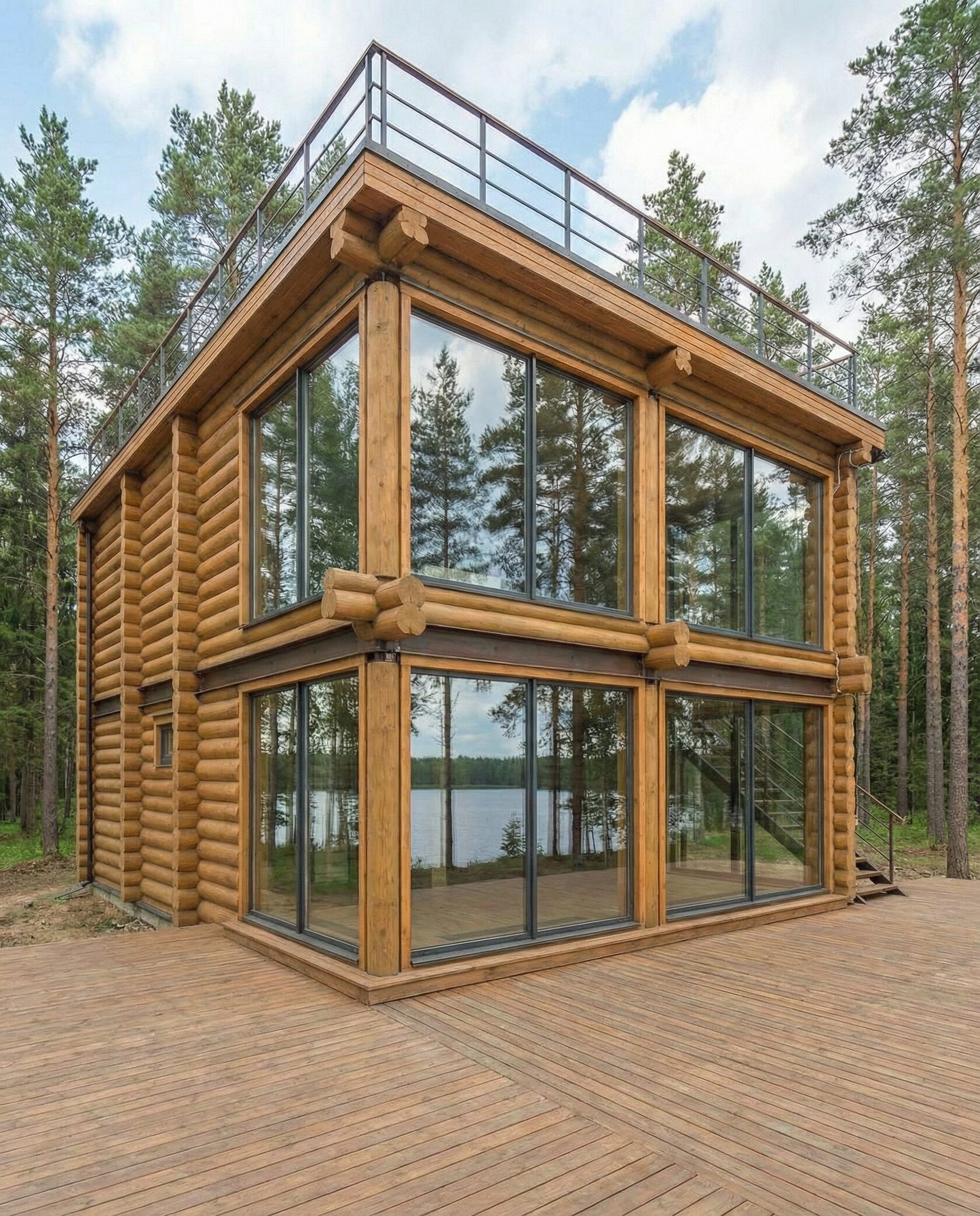 Дом «Альгор» — современный минималистичный дом из оцилиндрованного бревна с панорамным остеклением, открывающим вид на лес и водоём. Высокие окна до пола наполняют интерьер светом, объединяя внутреннее пространство с природой, а плоская эксплуатируемая кровля позволяет создать террасу или зону отдыха на свежем воздухе. Внутри — двусветная гостиная с камином, столовая зона, эргономичная кухня и приватные комнаты на втором этаже с панорамными видами. Преимущества: современный стиль, долговечные экологичные материалы, высокая естественная освещённость, тепло- и шумоизоляция, возможность организации крыши как дополнительной зоны отдыха. Дом «Альгор» — идеальный выбор для тех, кто ценит комфорт, инновации и гармонию с природой.
