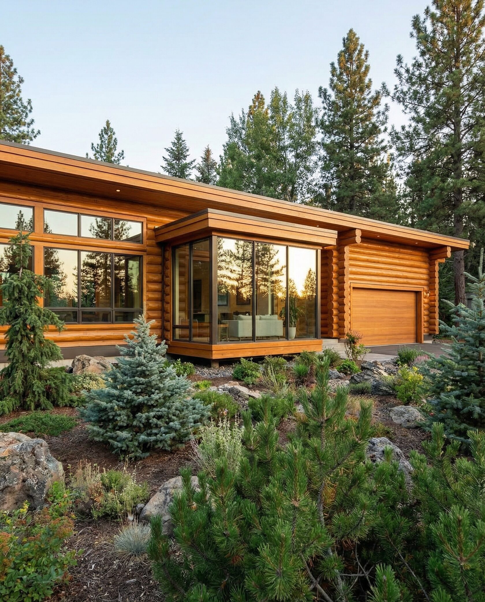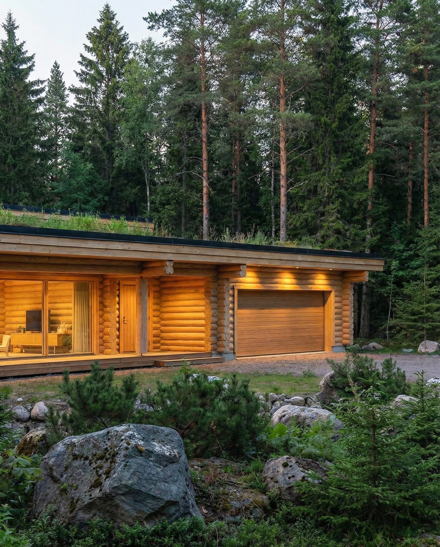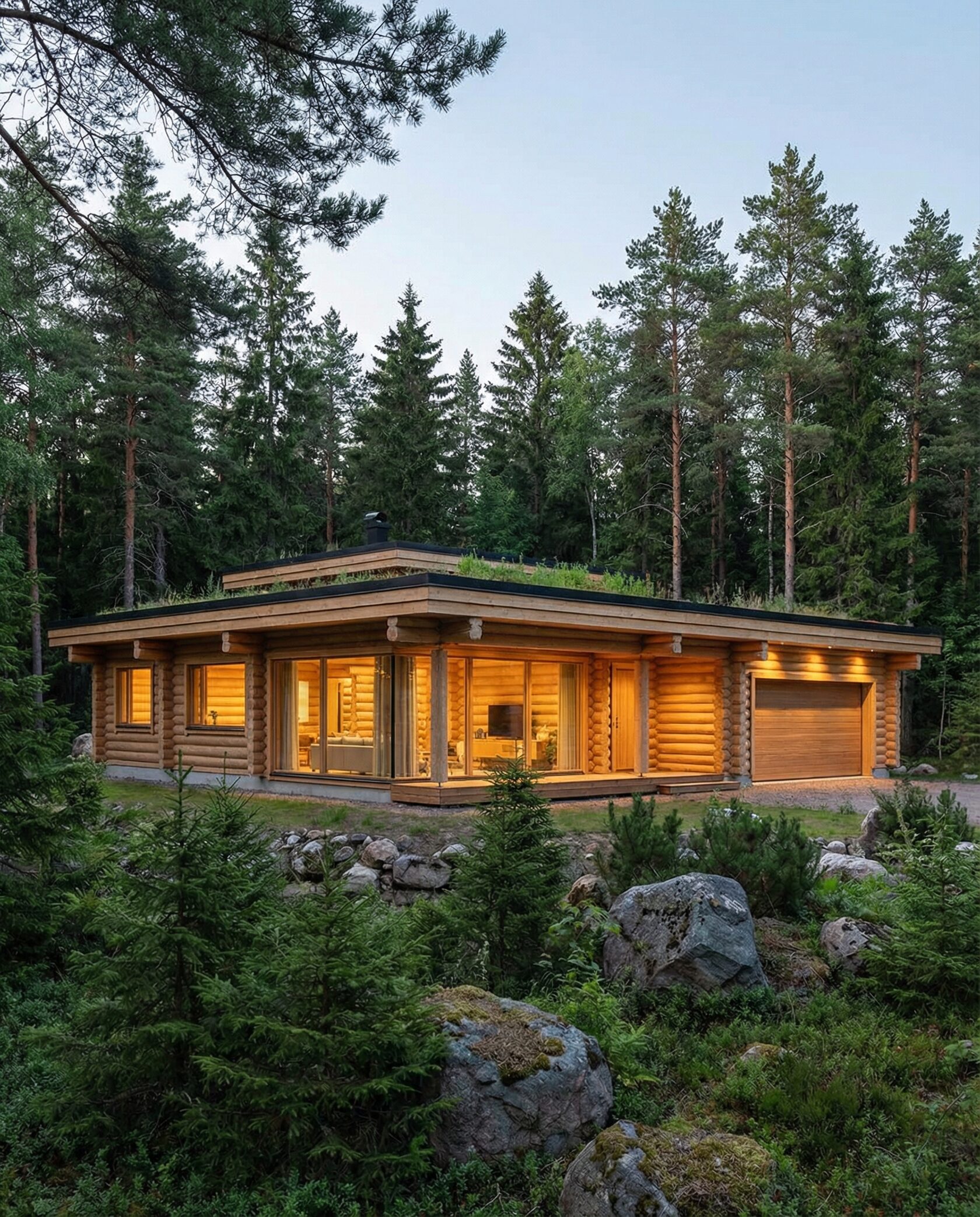 Дом «Альгор» — современный минималистичный дом из оцилиндрованного бревна с панорамным остеклением, открывающим вид на лес и водоём. Высокие окна до пола наполняют интерьер светом, объединяя внутреннее пространство с природой, а плоская эксплуатируемая кровля позволяет создать террасу или зону отдыха на свежем воздухе. Внутри — двусветная гостиная с камином, столовая зона, эргономичная кухня и приватные комнаты на втором этаже с панорамными видами. Преимущества: современный стиль, долговечные экологичные материалы, высокая естественная освещённость, тепло- и шумоизоляция, возможность организации крыши как дополнительной зоны отдыха. Дом «Альгор» — идеальный выбор для тех, кто ценит комфорт, инновации и гармонию с природой.