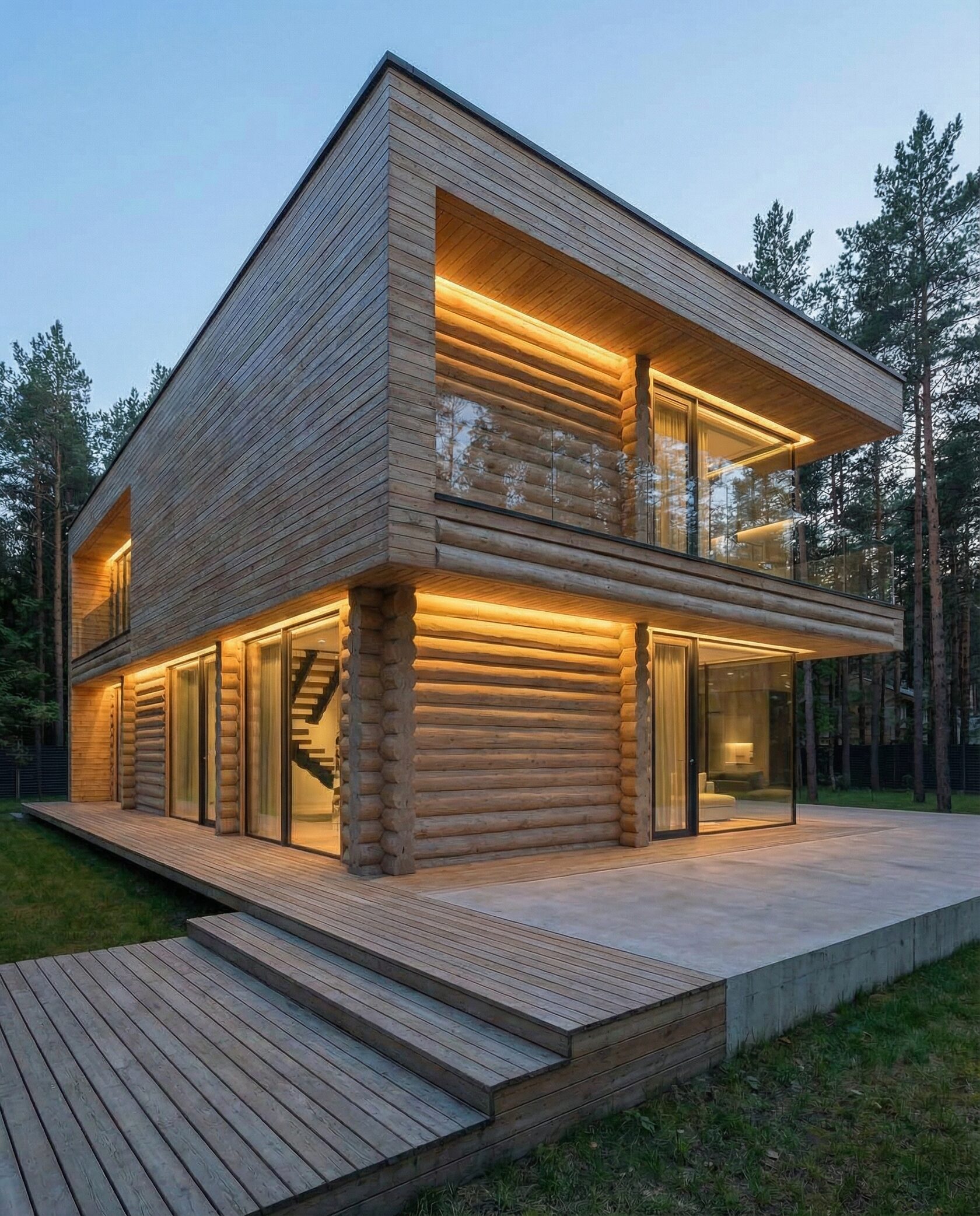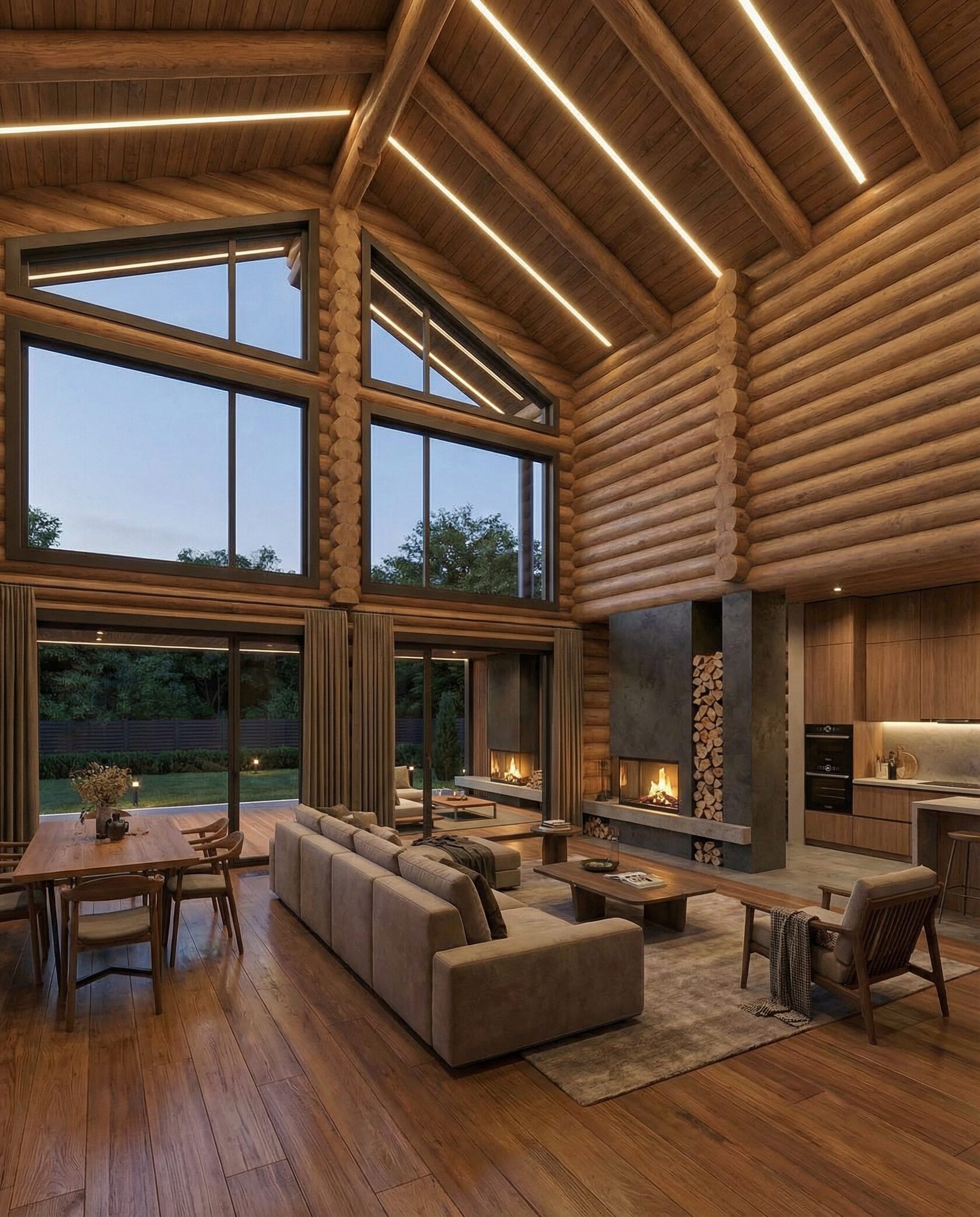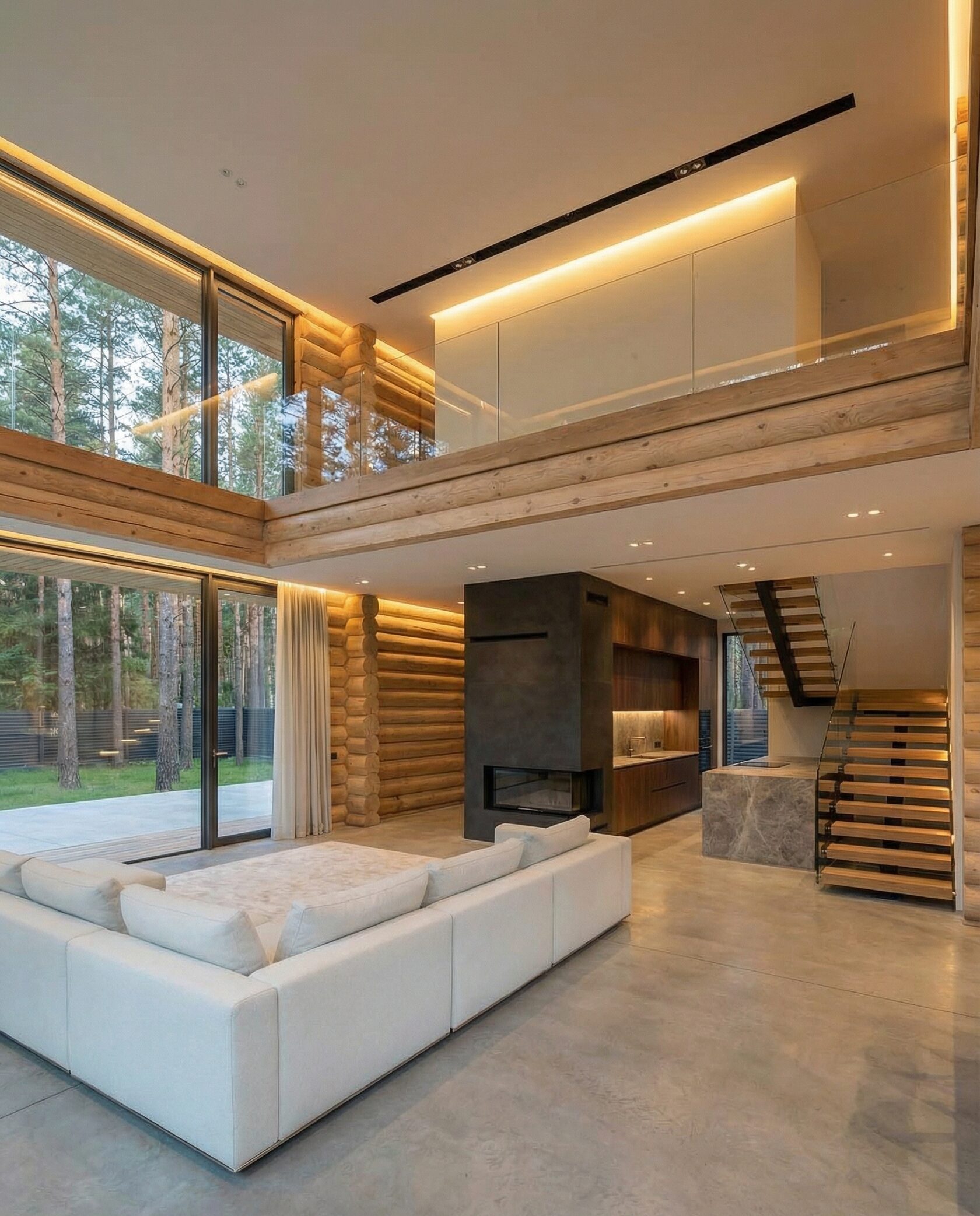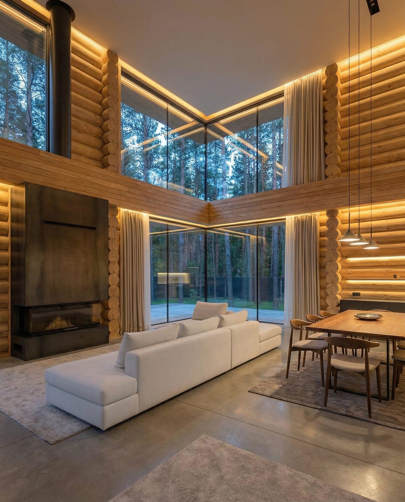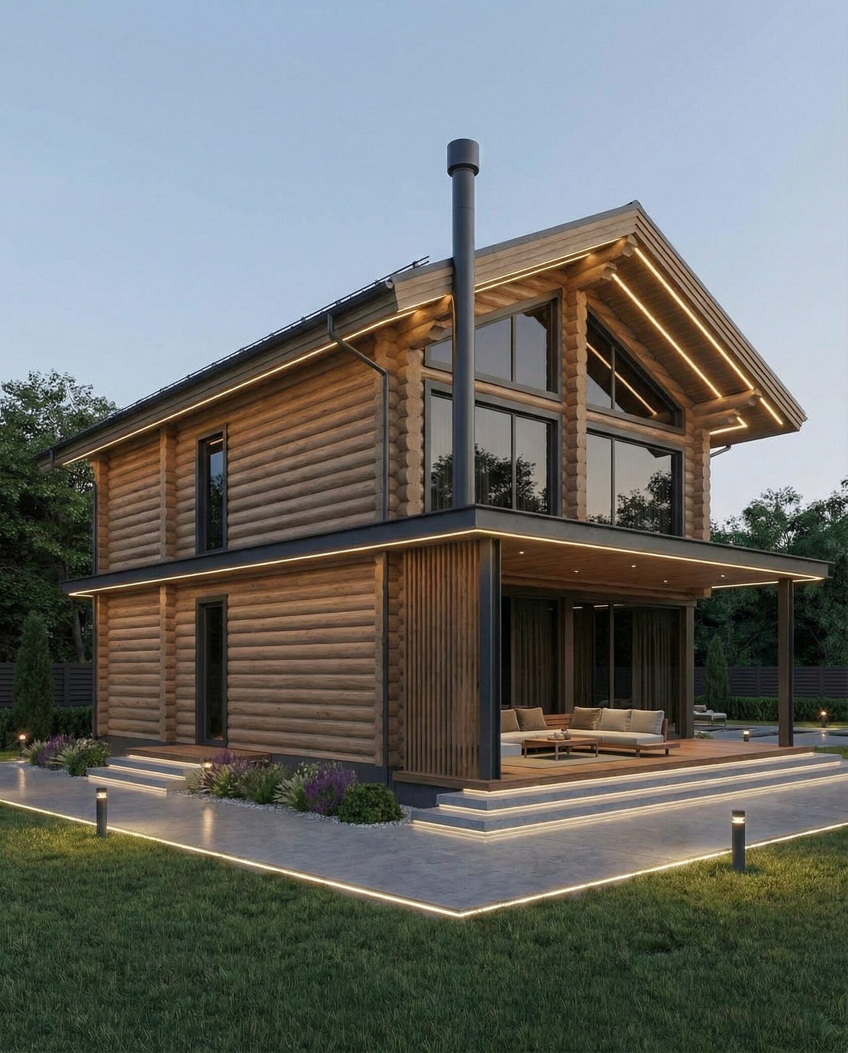 Дом «Алиот» — премиальный двухэтажный дом из оцилиндрованного бревна, где гармонично сочетаются эко-эстетика, свет, простор и технологичность. Панорамные окна на два этажа наполняют интерьер естественным светом и объединяют гостиную с природой, а камин создаёт уютный центр дома. Планировка продумана для максимального комфорта: двусветное пространство, открытая кухня с островом, просторные спальни с балконами, функциональное зонирование и стильные архитектурные элементы. Преимущества: долговечное оцилиндрованное бревно, энергоэффективные окна, шумоизоляция, просторные террасы, экологичные материалы и престижный современный дизайн. Дом «Алиот» — выбор для тех, кто ценит премиальный комфорт, простор и близость к природе.
