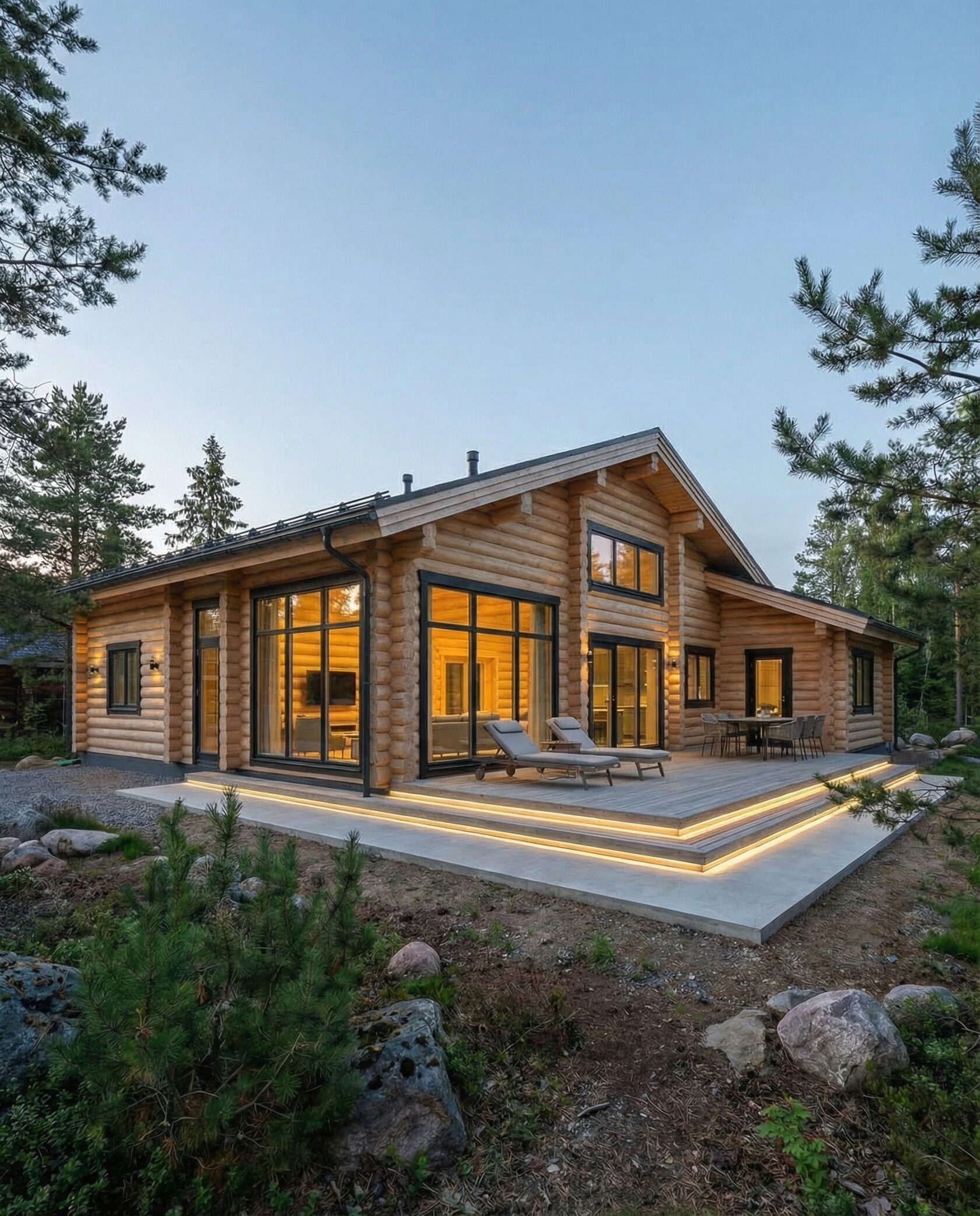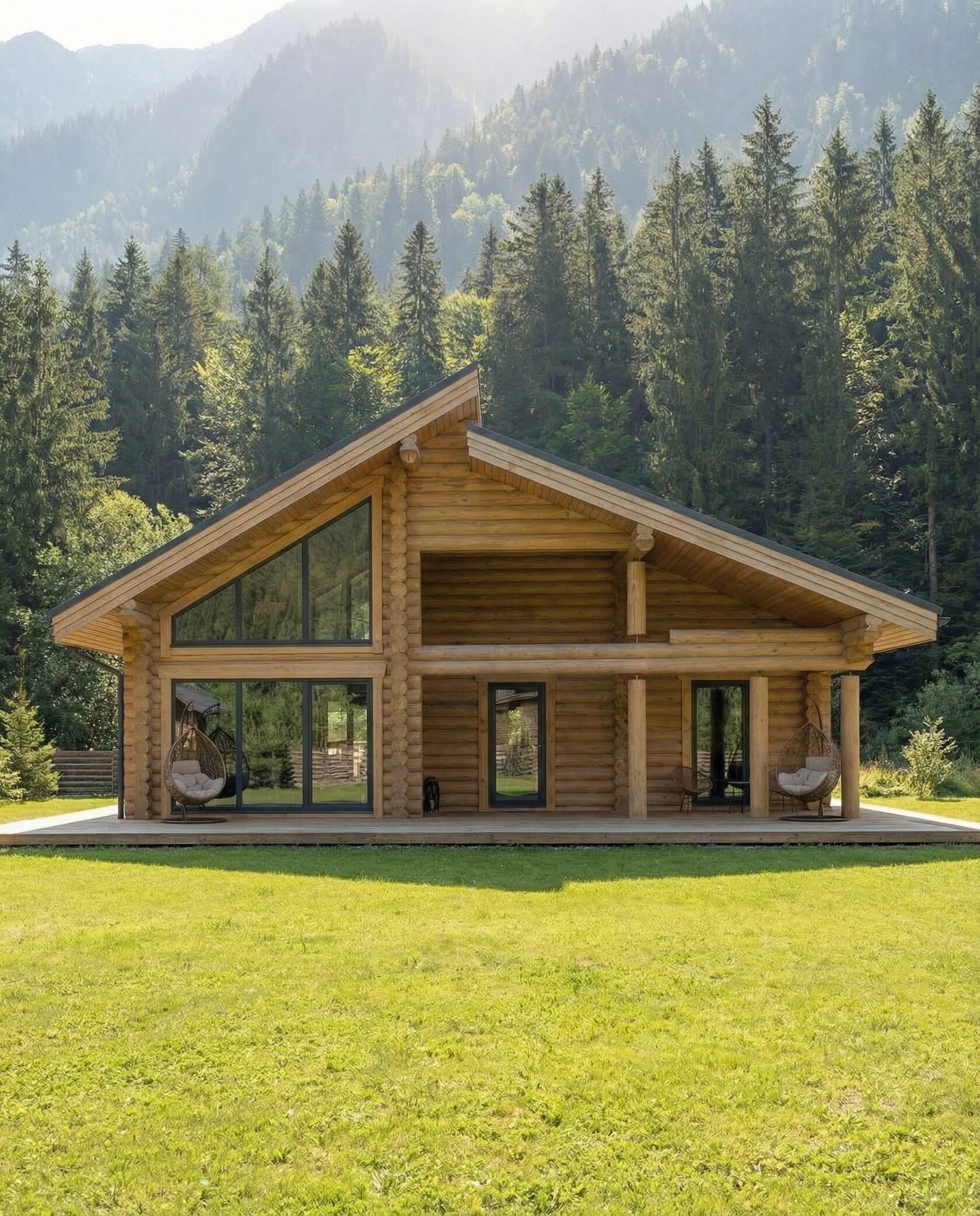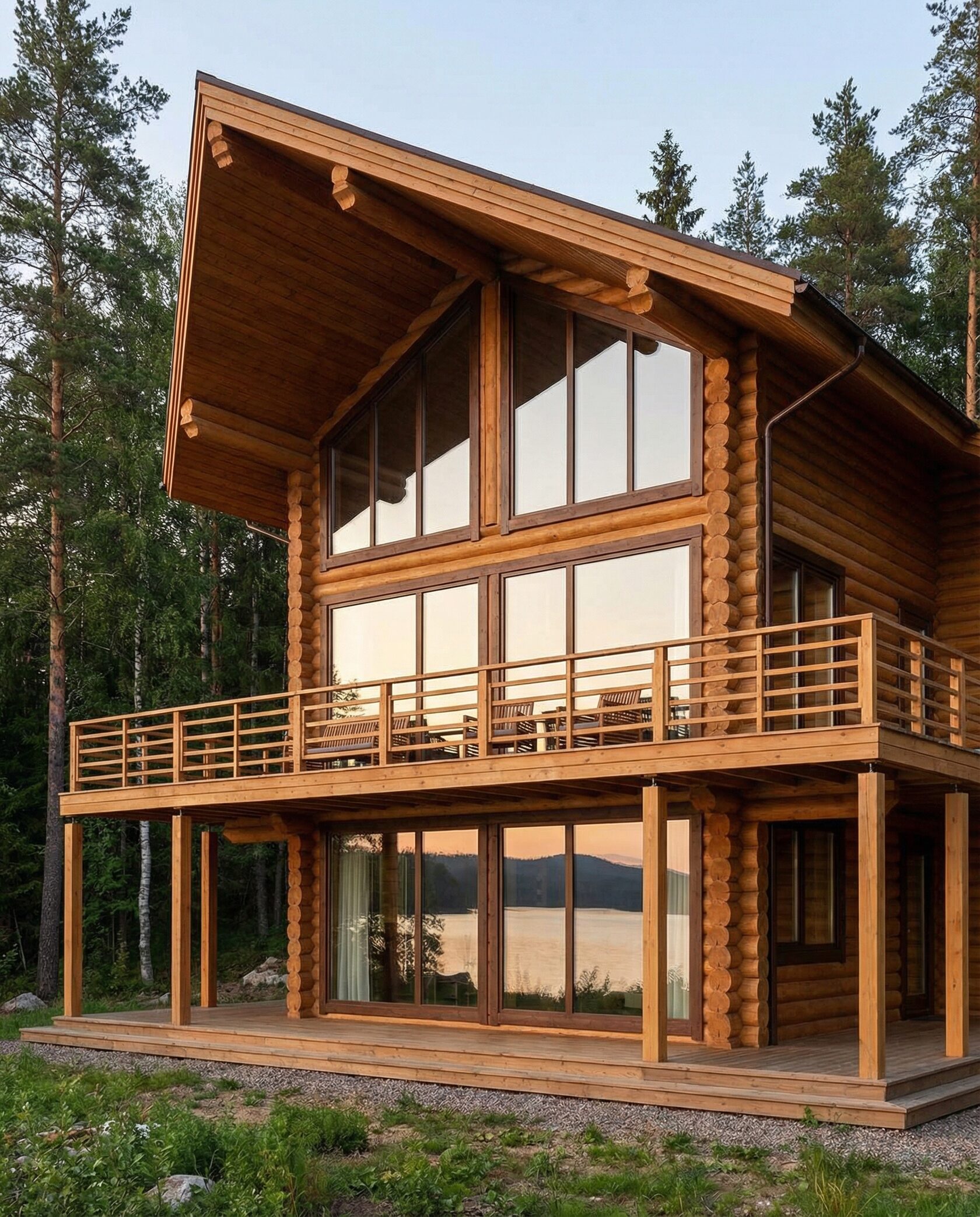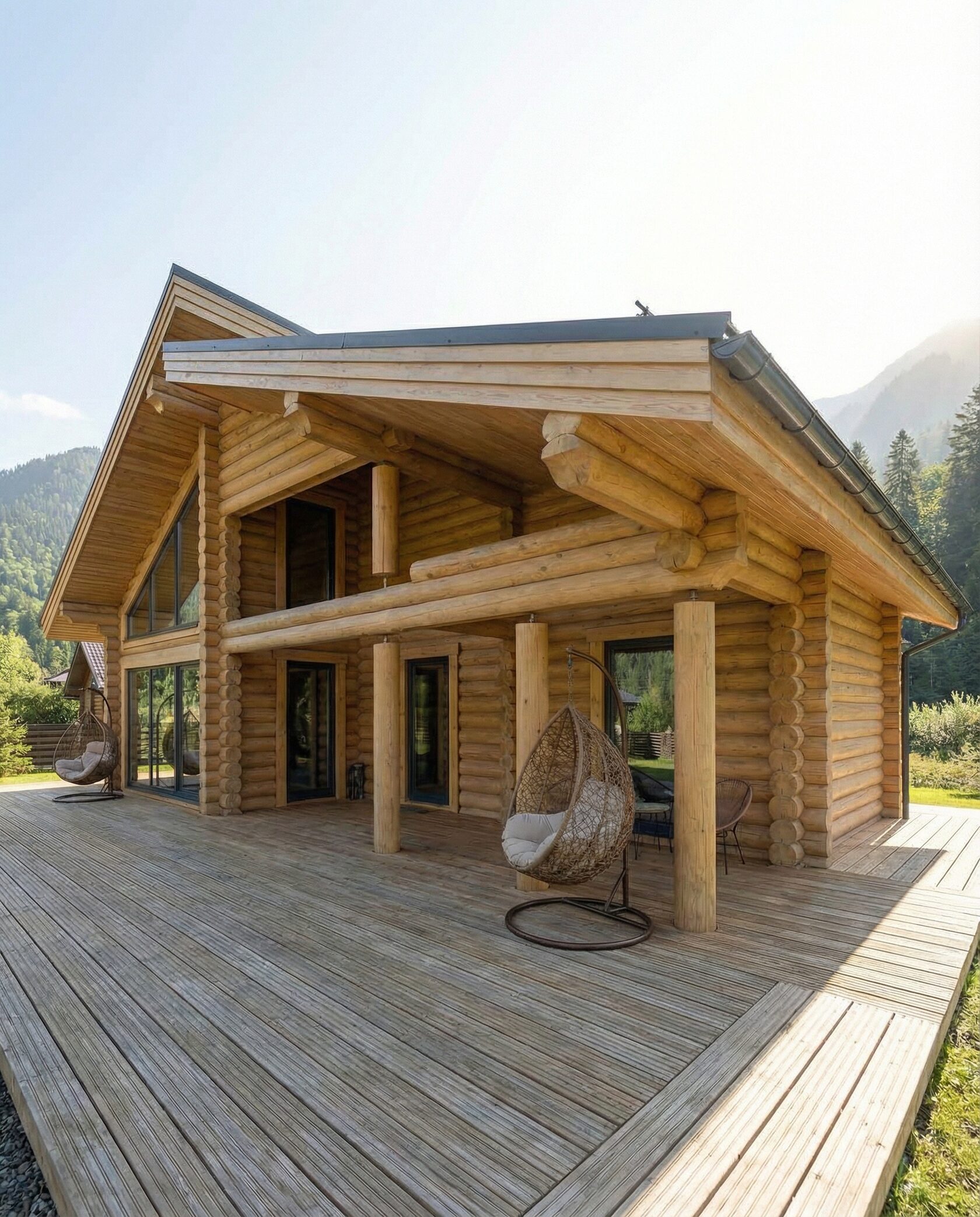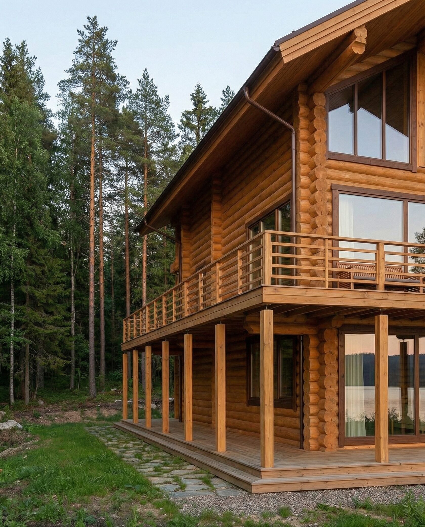 Дом «Алиот» — премиальный двухэтажный дом из оцилиндрованного бревна, где гармонично сочетаются эко-эстетика, свет, простор и технологичность. Панорамные окна на два этажа наполняют интерьер естественным светом и объединяют гостиную с природой, а камин создаёт уютный центр дома. Планировка продумана для максимального комфорта: двусветное пространство, открытая кухня с островом, просторные спальни с балконами, функциональное зонирование и стильные архитектурные элементы. Преимущества: долговечное оцилиндрованное бревно, энергоэффективные окна, шумоизоляция, просторные террасы, экологичные материалы и престижный современный дизайн. Дом «Алиот» — выбор для тех, кто ценит премиальный комфорт, простор и близость к природе.