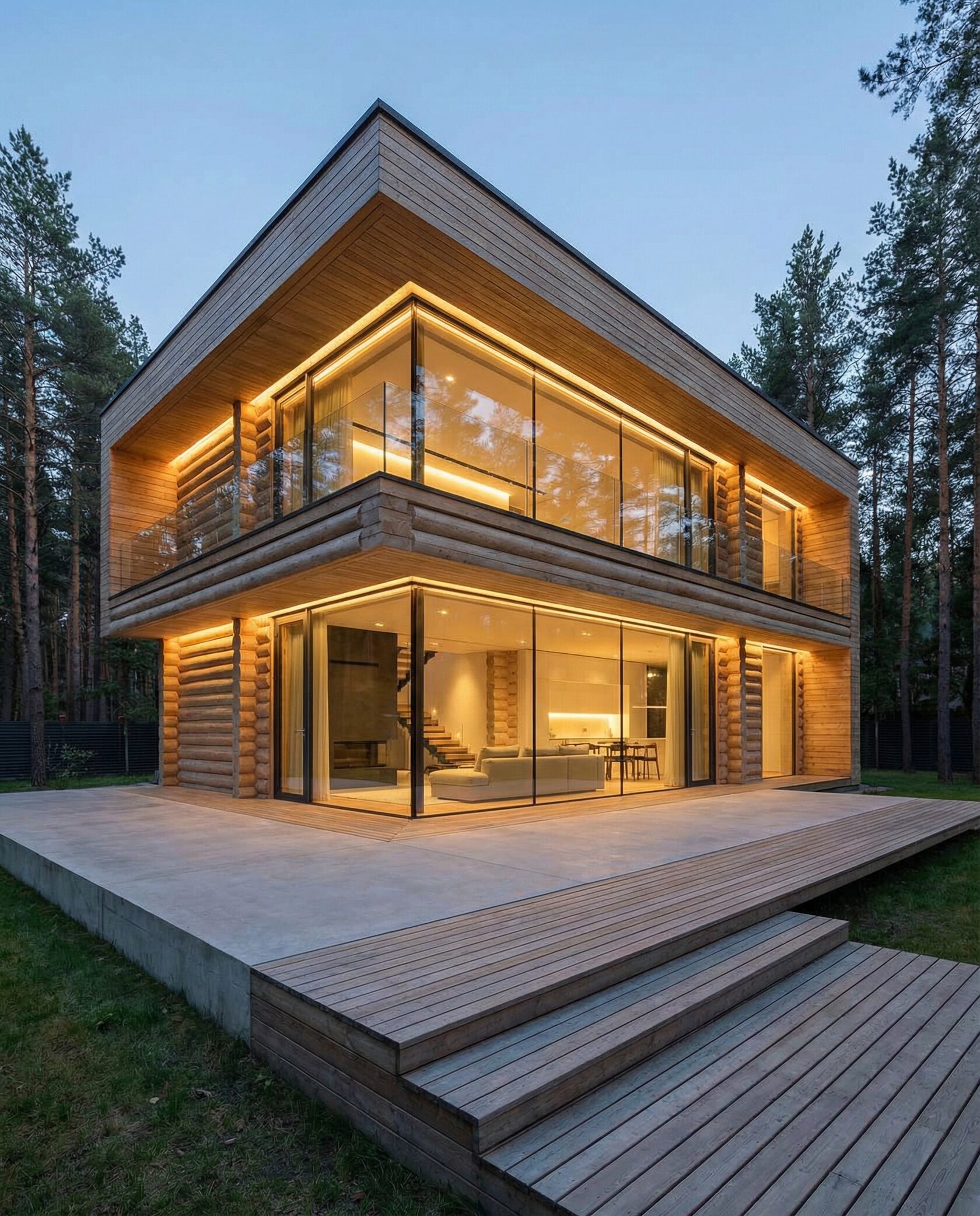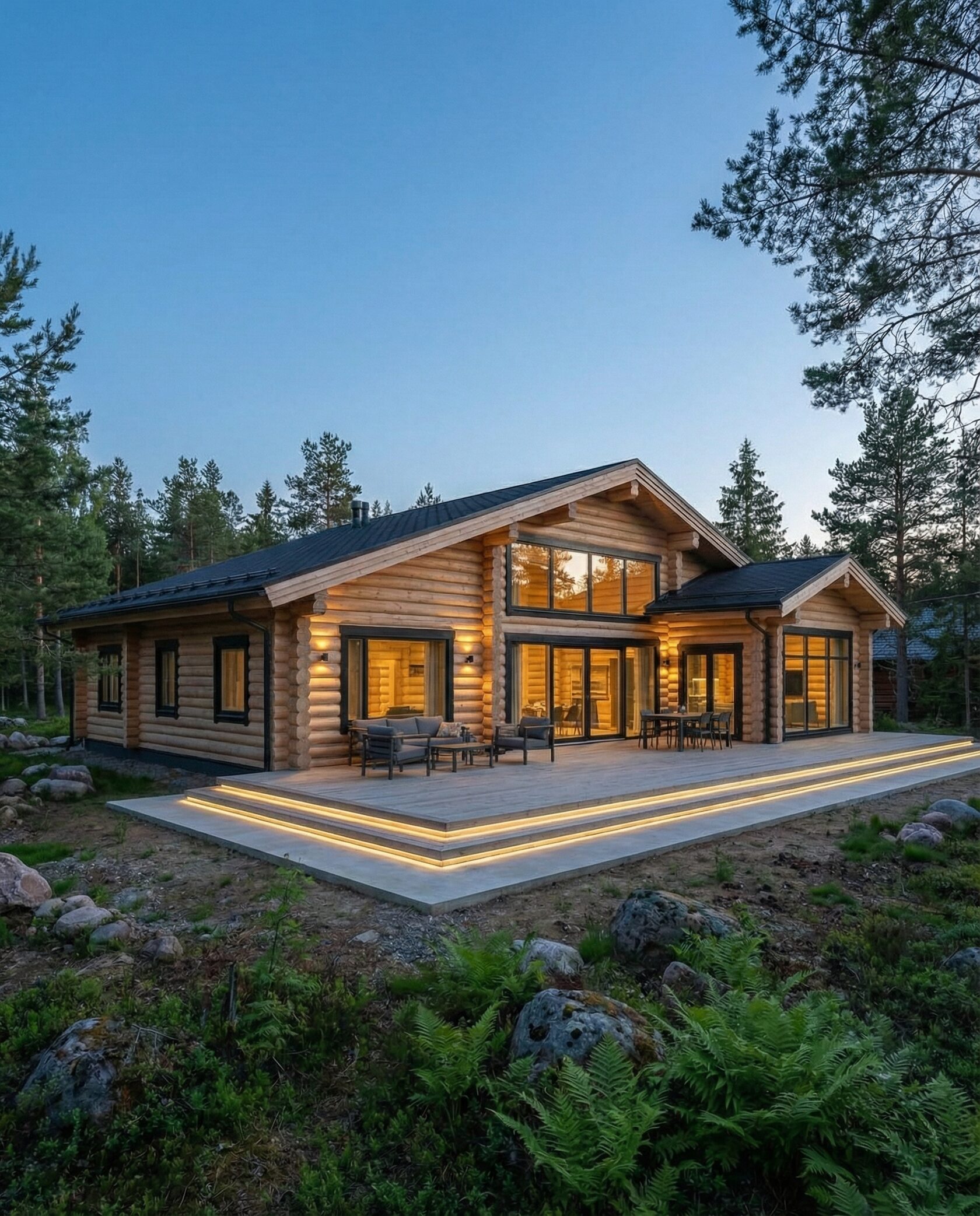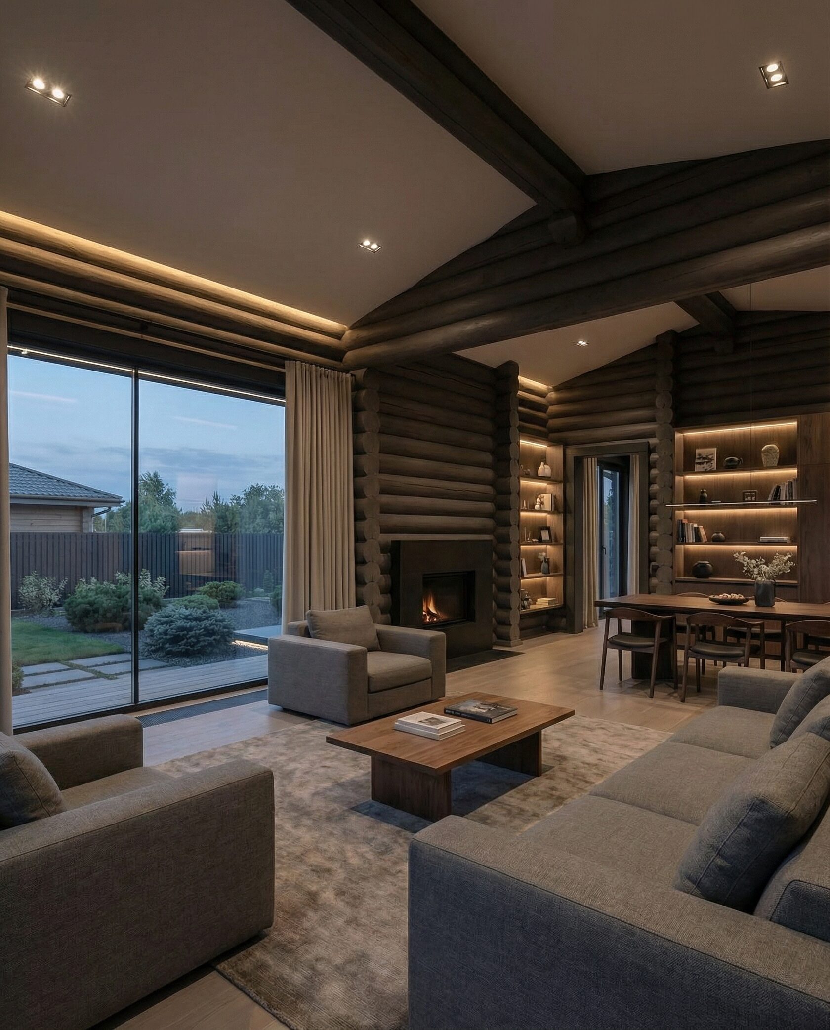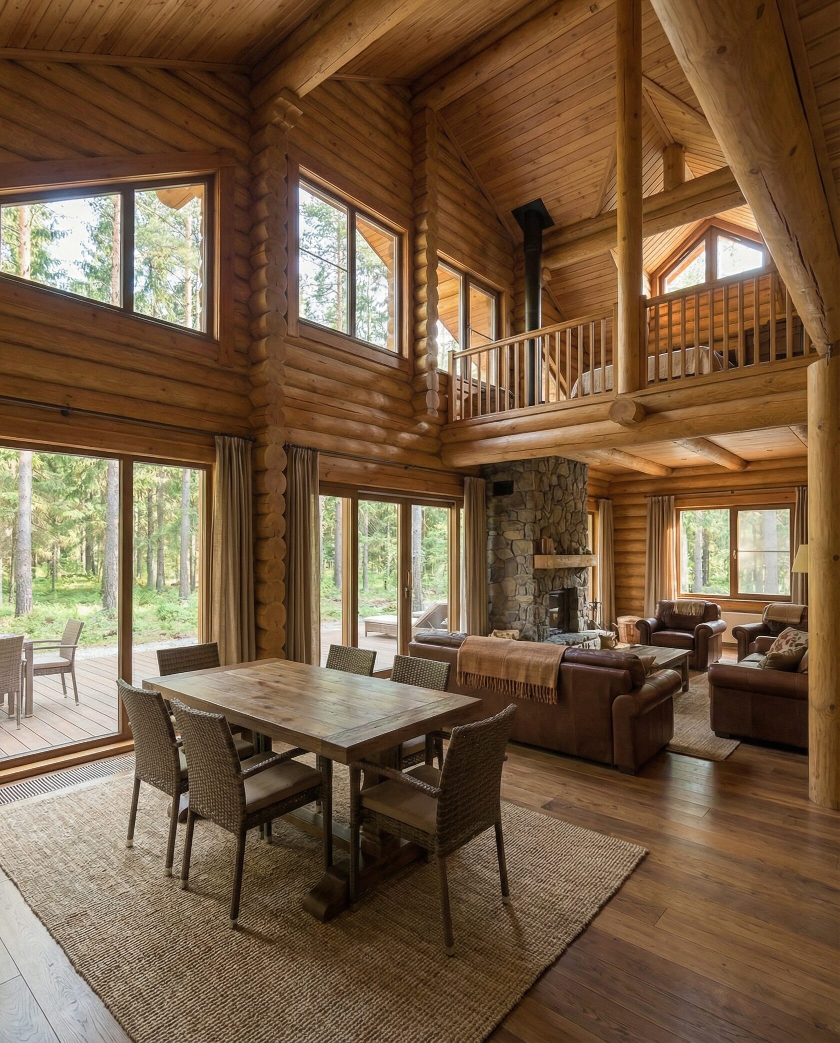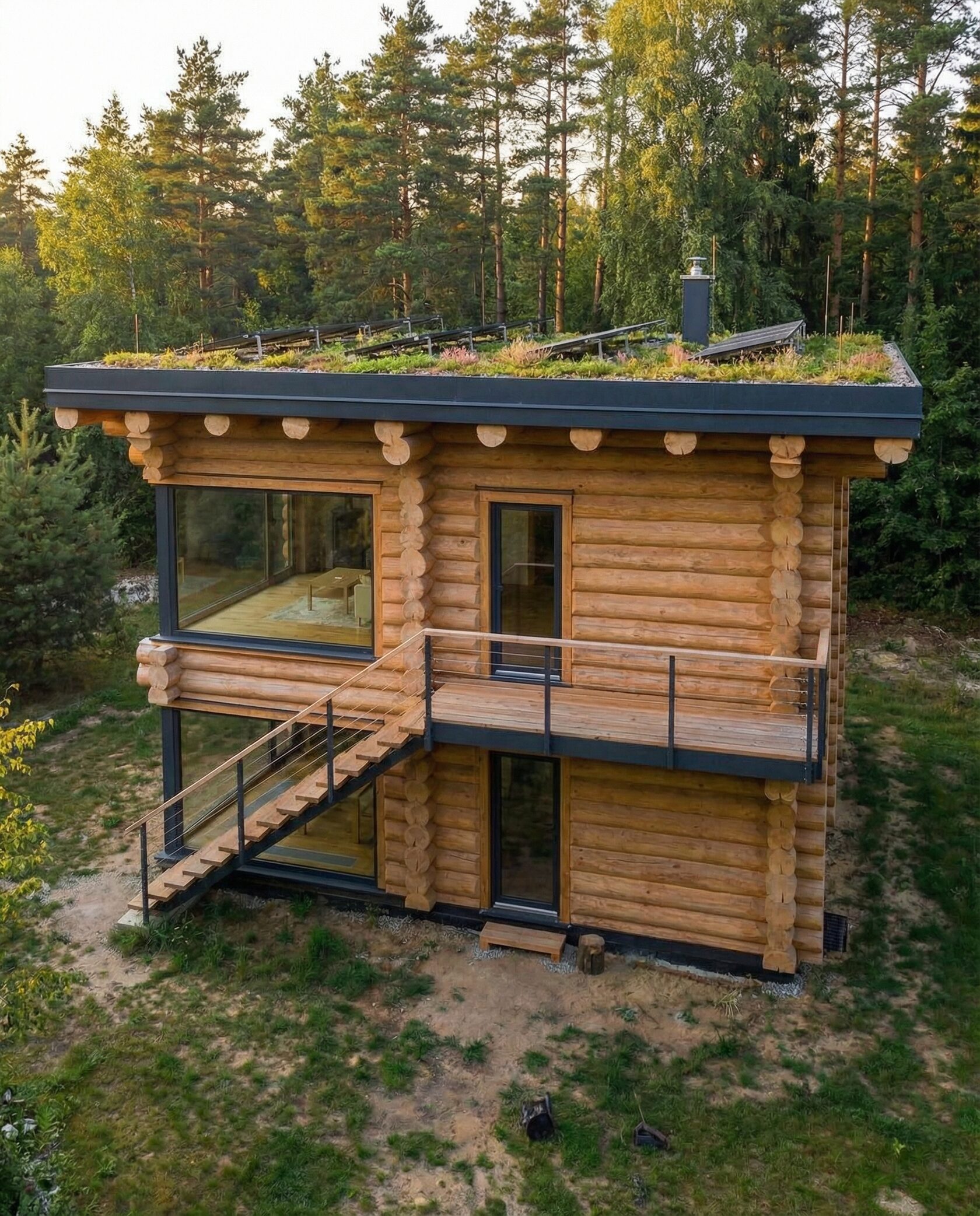 Дом «Алиот» — премиальный двухэтажный дом из оцилиндрованного бревна, где гармонично сочетаются эко-эстетика, свет, простор и технологичность. Панорамные окна на два этажа наполняют интерьер естественным светом и объединяют гостиную с природой, а камин создаёт уютный центр дома. Планировка продумана для максимального комфорта: двусветное пространство, открытая кухня с островом, просторные спальни с балконами, функциональное зонирование и стильные архитектурные элементы. Преимущества: долговечное оцилиндрованное бревно, энергоэффективные окна, шумоизоляция, просторные террасы, экологичные материалы и престижный современный дизайн. Дом «Алиот» — выбор для тех, кто ценит премиальный комфорт, простор и близость к природе.