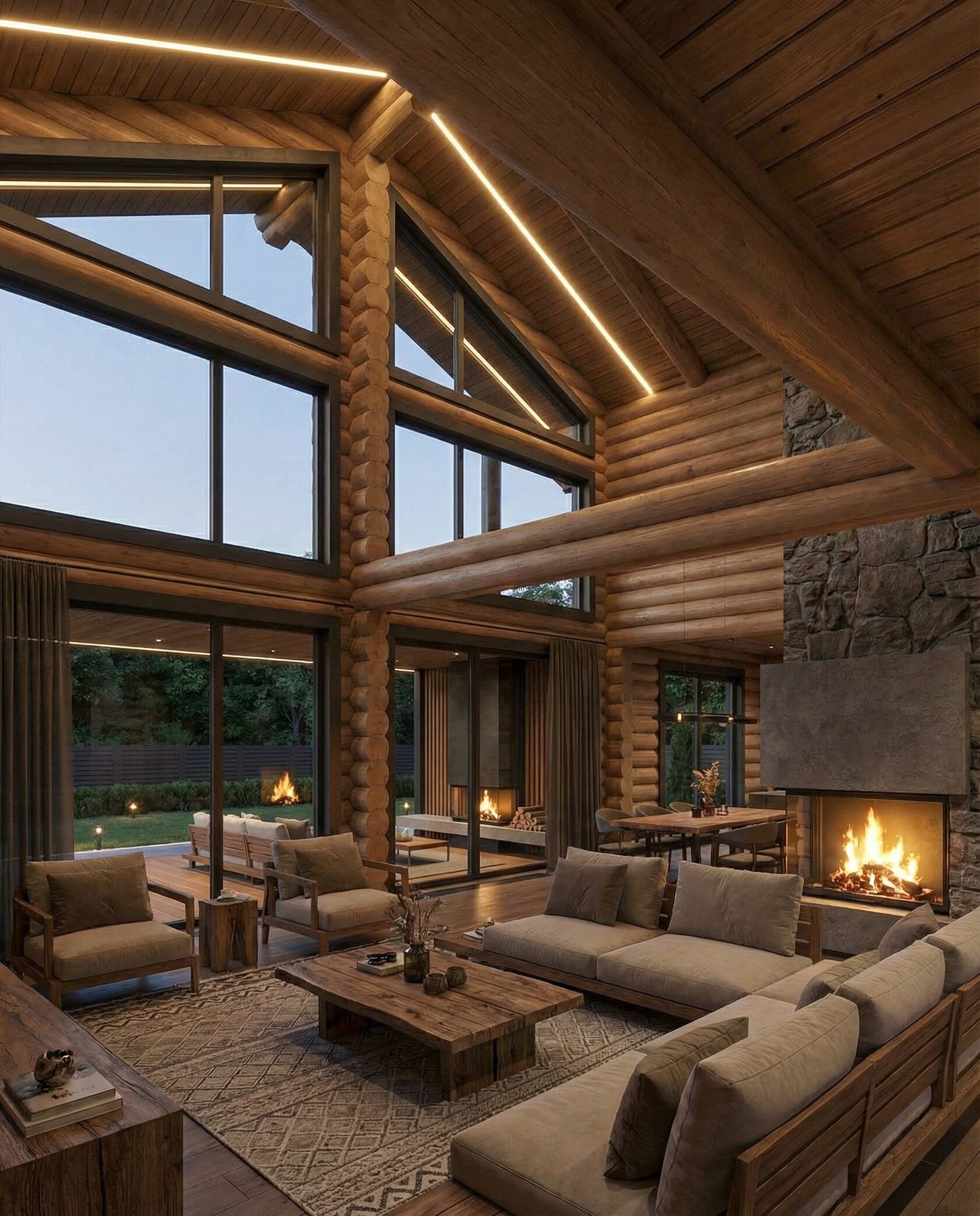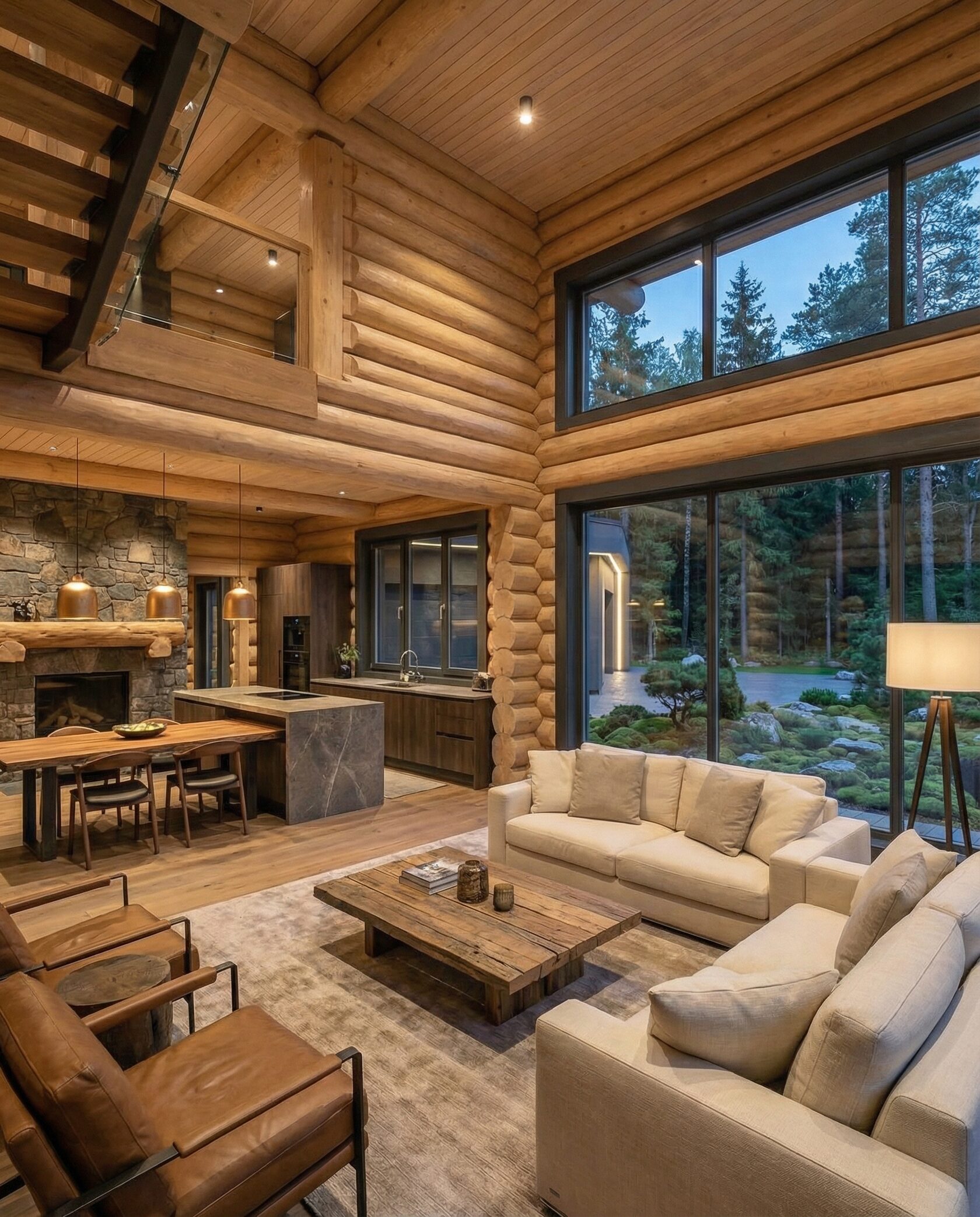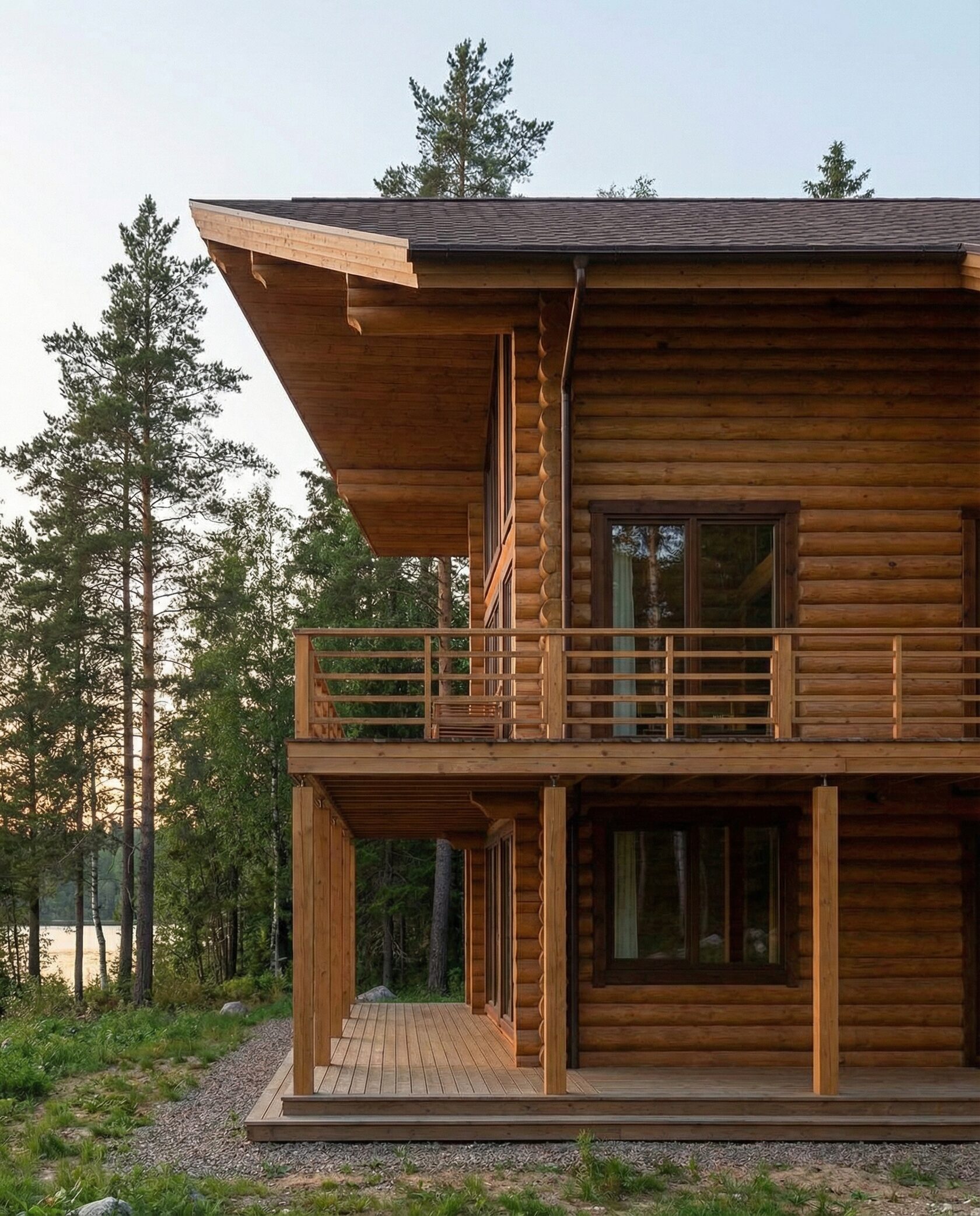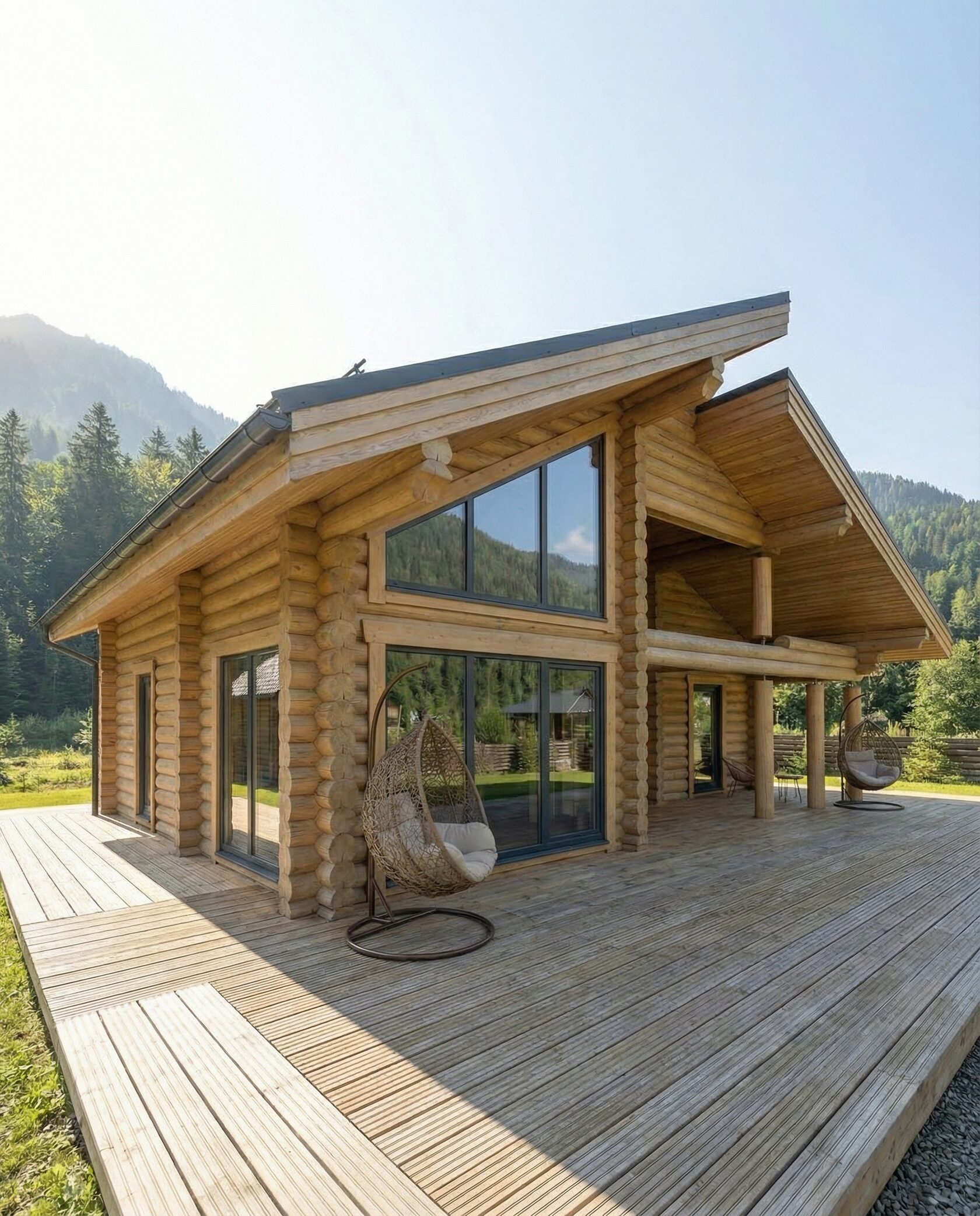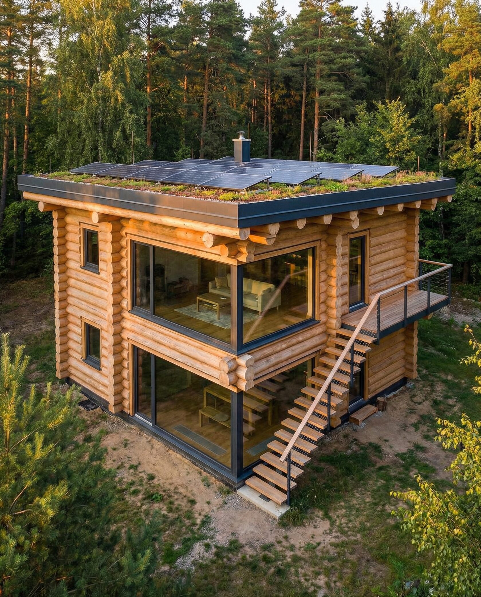 Дом «Алиот» — премиальный двухэтажный дом из оцилиндрованного бревна, где гармонично сочетаются эко-эстетика, свет, простор и технологичность. Панорамные окна на два этажа наполняют интерьер естественным светом и объединяют гостиную с природой, а камин создаёт уютный центр дома. Планировка продумана для максимального комфорта: двусветное пространство, открытая кухня с островом, просторные спальни с балконами, функциональное зонирование и стильные архитектурные элементы. Преимущества: долговечное оцилиндрованное бревно, энергоэффективные окна, шумоизоляция, просторные террасы, экологичные материалы и престижный современный дизайн. Дом «Алиот» — выбор для тех, кто ценит премиальный комфорт, простор и близость к природе.