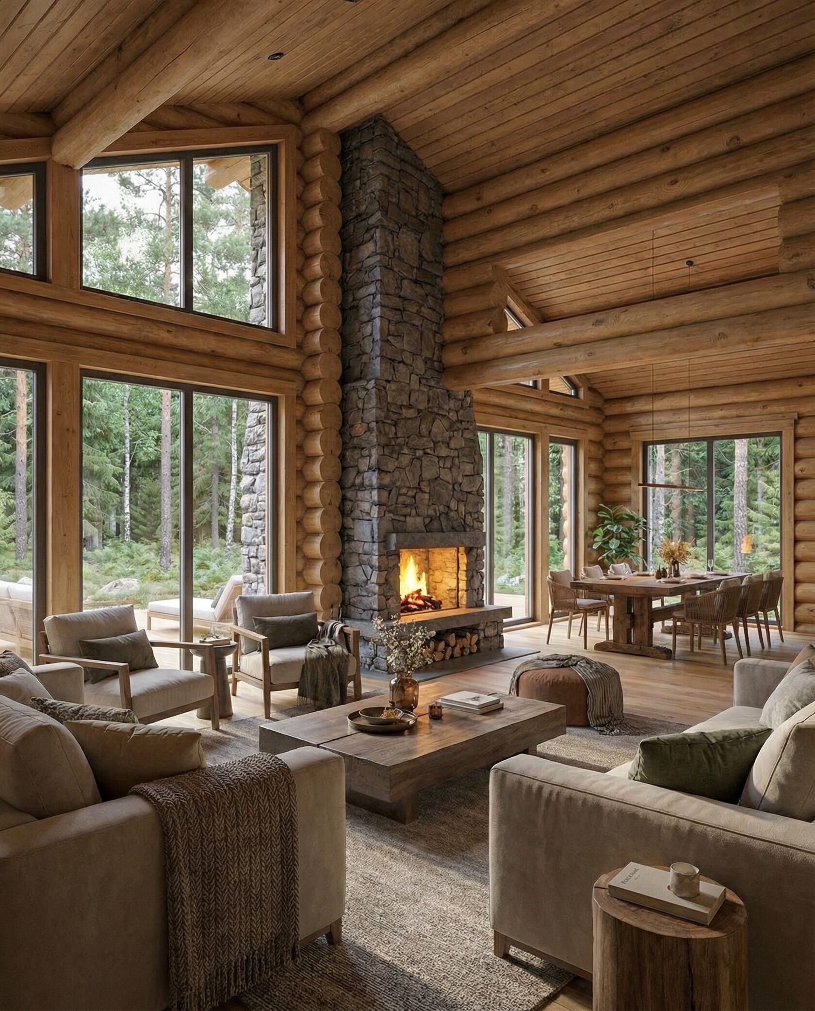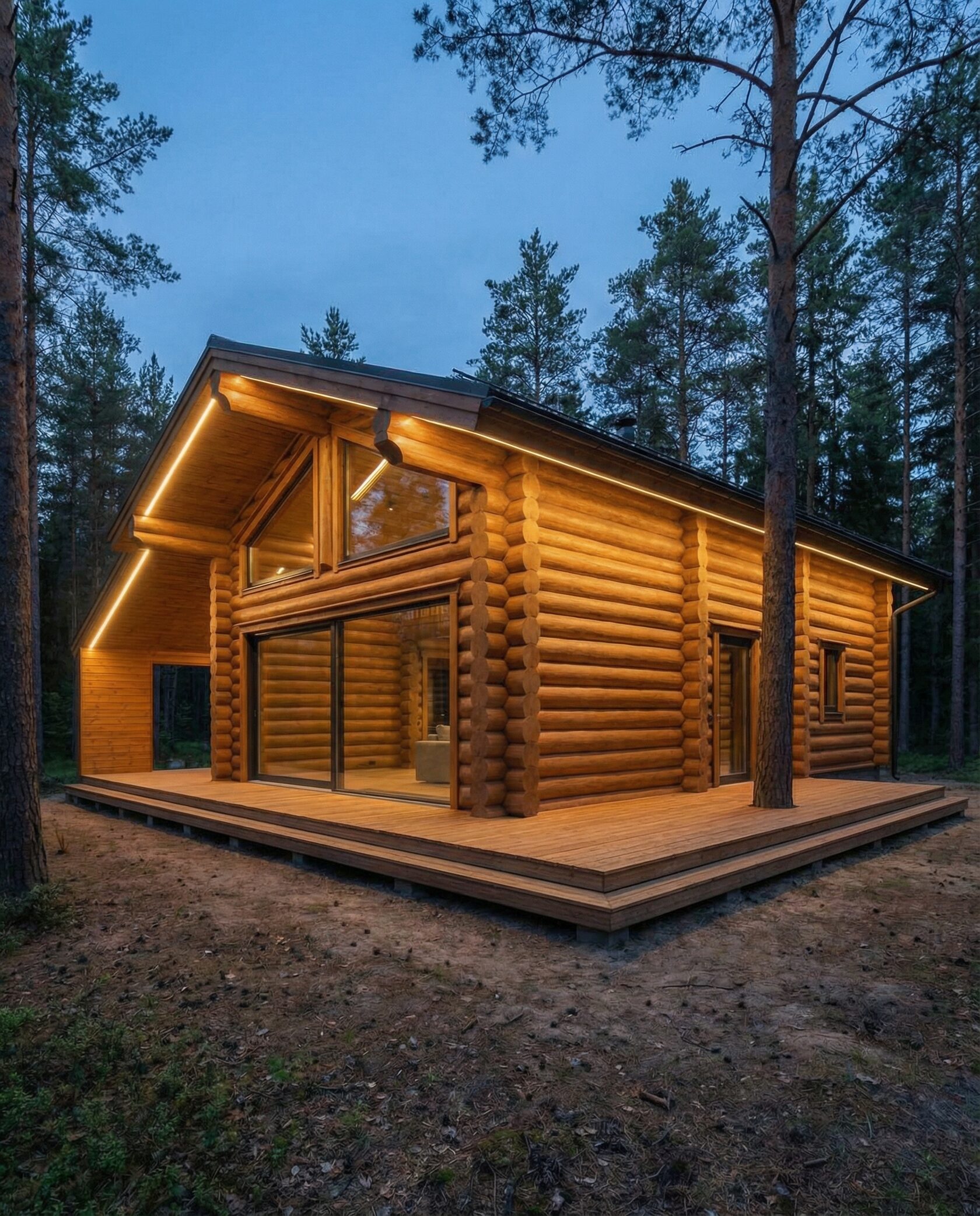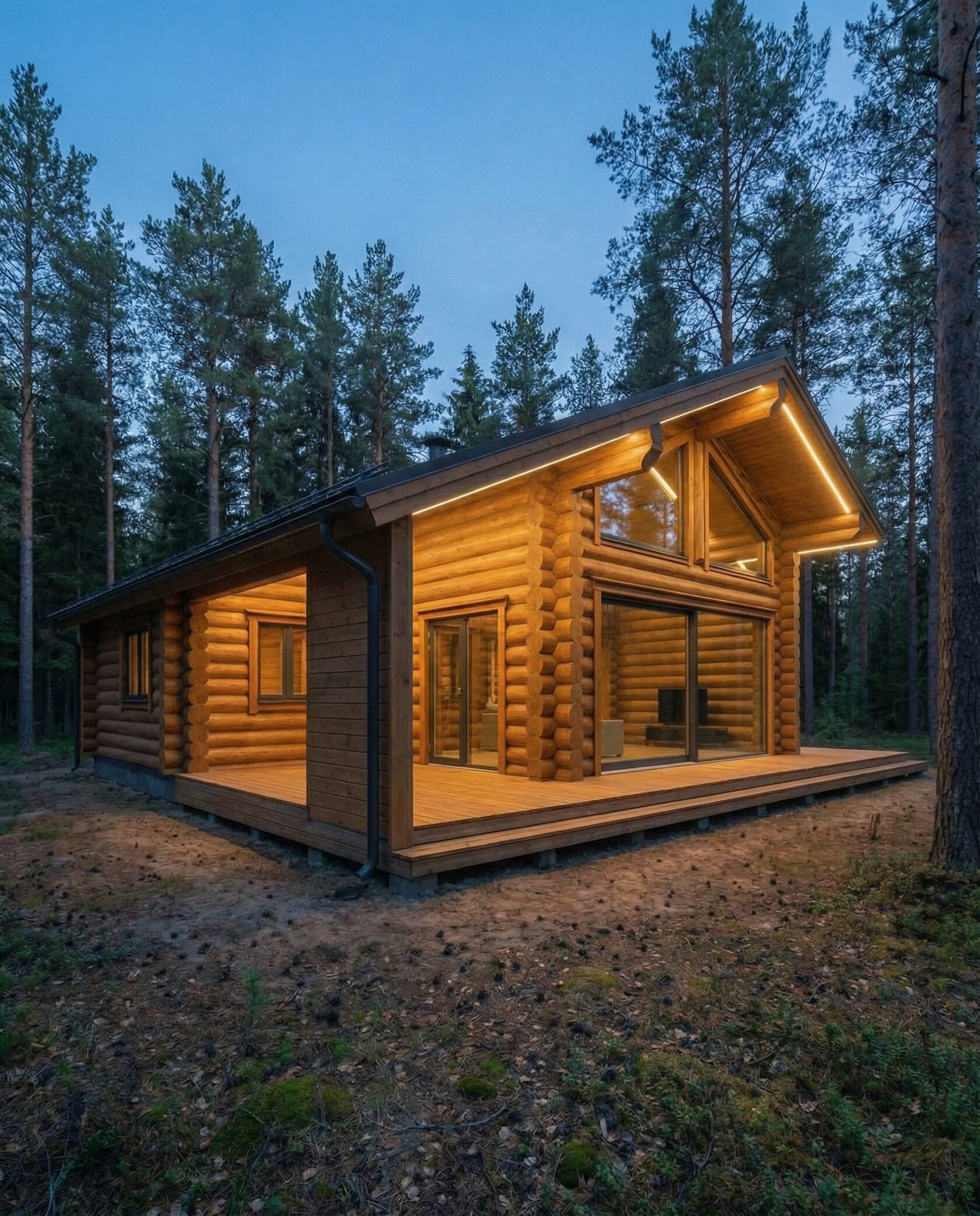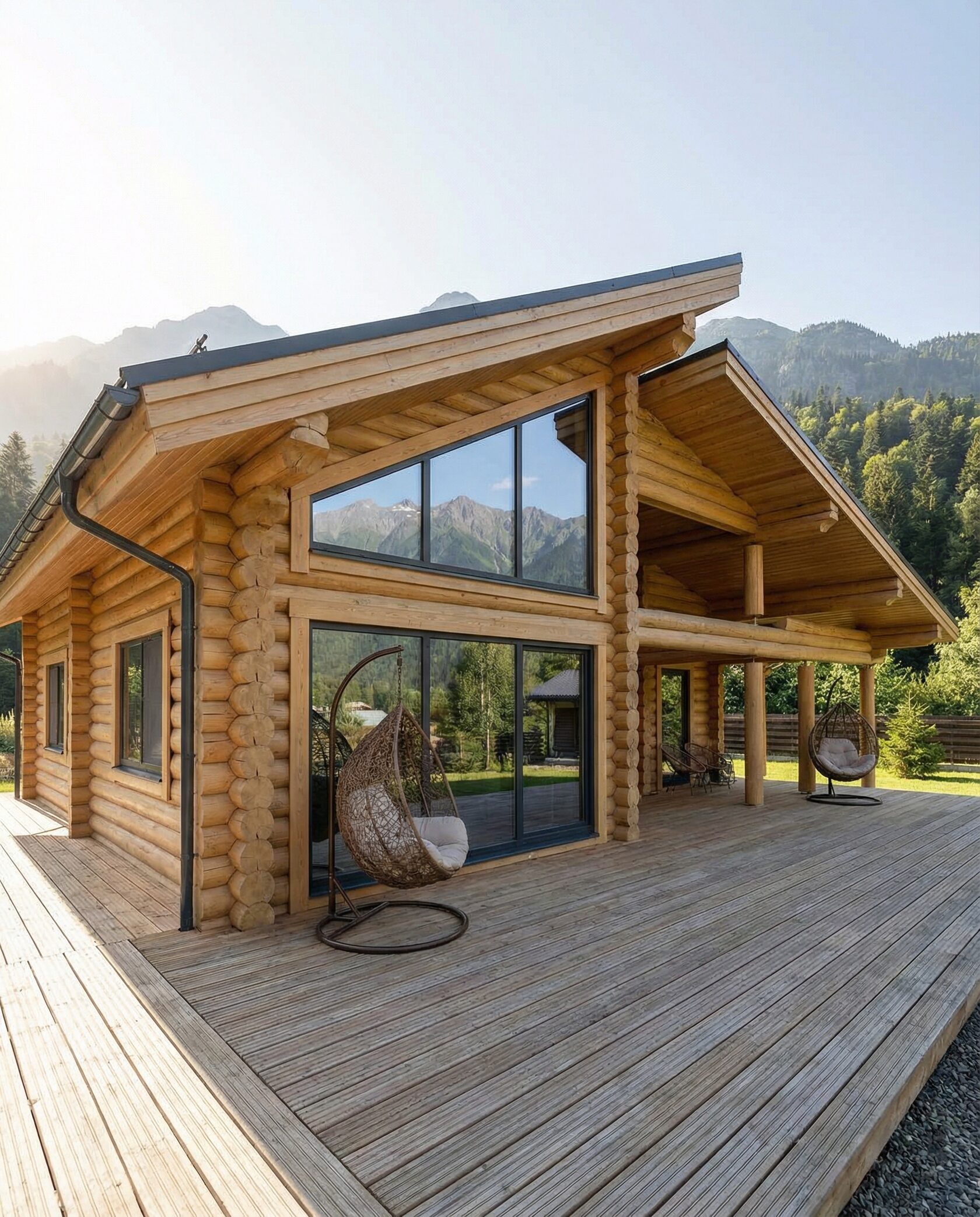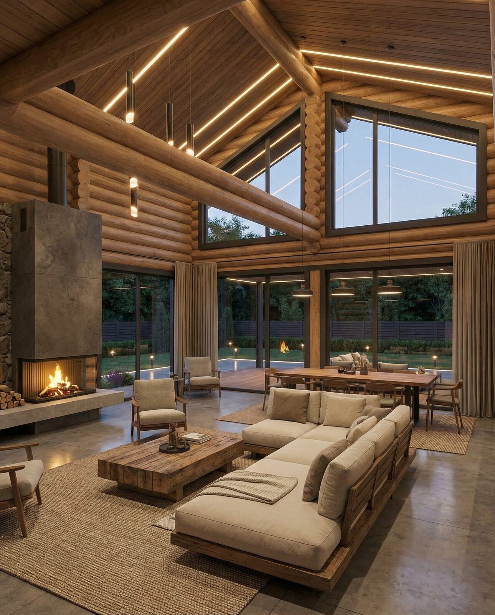 Дом «Алиот» — премиальный двухэтажный дом из оцилиндрованного бревна, где гармонично сочетаются эко-эстетика, свет, простор и технологичность. Панорамные окна на два этажа наполняют интерьер естественным светом и объединяют гостиную с природой, а камин создаёт уютный центр дома. Планировка продумана для максимального комфорта: двусветное пространство, открытая кухня с островом, просторные спальни с балконами, функциональное зонирование и стильные архитектурные элементы. Преимущества: долговечное оцилиндрованное бревно, энергоэффективные окна, шумоизоляция, просторные террасы, экологичные материалы и престижный современный дизайн. Дом «Алиот» — выбор для тех, кто ценит премиальный комфорт, простор и близость к природе.