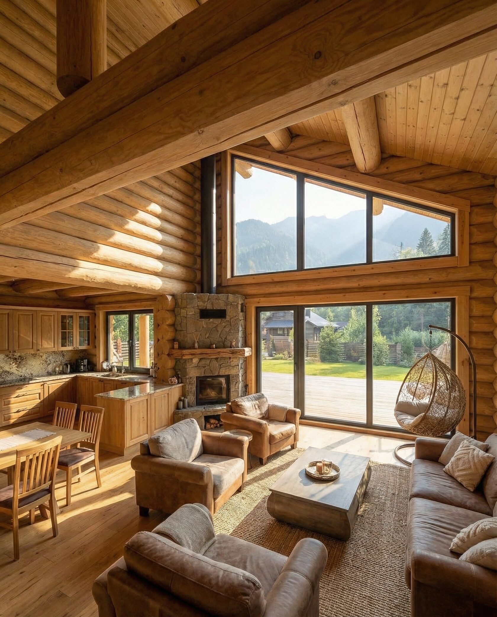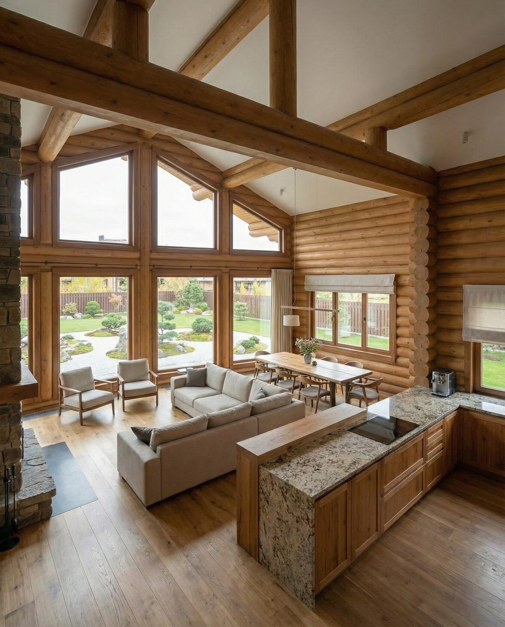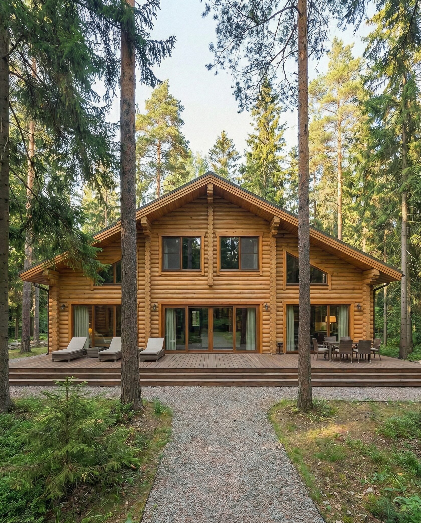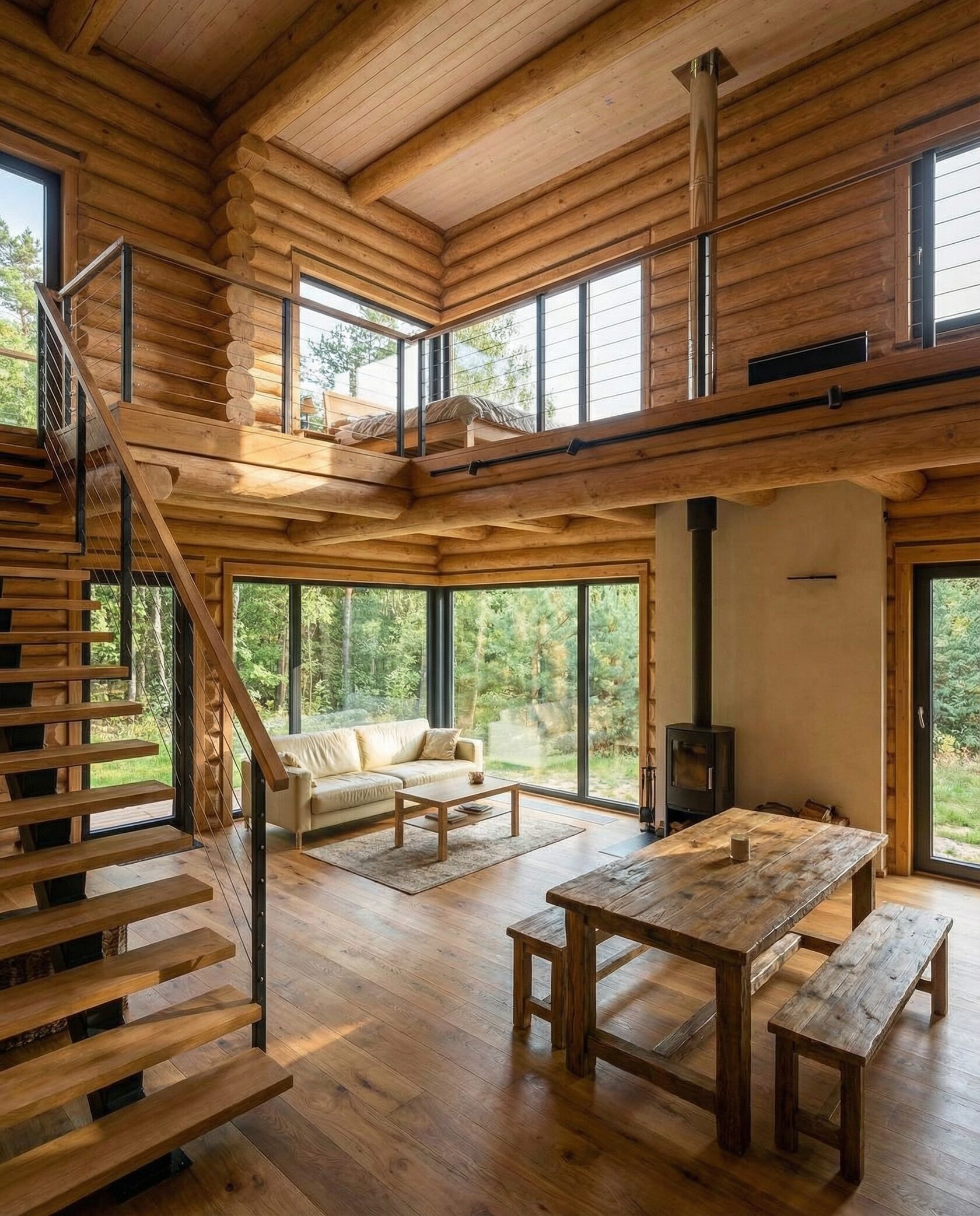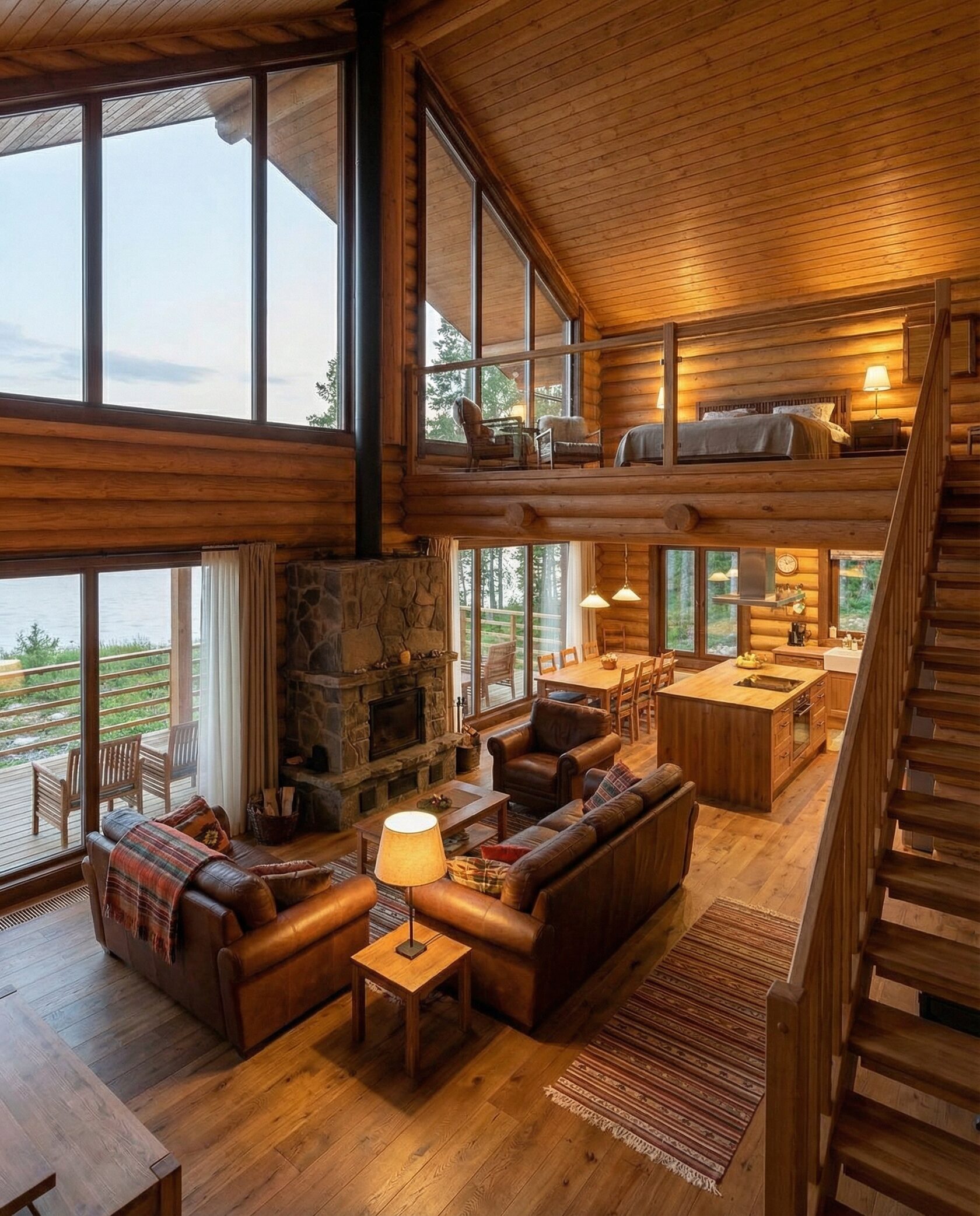 Дом «Алиот» — премиальный двухэтажный дом из оцилиндрованного бревна, где гармонично сочетаются эко-эстетика, свет, простор и технологичность. Панорамные окна на два этажа наполняют интерьер естественным светом и объединяют гостиную с природой, а камин создаёт уютный центр дома. Планировка продумана для максимального комфорта: двусветное пространство, открытая кухня с островом, просторные спальни с балконами, функциональное зонирование и стильные архитектурные элементы. Преимущества: долговечное оцилиндрованное бревно, энергоэффективные окна, шумоизоляция, просторные террасы, экологичные материалы и престижный современный дизайн. Дом «Алиот» — выбор для тех, кто ценит премиальный комфорт, простор и близость к природе.