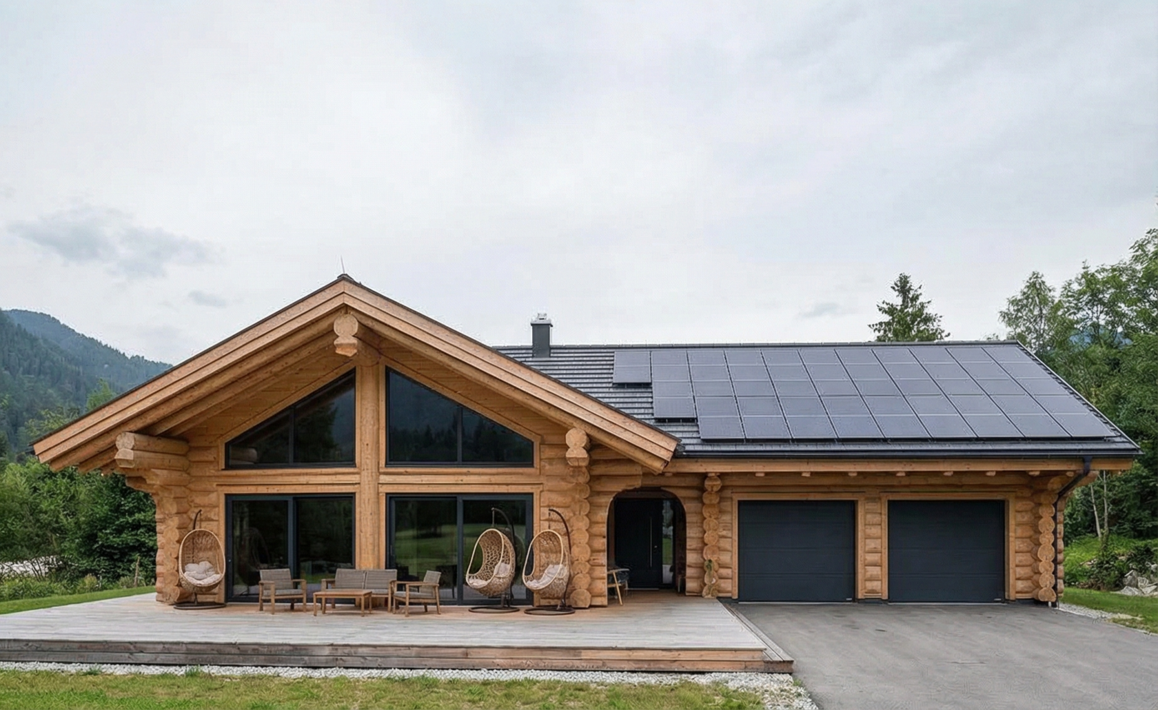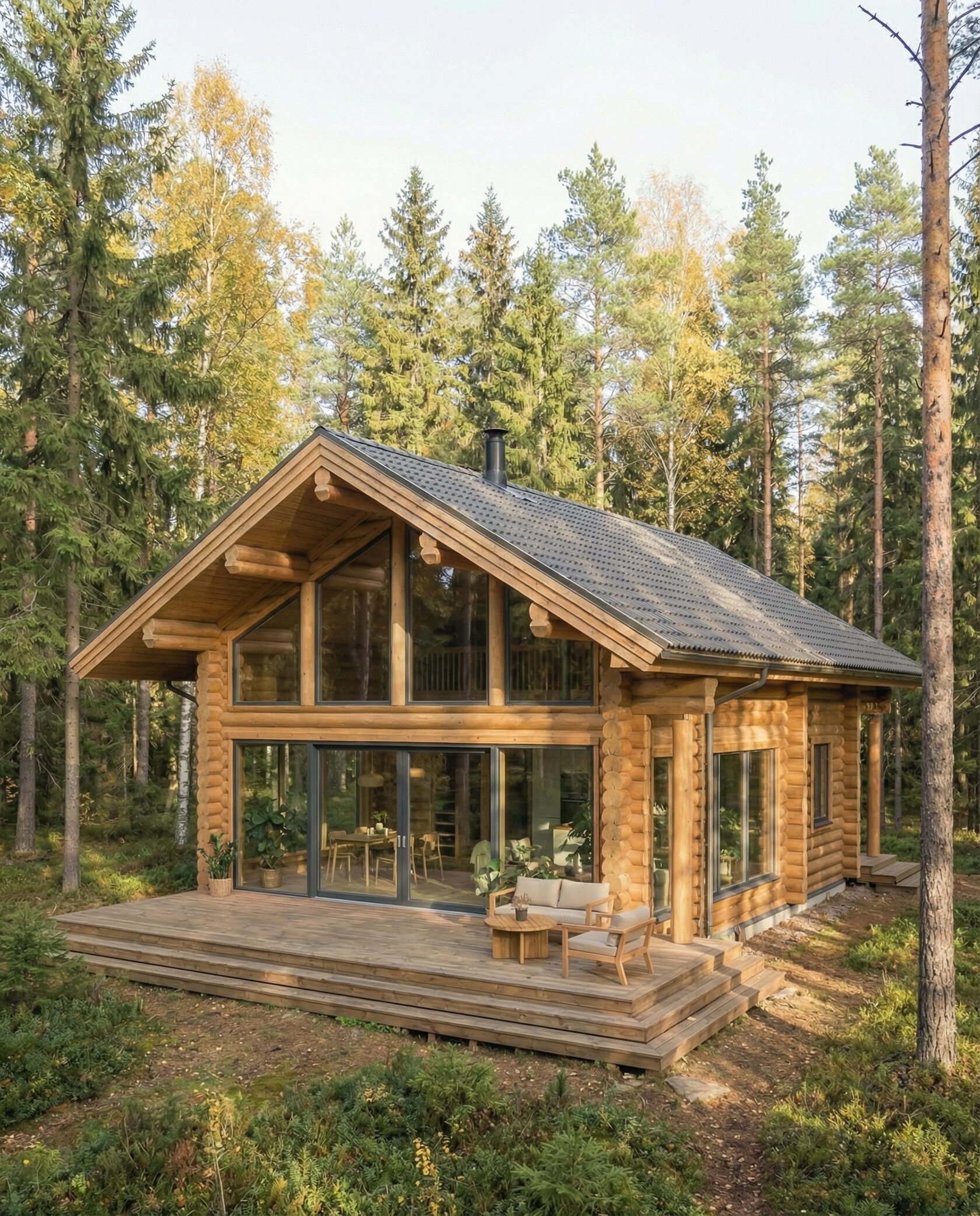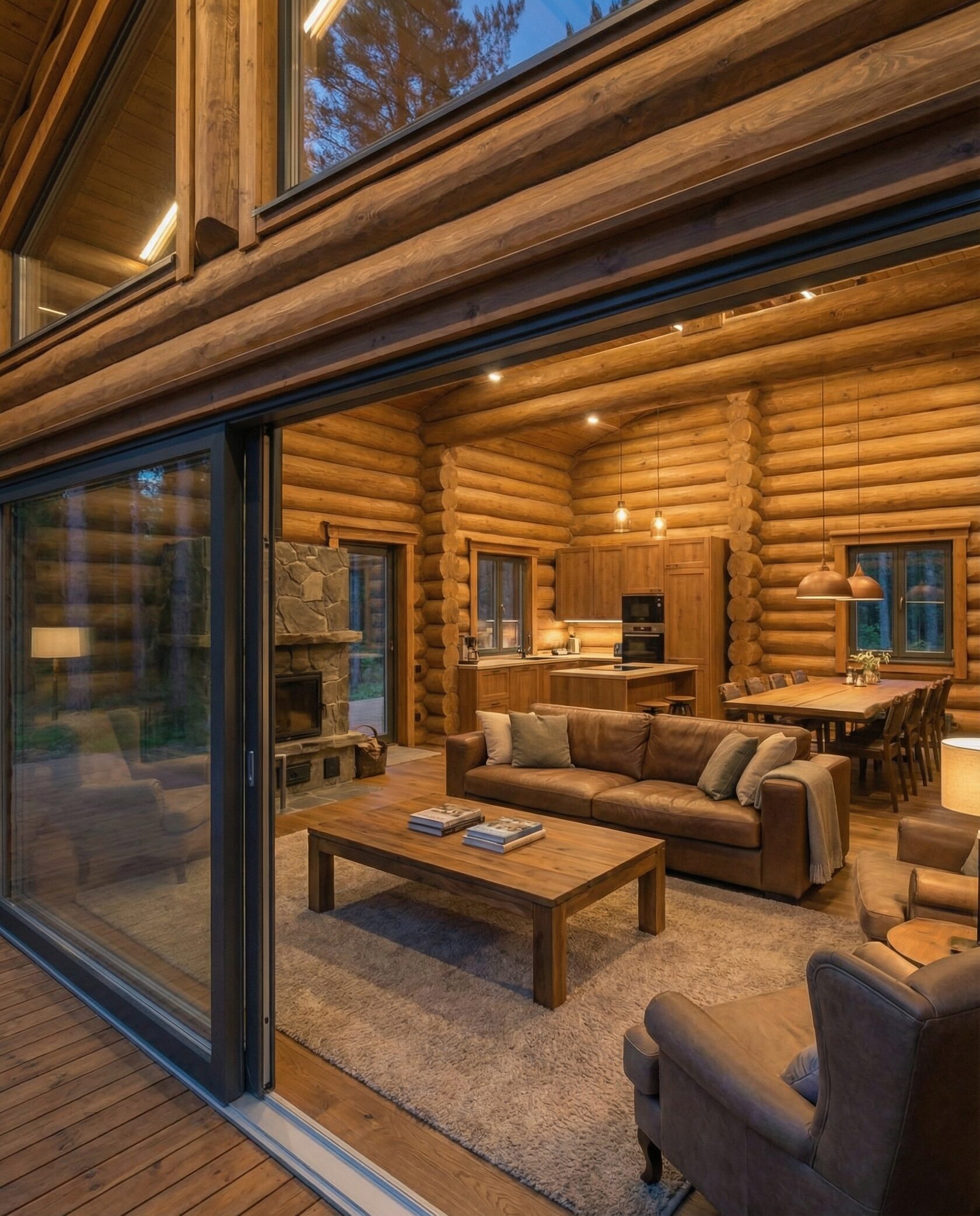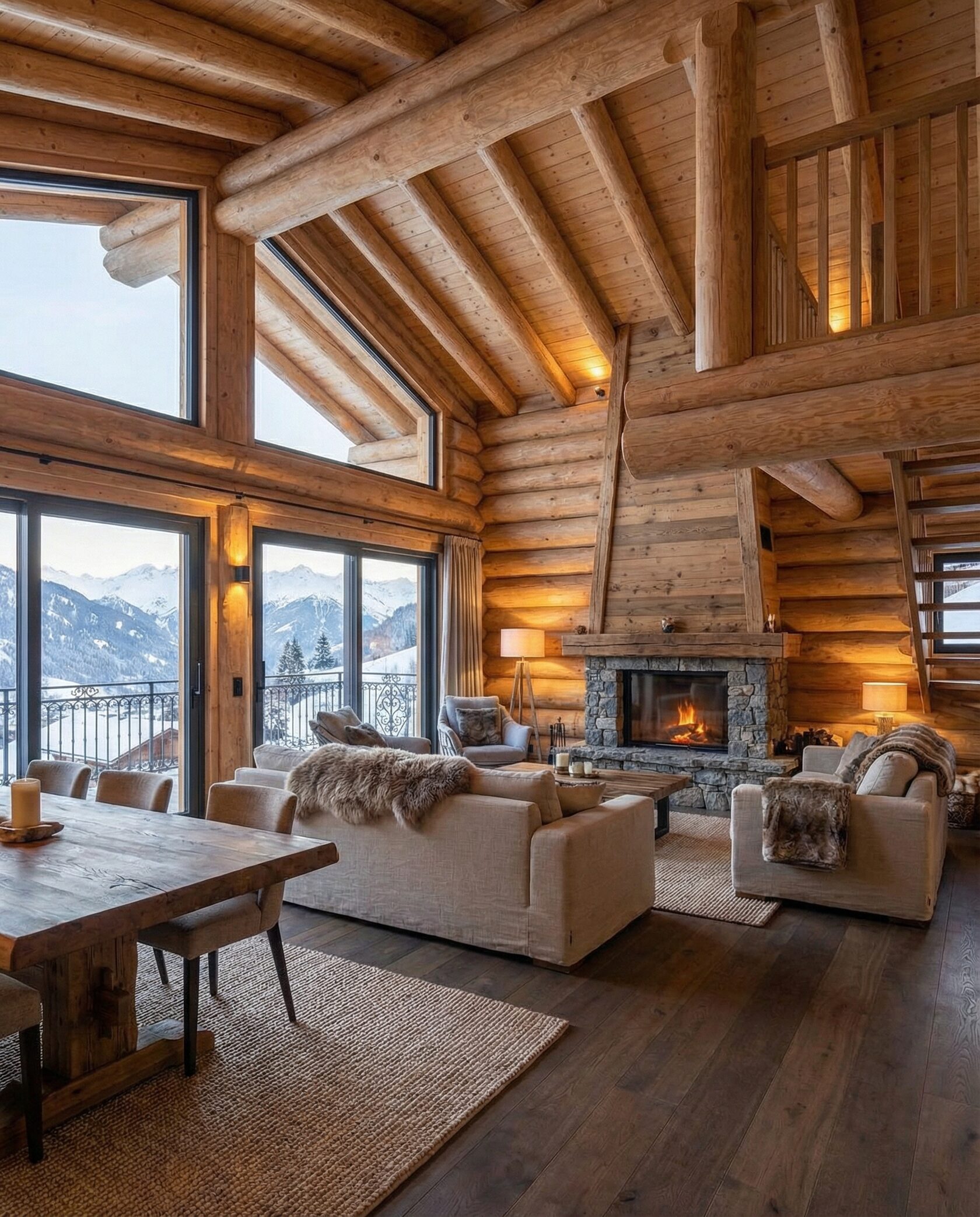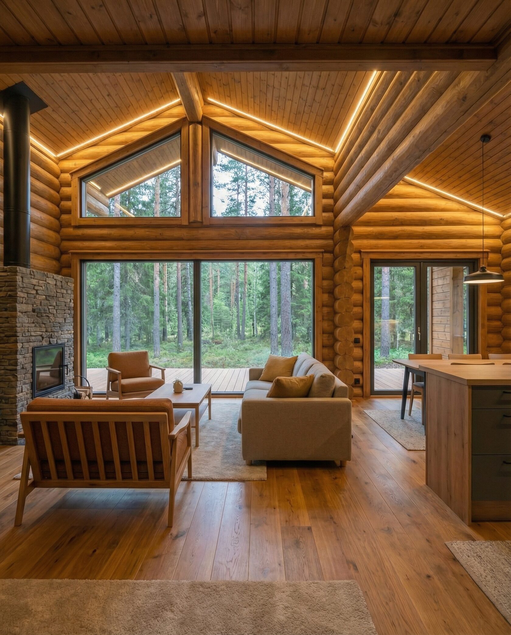 Дом «Алиот» — премиальный двухэтажный дом из оцилиндрованного бревна, где гармонично сочетаются эко-эстетика, свет, простор и технологичность. Панорамные окна на два этажа наполняют интерьер естественным светом и объединяют гостиную с природой, а камин создаёт уютный центр дома. Планировка продумана для максимального комфорта: двусветное пространство, открытая кухня с островом, просторные спальни с балконами, функциональное зонирование и стильные архитектурные элементы. Преимущества: долговечное оцилиндрованное бревно, энергоэффективные окна, шумоизоляция, просторные террасы, экологичные материалы и престижный современный дизайн. Дом «Алиот» — выбор для тех, кто ценит премиальный комфорт, простор и близость к природе.