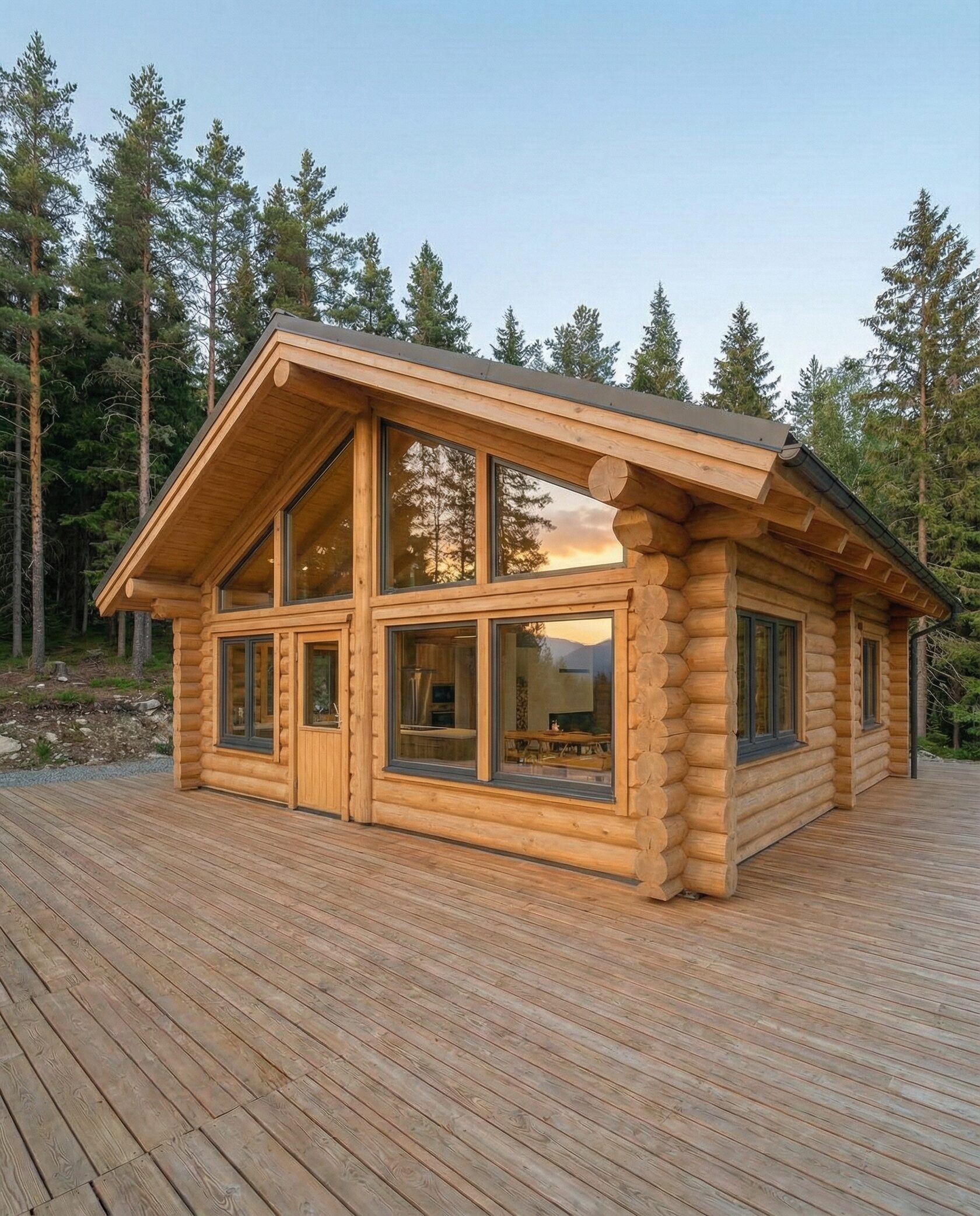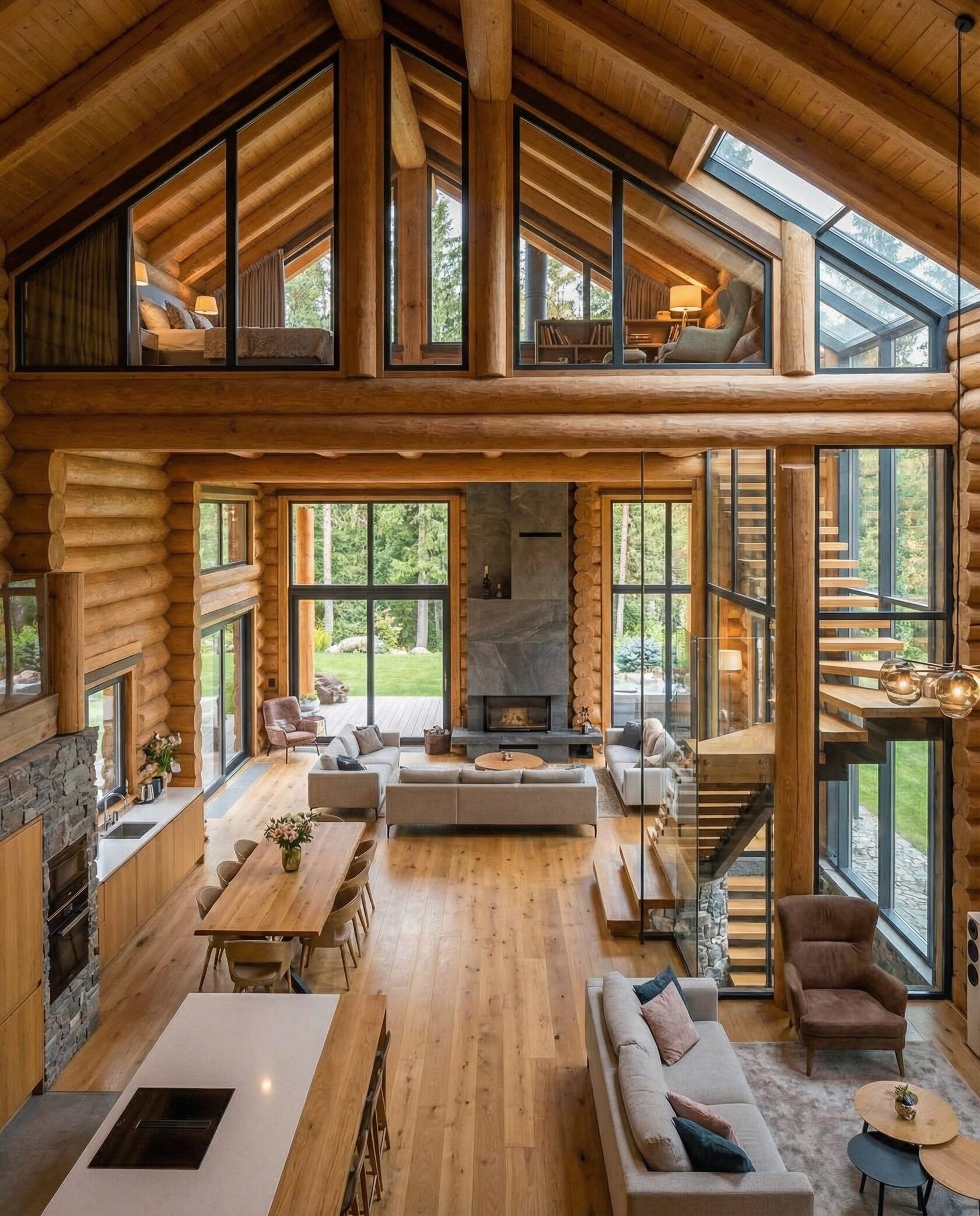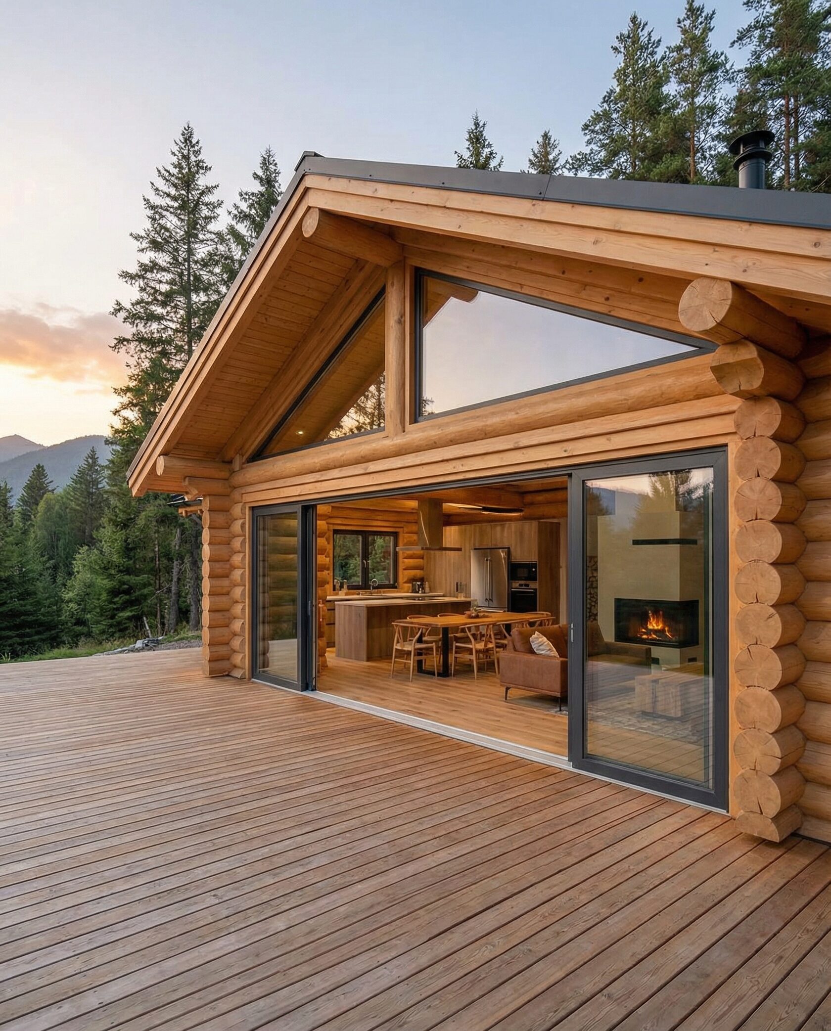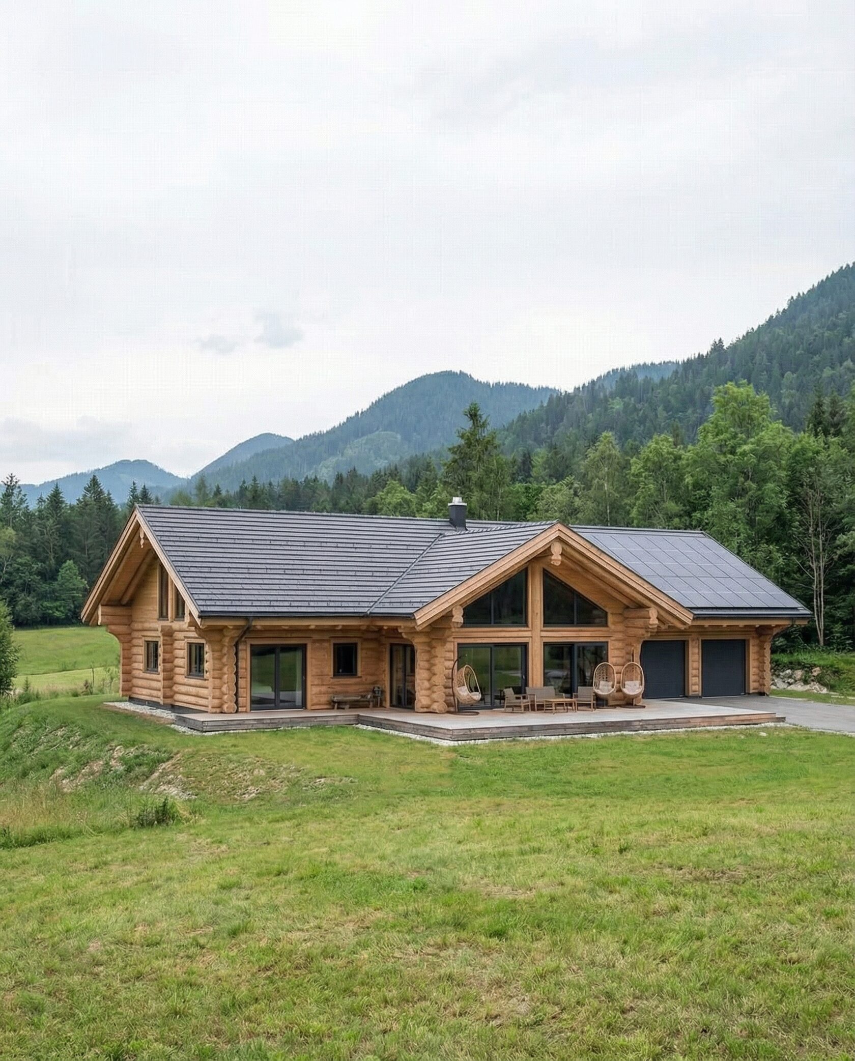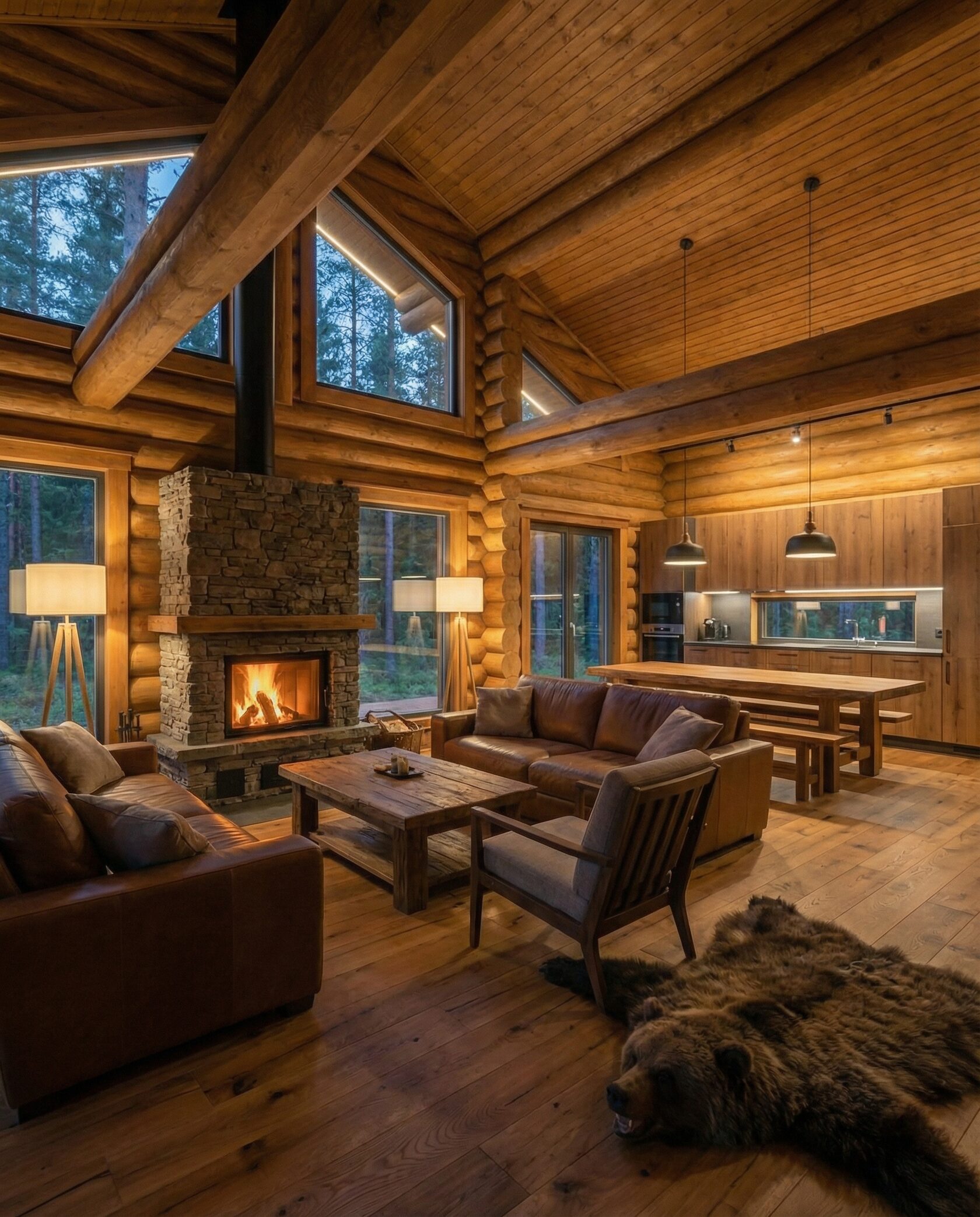 Дом «Алиот» — премиальный двухэтажный дом из оцилиндрованного бревна, где гармонично сочетаются эко-эстетика, свет, простор и технологичность. Панорамные окна на два этажа наполняют интерьер естественным светом и объединяют гостиную с природой, а камин создаёт уютный центр дома. Планировка продумана для максимального комфорта: двусветное пространство, открытая кухня с островом, просторные спальни с балконами, функциональное зонирование и стильные архитектурные элементы. Преимущества: долговечное оцилиндрованное бревно, энергоэффективные окна, шумоизоляция, просторные террасы, экологичные материалы и престижный современный дизайн. Дом «Алиот» — выбор для тех, кто ценит премиальный комфорт, простор и близость к природе.