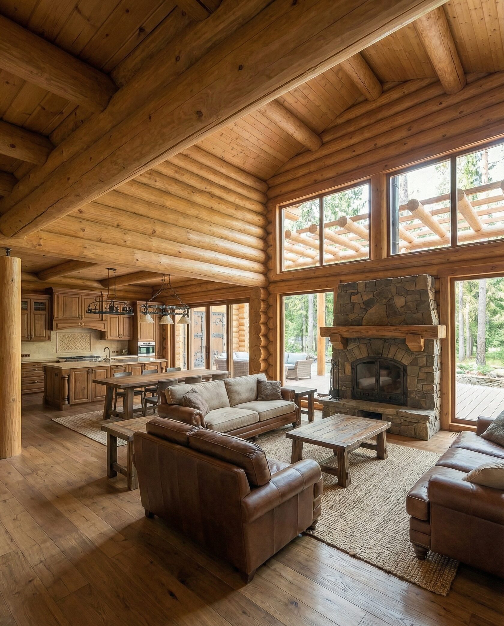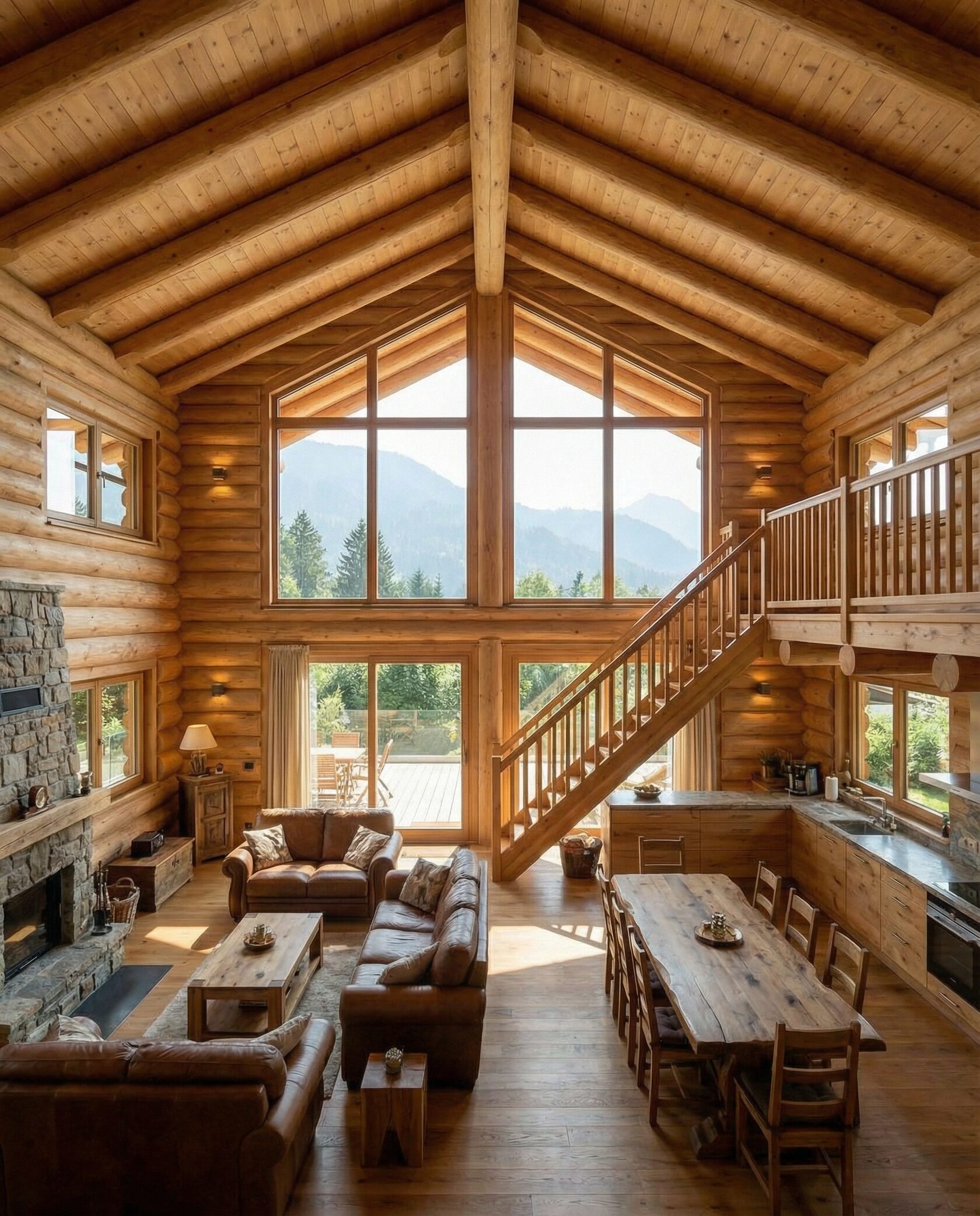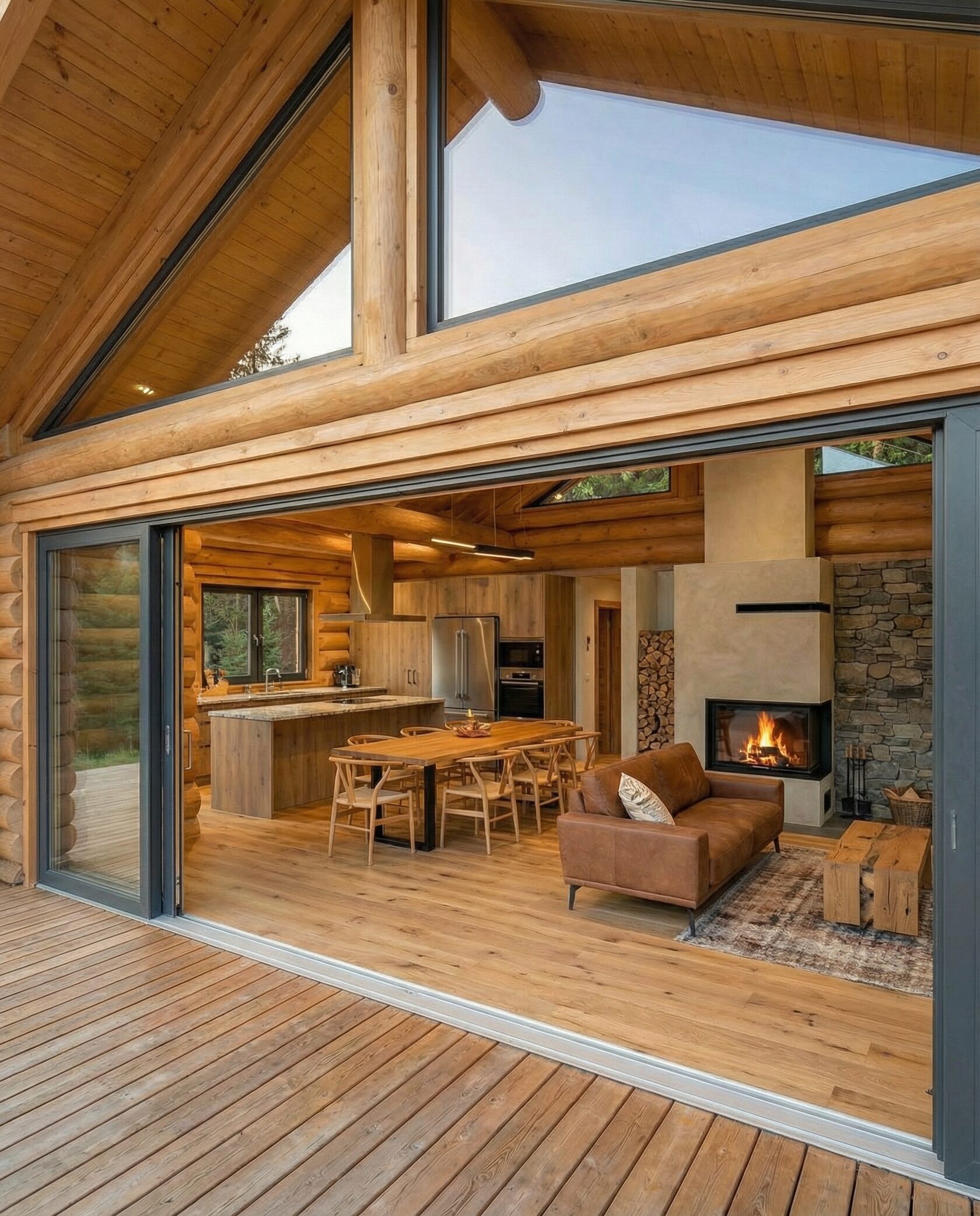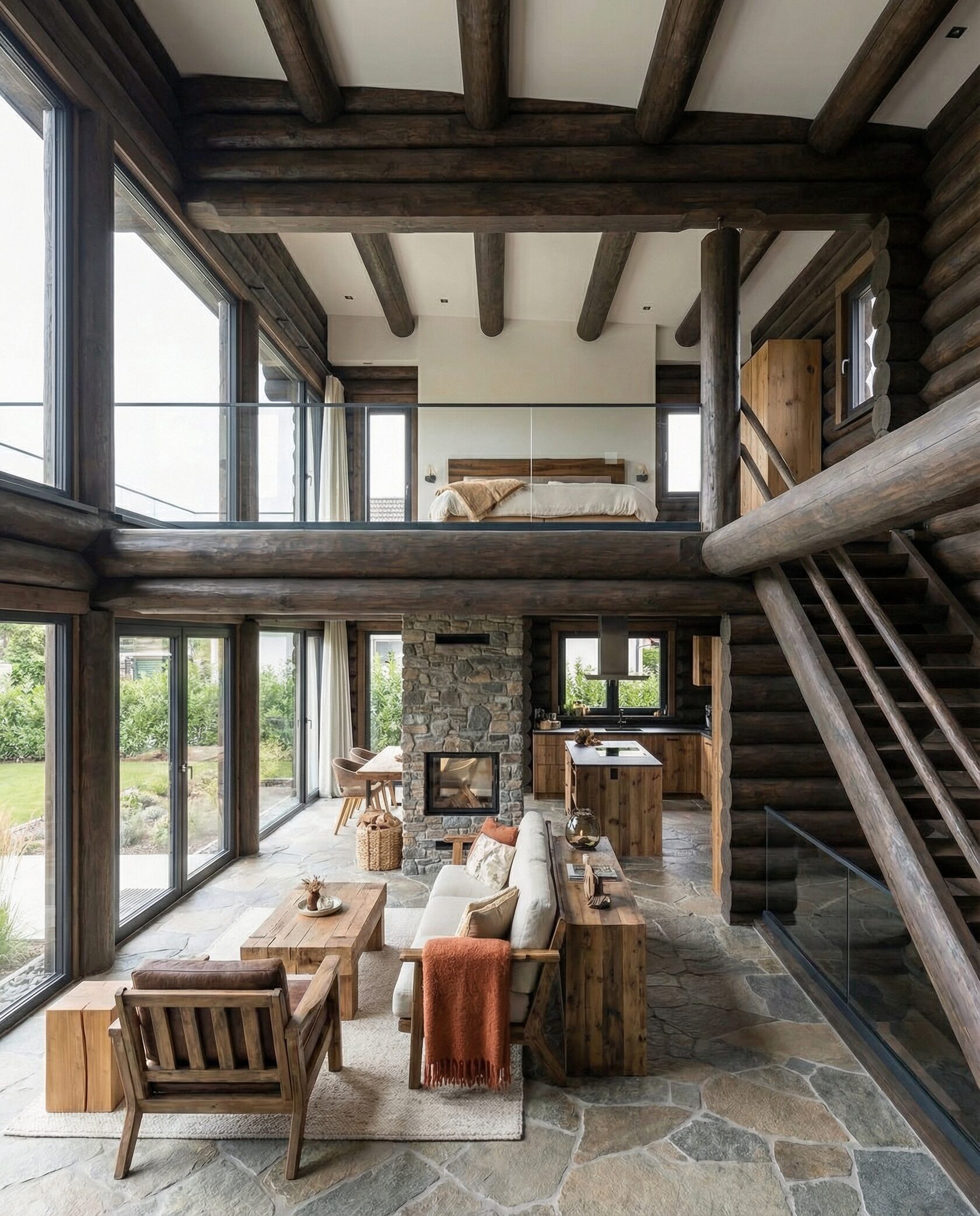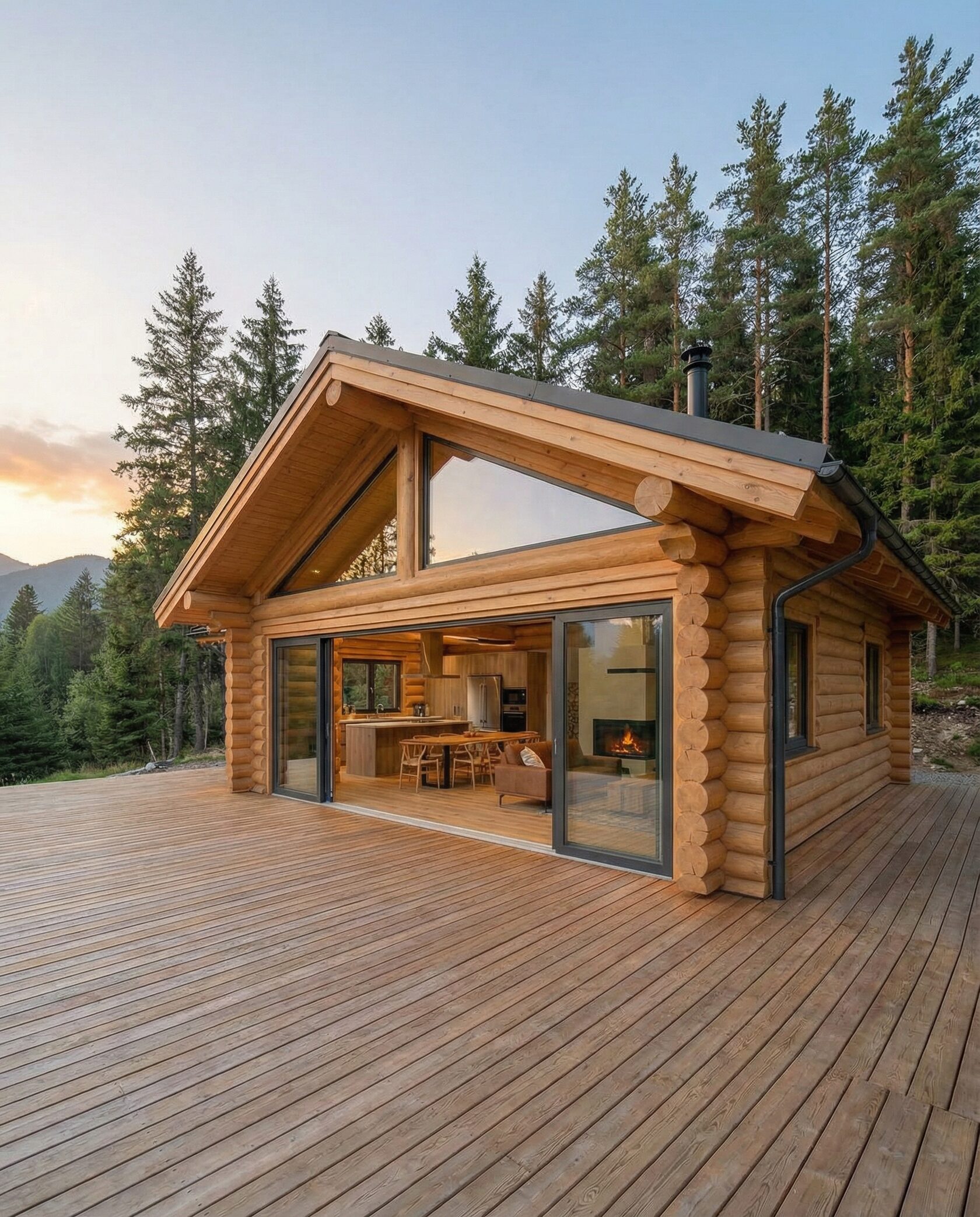 Дом «Алиот» — премиальный двухэтажный дом из оцилиндрованного бревна, где гармонично сочетаются эко-эстетика, свет, простор и технологичность. Панорамные окна на два этажа наполняют интерьер естественным светом и объединяют гостиную с природой, а камин создаёт уютный центр дома. Планировка продумана для максимального комфорта: двусветное пространство, открытая кухня с островом, просторные спальни с балконами, функциональное зонирование и стильные архитектурные элементы. Преимущества: долговечное оцилиндрованное бревно, энергоэффективные окна, шумоизоляция, просторные террасы, экологичные материалы и престижный современный дизайн. Дом «Алиот» — выбор для тех, кто ценит премиальный комфорт, простор и близость к природе.