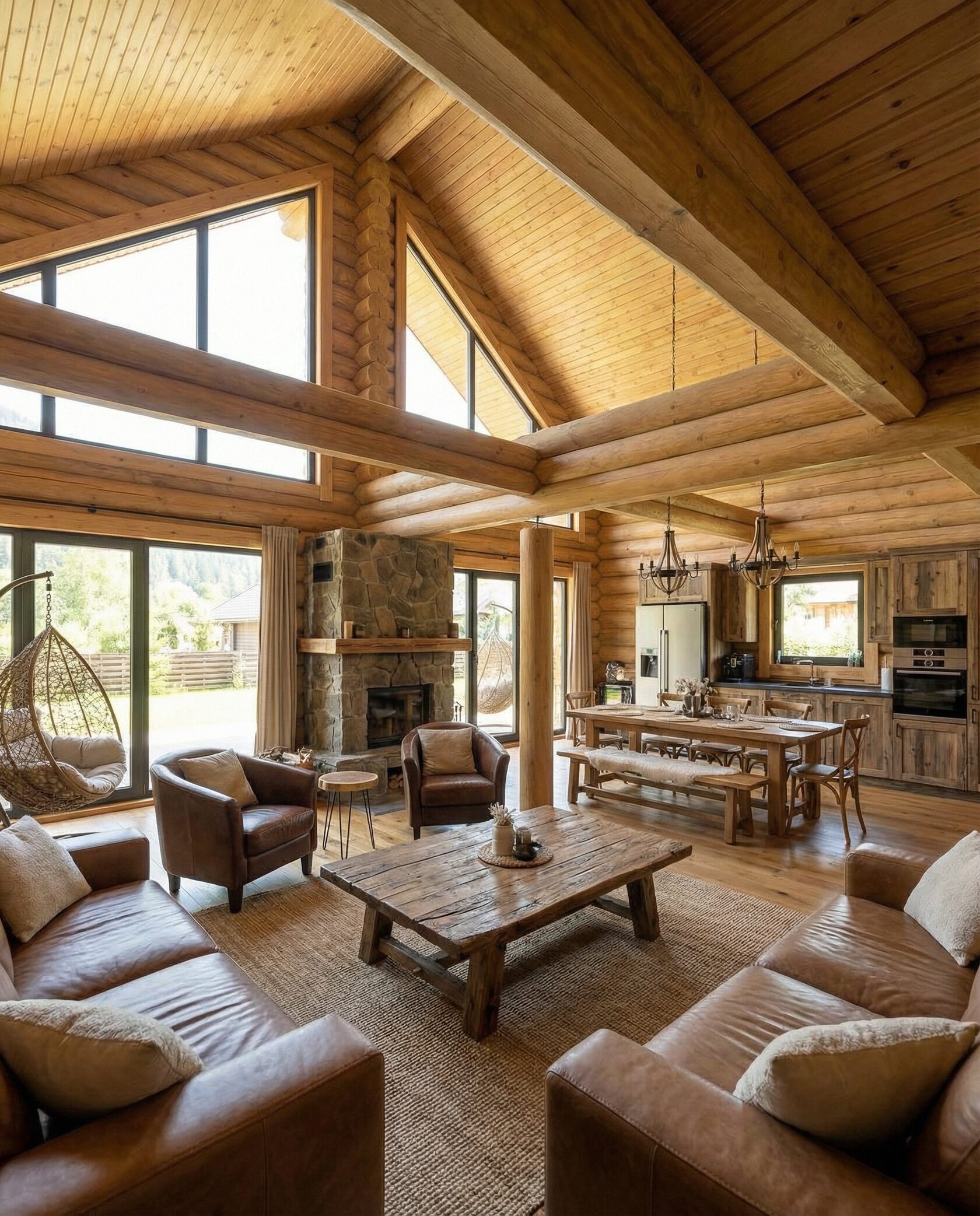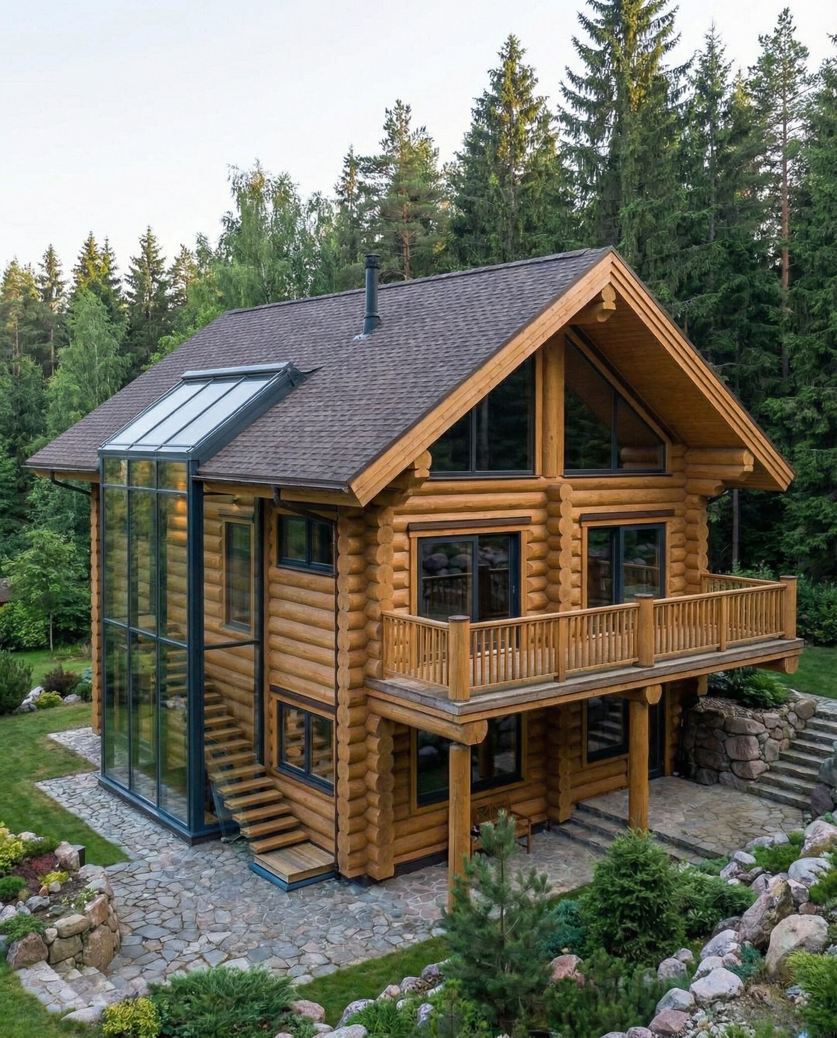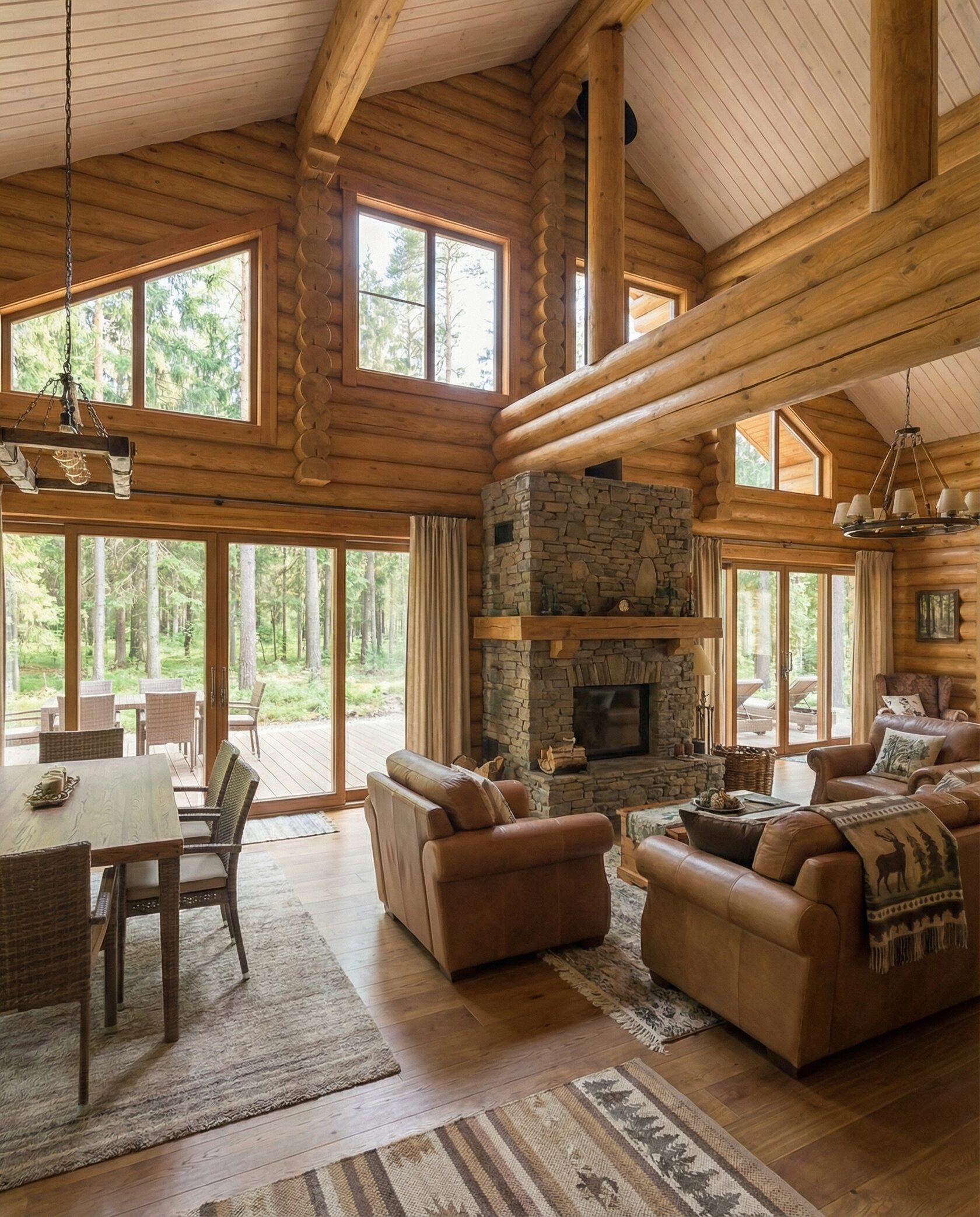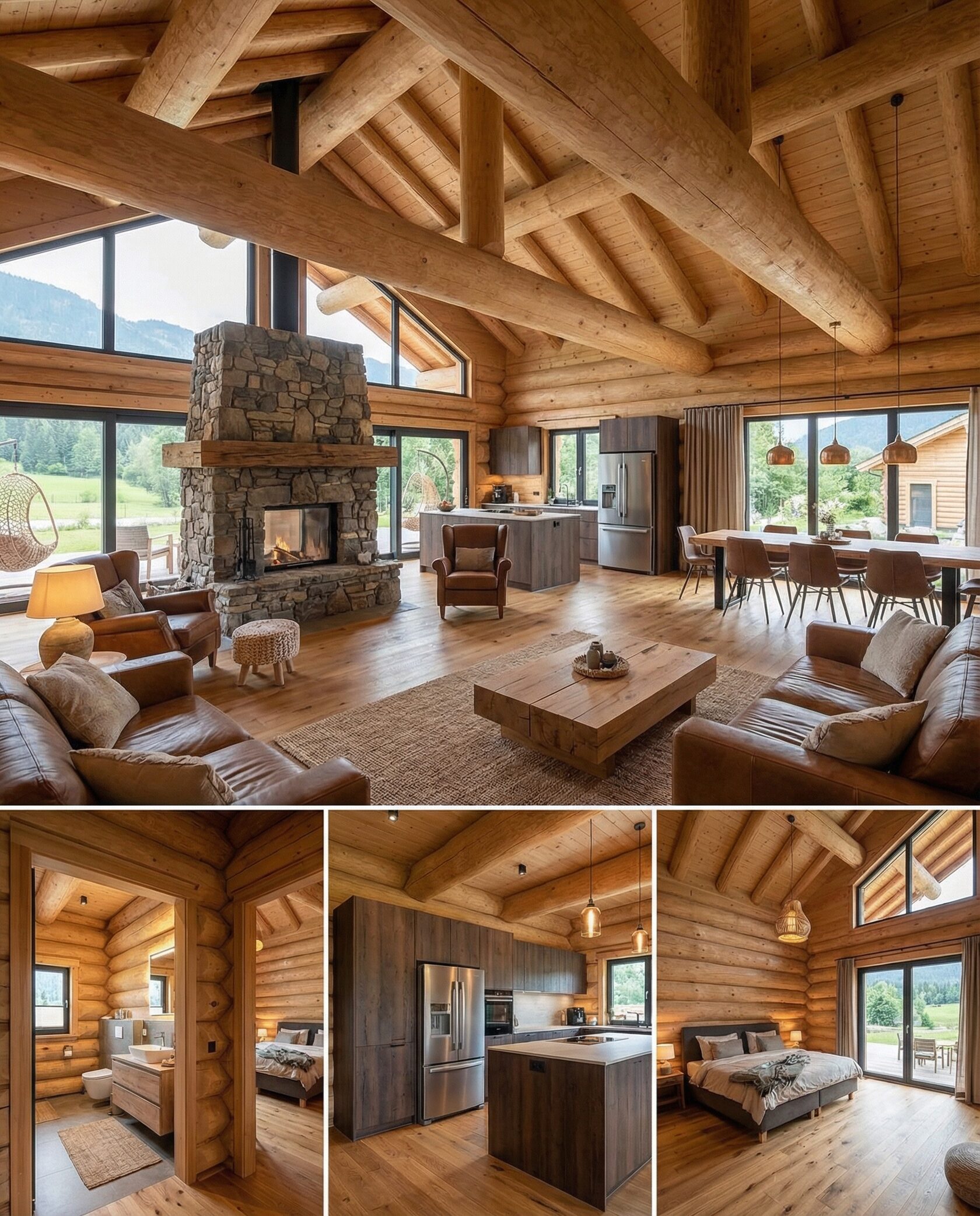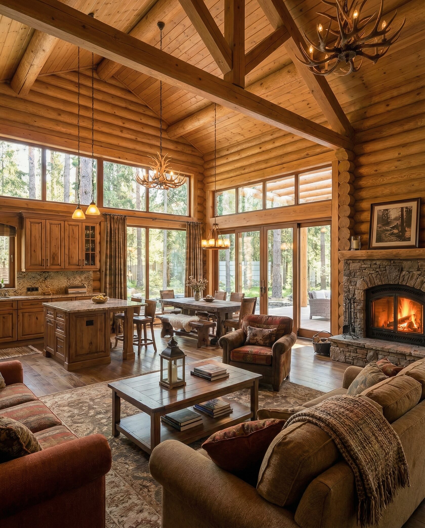 Дом «Алиот» — премиальный двухэтажный дом из оцилиндрованного бревна, где гармонично сочетаются эко-эстетика, свет, простор и технологичность. Панорамные окна на два этажа наполняют интерьер естественным светом и объединяют гостиную с природой, а камин создаёт уютный центр дома. Планировка продумана для максимального комфорта: двусветное пространство, открытая кухня с островом, просторные спальни с балконами, функциональное зонирование и стильные архитектурные элементы. Преимущества: долговечное оцилиндрованное бревно, энергоэффективные окна, шумоизоляция, просторные террасы, экологичные материалы и престижный современный дизайн. Дом «Алиот» — выбор для тех, кто ценит премиальный комфорт, простор и близость к природе.