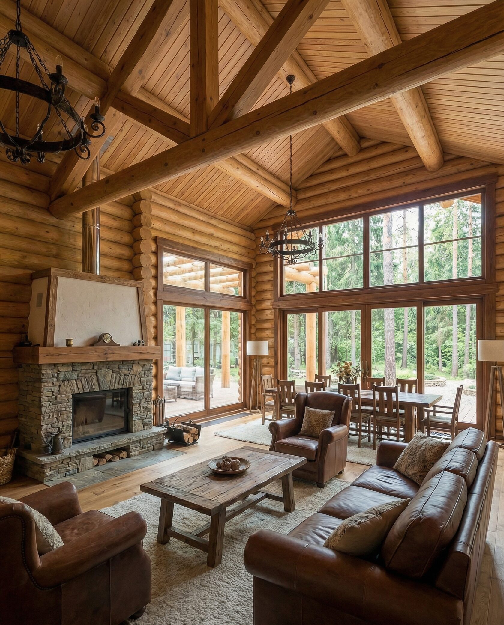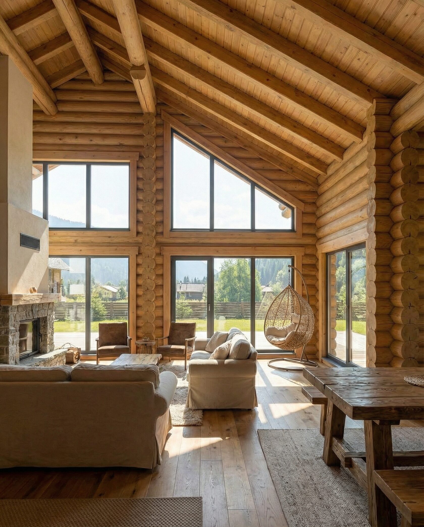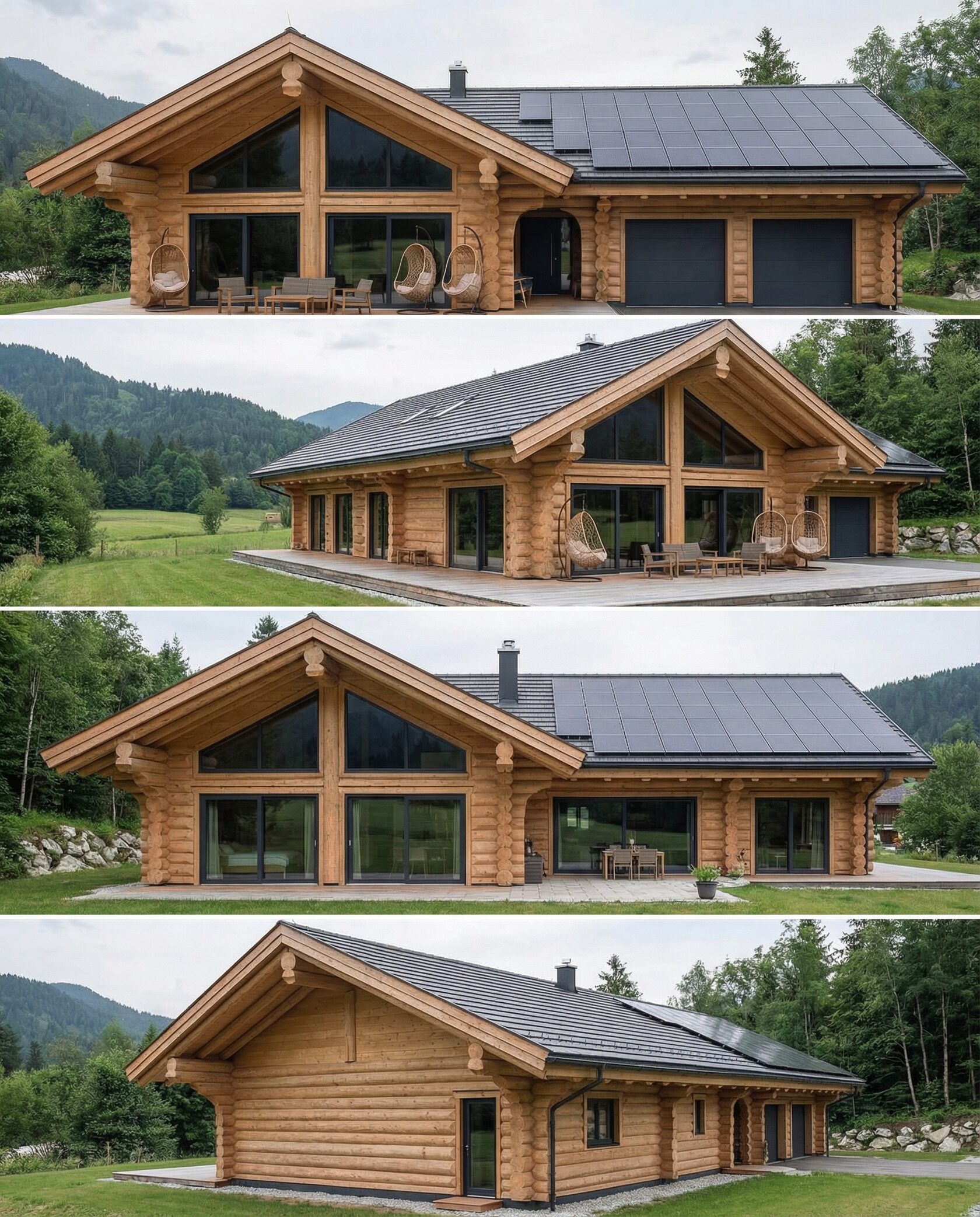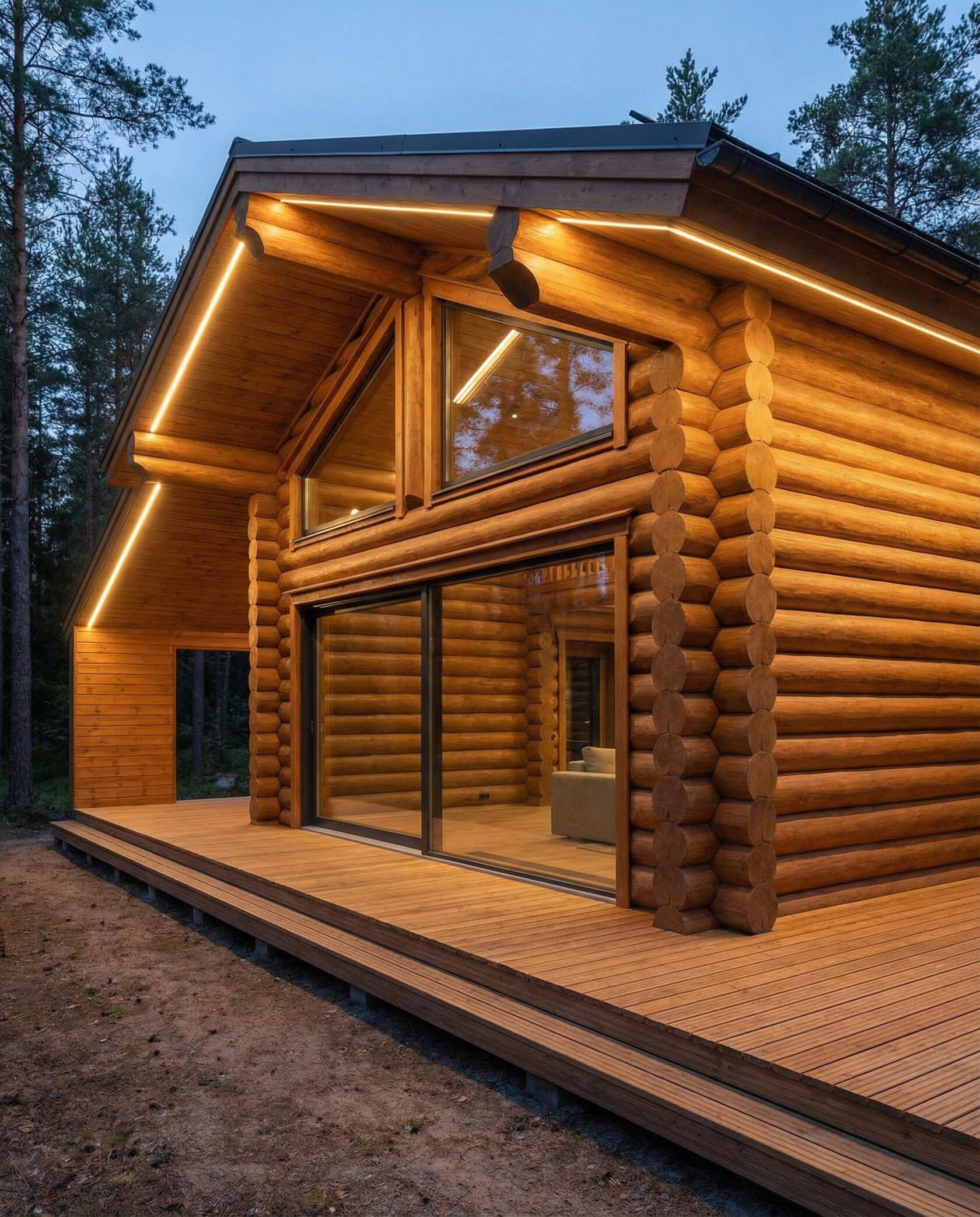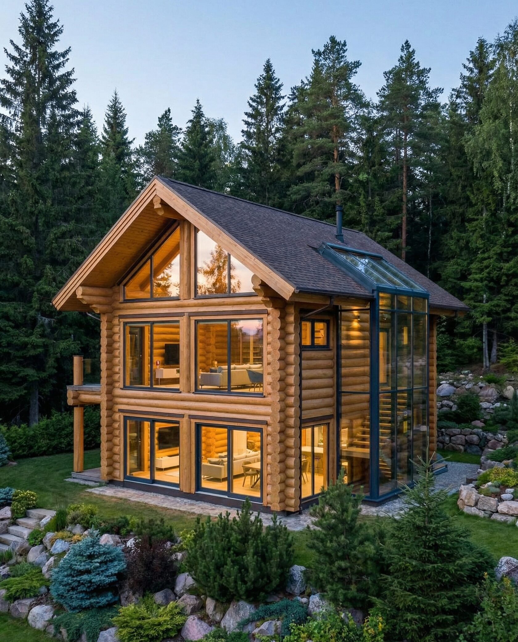 Дом «Алиот» — премиальный двухэтажный дом из оцилиндрованного бревна, где гармонично сочетаются эко-эстетика, свет, простор и технологичность. Панорамные окна на два этажа наполняют интерьер естественным светом и объединяют гостиную с природой, а камин создаёт уютный центр дома. Планировка продумана для максимального комфорта: двусветное пространство, открытая кухня с островом, просторные спальни с балконами, функциональное зонирование и стильные архитектурные элементы. Преимущества: долговечное оцилиндрованное бревно, энергоэффективные окна, шумоизоляция, просторные террасы, экологичные материалы и престижный современный дизайн. Дом «Алиот» — выбор для тех, кто ценит премиальный комфорт, простор и близость к природе.
