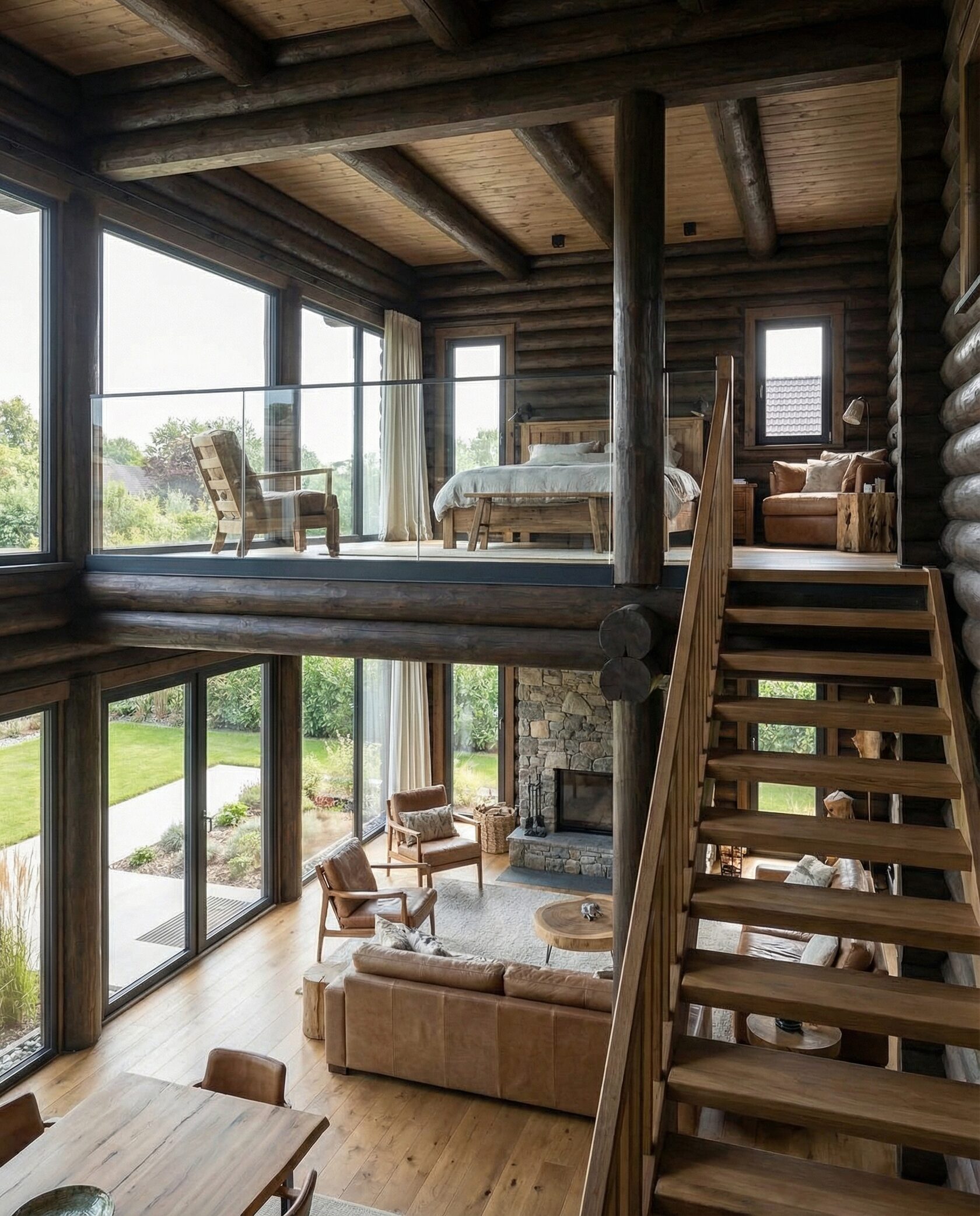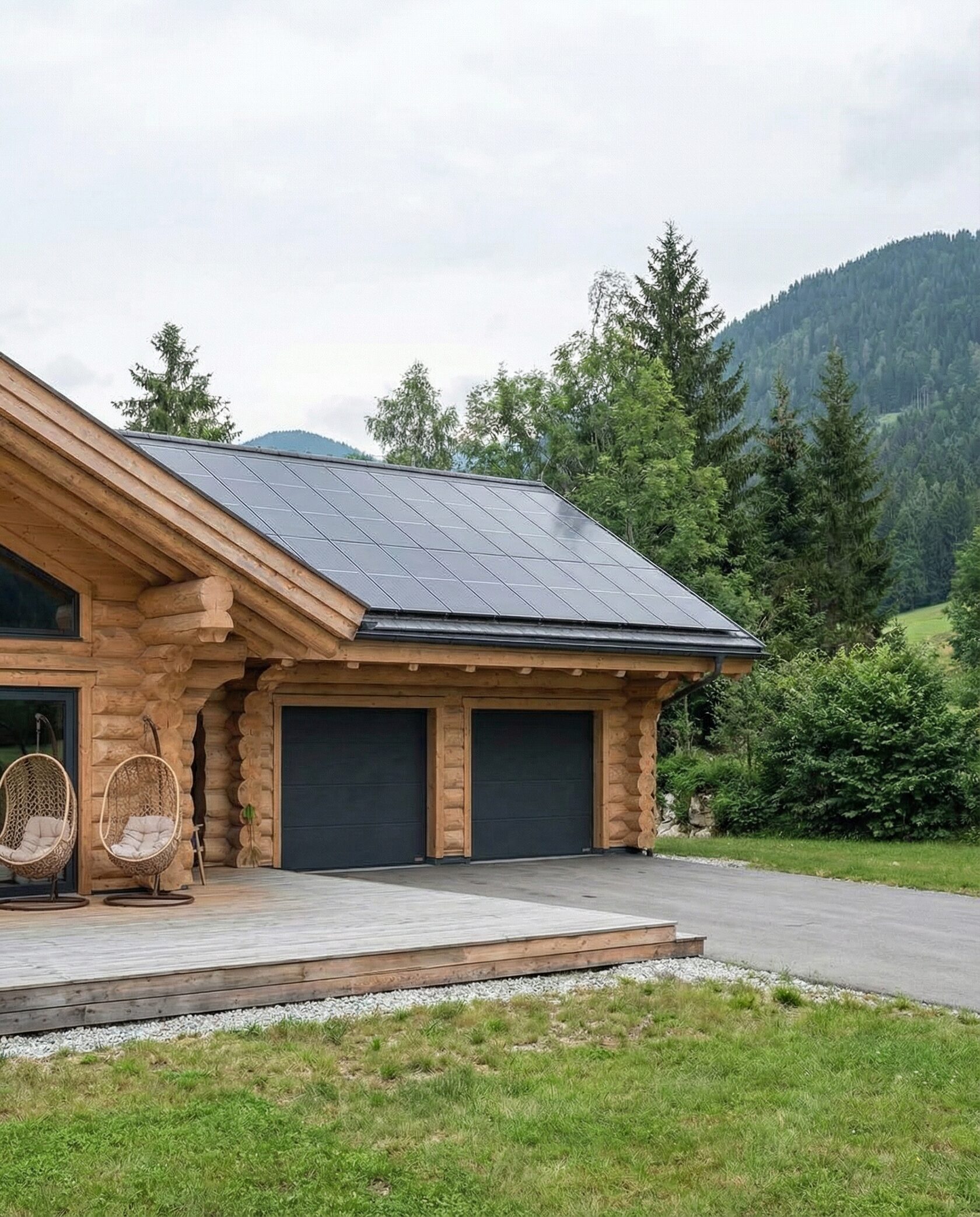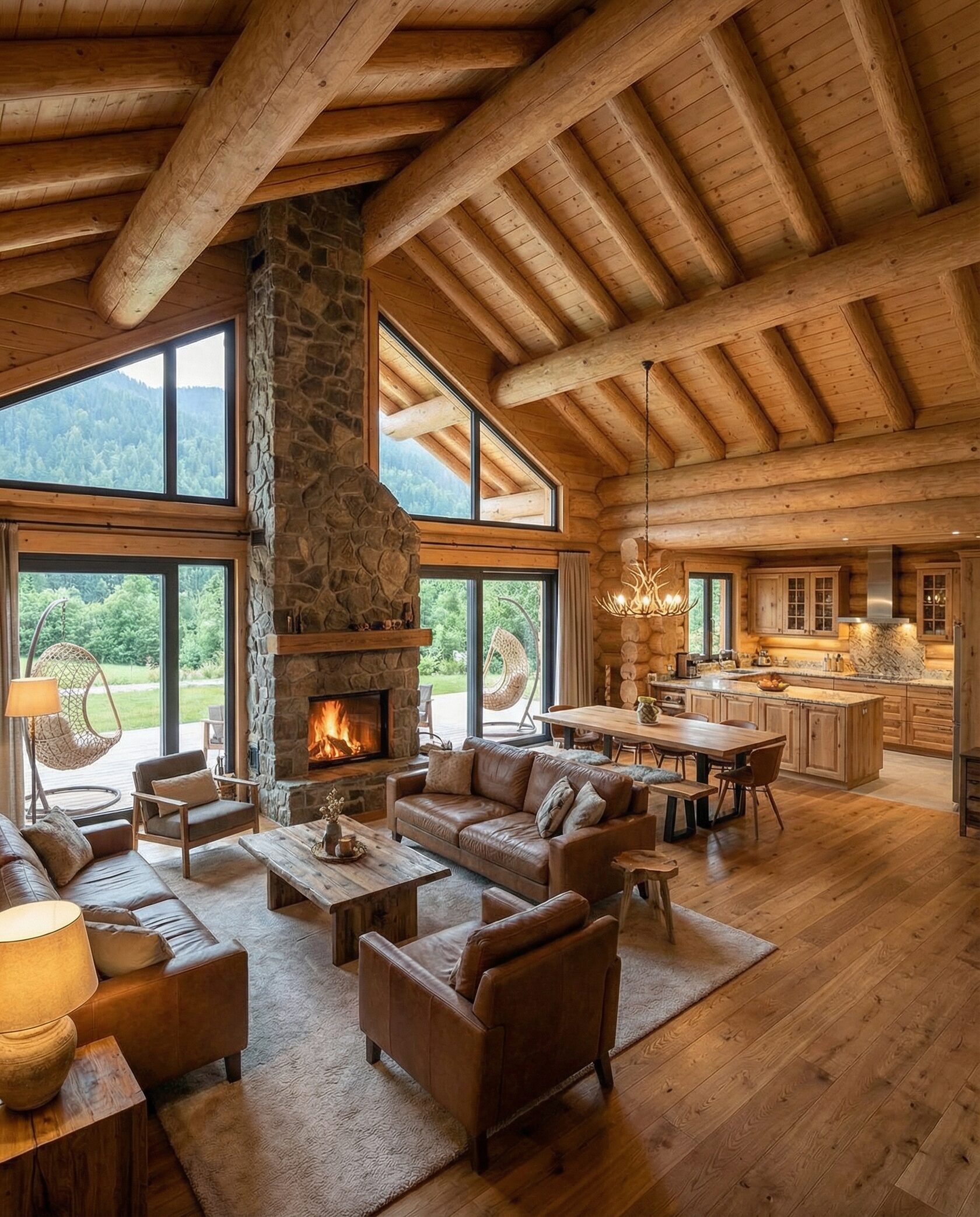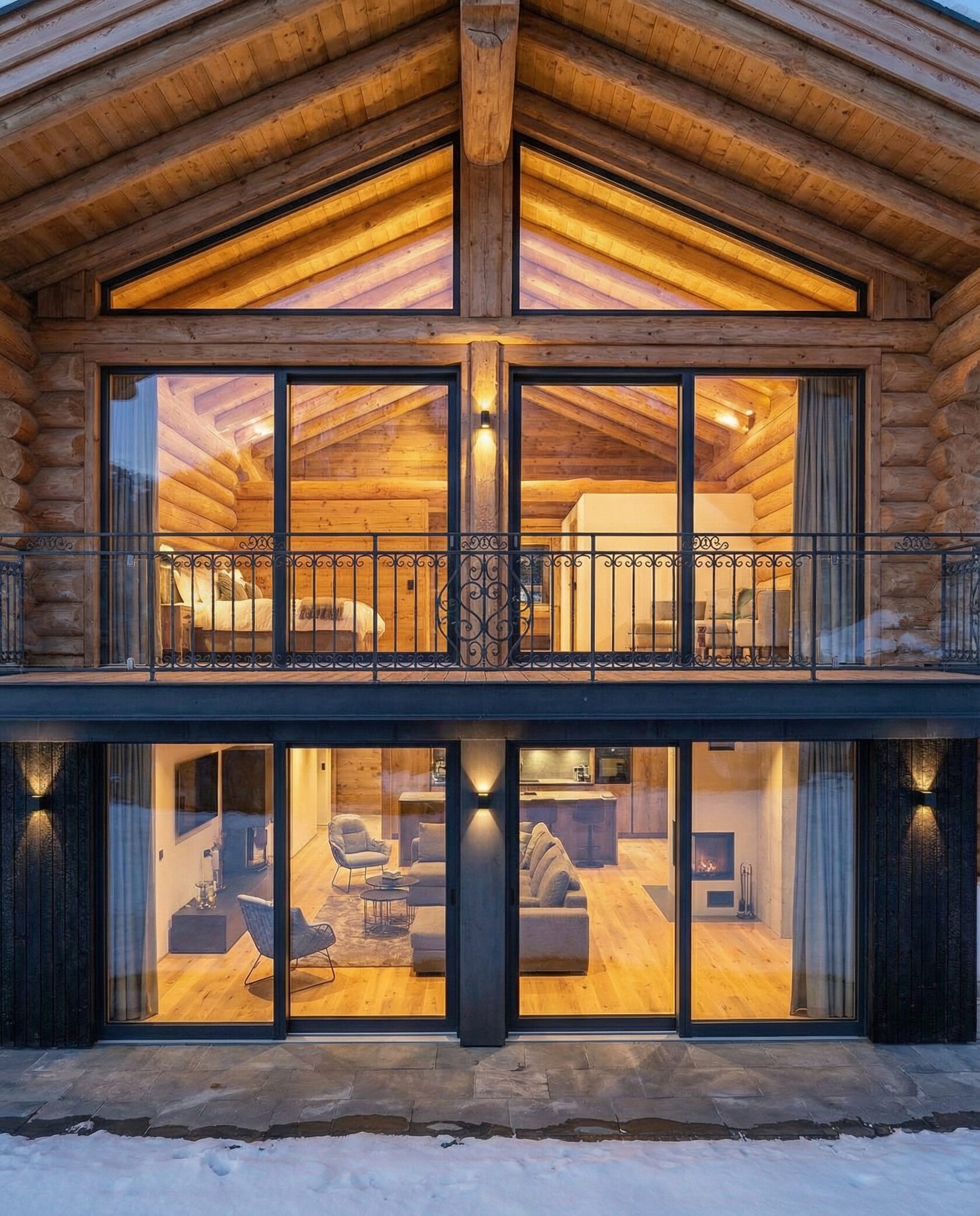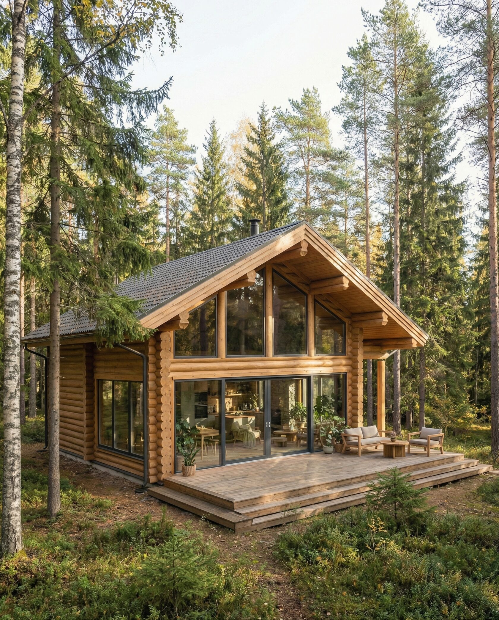Дом «Алиот» — премиальный двухэтажный дом из оцилиндрованного бревна, где гармонично сочетаются эко-эстетика, свет, простор и технологичность. Панорамные окна на два этажа наполняют интерьер естественным светом и объединяют гостиную с природой, а камин создаёт уютный центр дома. Планировка продумана для максимального комфорта: двусветное пространство, открытая кухня с островом, просторные спальни с балконами, функциональное зонирование и стильные архитектурные элементы. Преимущества: долговечное оцилиндрованное бревно, энергоэффективные окна, шумоизоляция, просторные террасы, экологичные материалы и престижный современный дизайн. Дом «Алиот» — выбор для тех, кто ценит премиальный комфорт, простор и близость к природе.