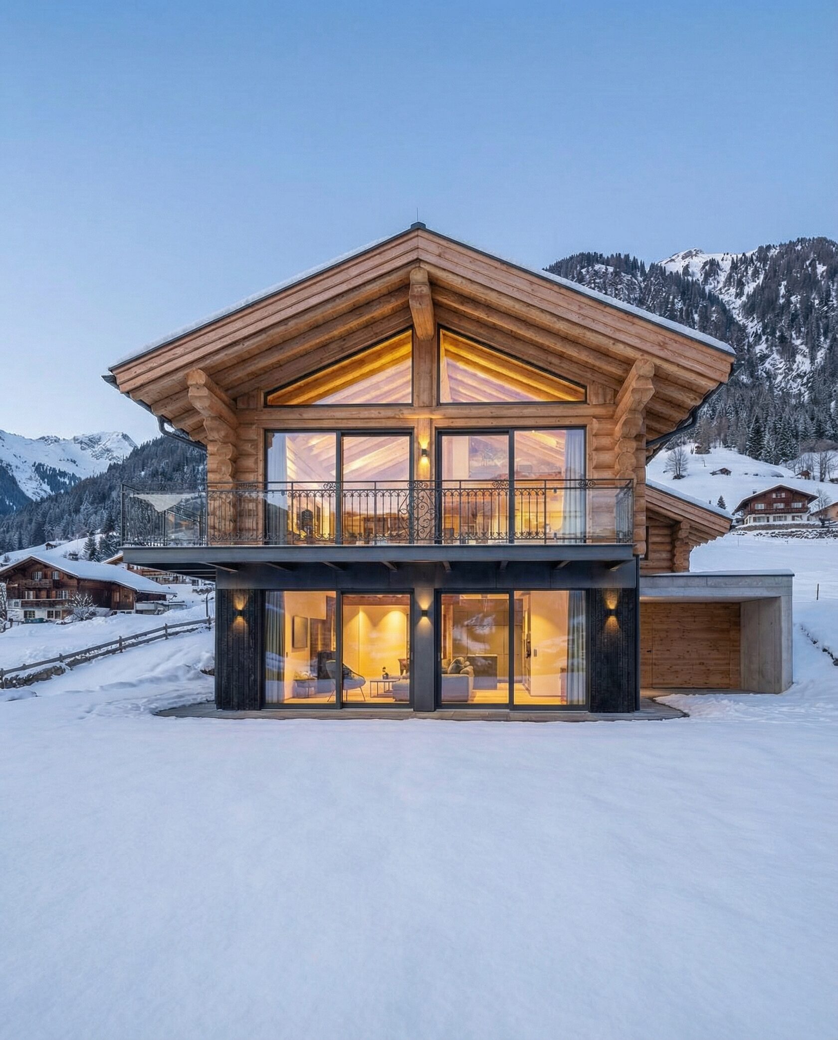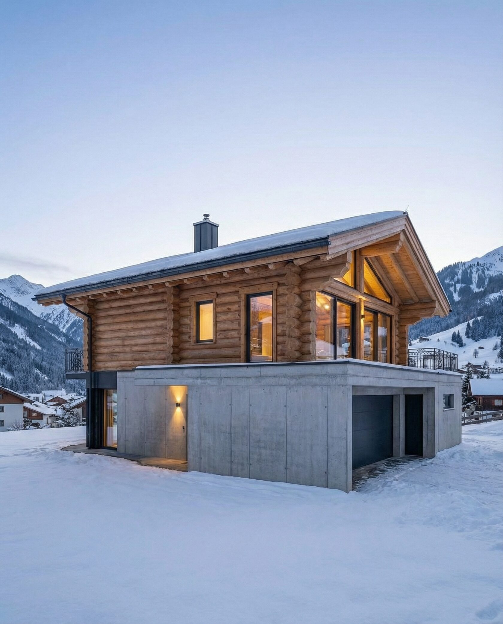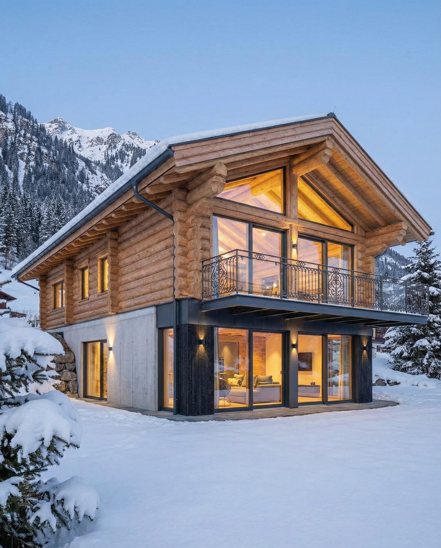 Дом «Завия» — современный двухэтажный дом в стиле альпийского шале с панорамными окнами, каменным камином и просторной гостиной с «вторым светом». Кухня, столовая и зона отдыха объединены в единое открытое пространство, а приватные спальни на втором этаже обеспечивают комфорт и уют. Цокольный этаж включает гараж, мастерскую или кладовую, а балкон с кованым ограждением и натуральные материалы подчеркивают премиальный характер дома. Преимущества: панорамное остекление, второй свет, просторная гостиная, камин, открытая планировка, приватные спальни, функциональный цоколь. Дом «Завия» — идеальный выбор для тех, кто ценит современный комфорт, стиль и гармонию с природой.