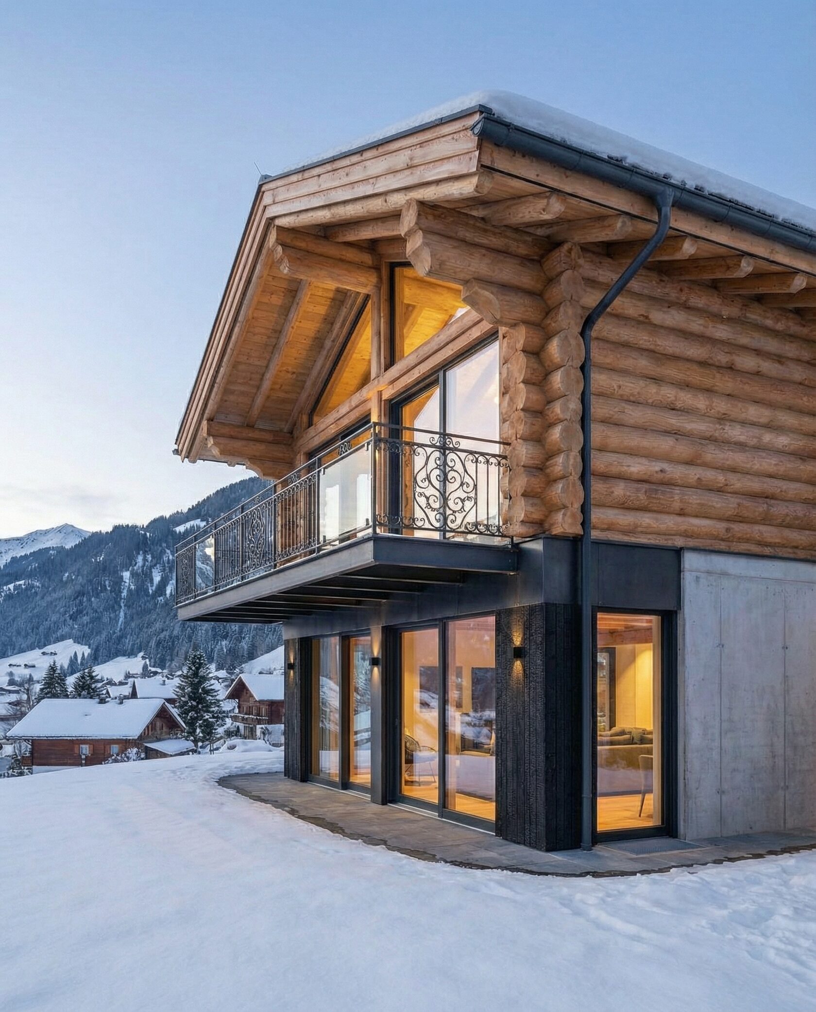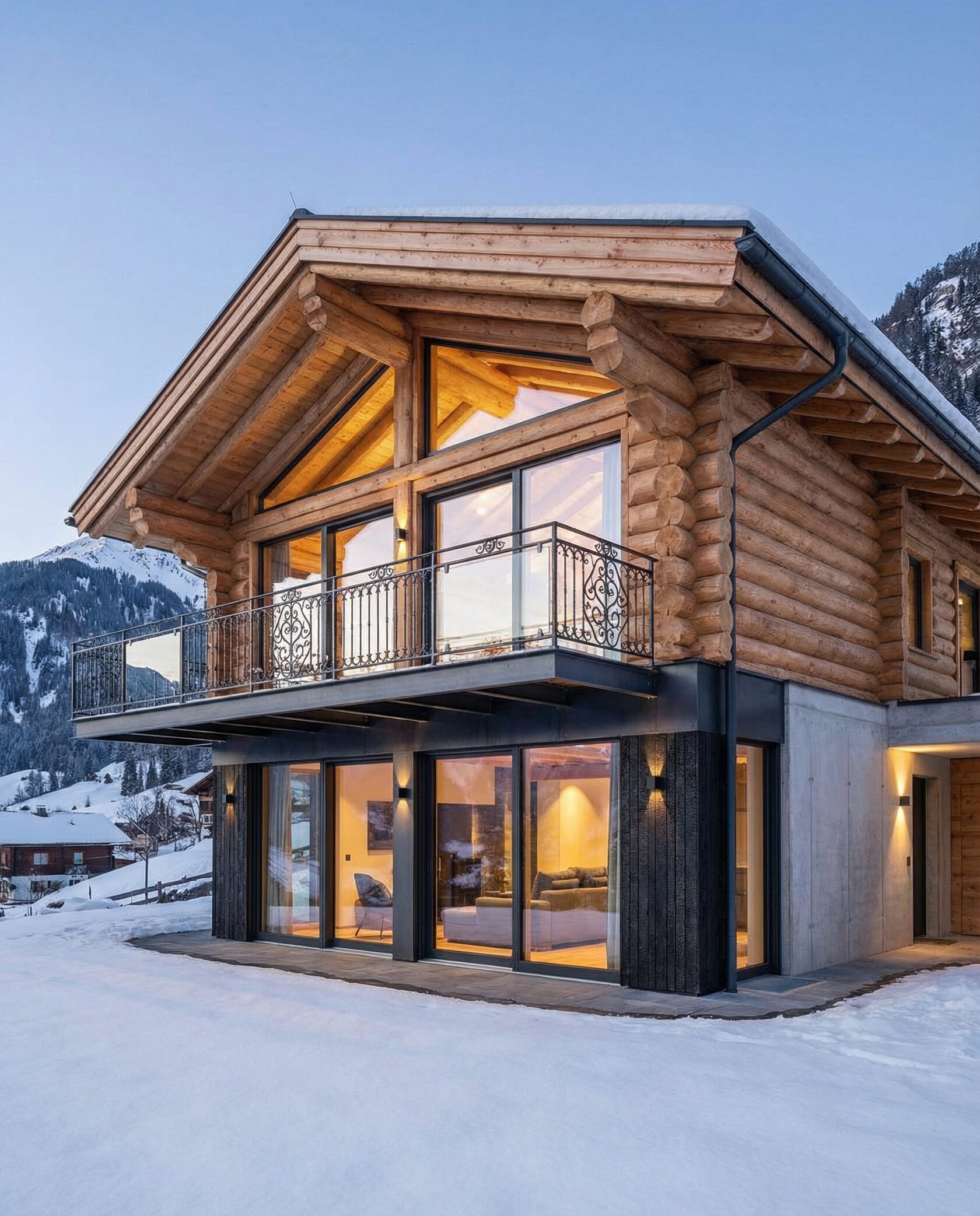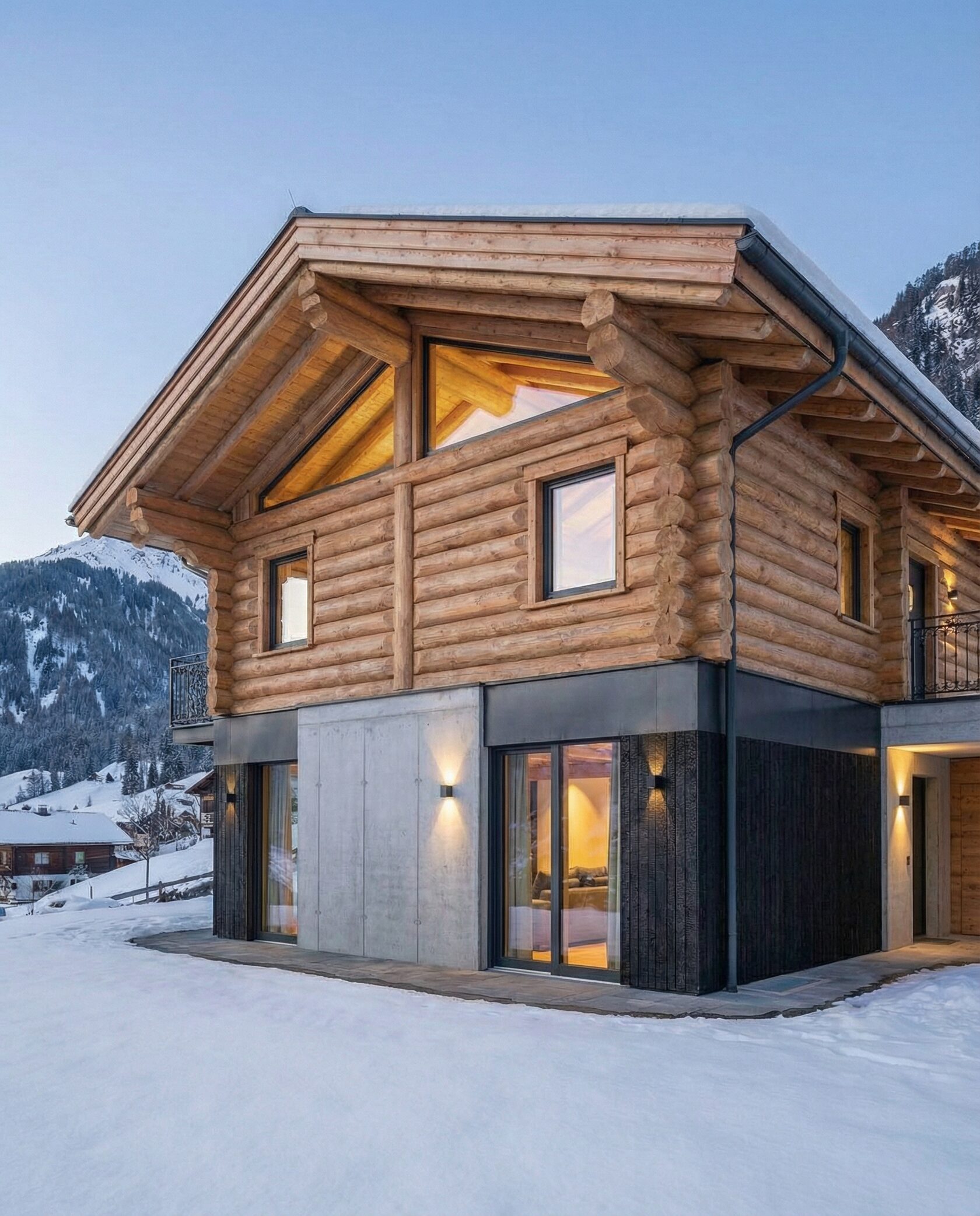 Дом «Завия» — современный двухэтажный дом в стиле альпийского шале с панорамными окнами, каменным камином и просторной гостиной с «вторым светом». Кухня, столовая и зона отдыха объединены в единое открытое пространство, а приватные спальни на втором этаже обеспечивают комфорт и уют. Цокольный этаж включает гараж, мастерскую или кладовую, а балкон с кованым ограждением и натуральные материалы подчеркивают премиальный характер дома. Преимущества: панорамное остекление, второй свет, просторная гостиная, камин, открытая планировка, приватные спальни, функциональный цоколь. Дом «Завия» — идеальный выбор для тех, кто ценит современный комфорт, стиль и гармонию с природой.