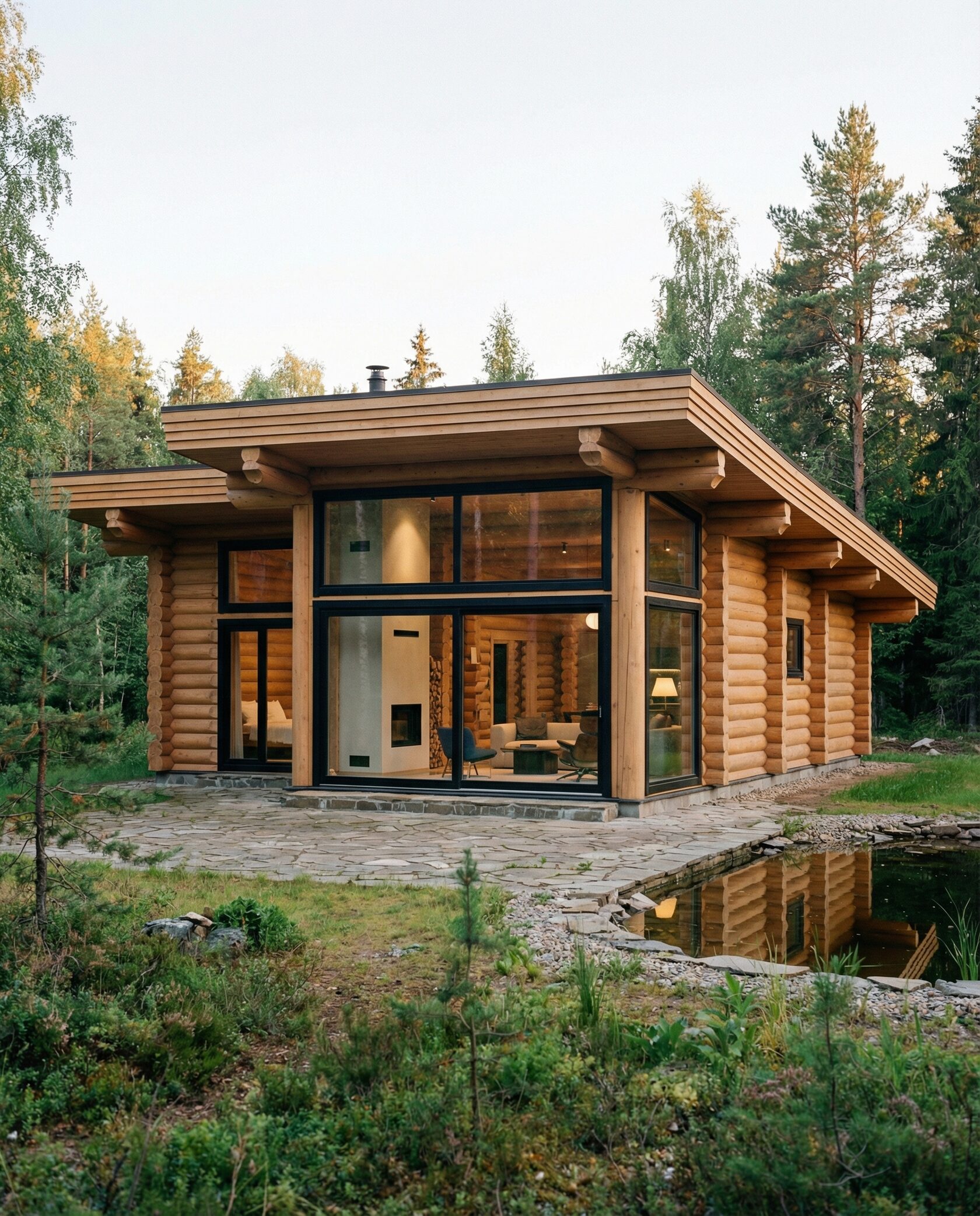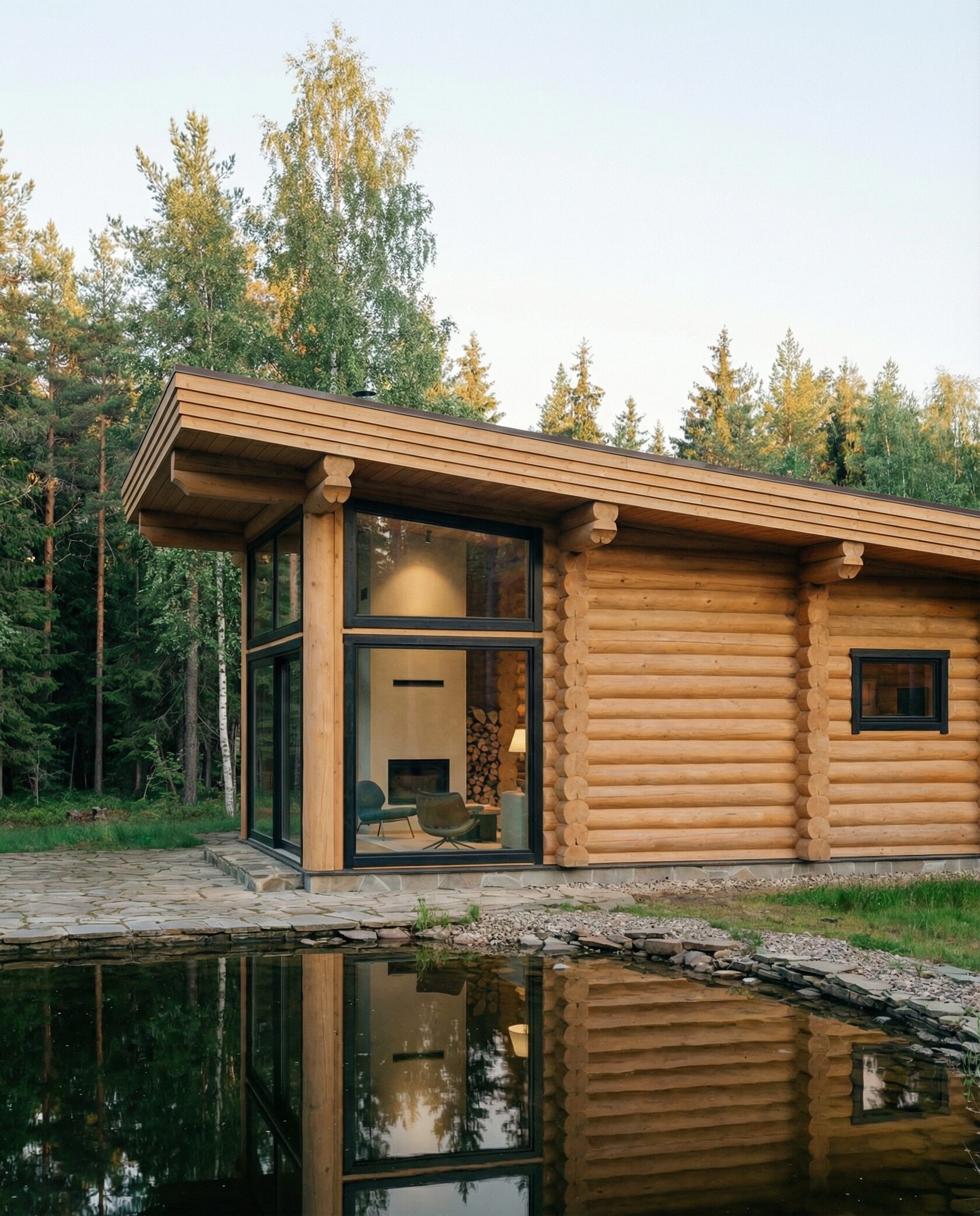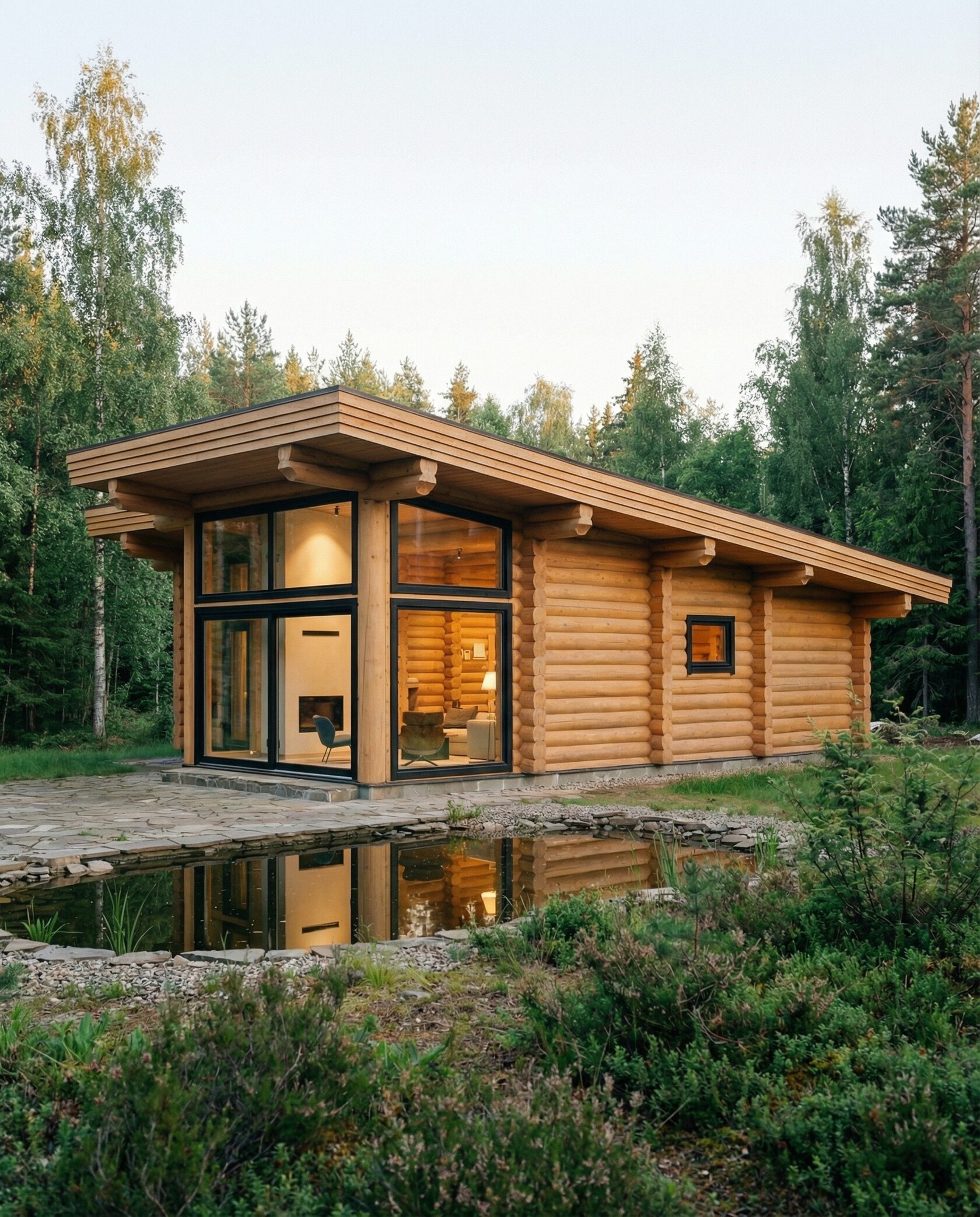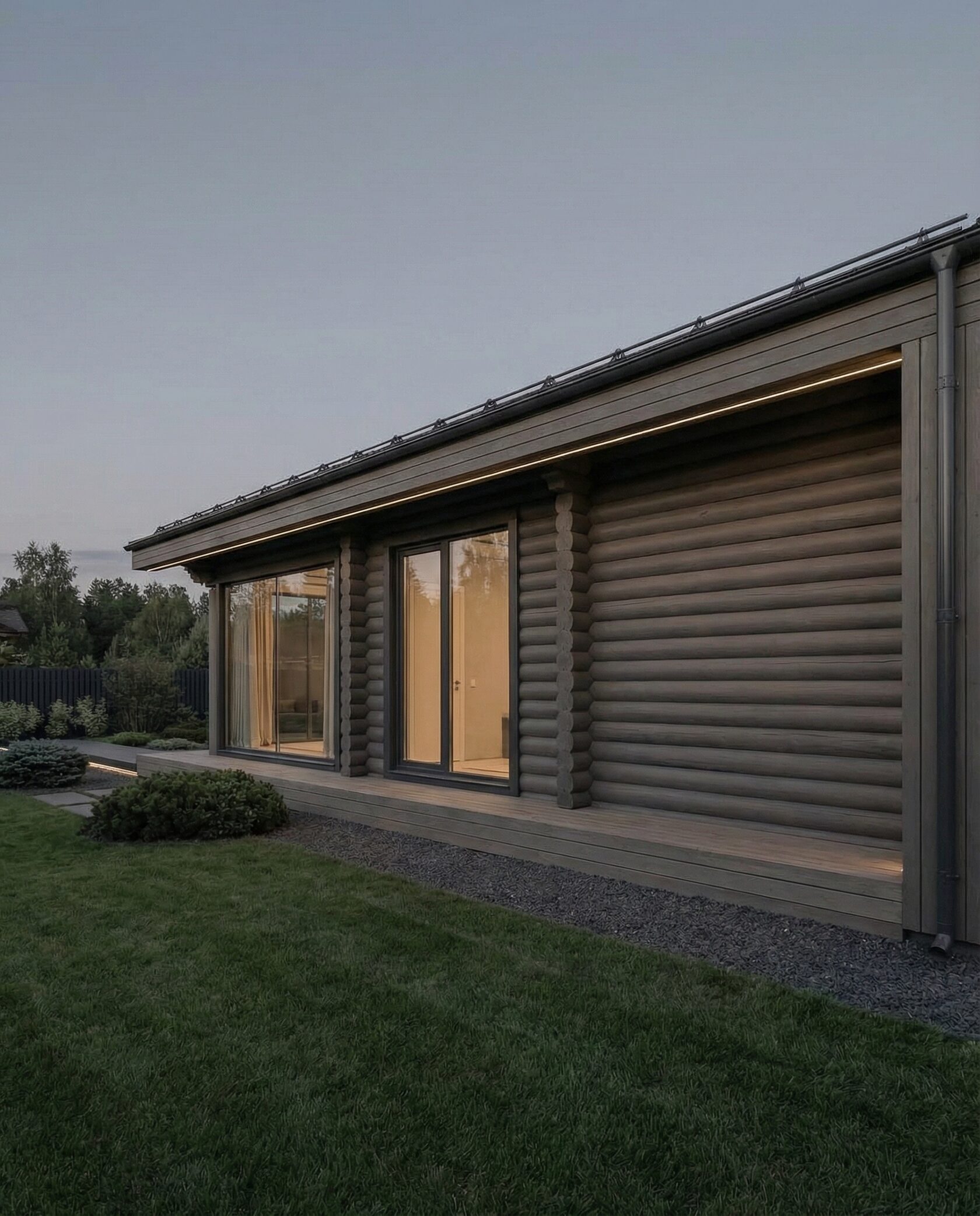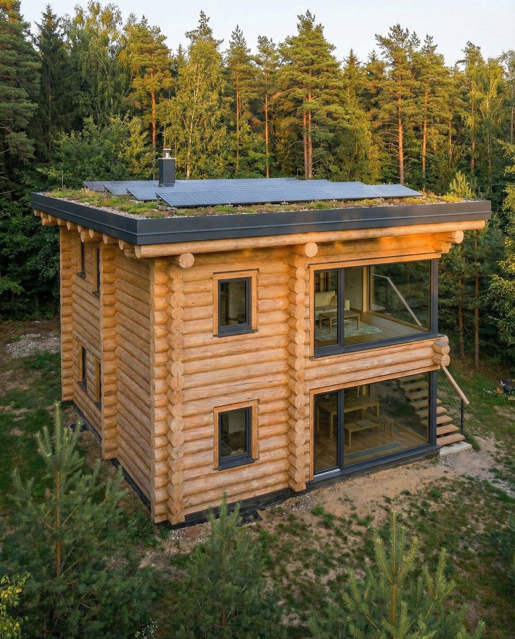 Дом «Альгор» — современный минималистичный дом из оцилиндрованного бревна с панорамным остеклением, открывающим вид на лес и водоём. Высокие окна до пола наполняют интерьер светом, объединяя внутреннее пространство с природой, а плоская эксплуатируемая кровля позволяет создать террасу или зону отдыха на свежем воздухе. Внутри — двусветная гостиная с камином, столовая зона, эргономичная кухня и приватные комнаты на втором этаже с панорамными видами. Преимущества: современный стиль, долговечные экологичные материалы, высокая естественная освещённость, тепло- и шумоизоляция, возможность организации крыши как дополнительной зоны отдыха. Дом «Альгор» — идеальный выбор для тех, кто ценит комфорт, инновации и гармонию с природой.