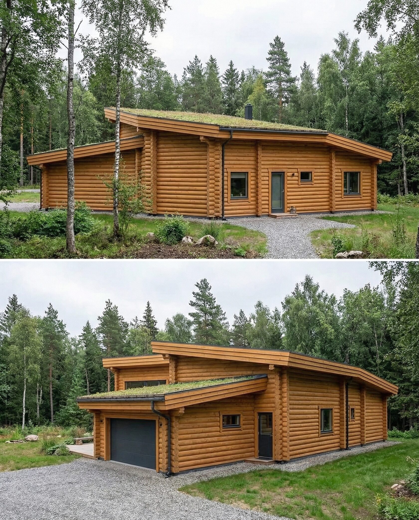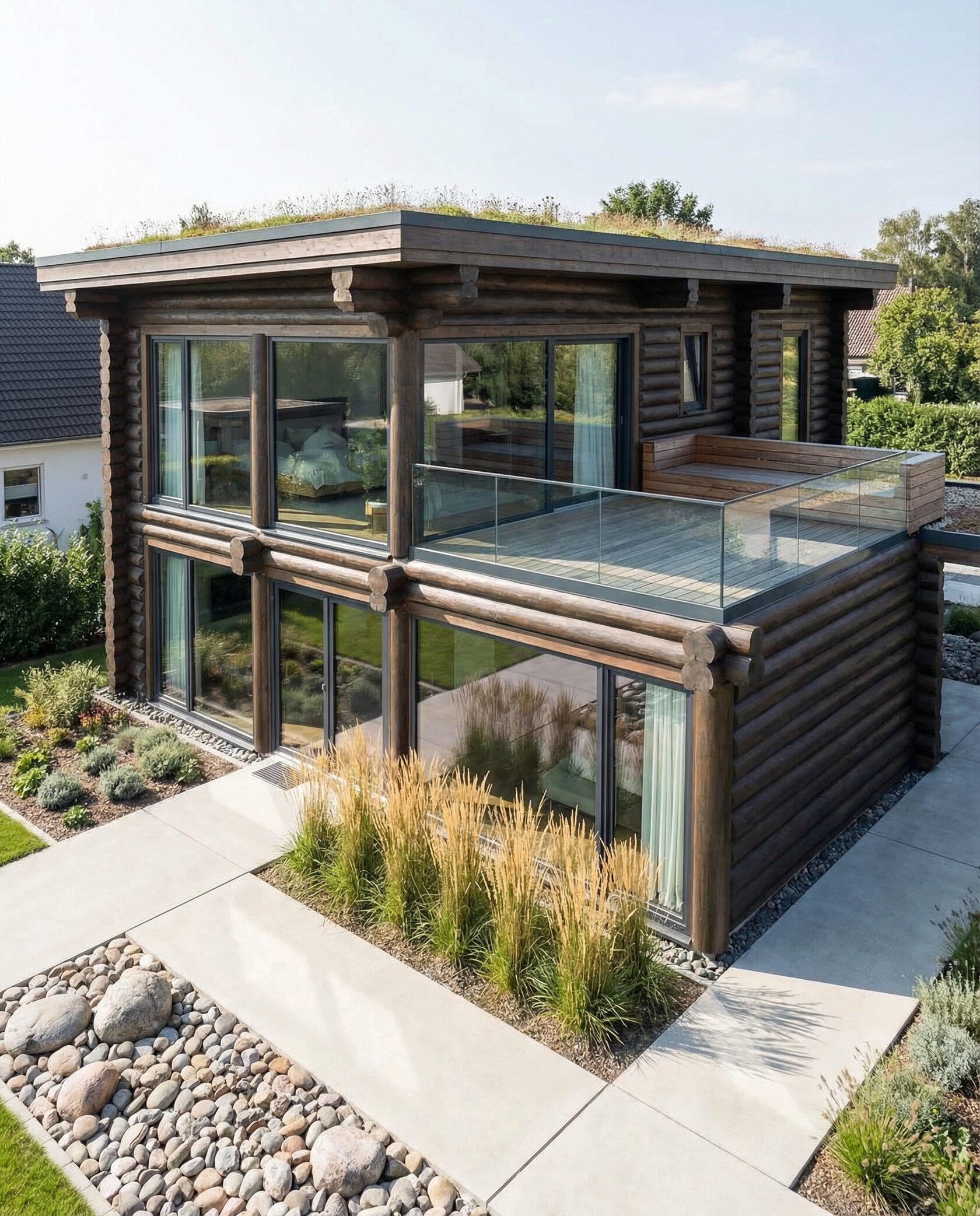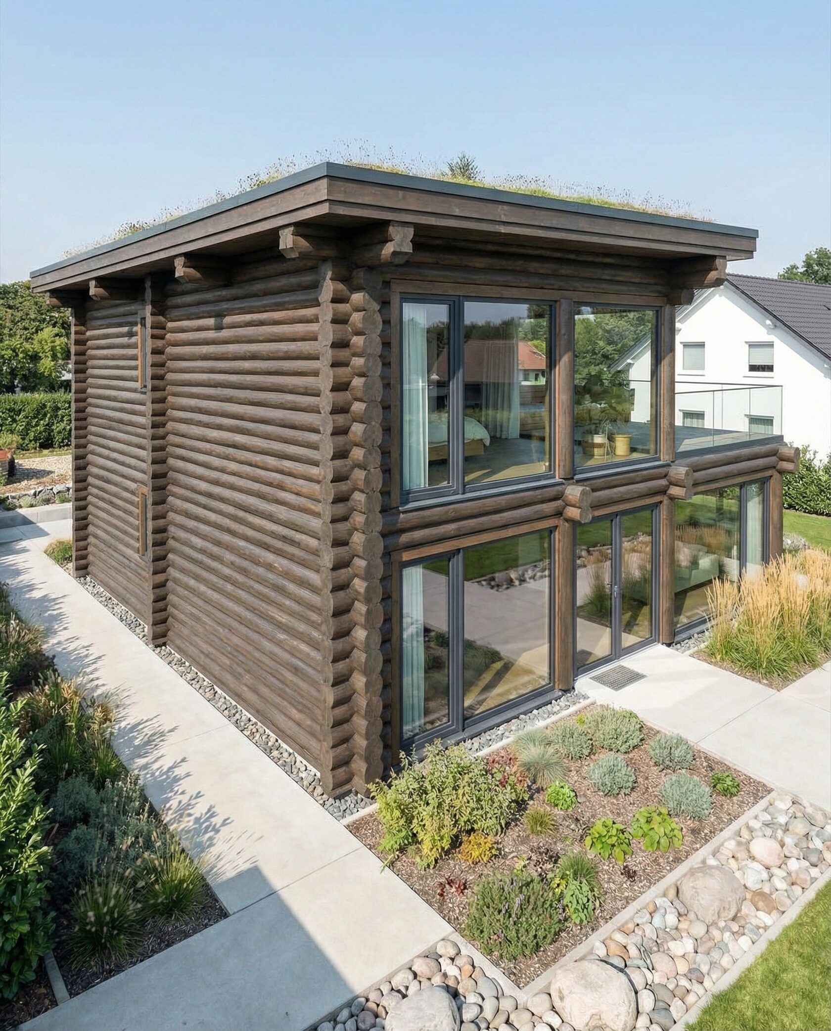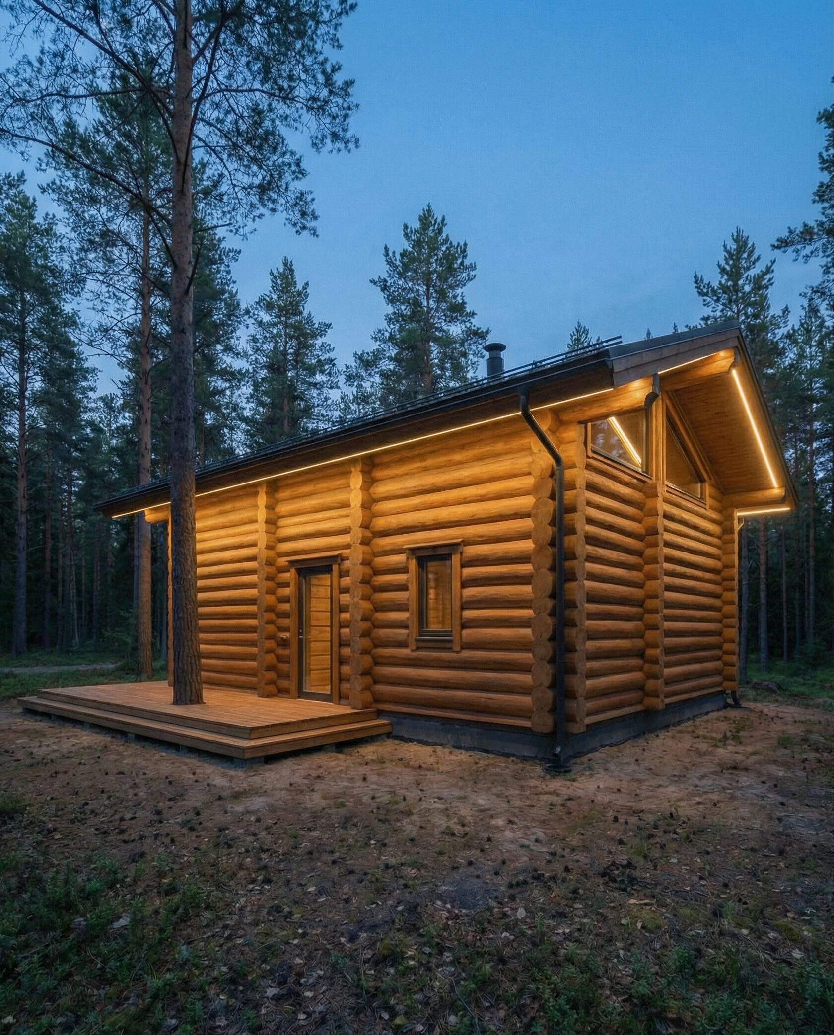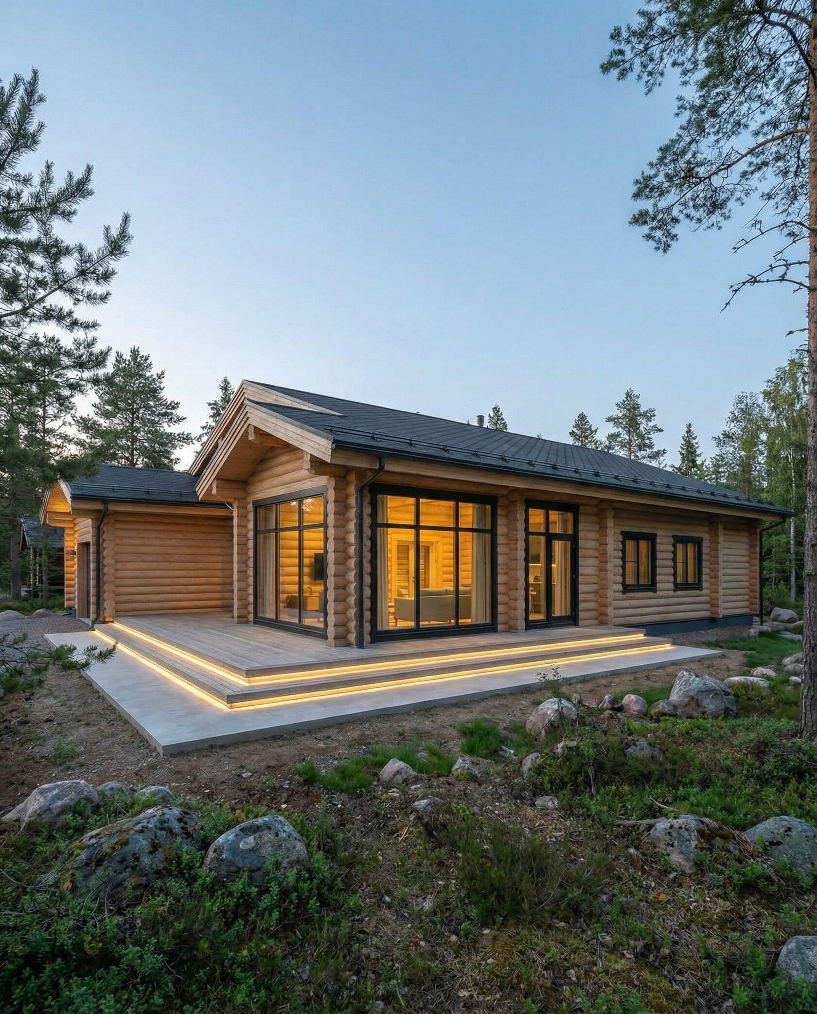 Дом «Альгор» — современный минималистичный дом из оцилиндрованного бревна с панорамным остеклением, открывающим вид на лес и водоём. Высокие окна до пола наполняют интерьер светом, объединяя внутреннее пространство с природой, а плоская эксплуатируемая кровля позволяет создать террасу или зону отдыха на свежем воздухе. Внутри — двусветная гостиная с камином, столовая зона, эргономичная кухня и приватные комнаты на втором этаже с панорамными видами. Преимущества: современный стиль, долговечные экологичные материалы, высокая естественная освещённость, тепло- и шумоизоляция, возможность организации крыши как дополнительной зоны отдыха. Дом «Альгор» — идеальный выбор для тех, кто ценит комфорт, инновации и гармонию с природой.