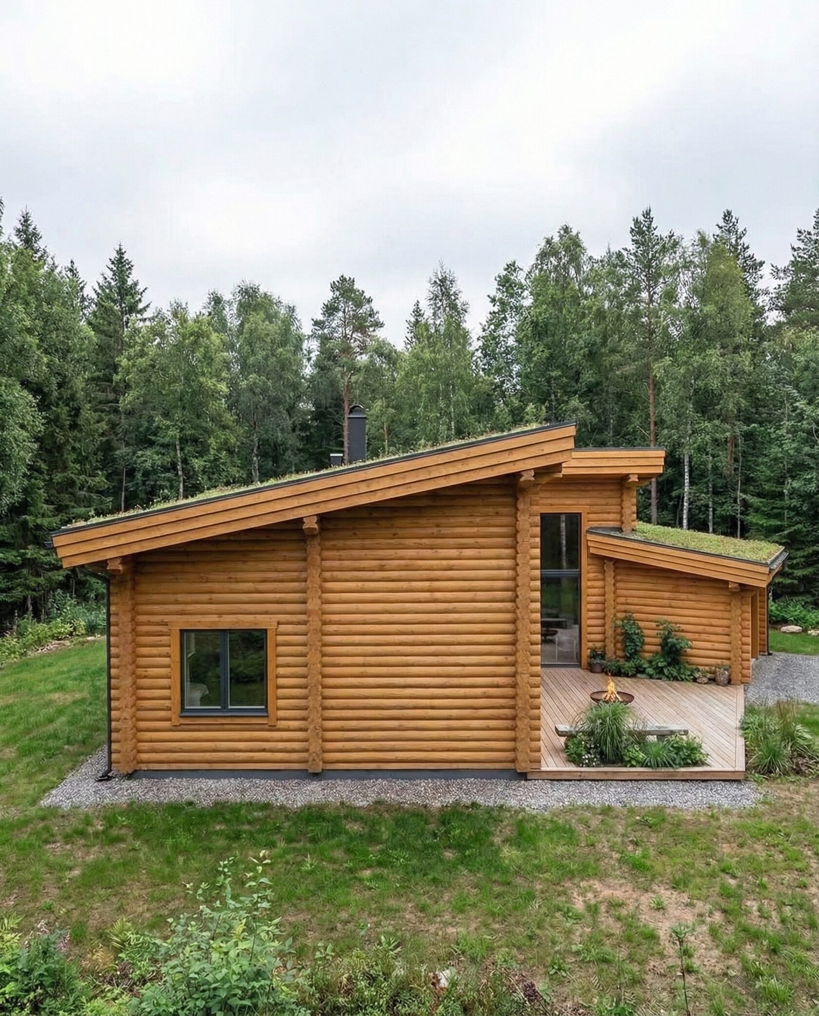Дом «Денеб» — современный одноэтажный дом с асимметричной кровлей, панорамными окнами и большой террасой, создающей единство с природой. Просторная гостиная с камином объединена с кухней и столовой в единое открытое пространство для общения и отдыха. Приватные спальни, зона сауны и функциональный гараж обеспечивают комфорт и удобство для всей семьи, а зелёная эксплуатируемая кровля повышает энергоэффективность. Преимущества: современная архитектура, панорамное остекление, просторная гостиная с камином, открытая кухня, приватные зоны, гараж и зелёная кровля. Дом «Денеб» — идеальный выбор для тех, кто ценит комфорт, открытые пространства и гармонию с природой.