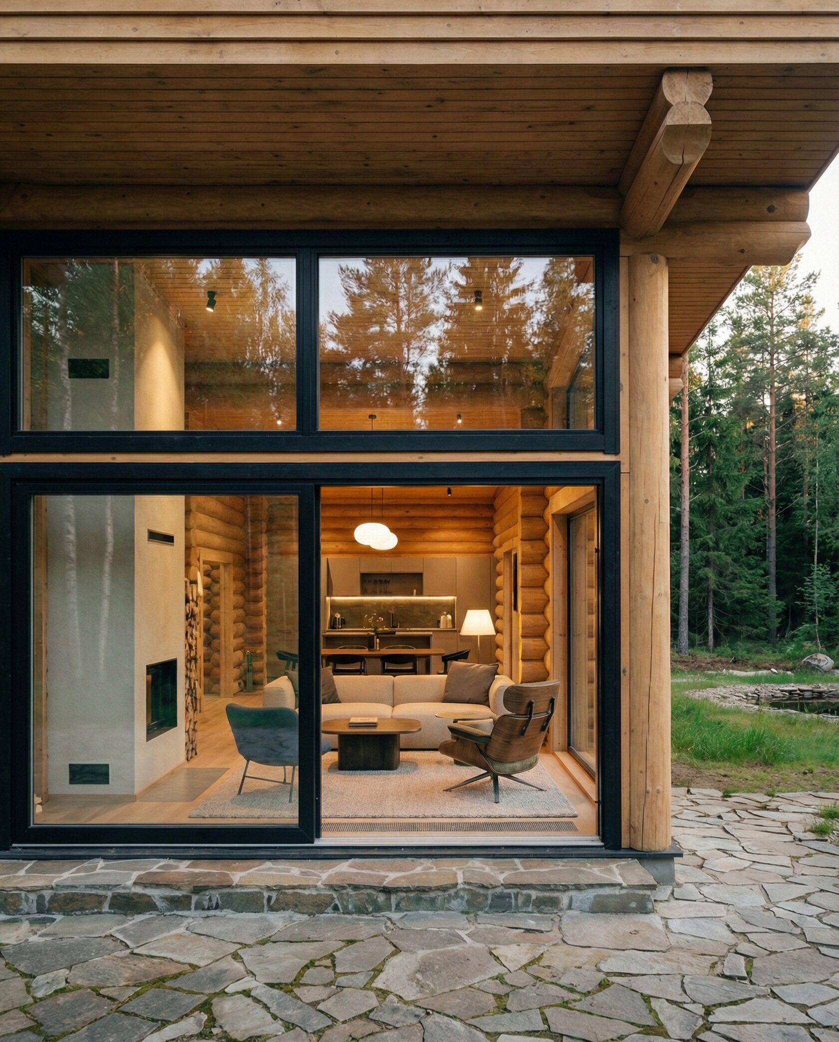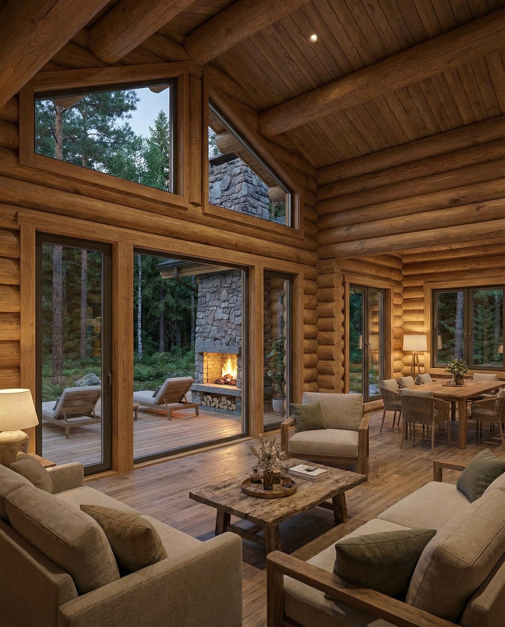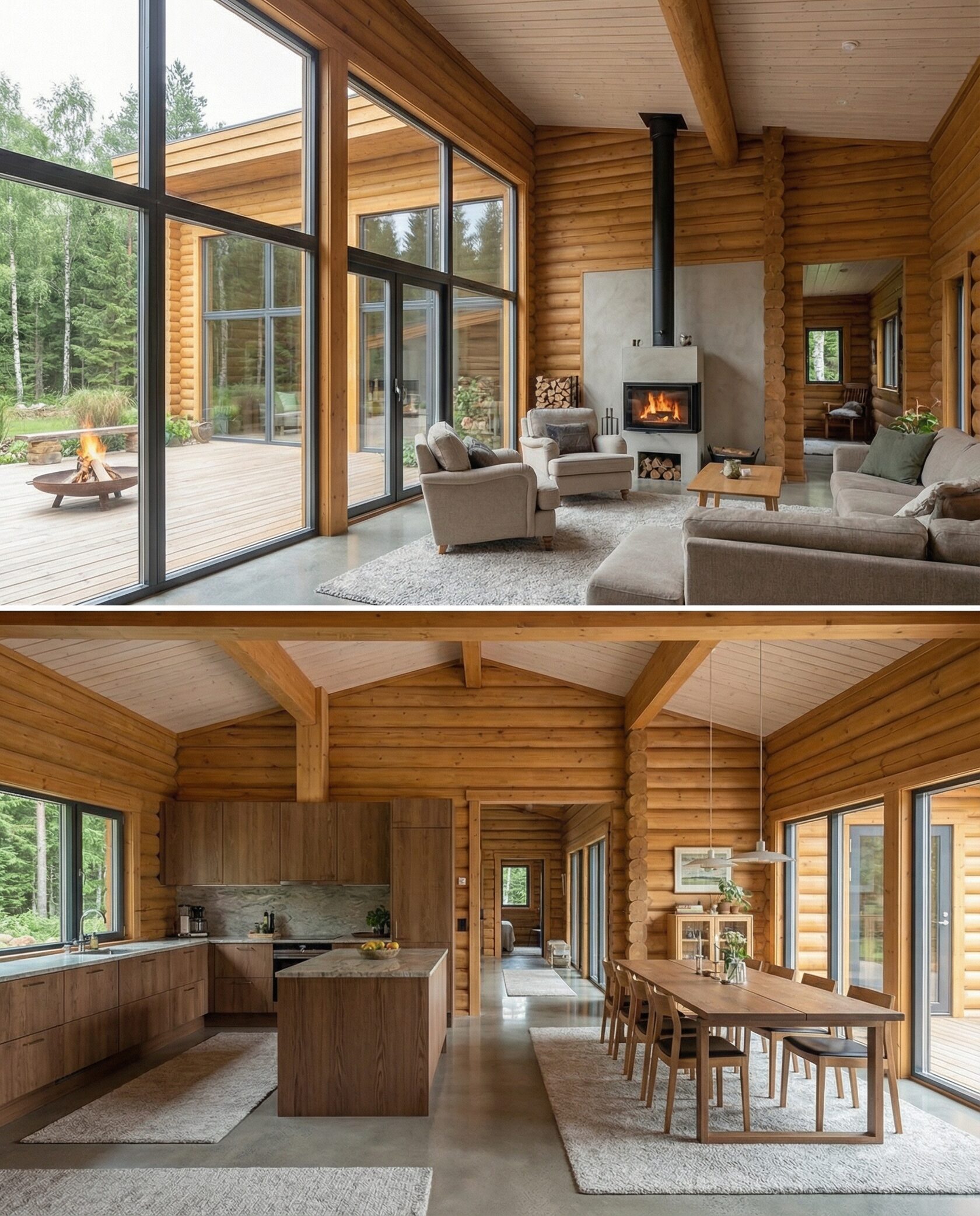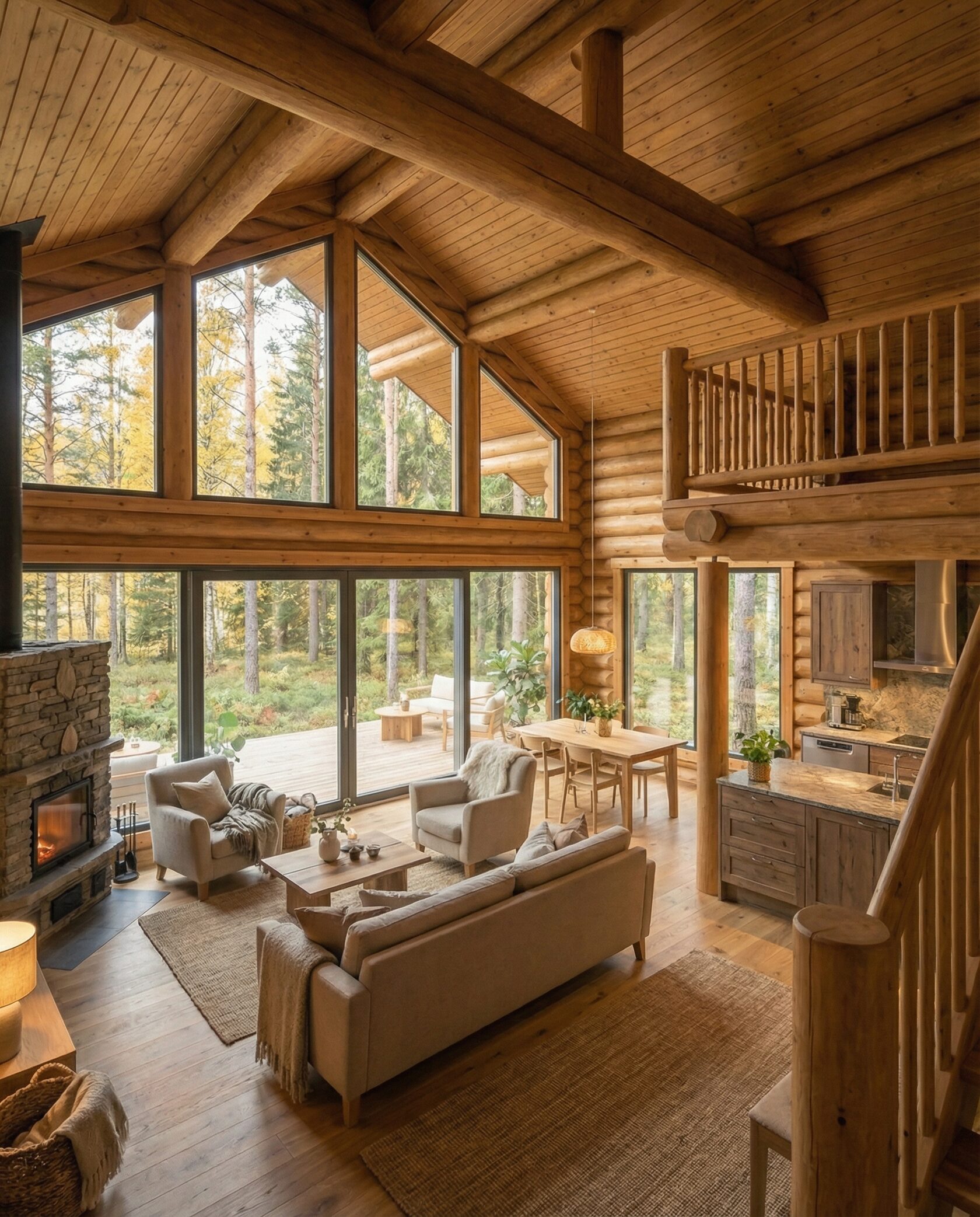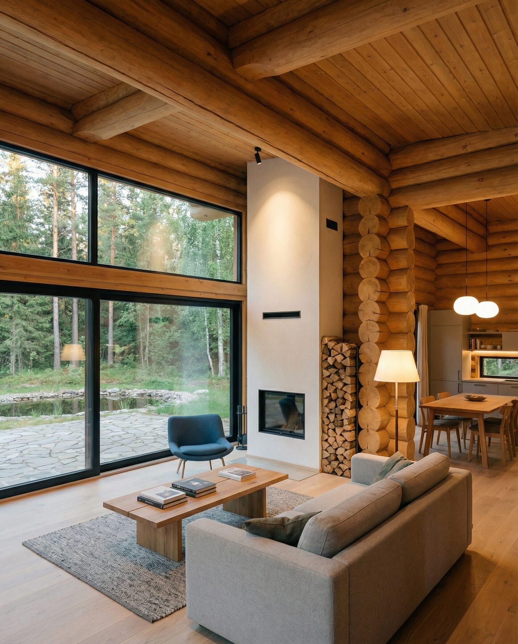 Дом «Эпсилон» — двухэтажный коттедж из оцилиндрованного бревна с панорамными окнами, двухсветной гостиной и просторной террасой. Интерьер сочетает дерево, камень и комфортную планировку для семьи и гостей. Преимущества: панорамное остекление, открытая терраса, выразительный фасад, северный стиль, удобная планировка, уютная атмосфера и гармония с природой.