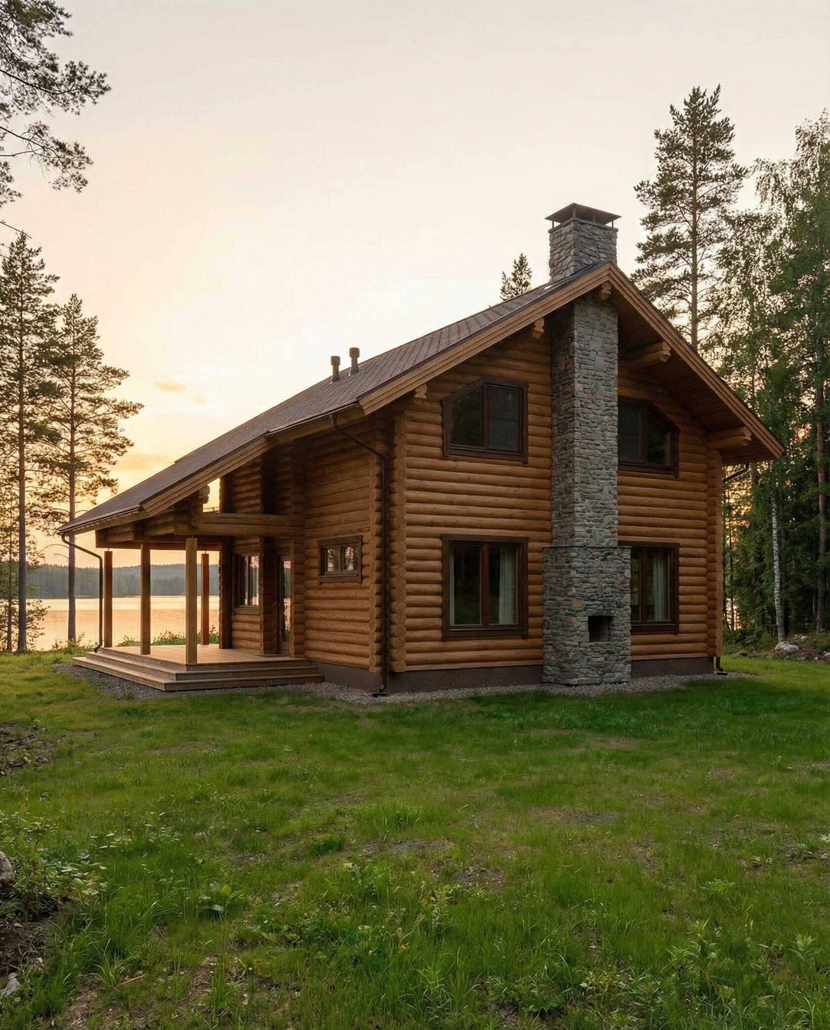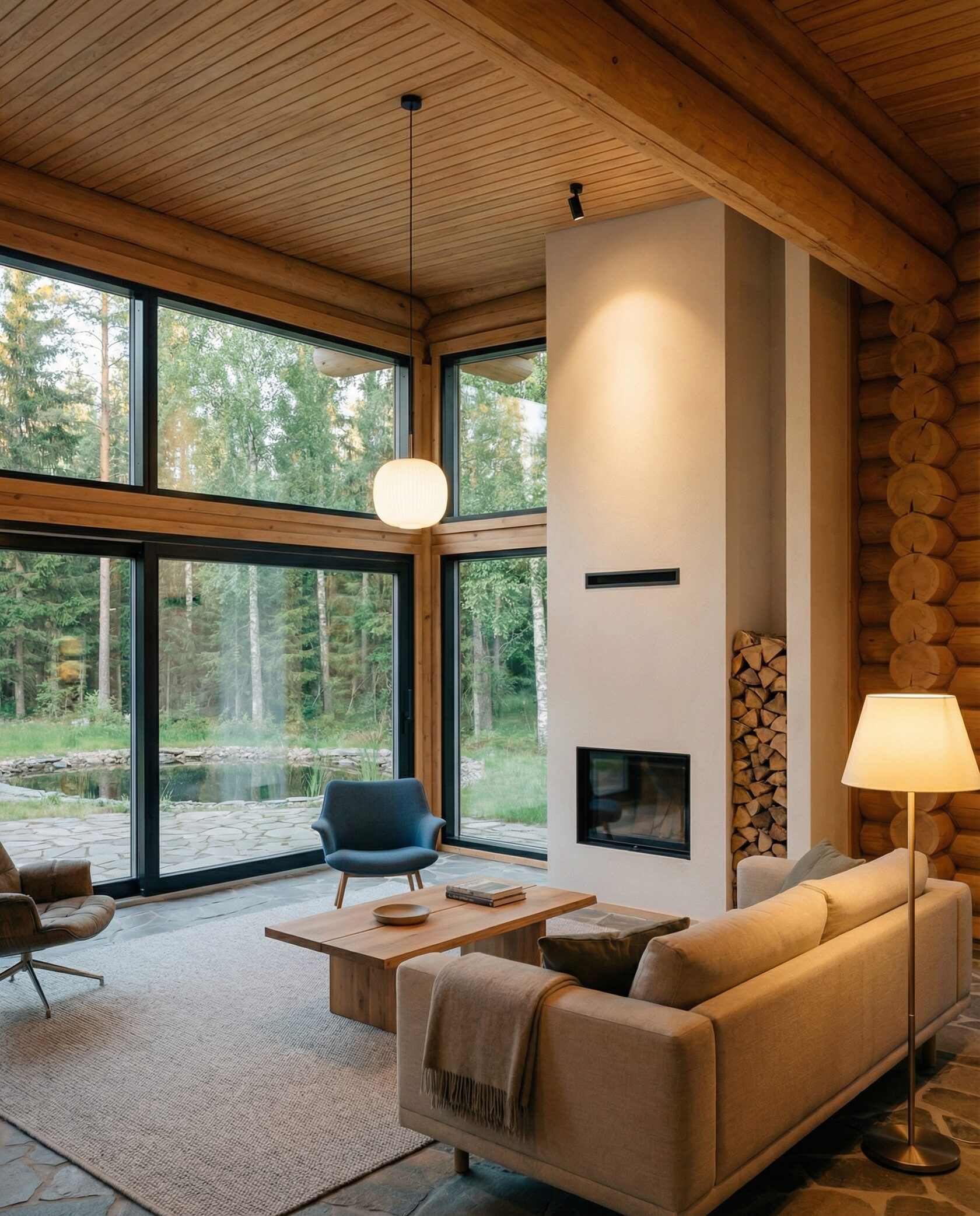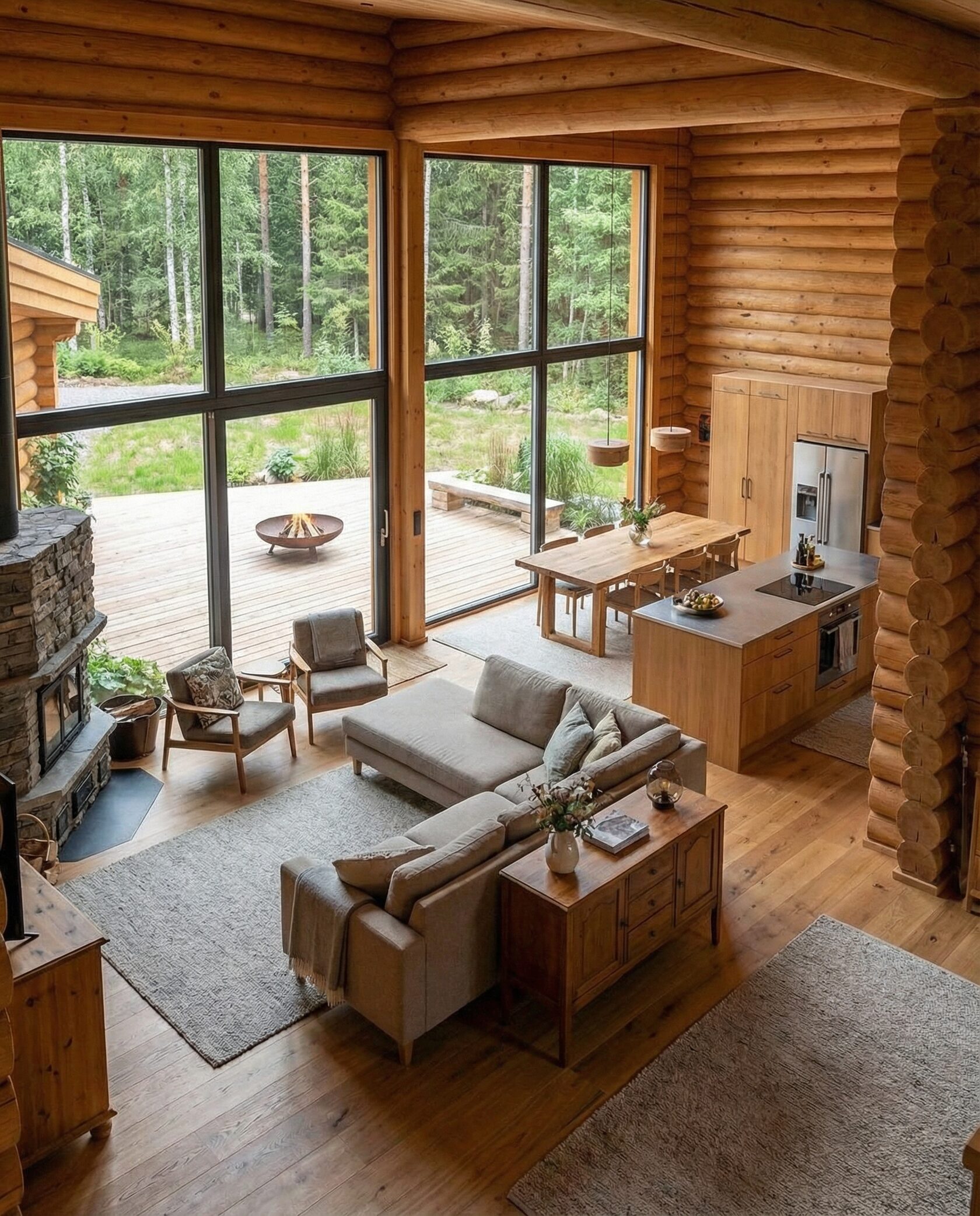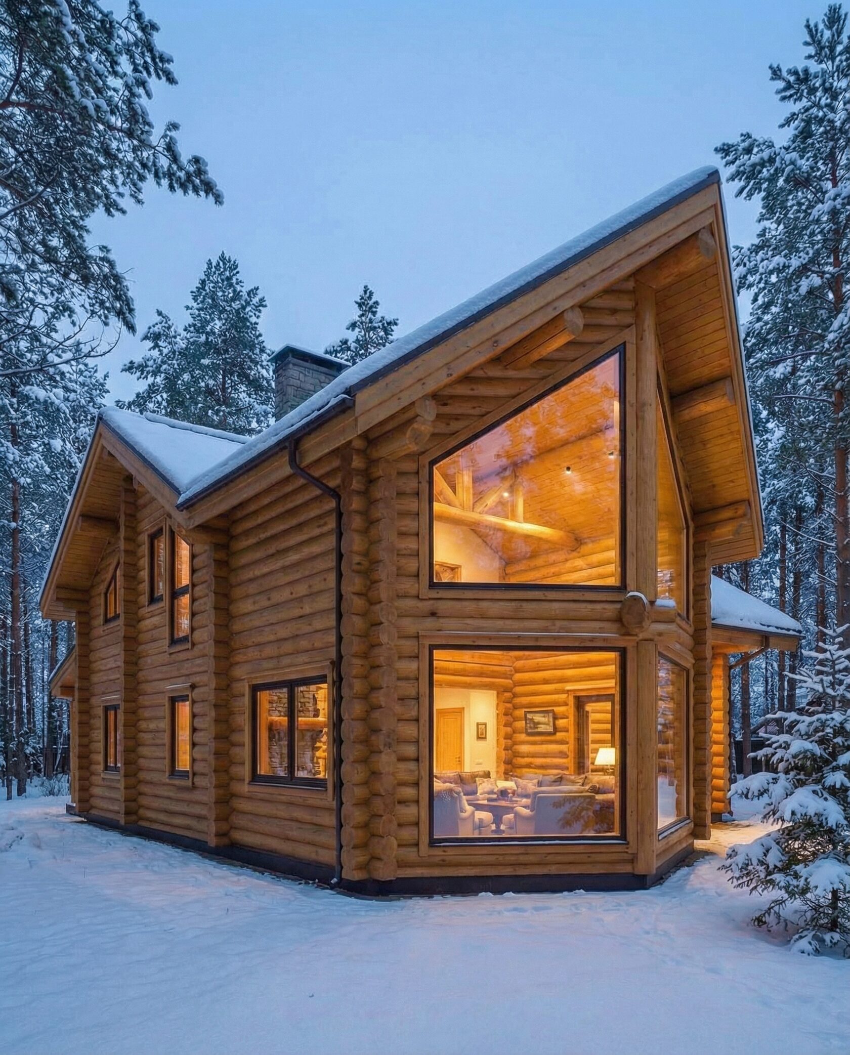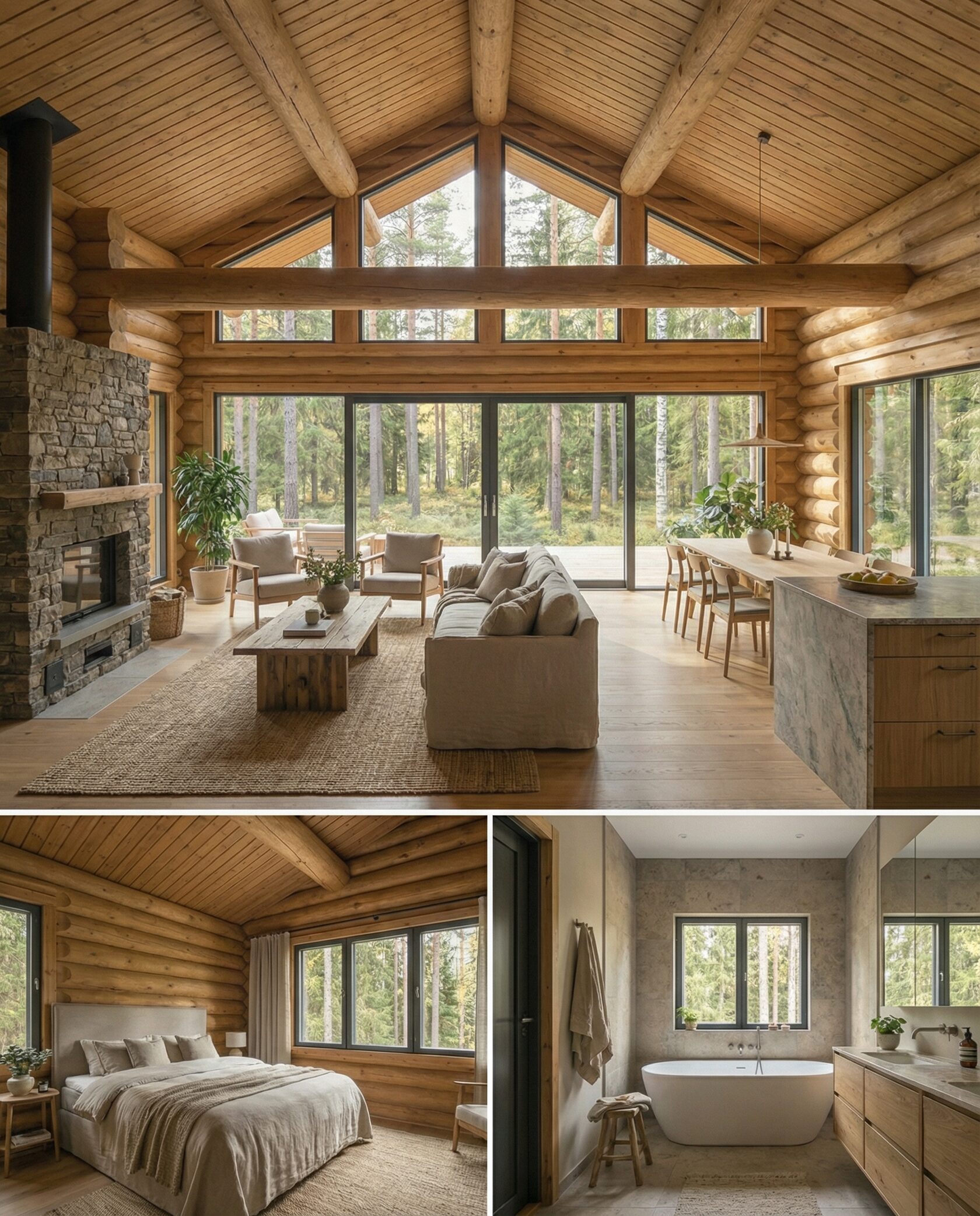 Дом «Эпсилон» — двухэтажный коттедж из оцилиндрованного бревна с панорамными окнами, двухсветной гостиной и просторной террасой. Интерьер сочетает дерево, камень и комфортную планировку для семьи и гостей. Преимущества: панорамное остекление, открытая терраса, выразительный фасад, северный стиль, удобная планировка, уютная атмосфера и гармония с природой.