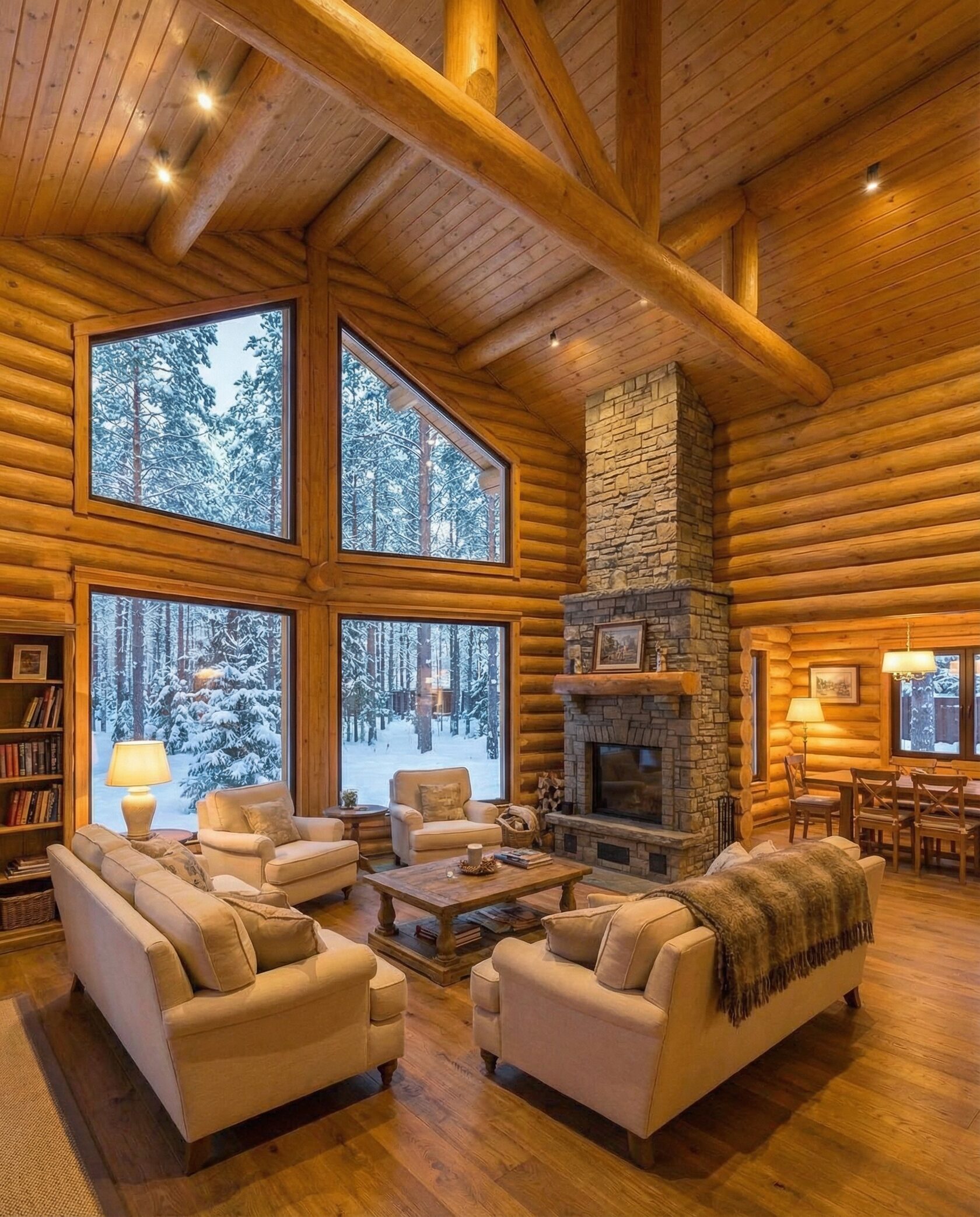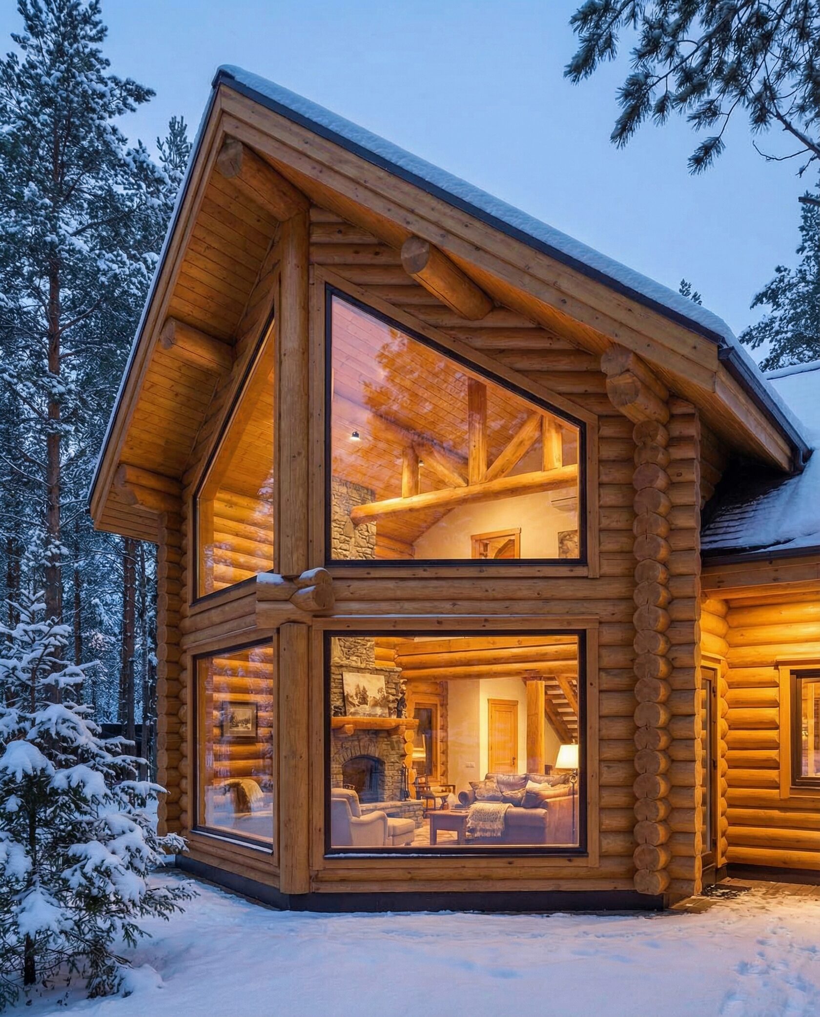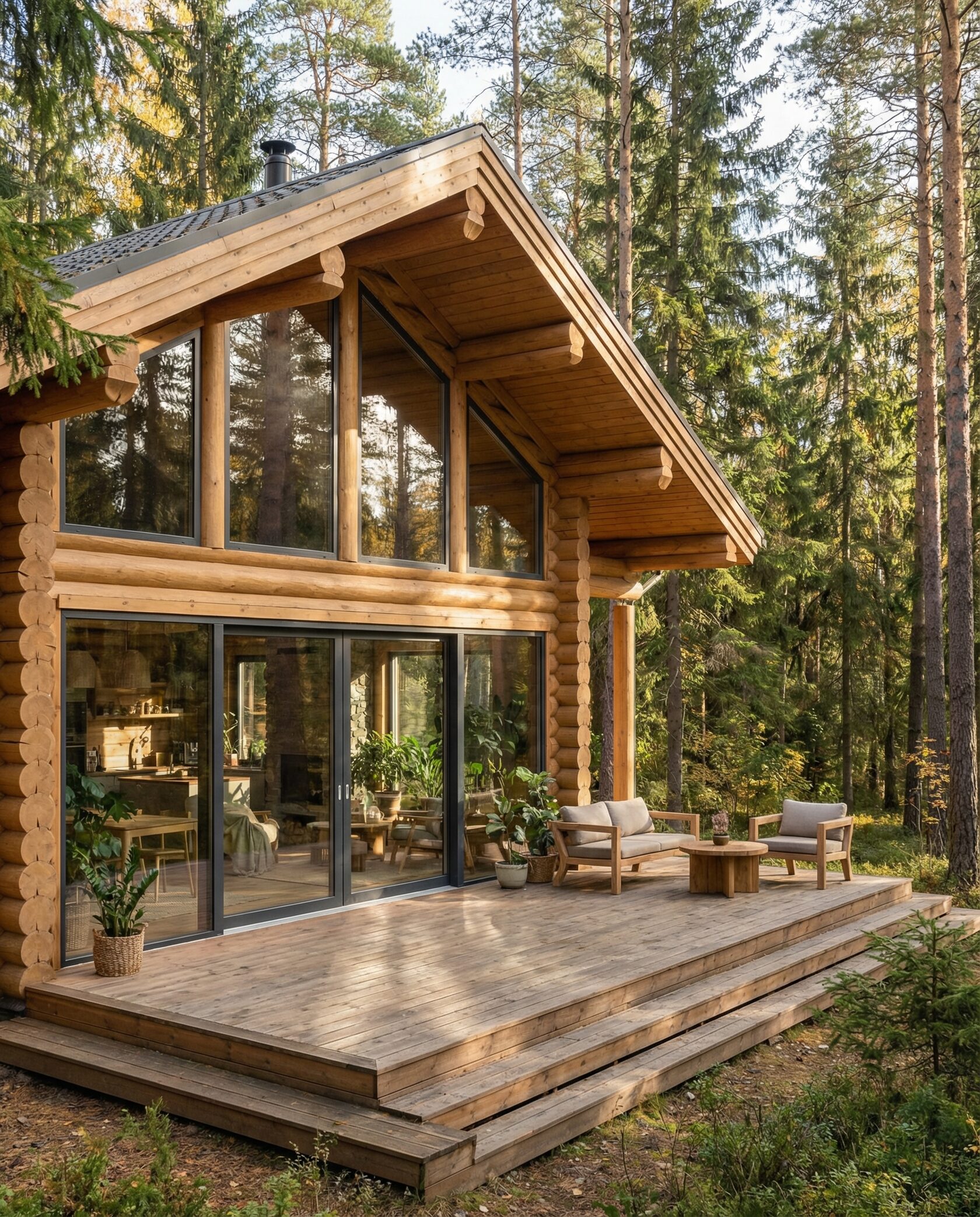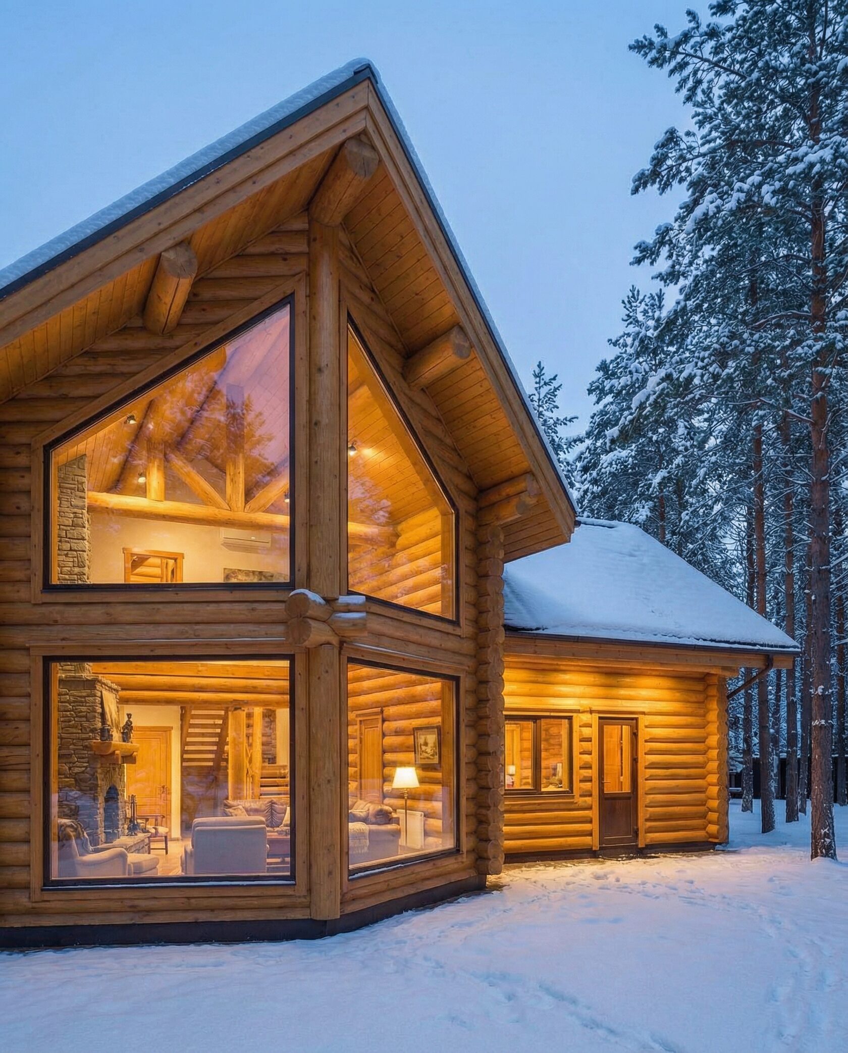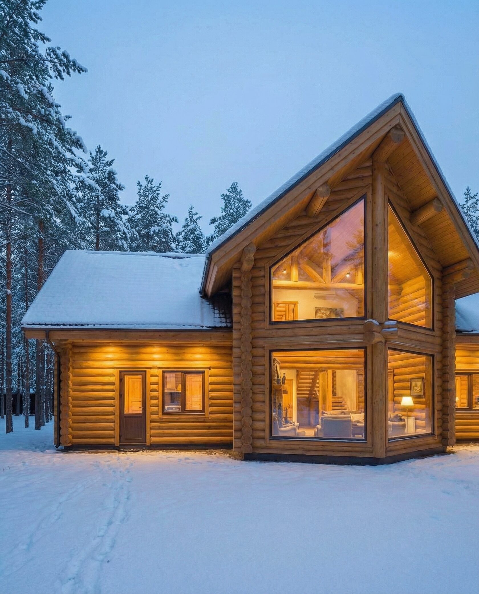 Дом «Эпсилон» — двухэтажный коттедж из оцилиндрованного бревна с панорамными окнами, двухсветной гостиной и просторной террасой. Интерьер сочетает дерево, камень и комфортную планировку для семьи и гостей. Преимущества: панорамное остекление, открытая терраса, выразительный фасад, северный стиль, удобная планировка, уютная атмосфера и гармония с природой.