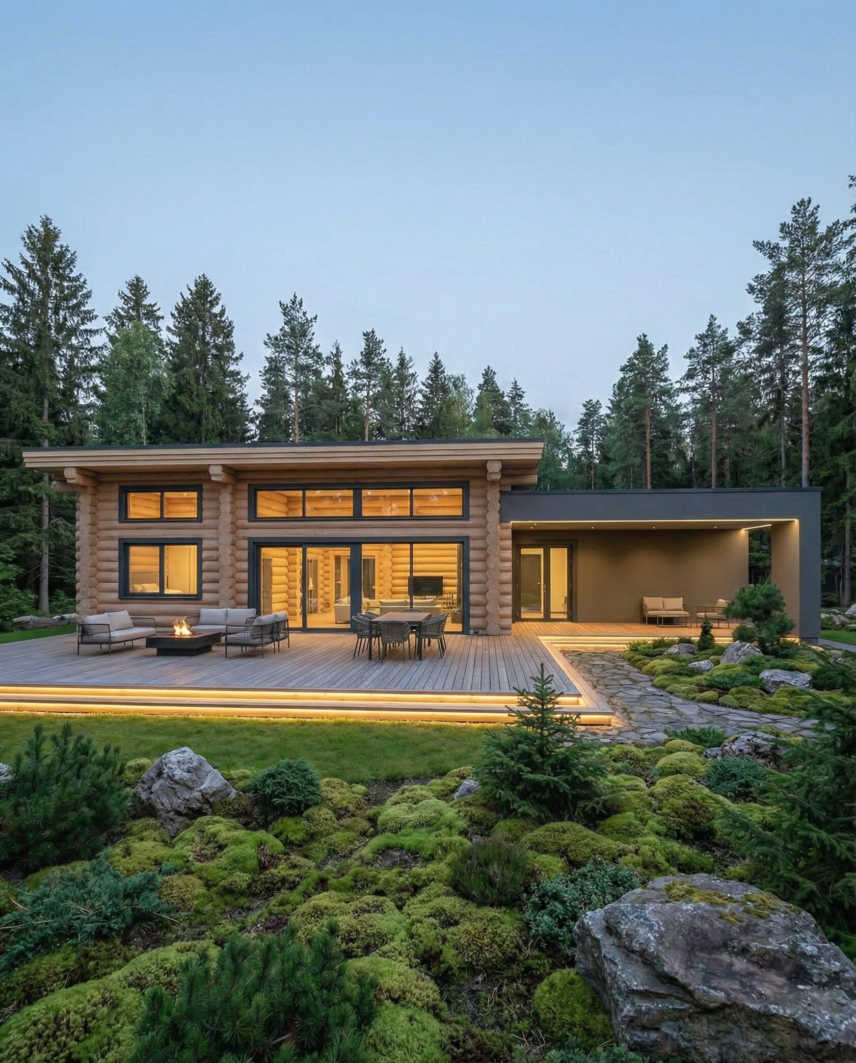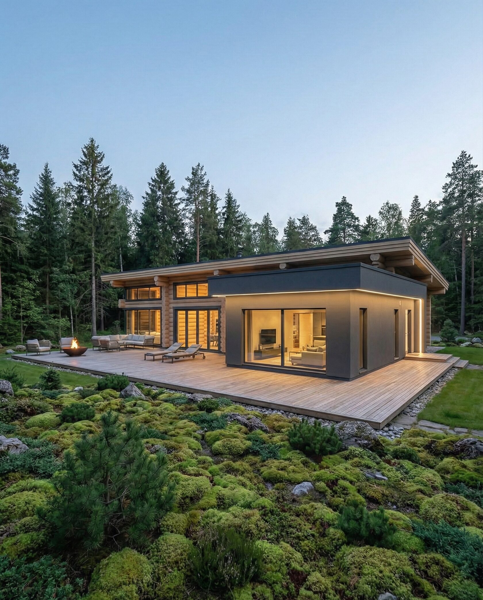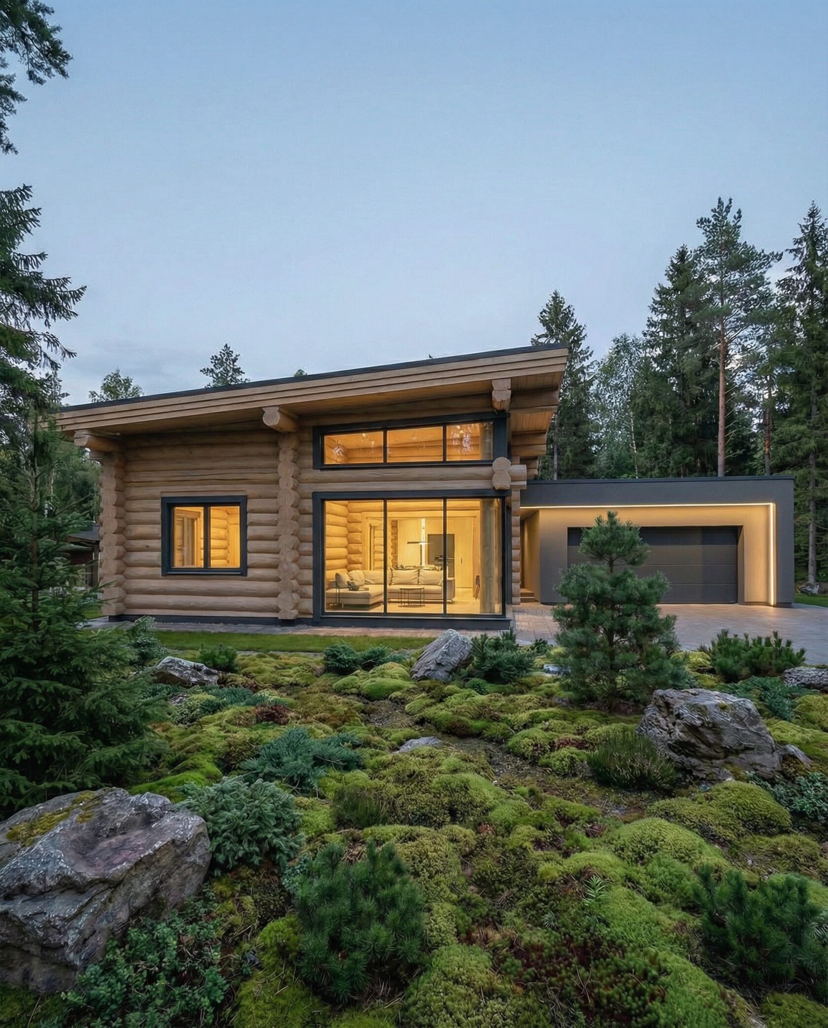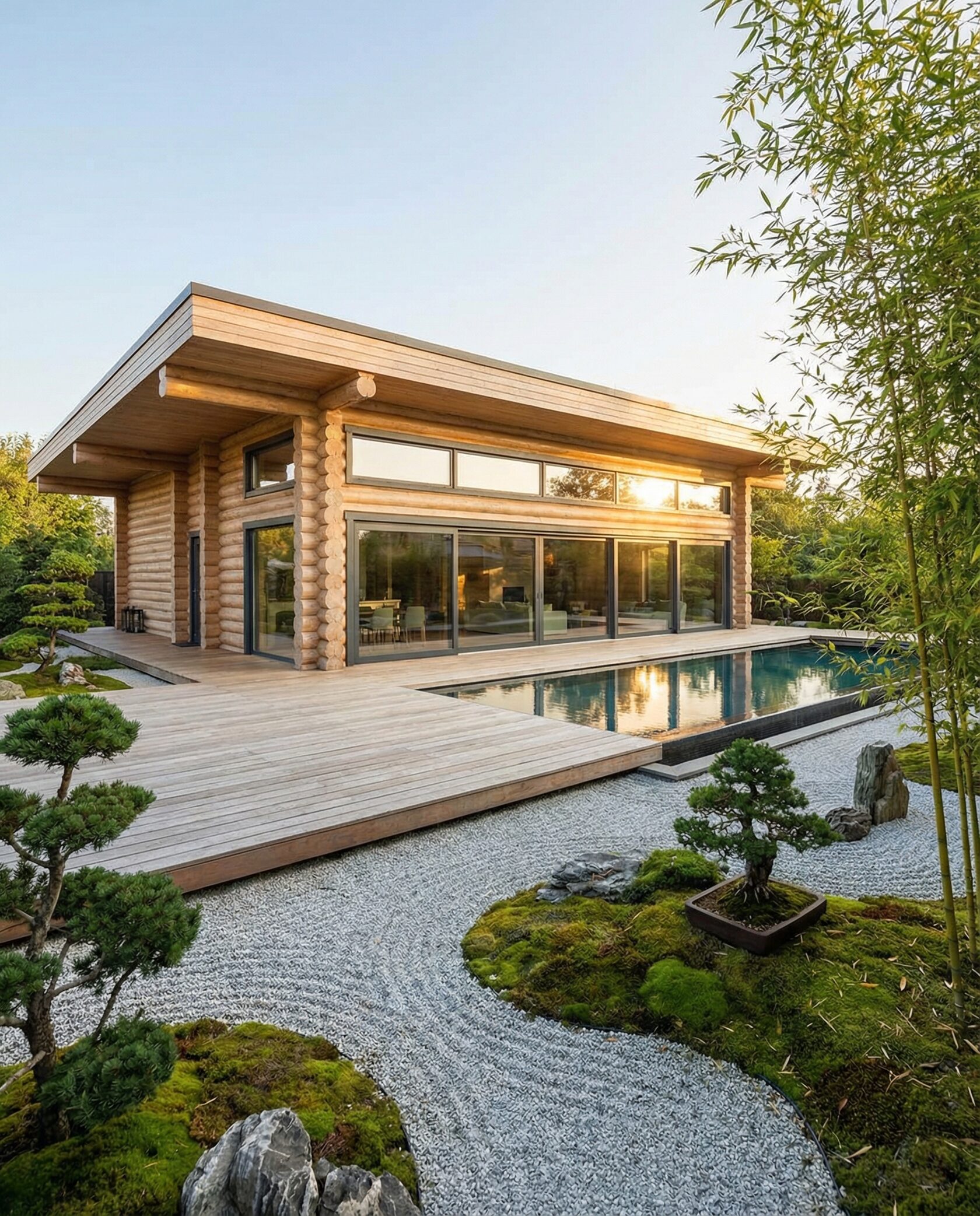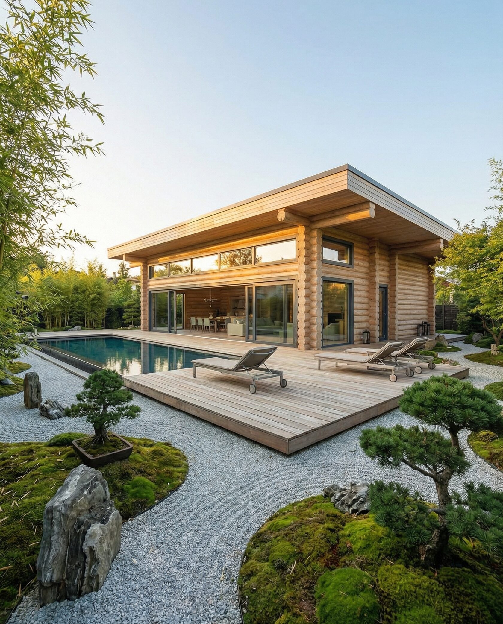Дом «Ригель» — современный одноэтажный минимализм с натуральным деревом, панорамными окнами и террасой с бассейном. Интерьер открыт и светел, камин у стеклянной стены создаёт уют, а японский сад с мхом, камнями и хвойниками дополняет атмосферу гармонии с природой. Преимущества: панорамные окна, раздвижные двери, терраса с бассейном, японский сад, лаконичный интерьер и архитектурная подсветка.
