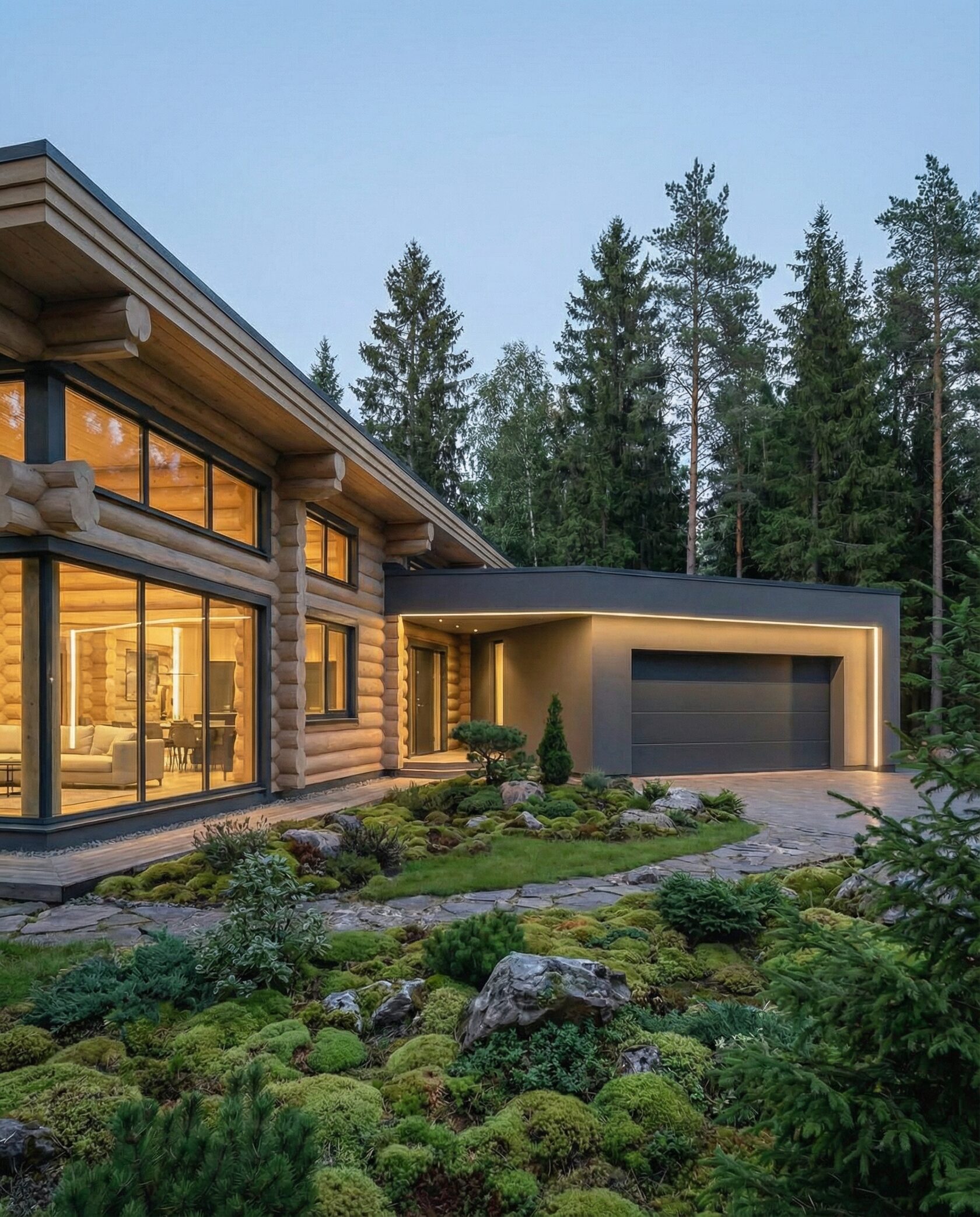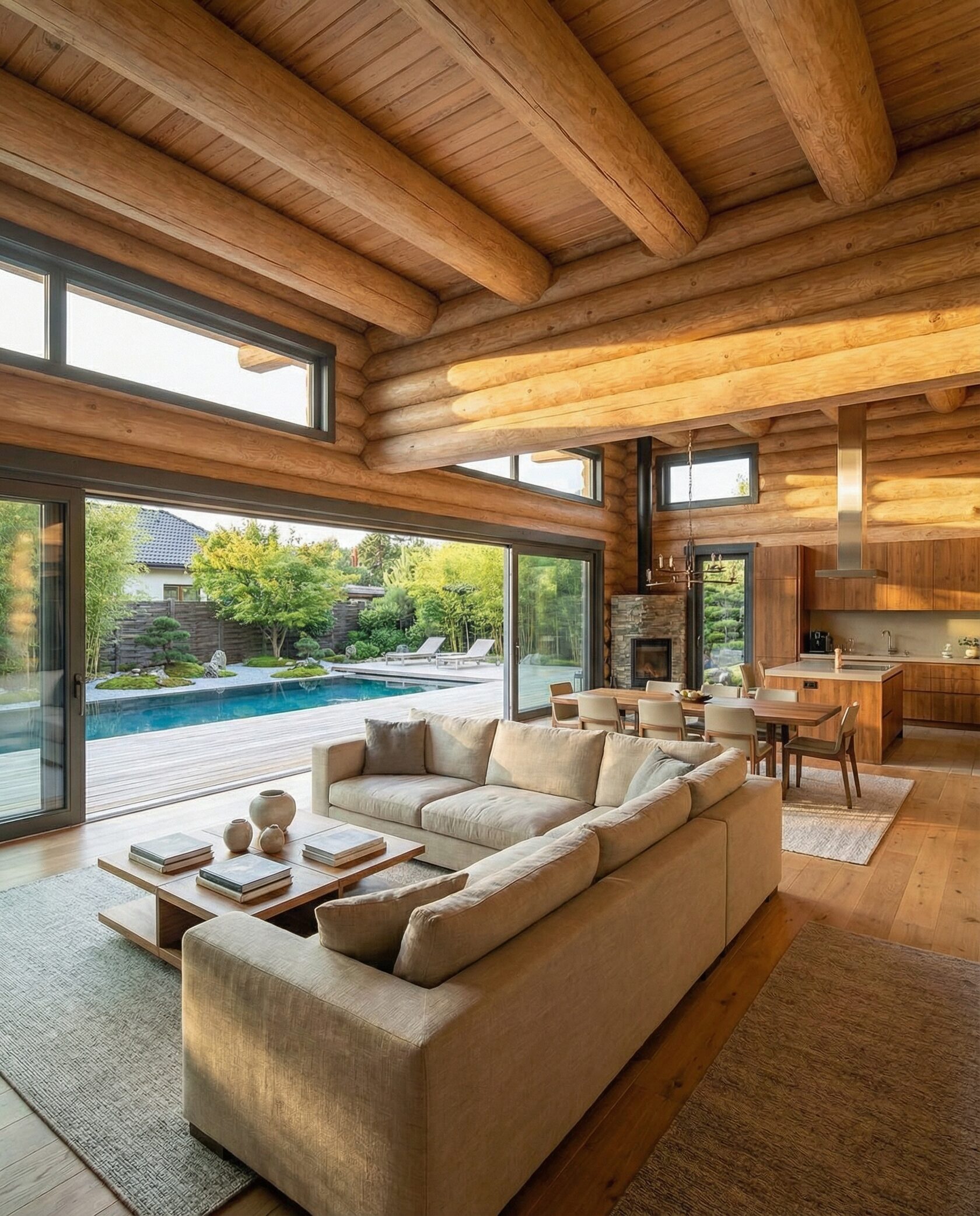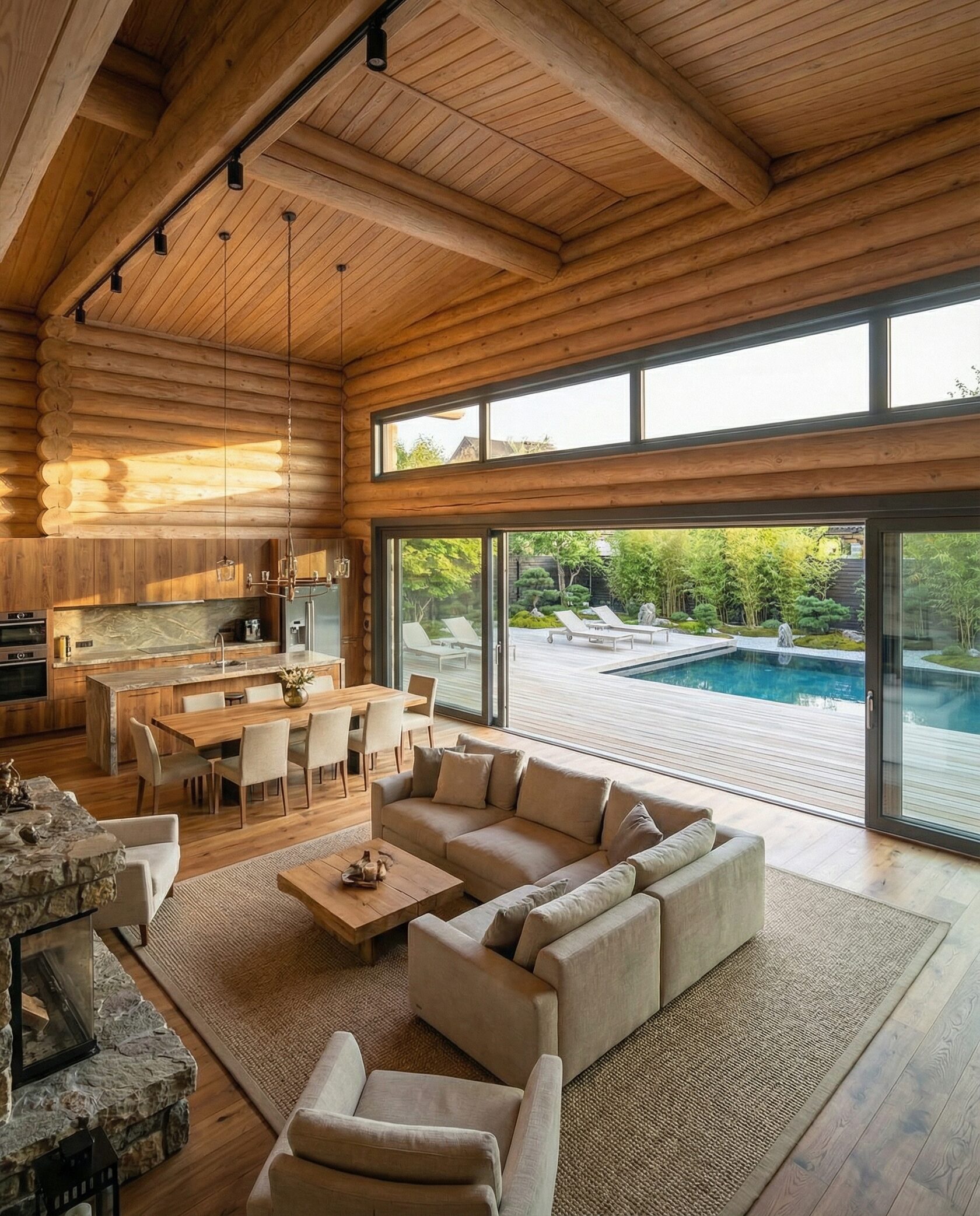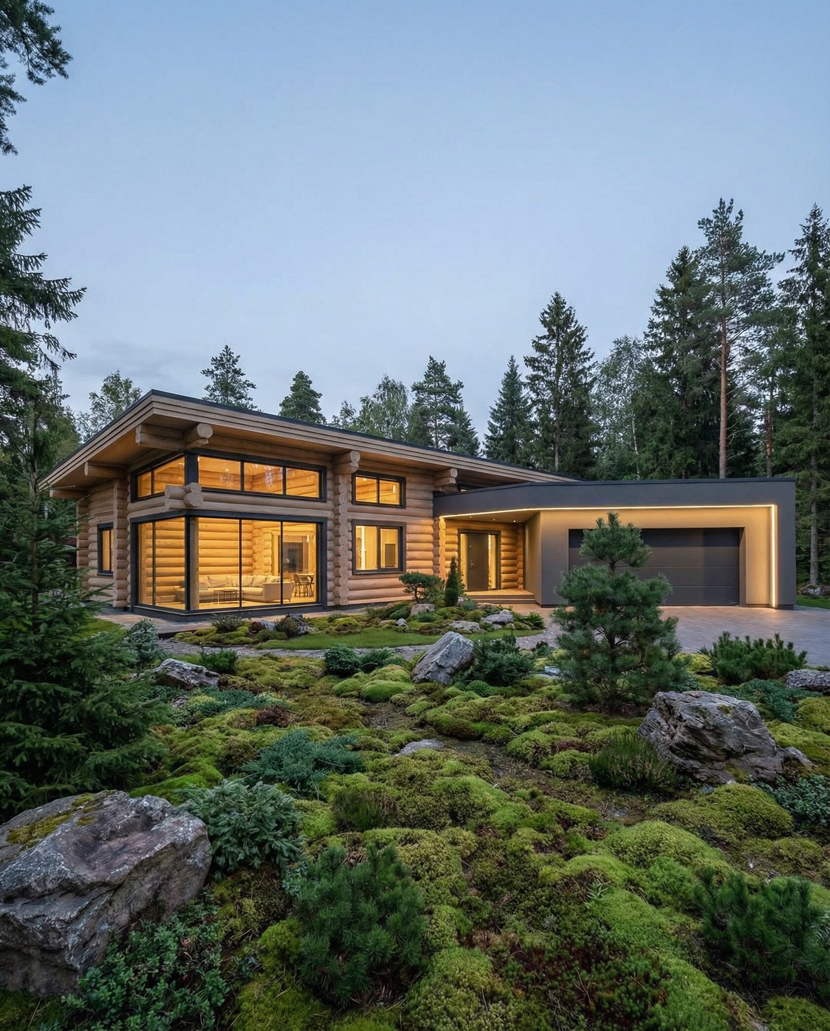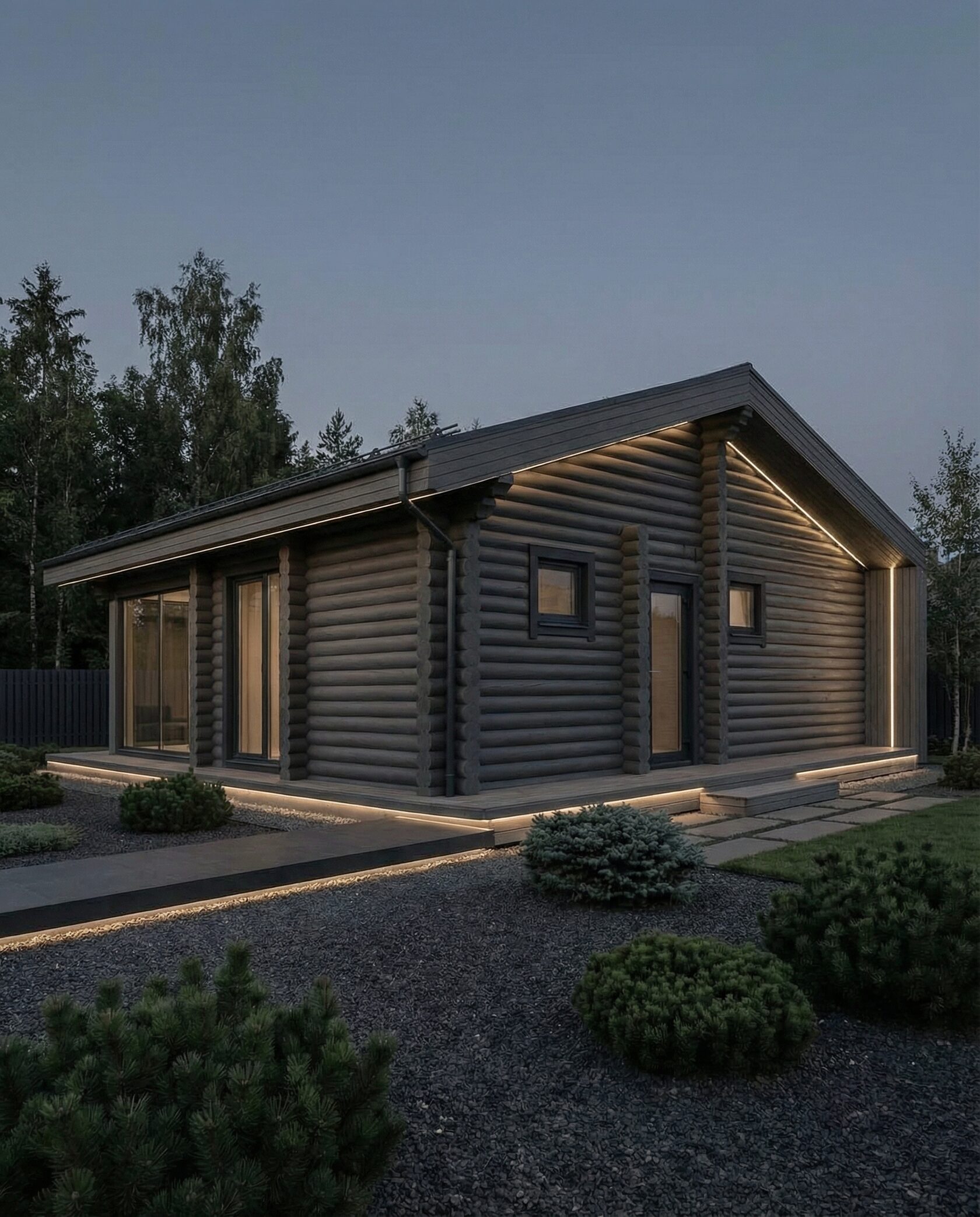 Дом «Ригель» — современный одноэтажный минимализм с натуральным деревом, панорамными окнами и террасой с бассейном. Интерьер открыт и светел, камин у стеклянной стены создаёт уют, а японский сад с мхом, камнями и хвойниками дополняет атмосферу гармонии с природой. Преимущества: панорамные окна, раздвижные двери, терраса с бассейном, японский сад, лаконичный интерьер и архитектурная подсветка.