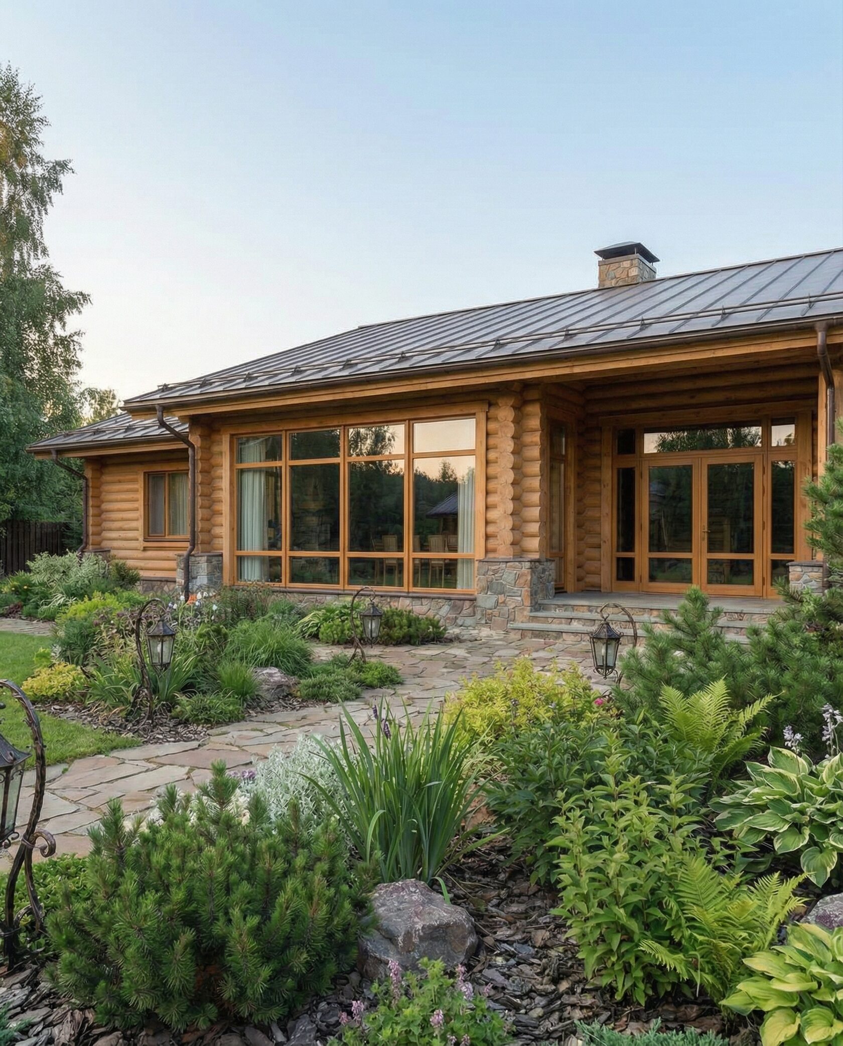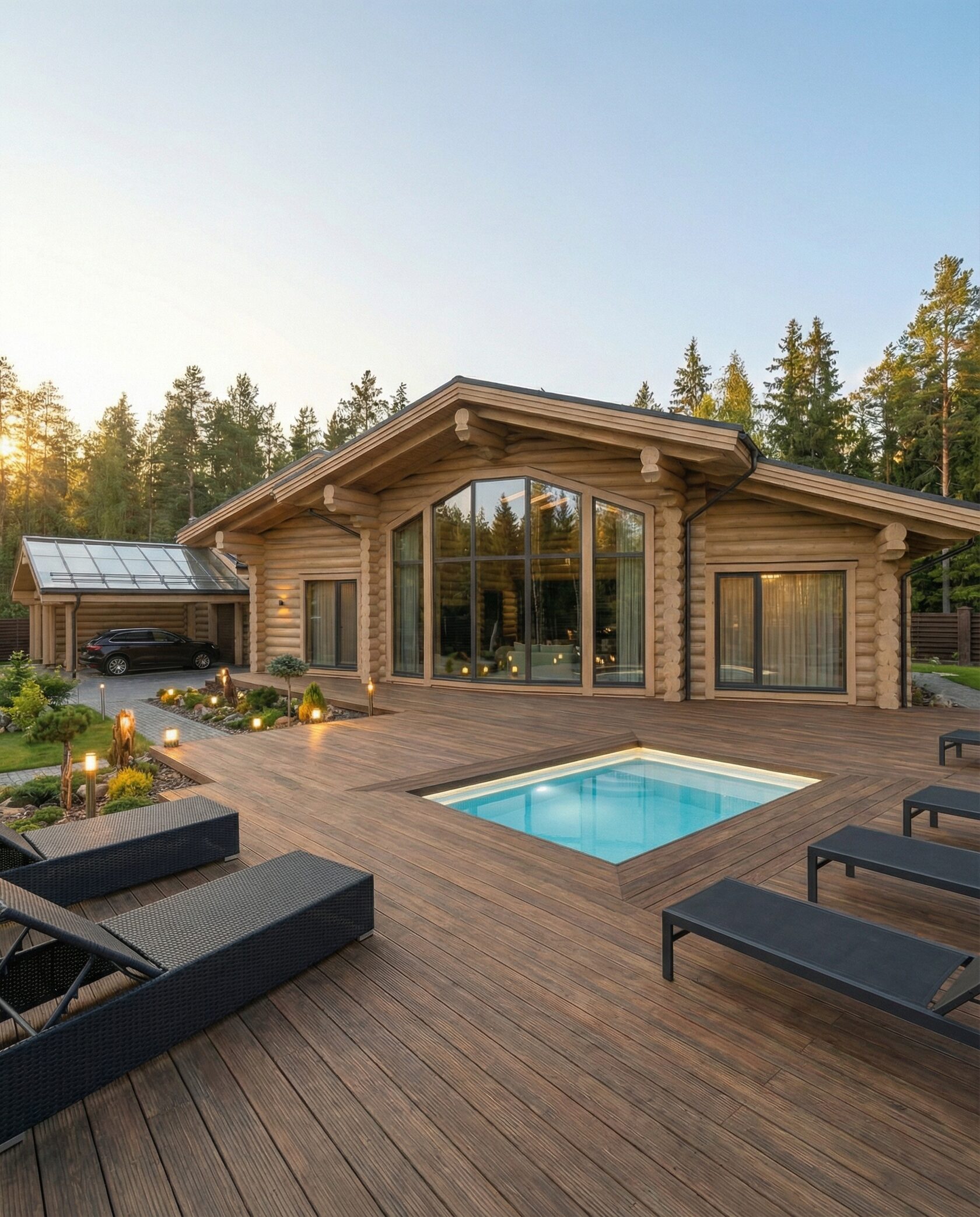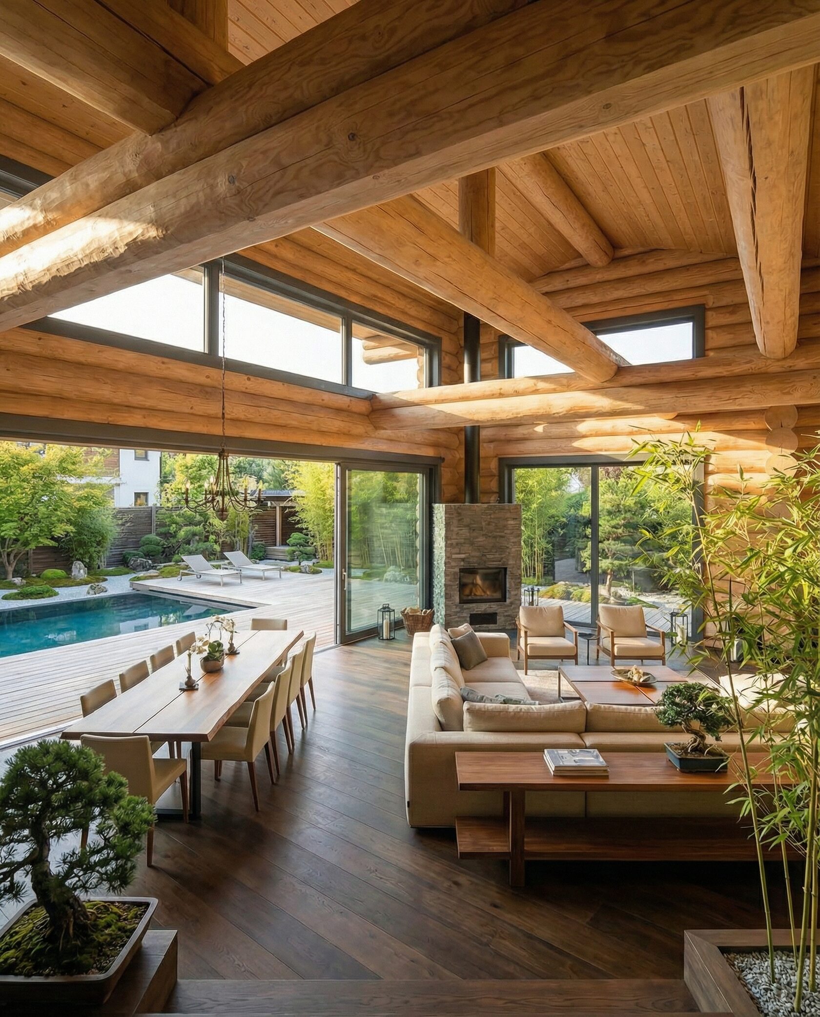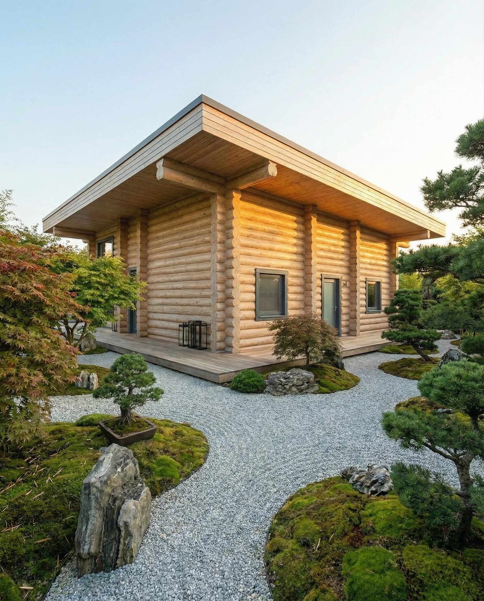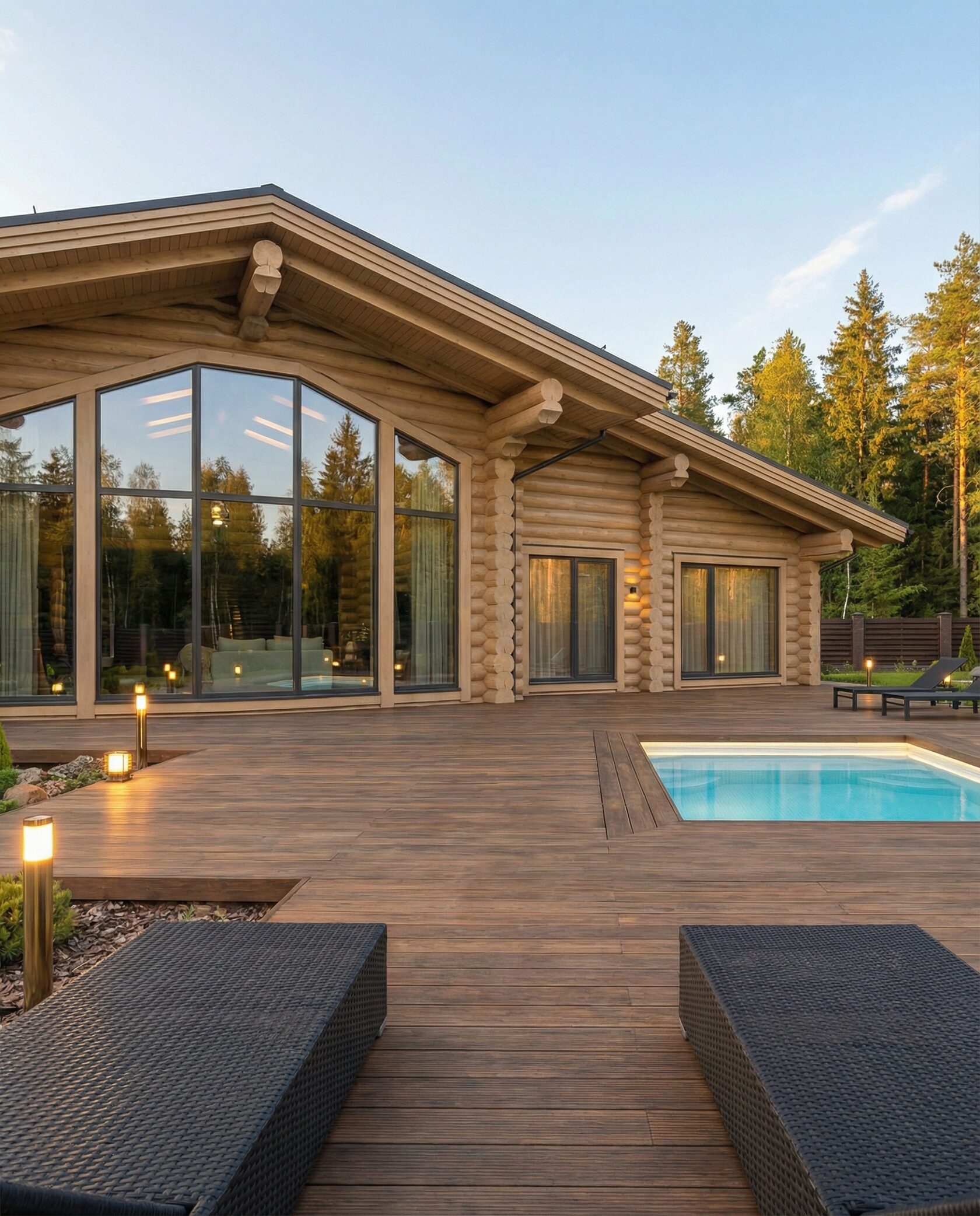 Дом «Ригель» — современный одноэтажный минимализм с натуральным деревом, панорамными окнами и террасой с бассейном. Интерьер открыт и светел, камин у стеклянной стены создаёт уют, а японский сад с мхом, камнями и хвойниками дополняет атмосферу гармонии с природой. Преимущества: панорамные окна, раздвижные двери, терраса с бассейном, японский сад, лаконичный интерьер и архитектурная подсветка.