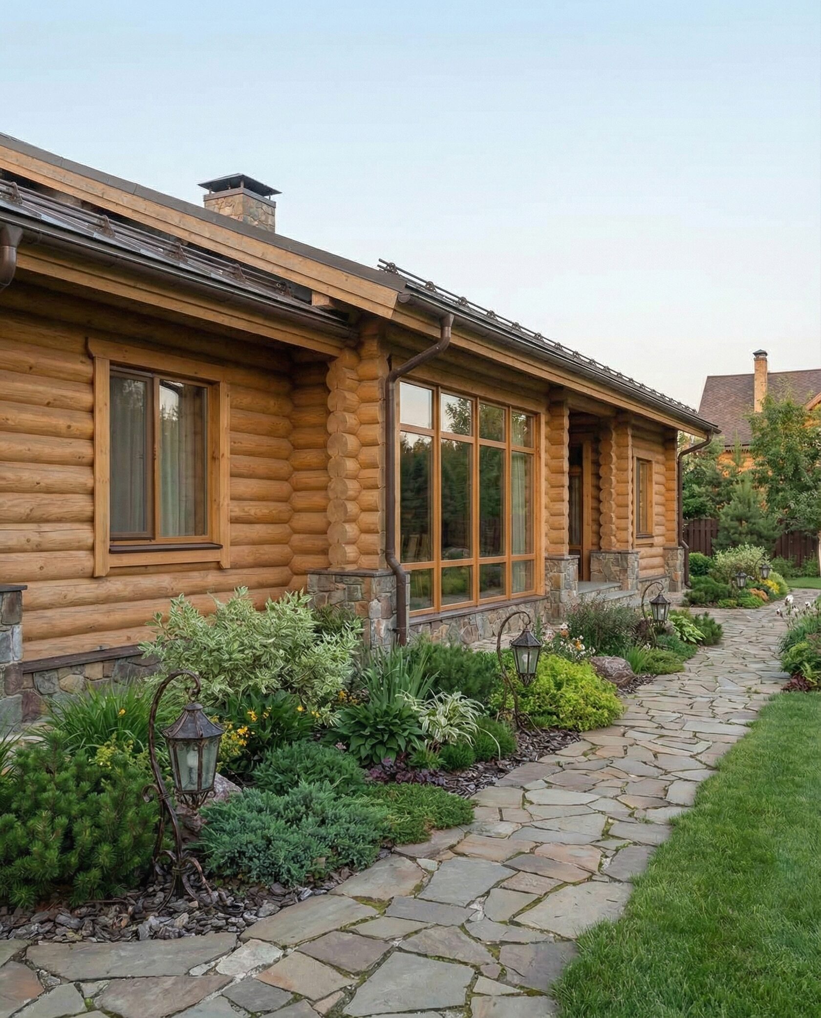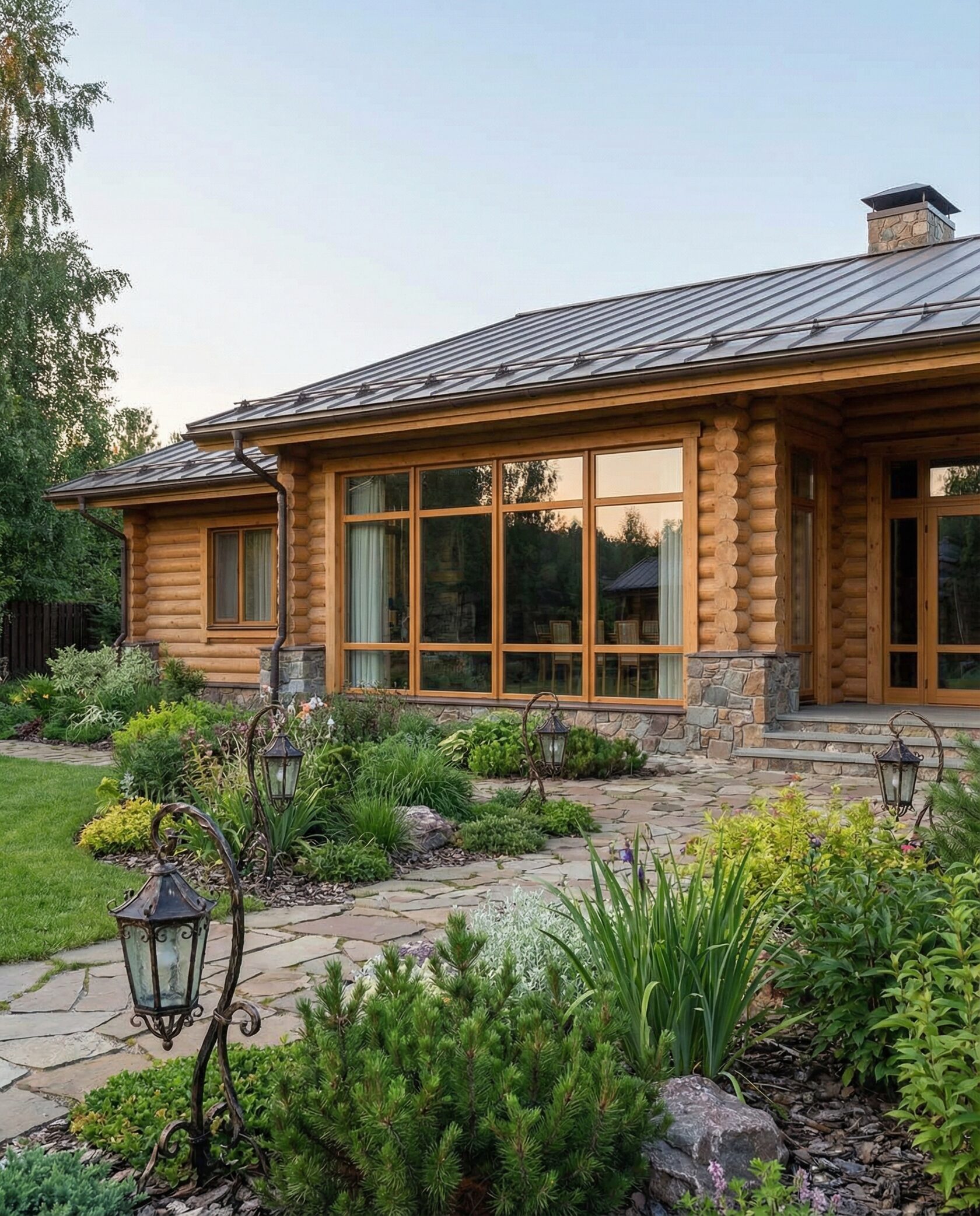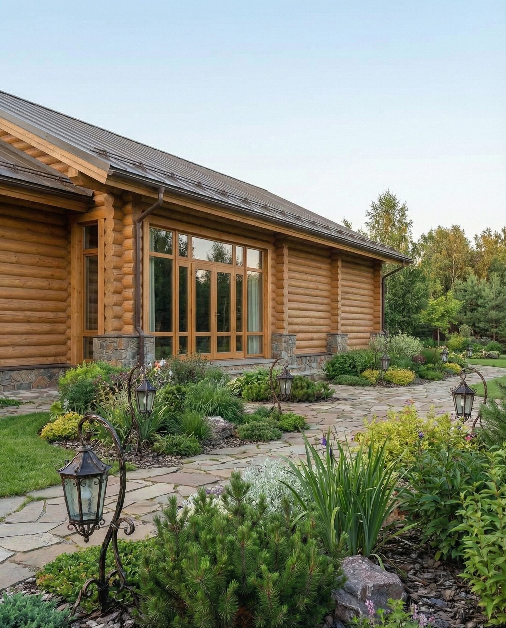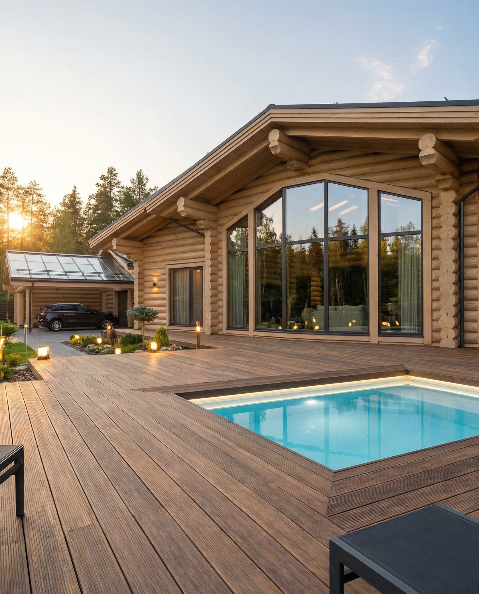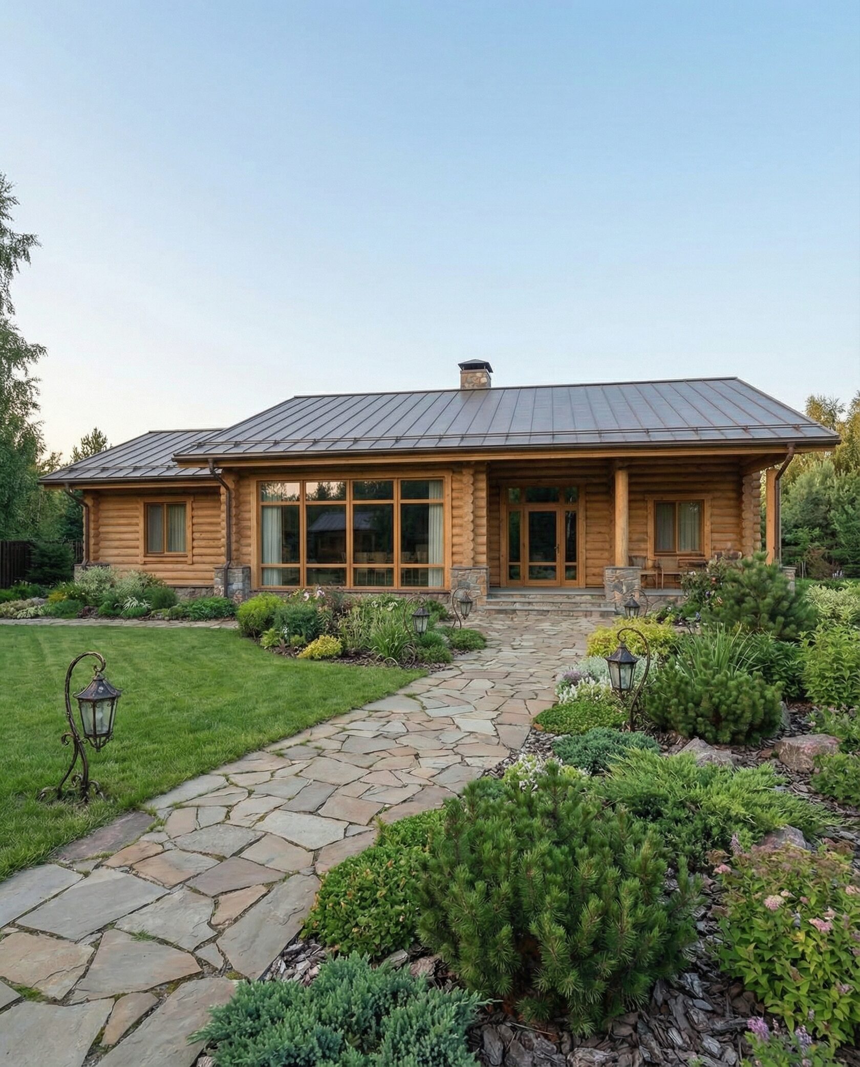 Дом «Ригель» — современный одноэтажный минимализм с натуральным деревом, панорамными окнами и террасой с бассейном. Интерьер открыт и светел, камин у стеклянной стены создаёт уют, а японский сад с мхом, камнями и хвойниками дополняет атмосферу гармонии с природой. Преимущества: панорамные окна, раздвижные двери, терраса с бассейном, японский сад, лаконичный интерьер и архитектурная подсветка.
