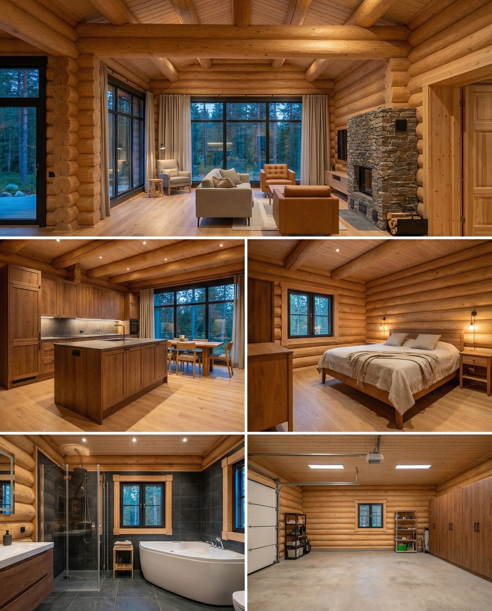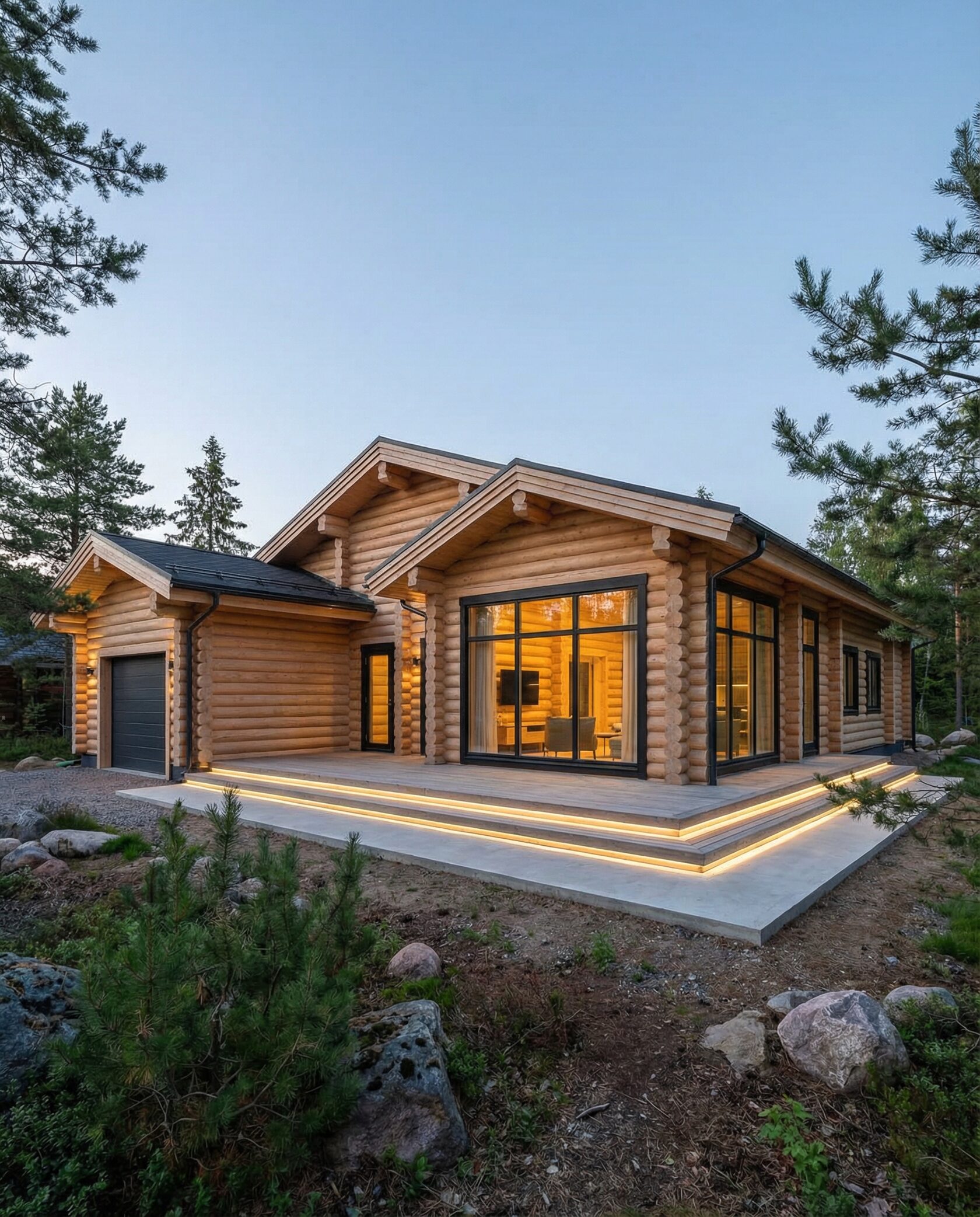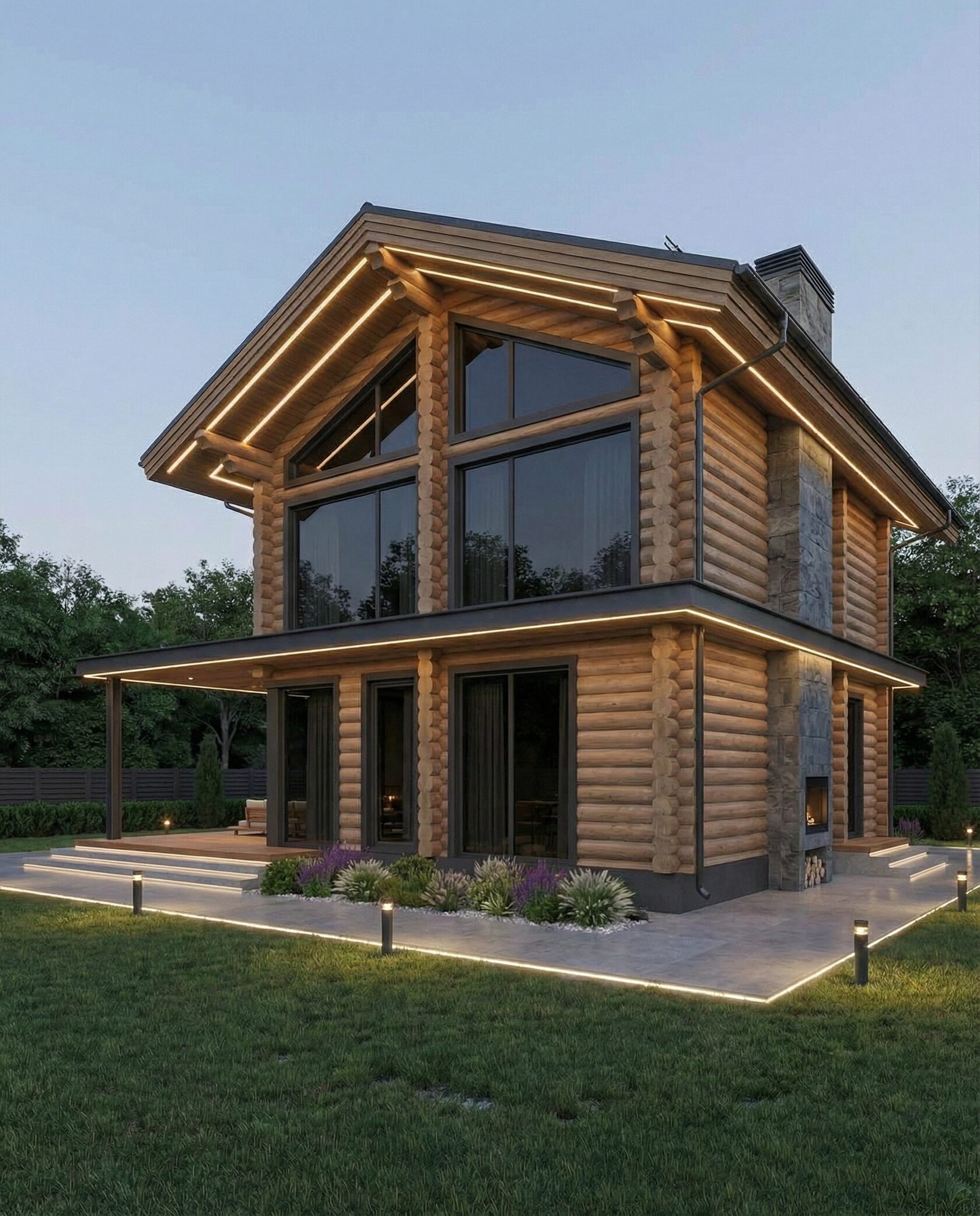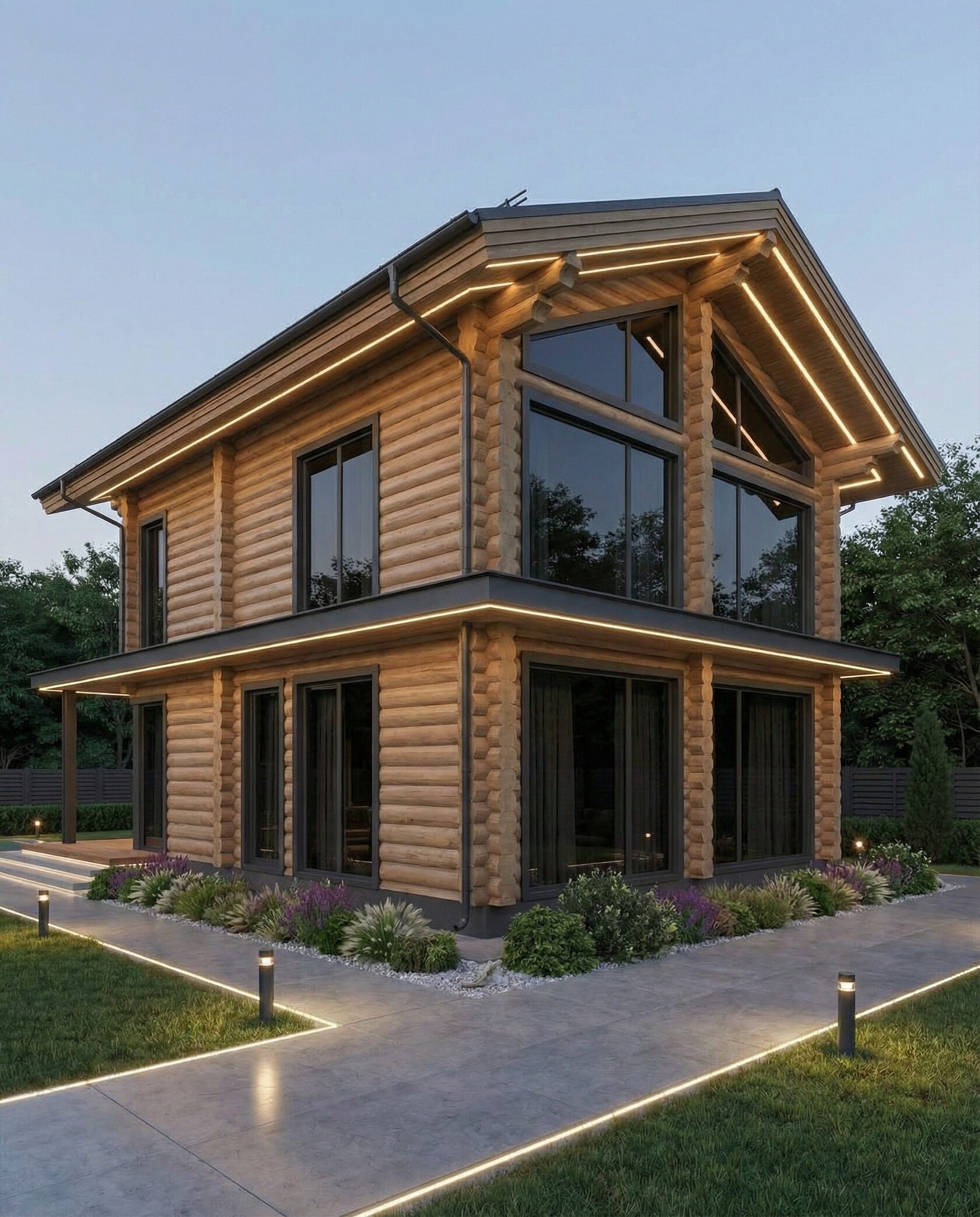 Дом «Эльген» — современный трёхэтажный коттедж из цельного бревна с панорамными окнами, двусветной гостиной и большой террасой на втором этаже. Внутри — камин, просторные спальни и интегрированный гараж, а открытая планировка создаёт максимум света и комфорта. Преимущества: натуральные материалы, второй свет, панорамные виды, просторная терраса, рациональная планировка, гараж и удобный вход.