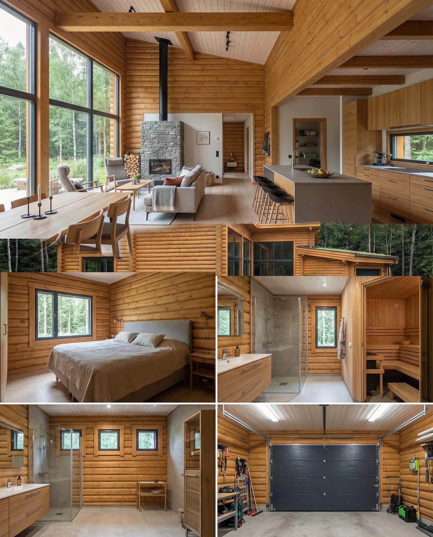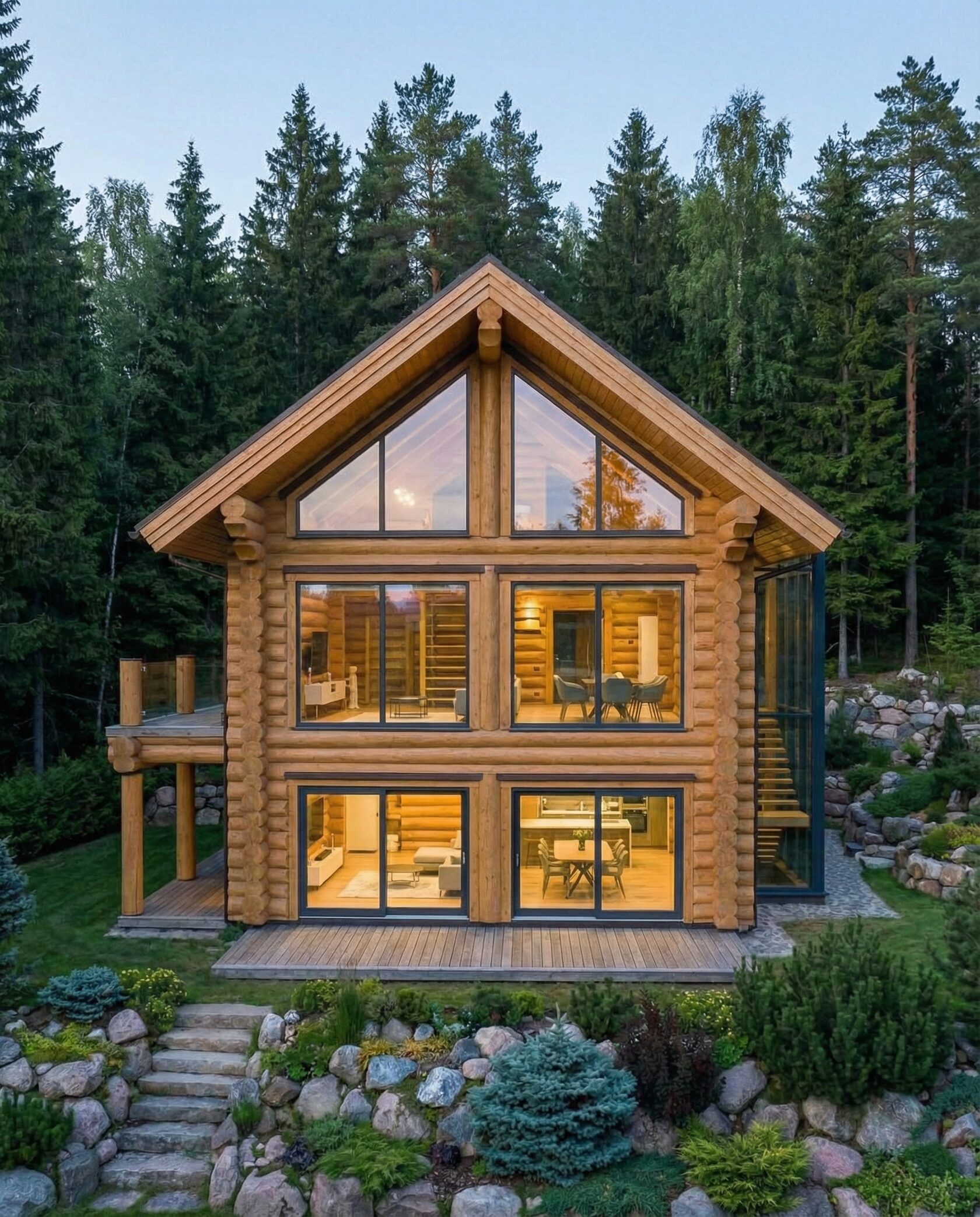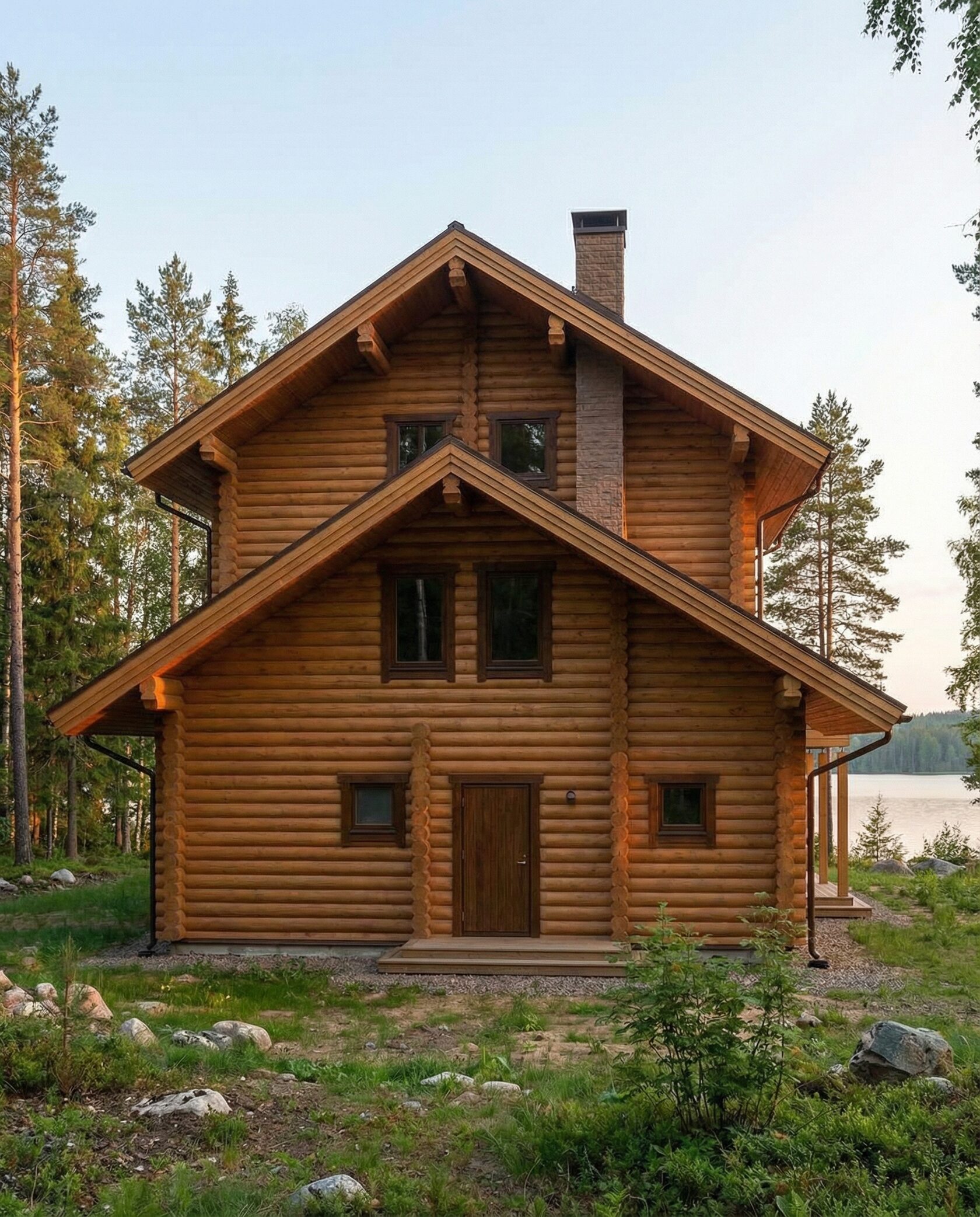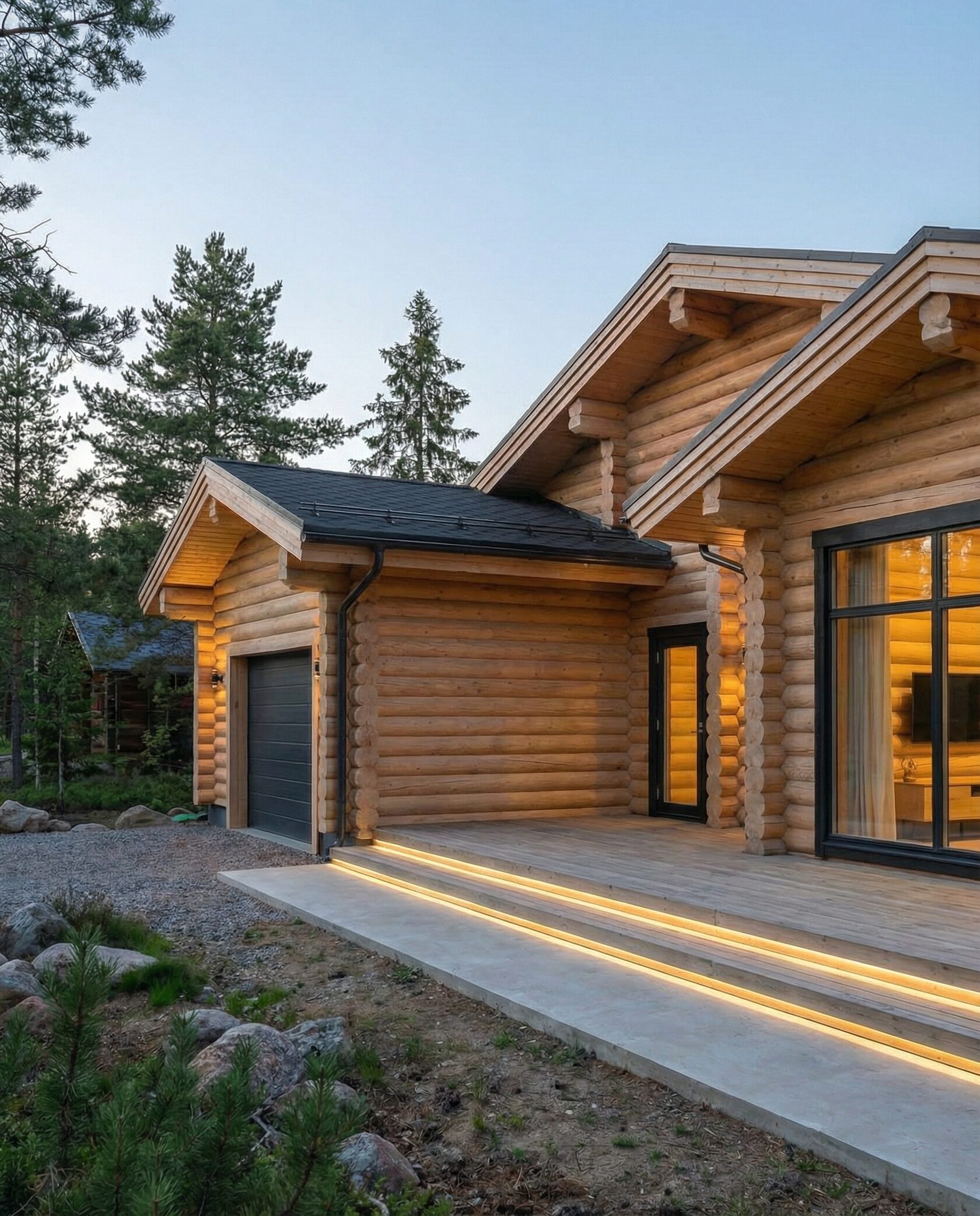 Дом «Эльген» — современный трёхэтажный коттедж из цельного бревна с панорамными окнами, двусветной гостиной и большой террасой на втором этаже. Внутри — камин, просторные спальни и интегрированный гараж, а открытая планировка создаёт максимум света и комфорта. Преимущества: натуральные материалы, второй свет, панорамные виды, просторная терраса, рациональная планировка, гараж и удобный вход.