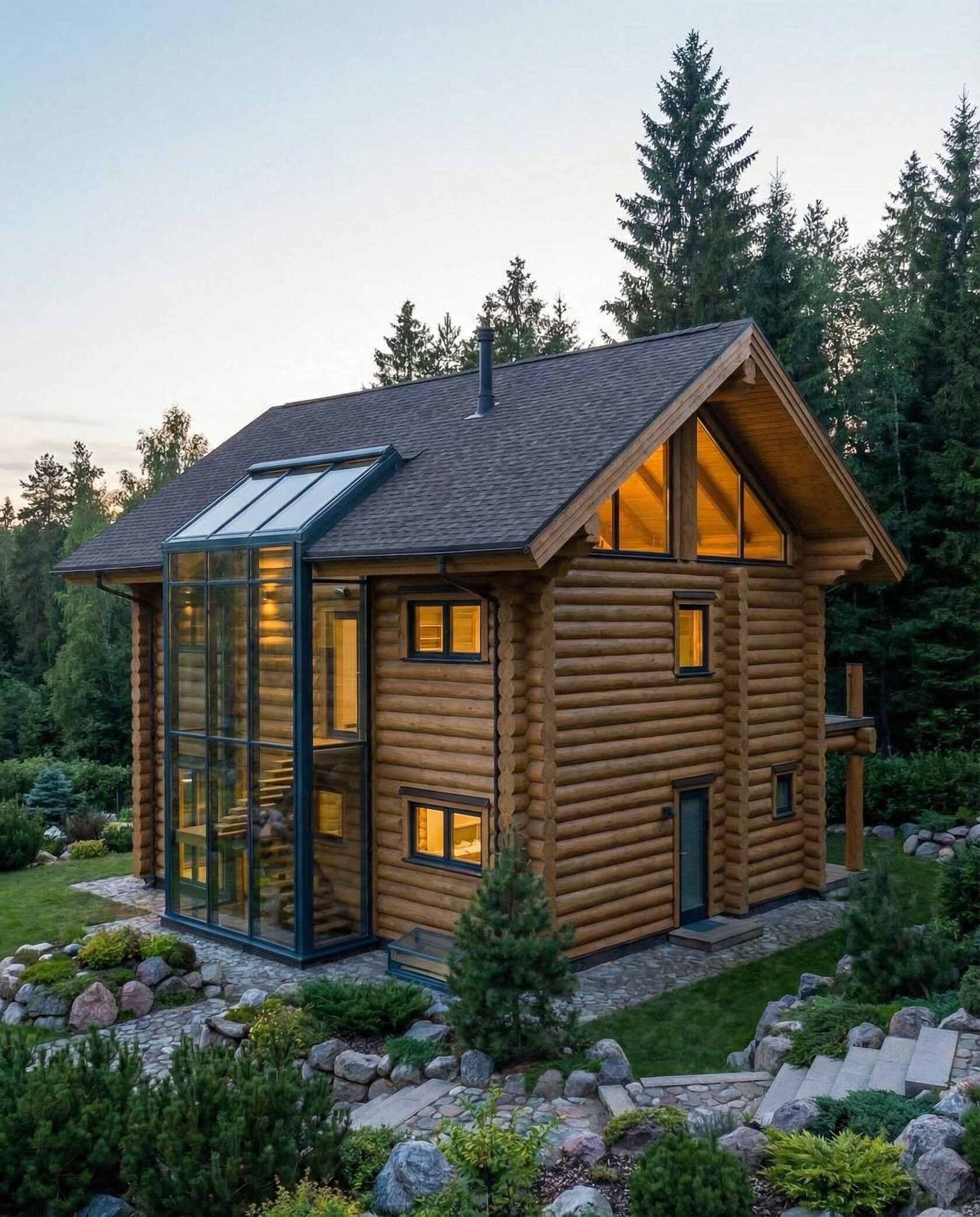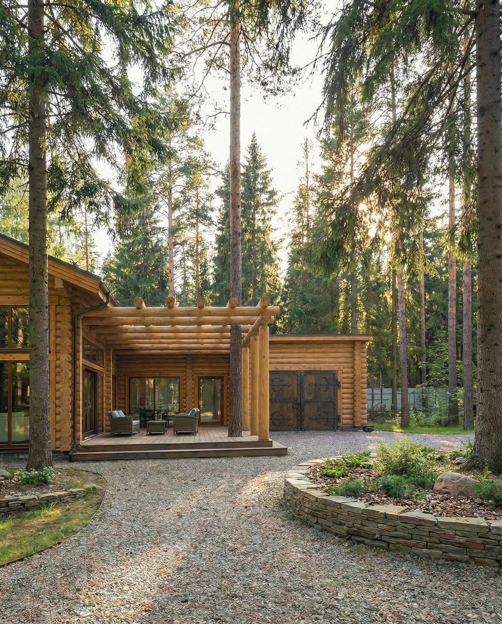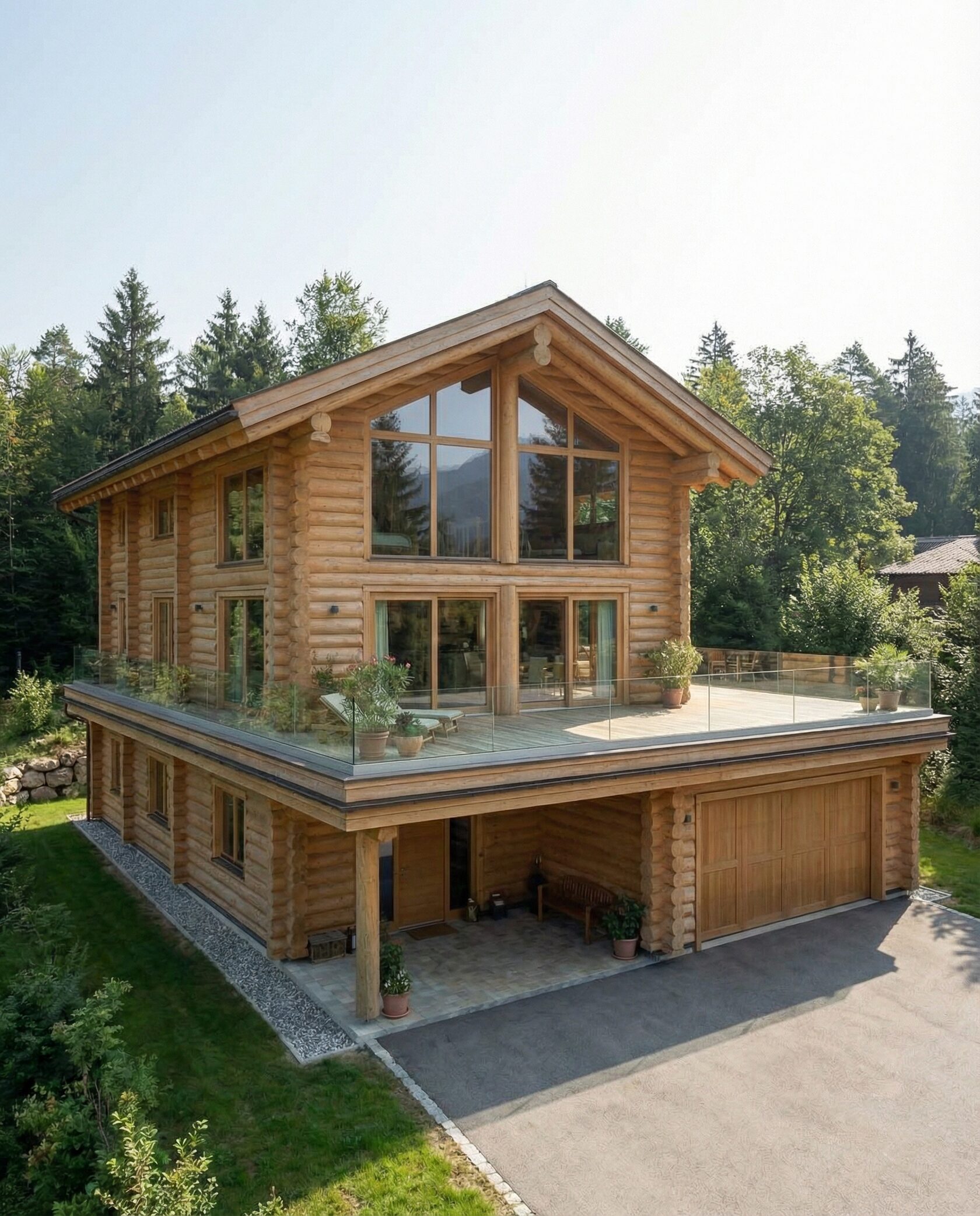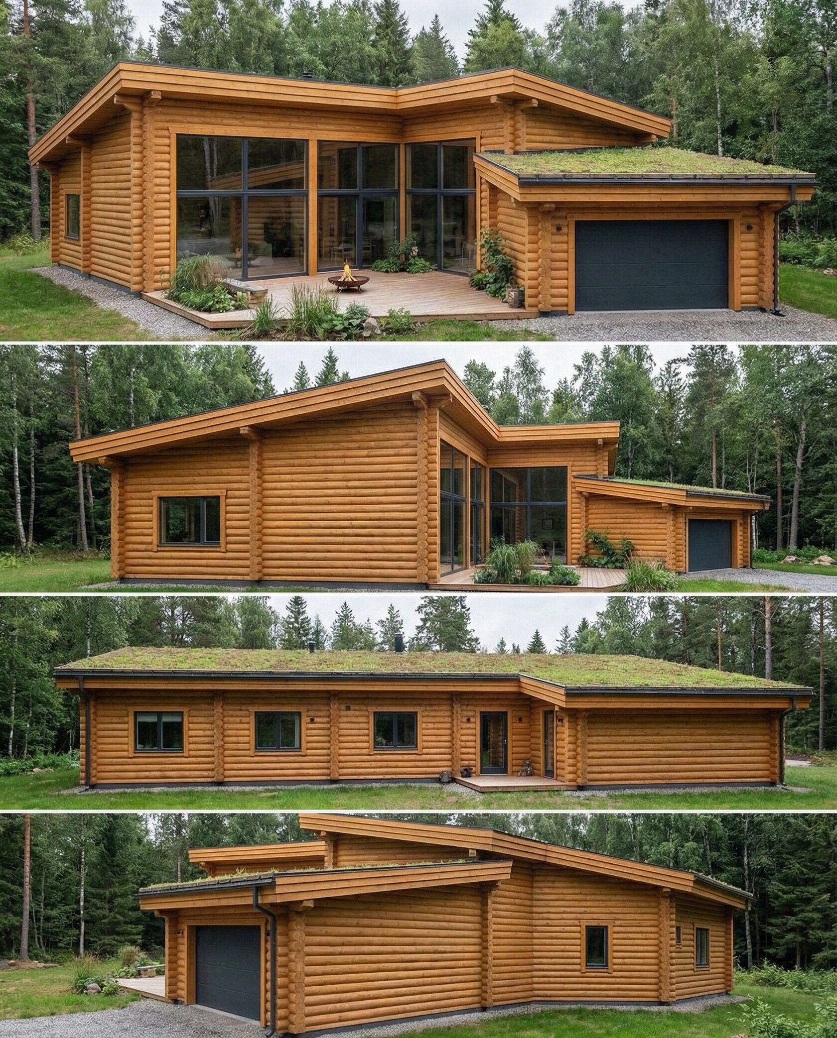 Дом «Эльген» — современный трёхэтажный коттедж из цельного бревна с панорамными окнами, двусветной гостиной и большой террасой на втором этаже. Внутри — камин, просторные спальни и интегрированный гараж, а открытая планировка создаёт максимум света и комфорта. Преимущества: натуральные материалы, второй свет, панорамные виды, просторная терраса, рациональная планировка, гараж и удобный вход.