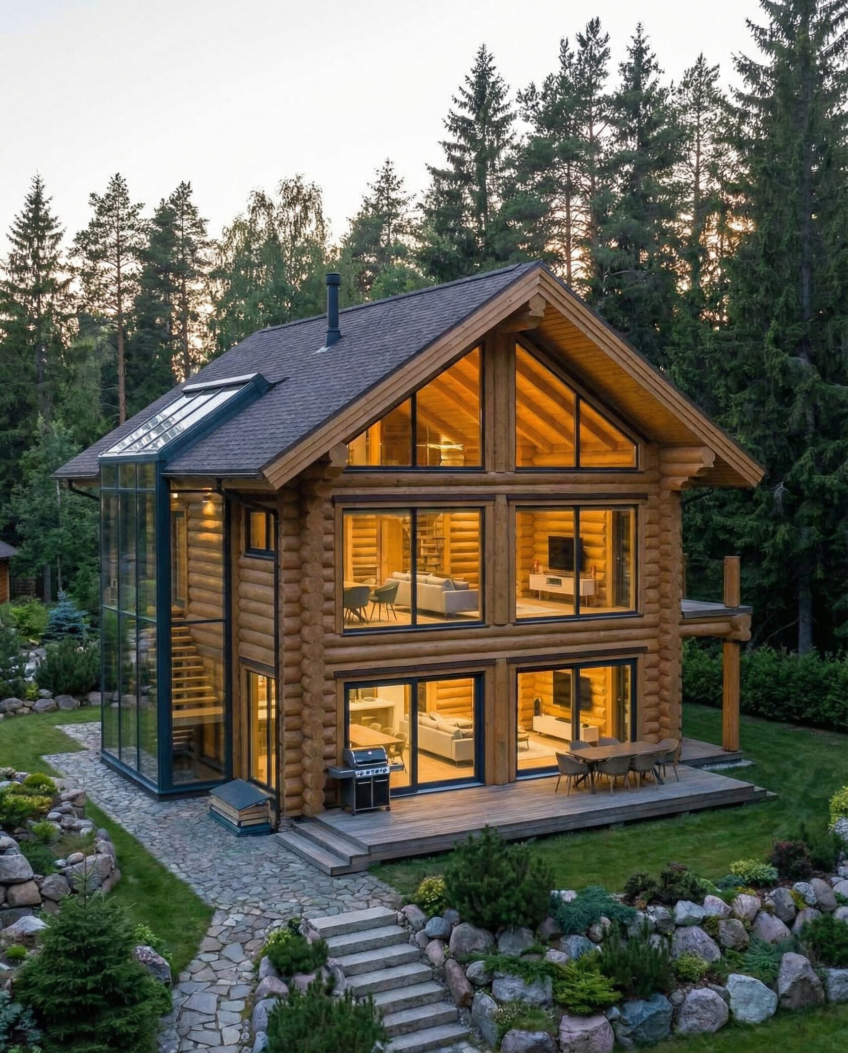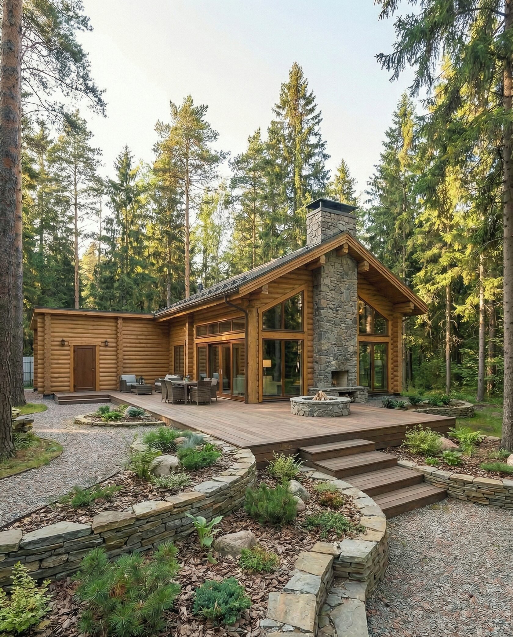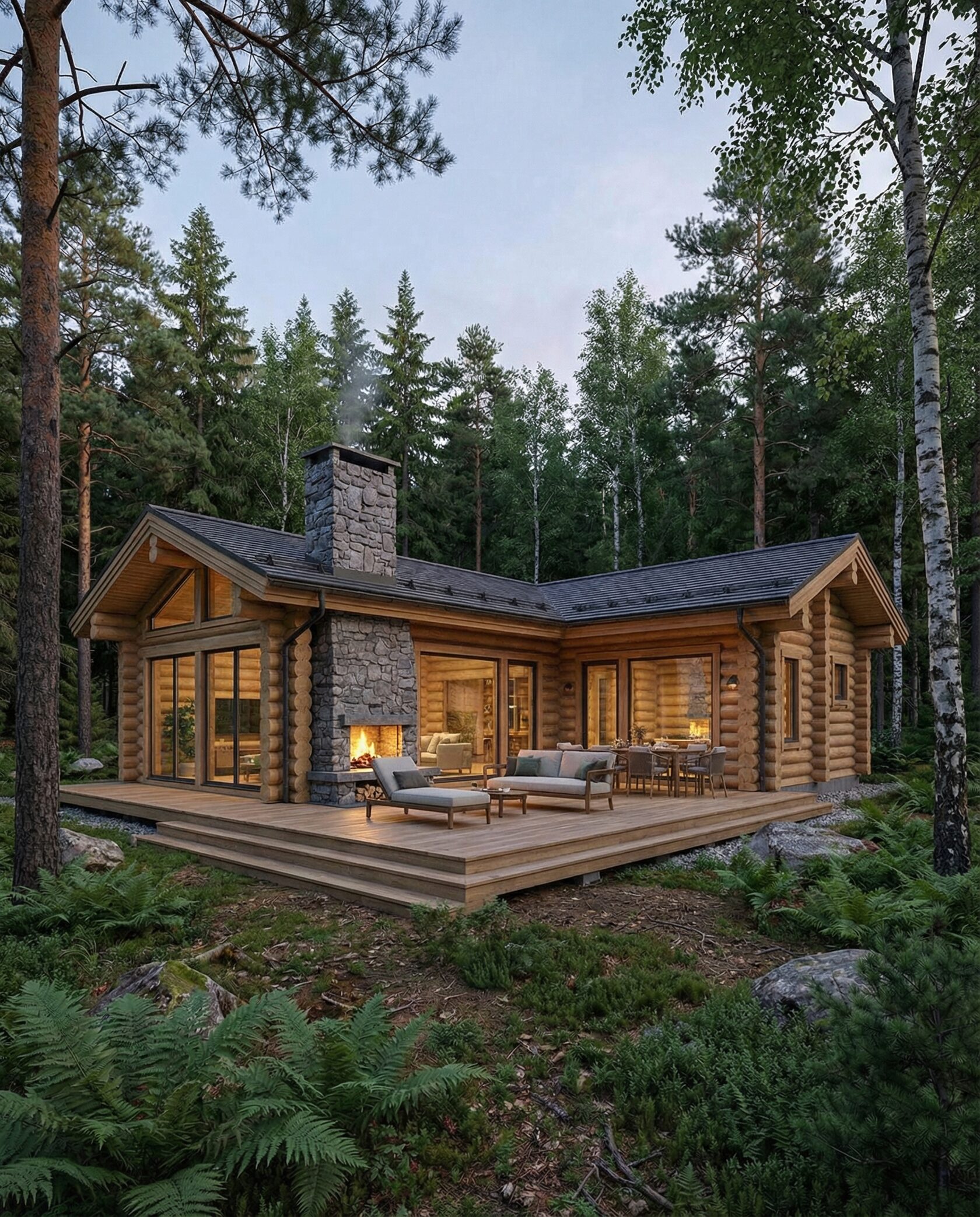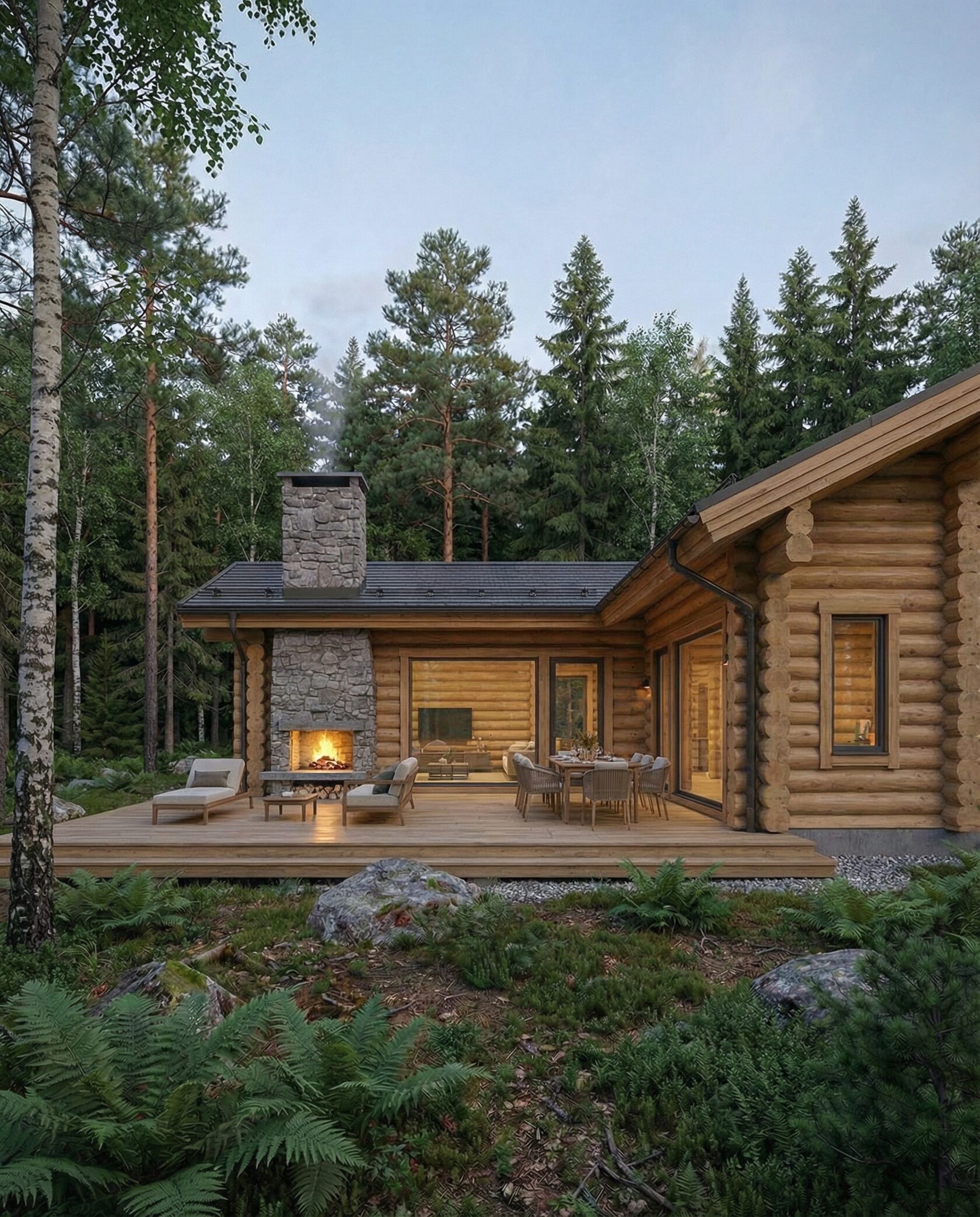Дом «Персия» — загородный дом в стиле европейского шале с панорамными окнами, камином из натурального камня и просторной двусветной гостиной. Большая терраса-подиум с уличным камином плавно соединяет интерьер с лесным участком. Преимущества: премиальная архитектура, связь с природой, уютная атмосфера, эффектная подсветка и ландшафт с натуральным камнем.