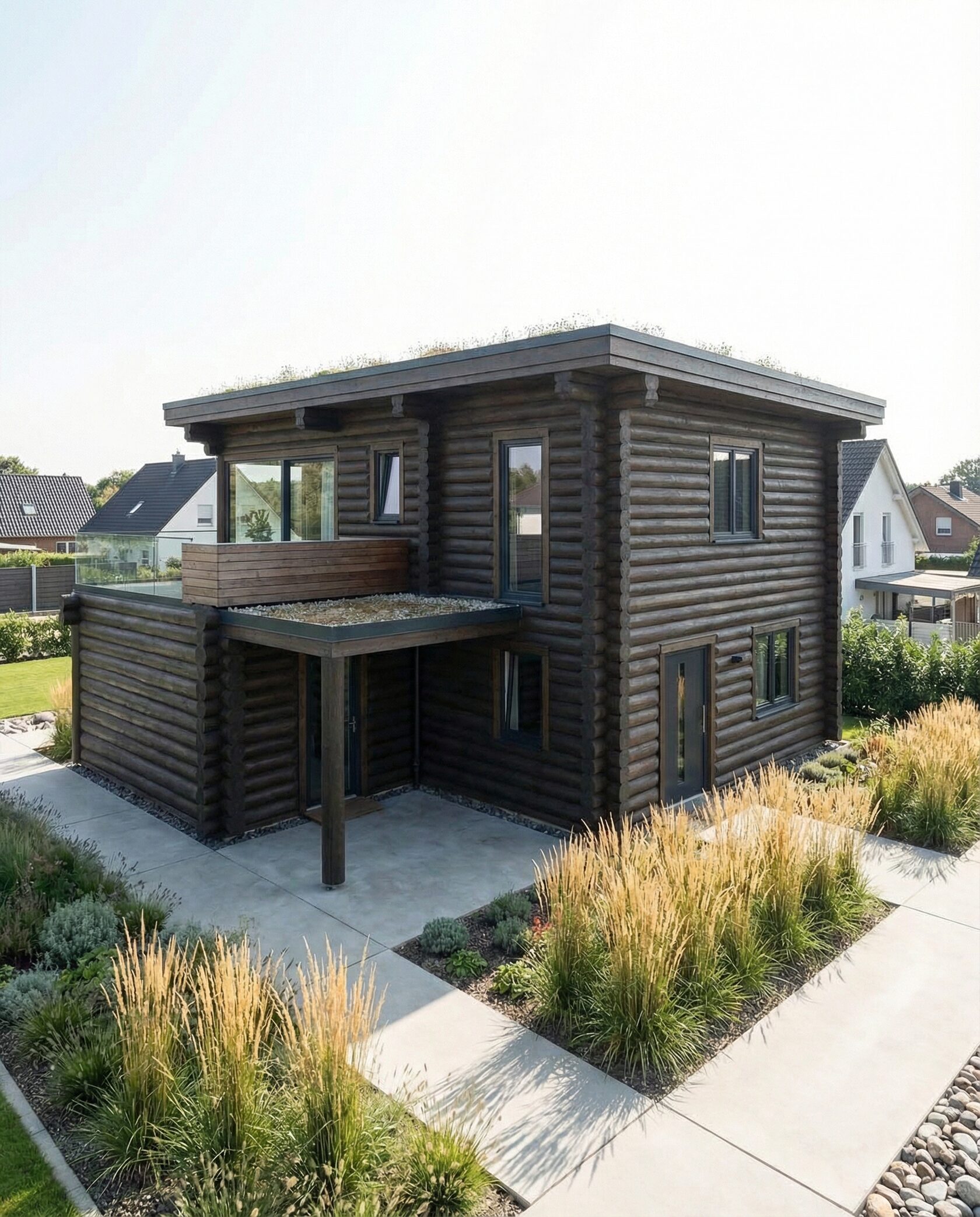 Дом «Сириус» — современный двухэтажный минимализм с тёмным деревянным фасадом, панорамными окнами и двусветной гостиной. Плоская зелёная кровля, терраса и продуманный ландшафт создают комфортное пространство для жизни на природе. Преимущества: выразительный фасад, много света, двусветное пространство, эргономичное зонирование, зелёная кровля и современный ландшафт.