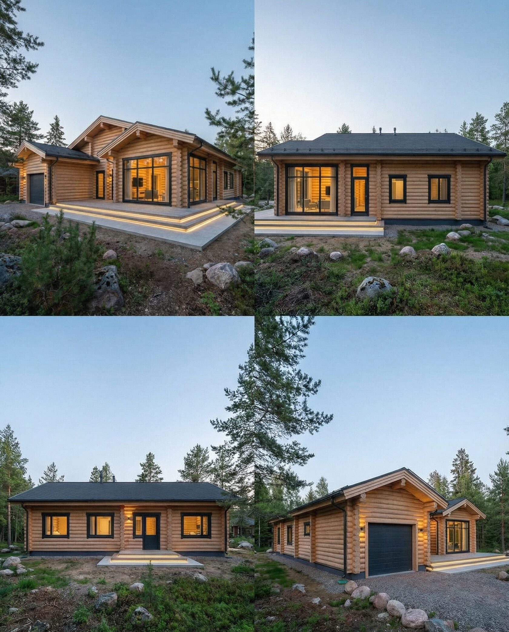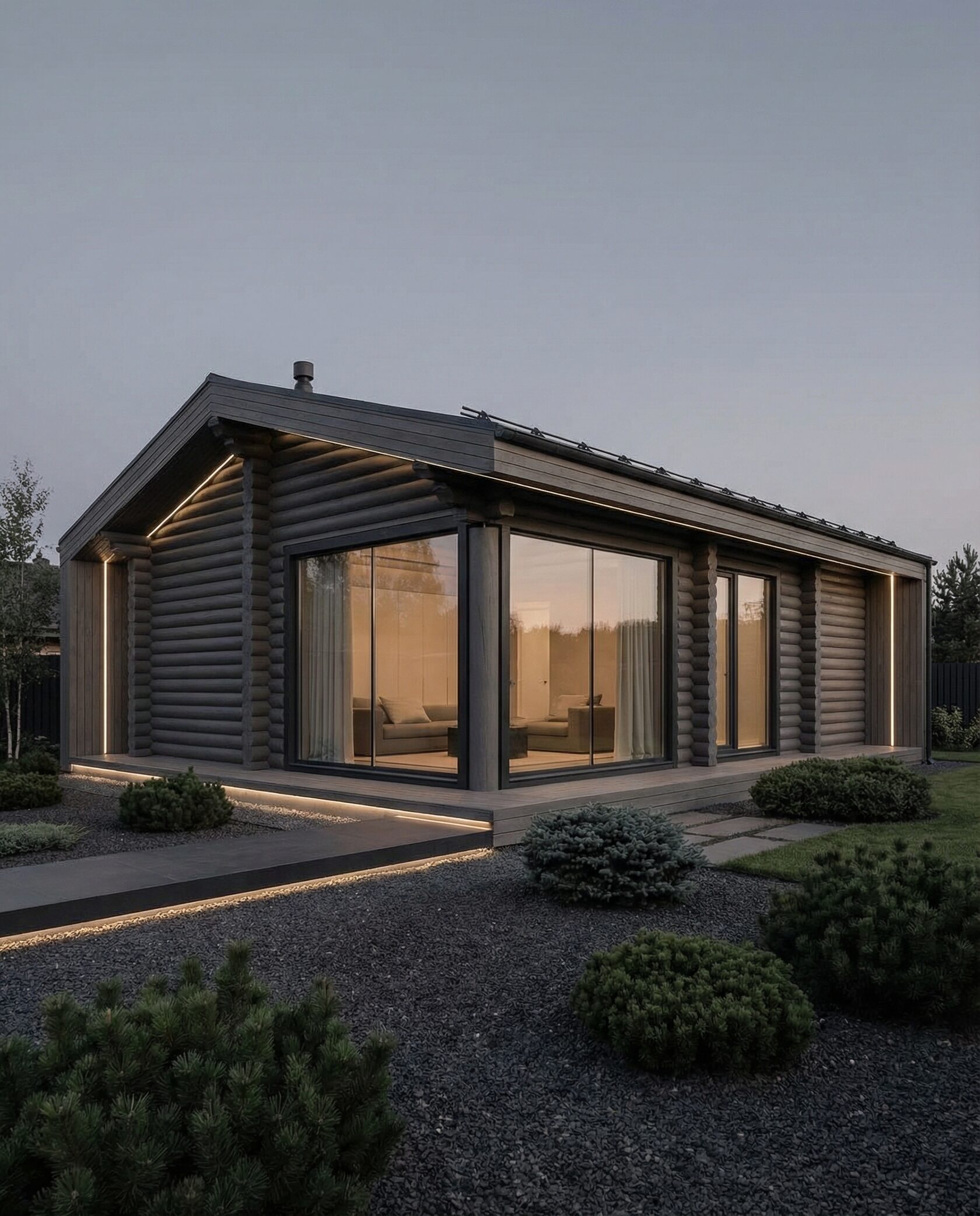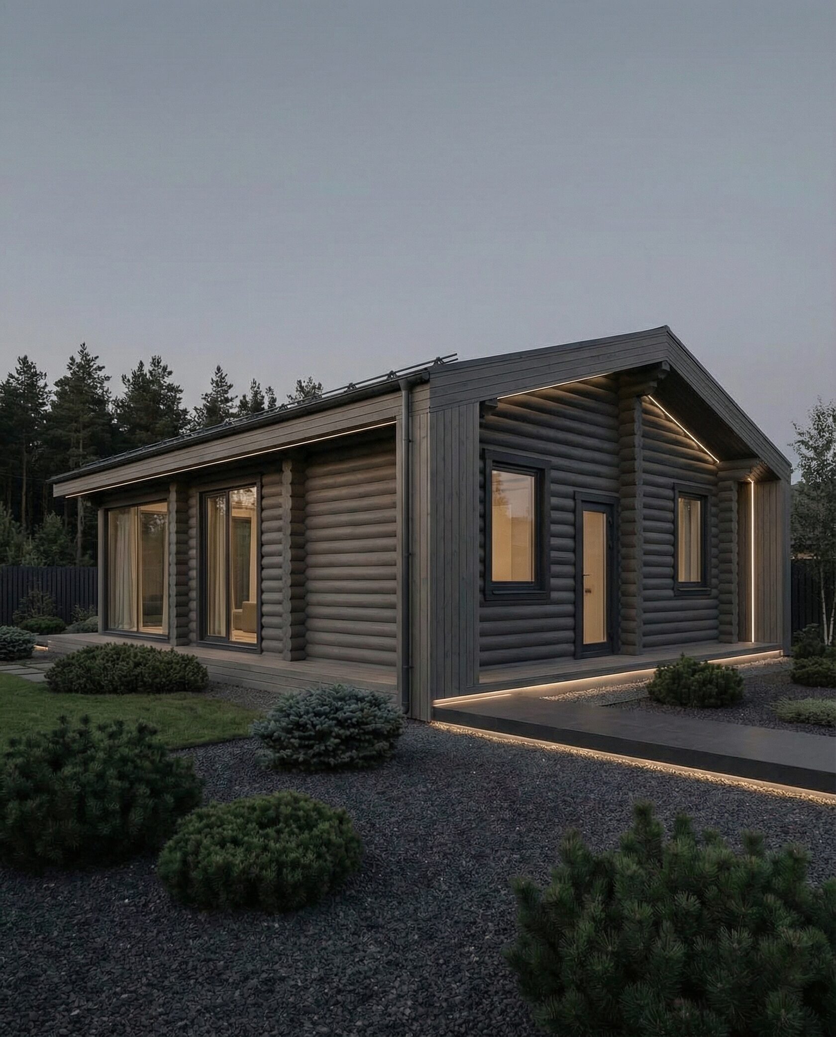 Дом «Элькор» — одноэтажный современный коттедж из бревен с угловым панорамным остеклением, открытой планировкой и камином. Светлое дерево и натуральные материалы создают гармонию с лесным окружением. Преимущества: современный минимализм, панорамные окна, просторная гостиная, естественное освещение, приватность и интеграция с природой.