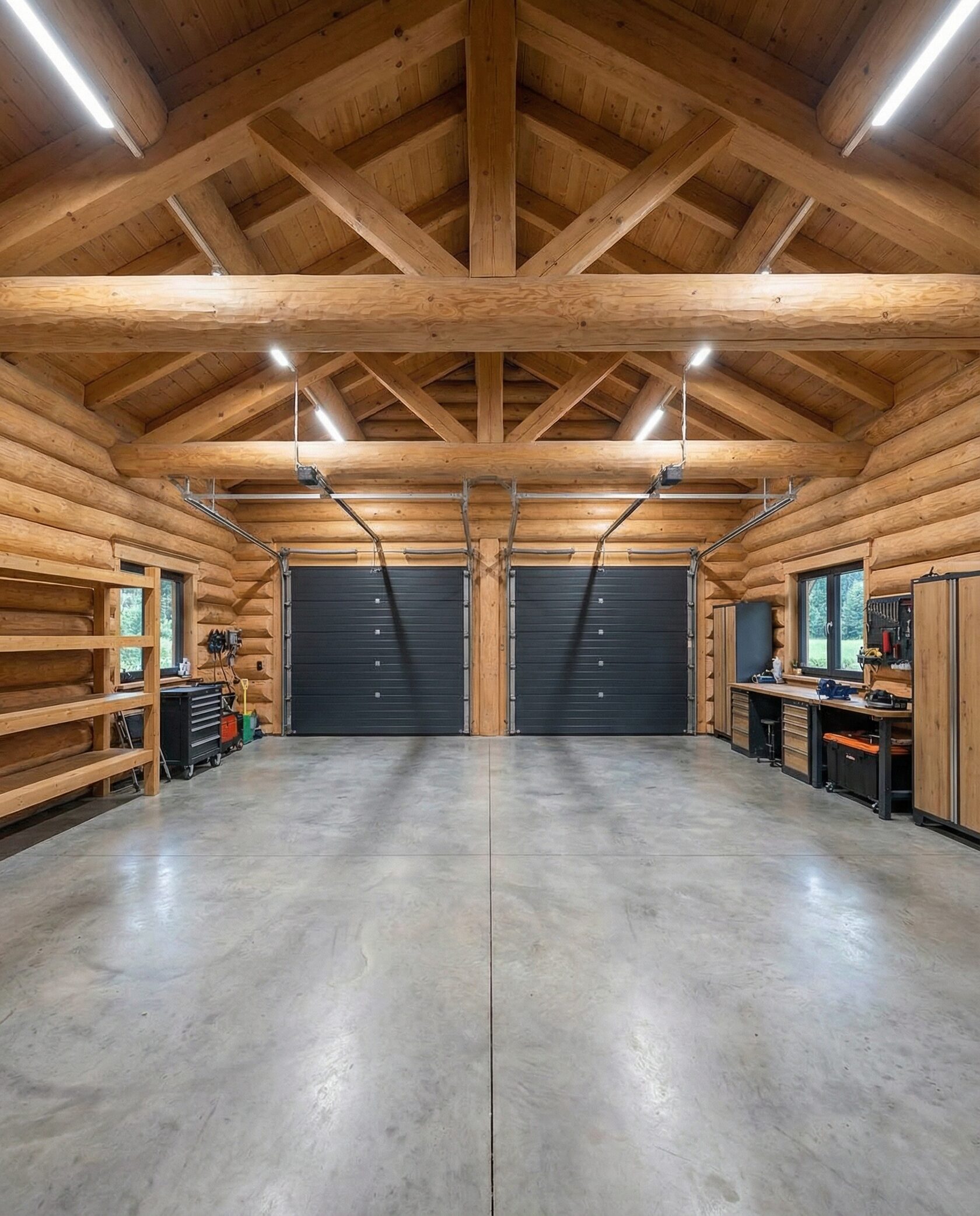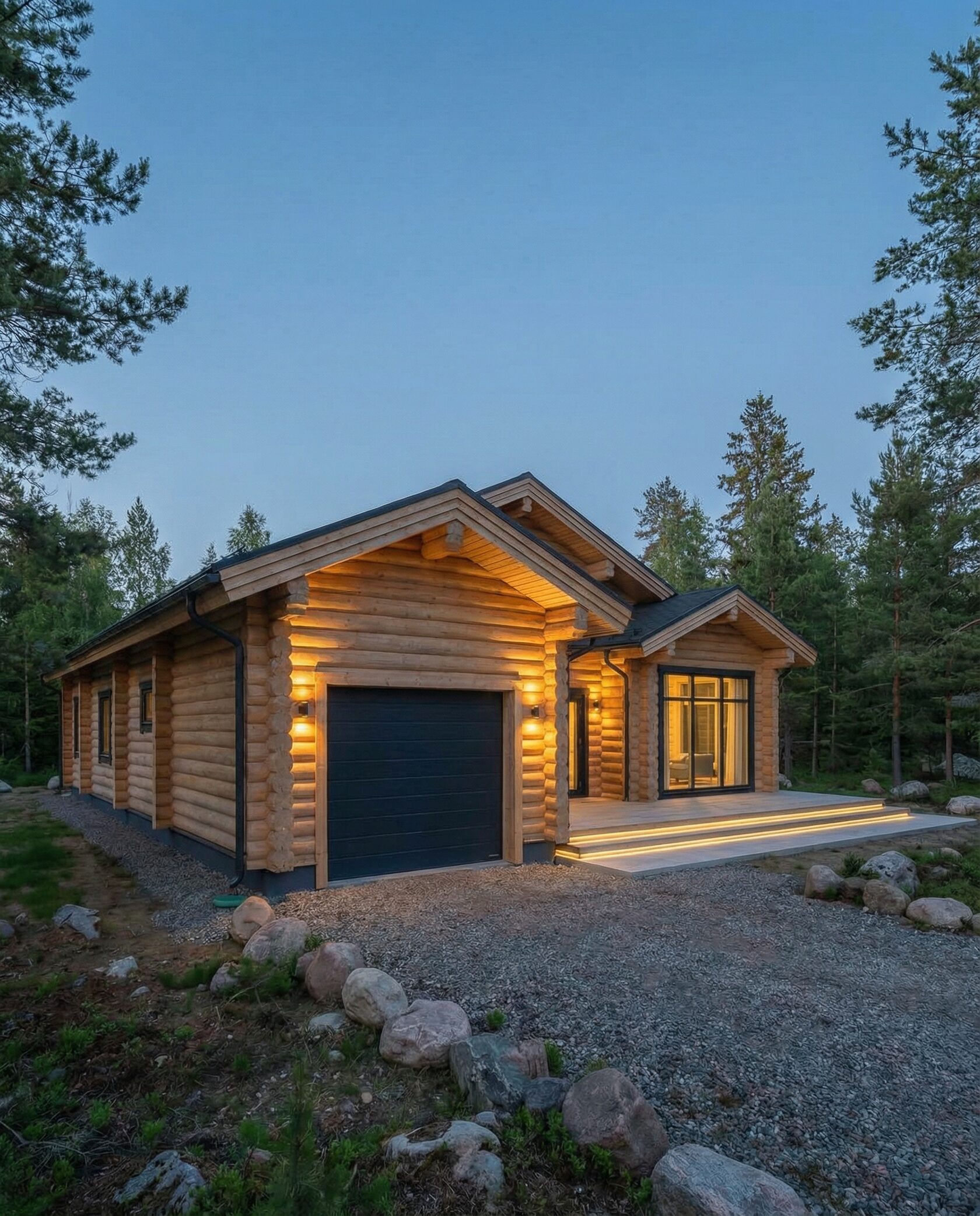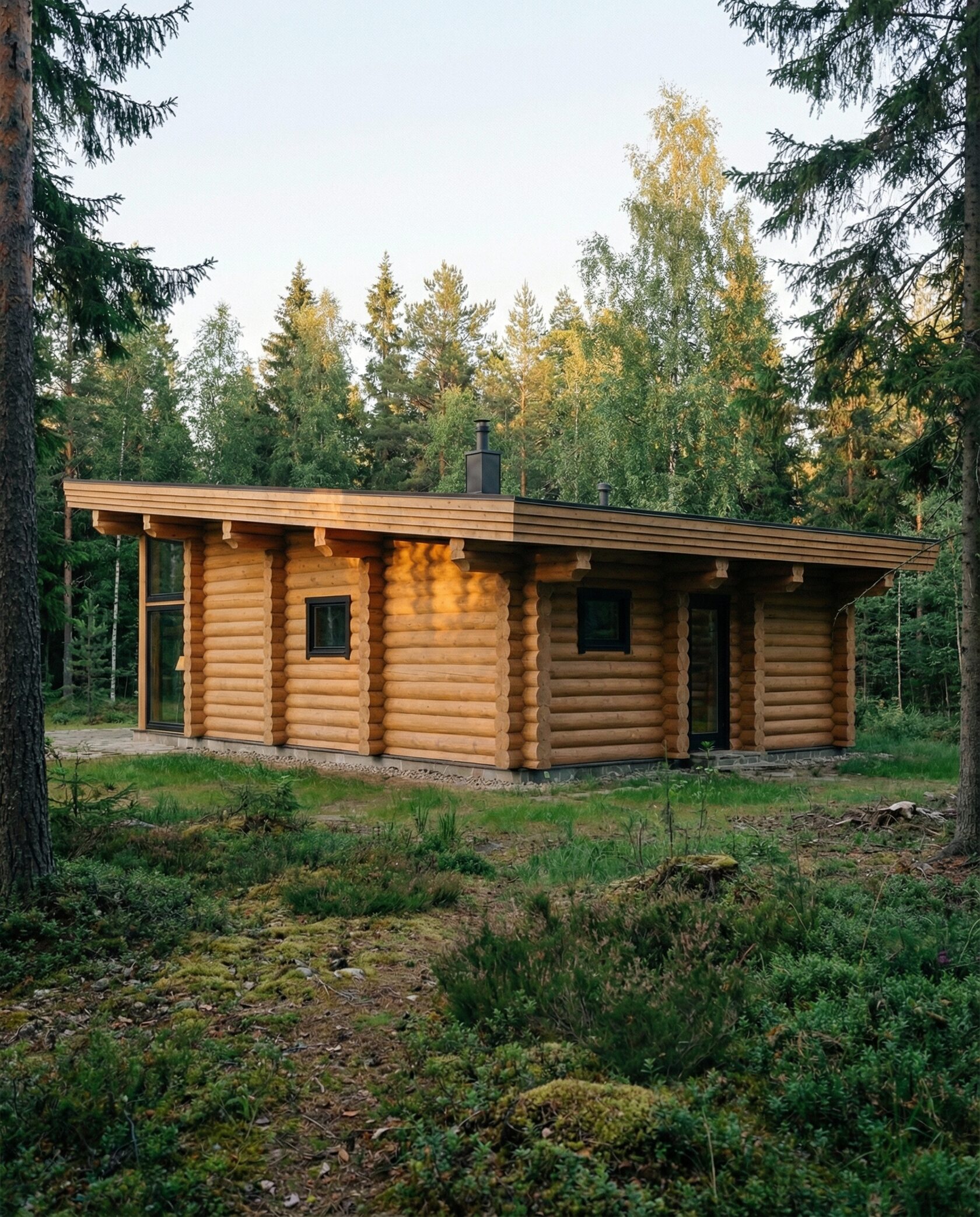 Дом «Элькор» — одноэтажный современный коттедж из бревен с угловым панорамным остеклением, открытой планировкой и камином. Светлое дерево и натуральные материалы создают гармонию с лесным окружением. Преимущества: современный минимализм, панорамные окна, просторная гостиная, естественное освещение, приватность и интеграция с природой.