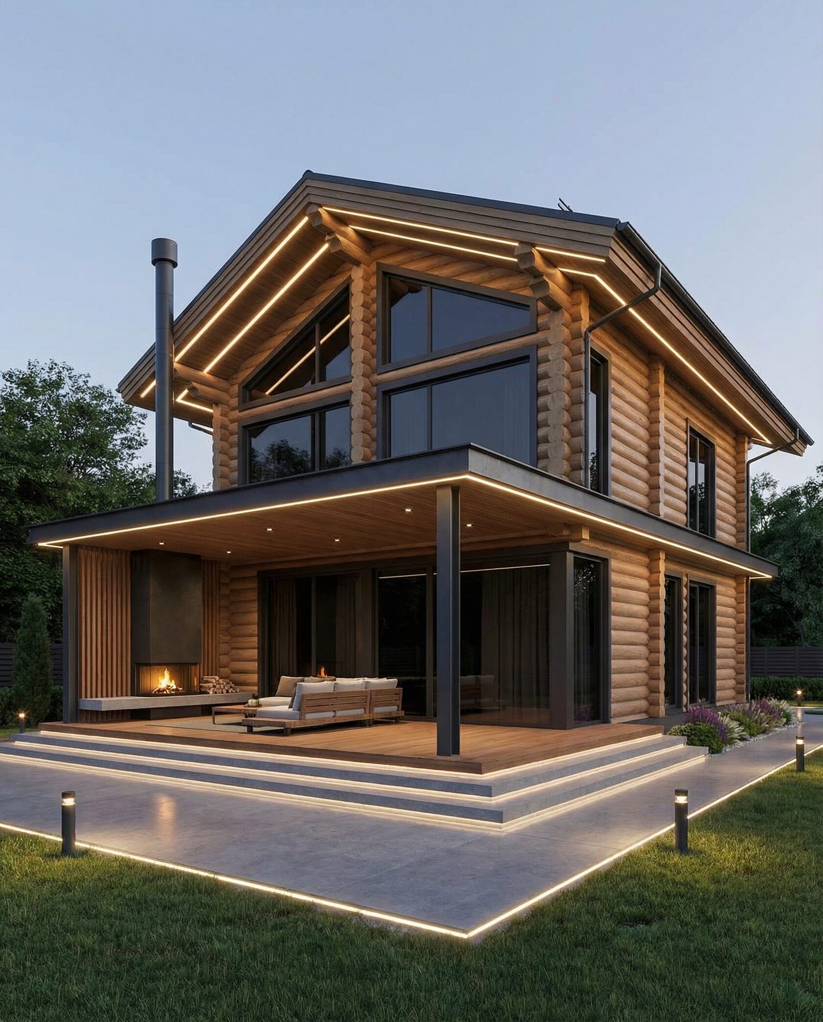 Дом «Гамма» — современный двухэтажный дом в стиле минимализм с панорамными окнами и эффектной подсветкой фасада. Светлая гостиная с камином объединена с кухней и столовой в единое двусветное пространство, создавая ощущение свободы и максимального контакта с природой. Второй этаж с прозрачными ограждениями сохраняет визуальную легкость, а большая терраса расширяет зону отдыха на свежем воздухе. Преимущества: минимализм, панорамное остекление, открытая планировка, камин, прозрачные зоны, большая терраса, экологичные материалы. Дом «Гамма» — идеальный выбор для тех, кто ценит простор, приватность и гармонию с природой.