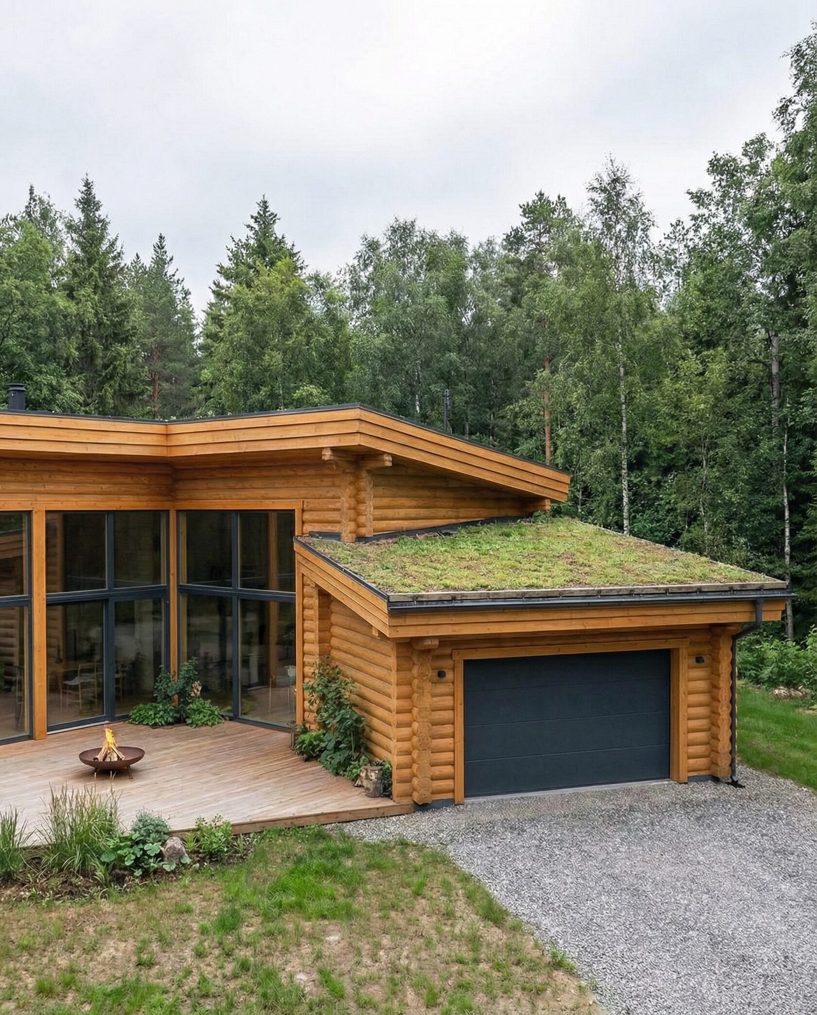 Дом «Мегрец» — современный загородный дом из натуральных материалов с панорамными окнами и просторной террасой вокруг. Гостиная, кухня и столовая объединены в открытую зону с камином, а приватные спальни с видом на лес создают уединение и гармонию с природой. Преимущества: современный стиль, терраса, панорамное остекление, камин, светлые интерьеры, приватные спальни, натуральные материалы.