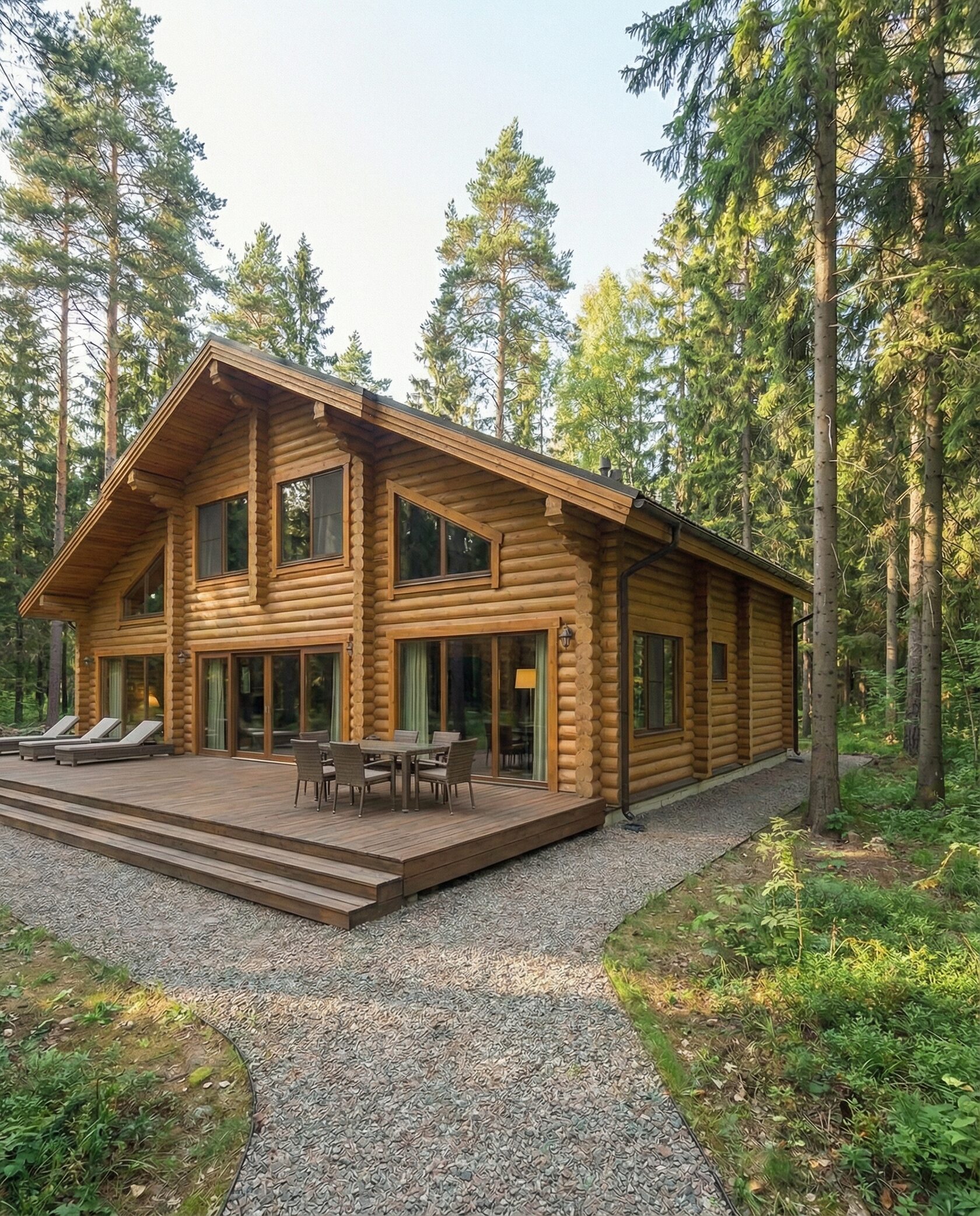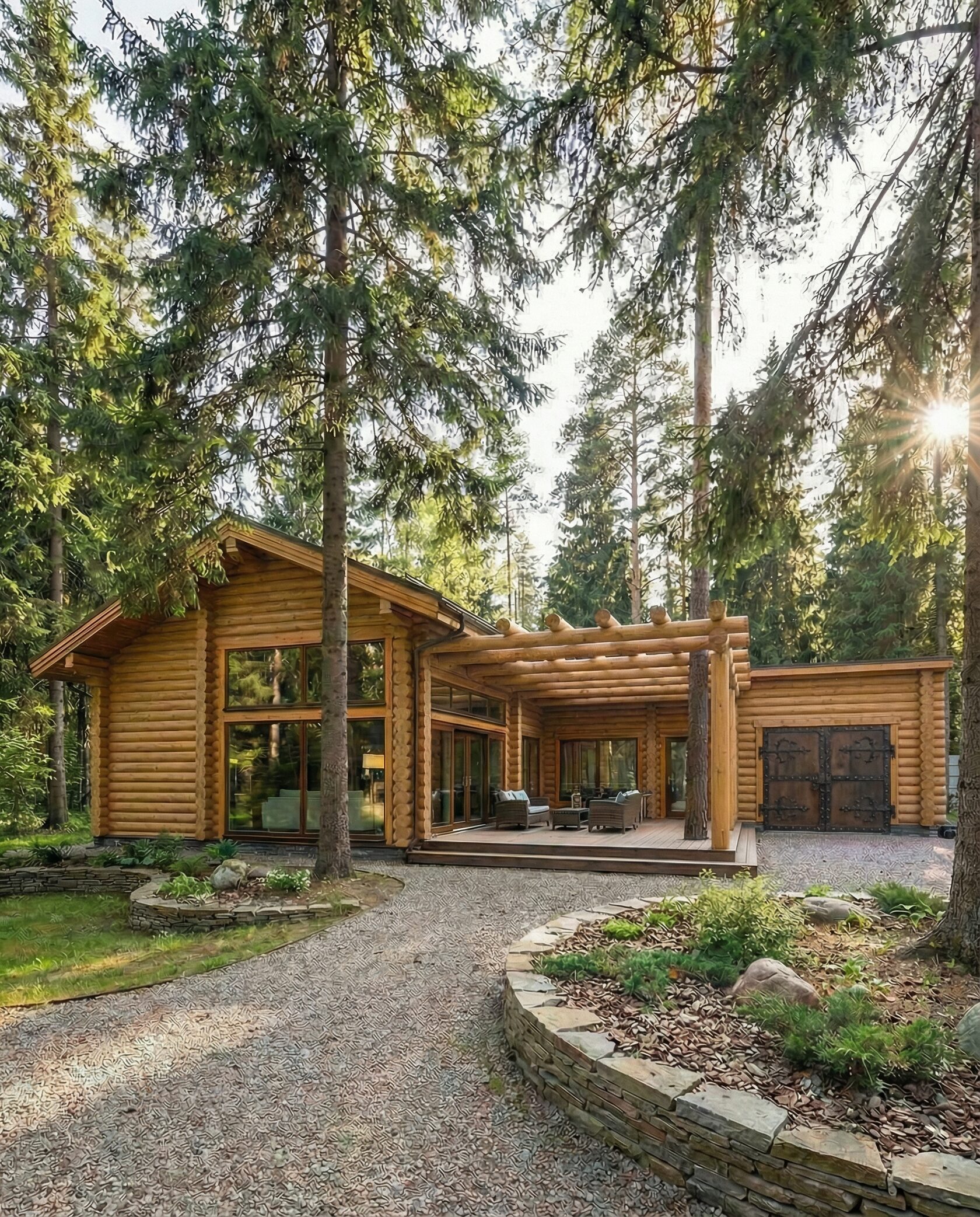 Дом «Альтаир» — загородный дом из оцилиндрованного бревна, сочетающий современные архитектурные решения и традиционную эстетику дерева. Панорамные окна и эркеры наполняют интерьер светом и открывают виды на лес или горы, а большая терраса создаёт просторную зону для отдыха на свежем воздухе. Внутри — двусветная гостиная с камином, кухня-столовая и функциональное зонирование пространства. Натуральное дерево обеспечивает теплоизоляцию, экологичность и комфортный микроклимат круглый год. Преимущества: энергосбережение, высокая естественная освещённость, эффектная архитектура с открытыми балками, просторная терраса, шумоизоляция и долговечность. Дом «Альтаир» — идеальный выбор для семьи, ценящей уют, комфорт и гармонию с природой.