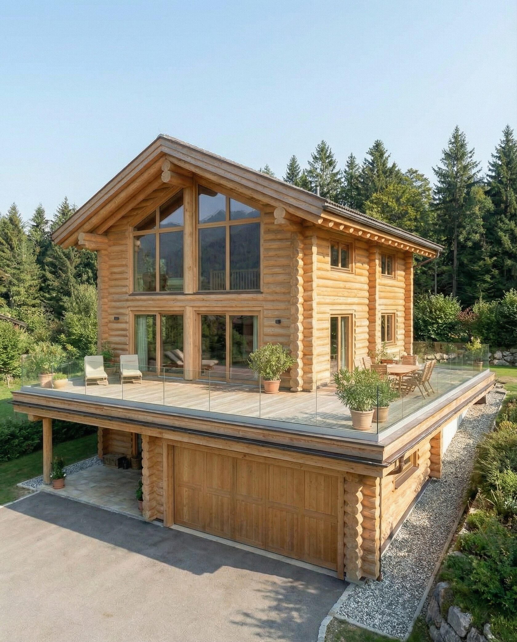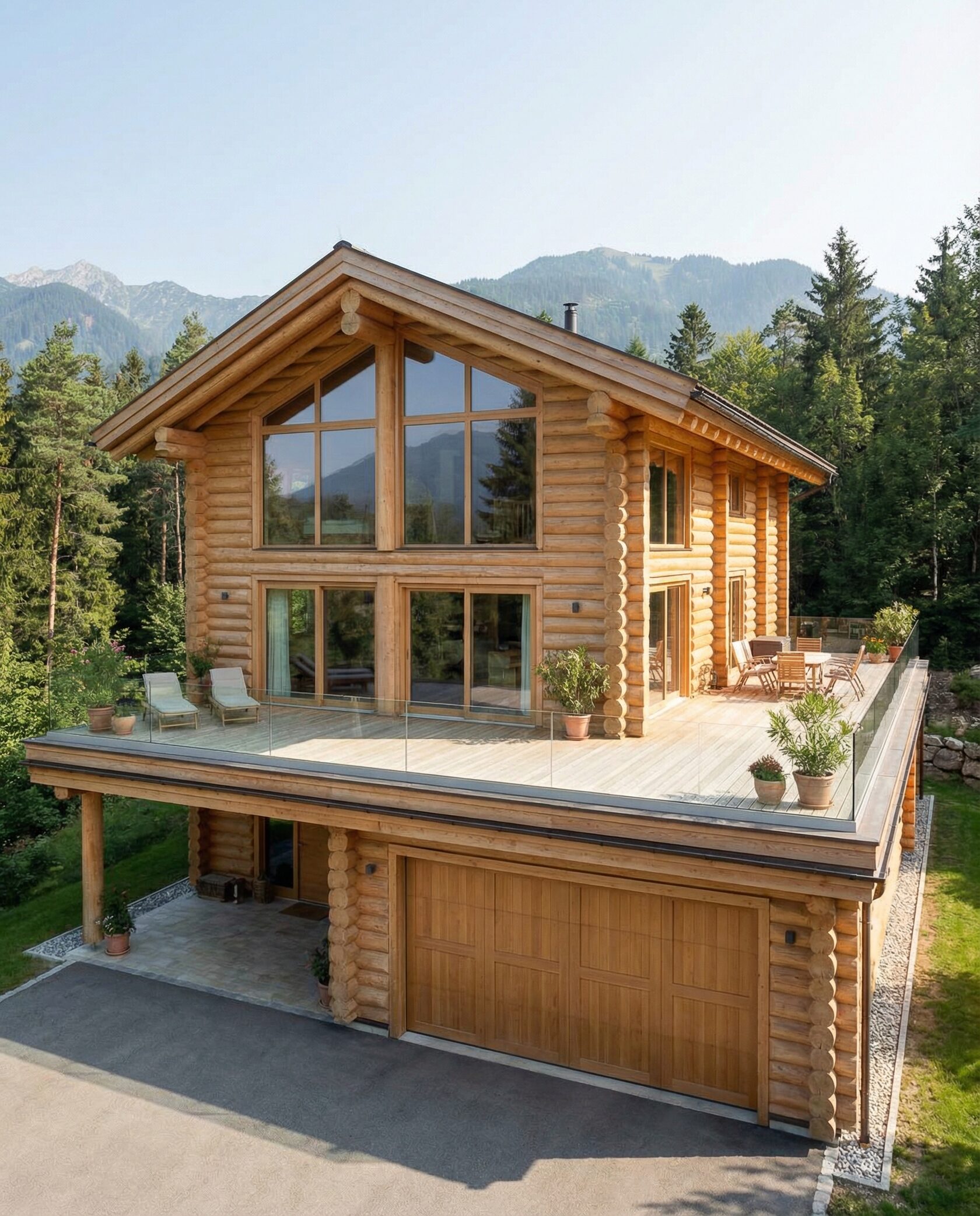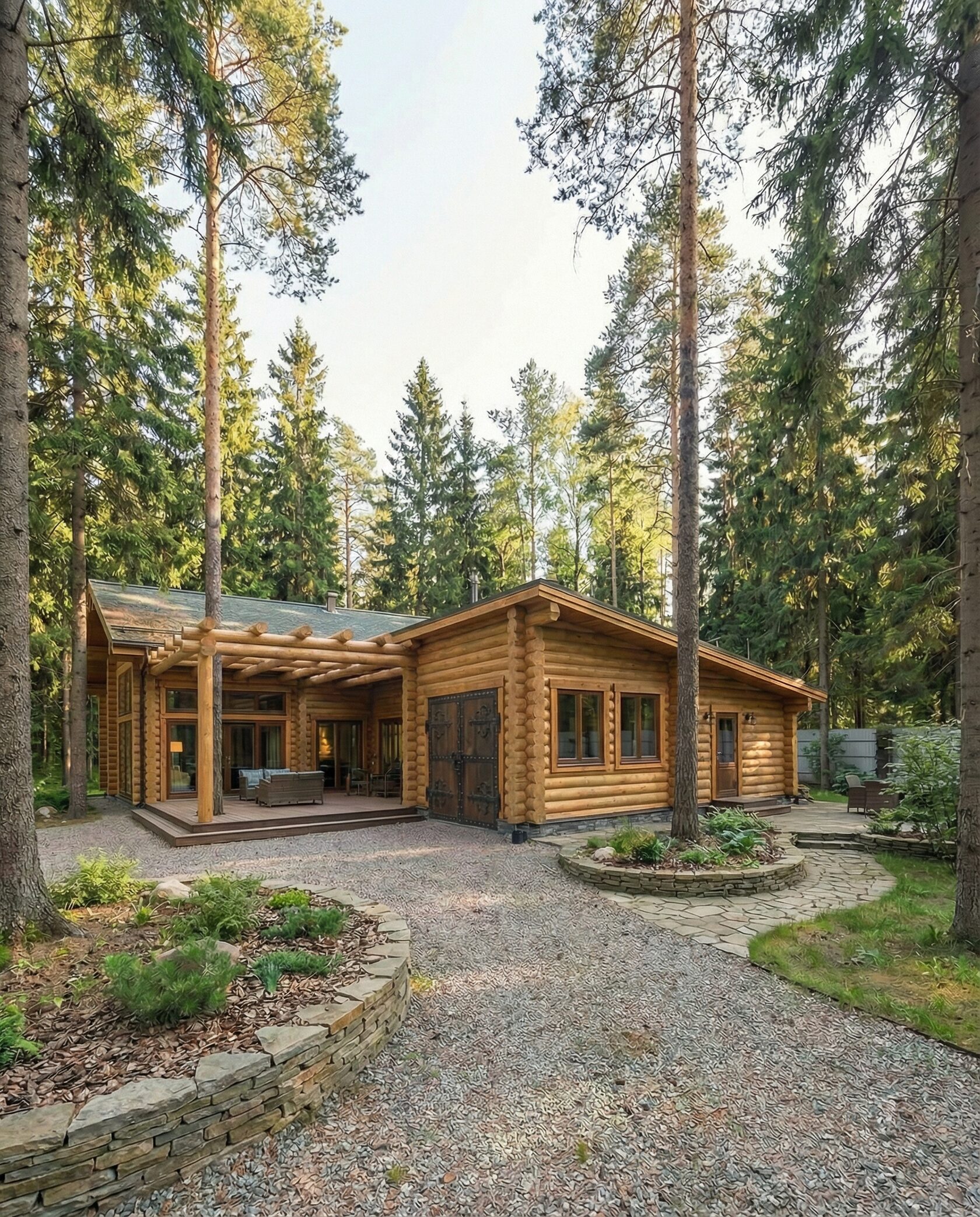 Дом «Мирафед» — современный проект из оцилиндрованного бревна, сочетающий традиционные деревянные технологии и актуальные архитектурные решения. Строгая геометрия фасада и крупное остекление наполняют помещения естественным светом, создавая ощущение единения с природой. Конструкция выполнена из тщательно обработанного бревна с отличной теплоизоляцией, обеспечивая комфортный микроклимат и экономию в отопительный сезон. Натуральное дерево поддерживает оптимальную влажность и стабильную температуру внутри дома. Фасад выдержан в стиле шале: просторная терраса, широкие свесы кровли, выразительные деревянные балки, панорамные окна визуально объединяют интерьер с ландшафтом. Высокие потолки и открытые конструкции стропильной системы создают ощущение простора. В гостиной центральный элемент — камин, подчёркивающий уют. Планировка продумана с точки зрения функциональности: двусветный зал, объединённый с кухней и обеденной зоной, зона отдыха, современный гараж на два автомобиля с местами для хранения. Преимущества проекта: долговечность, энергоэффективность, шумоизоляция, эстетика и стиль, продуманная организация пространства. Дом «Мирафед» — идеальный выбор для тех, кто ищет надёжный, красивый и функциональный загородный дом с уютом и близостью к природе.