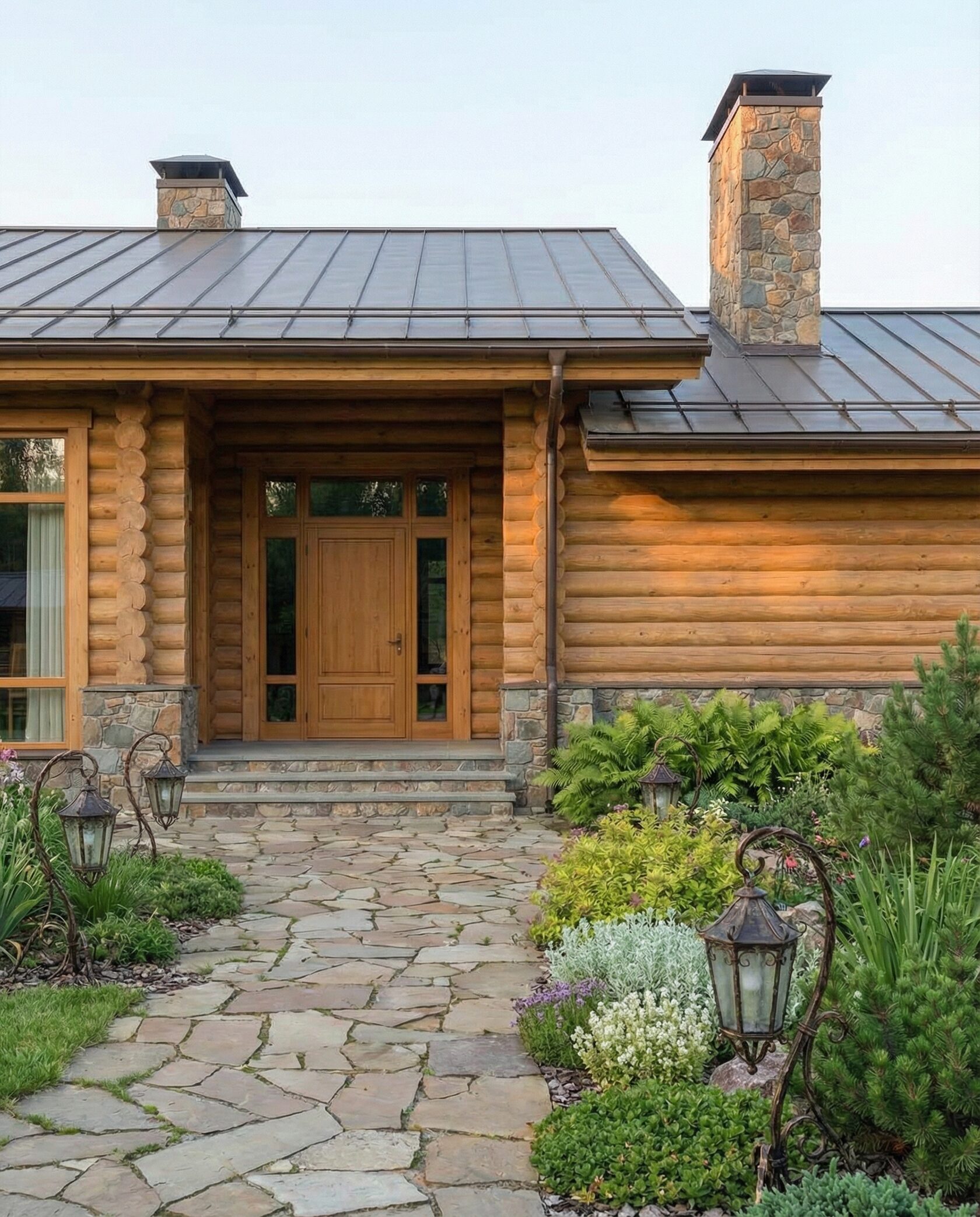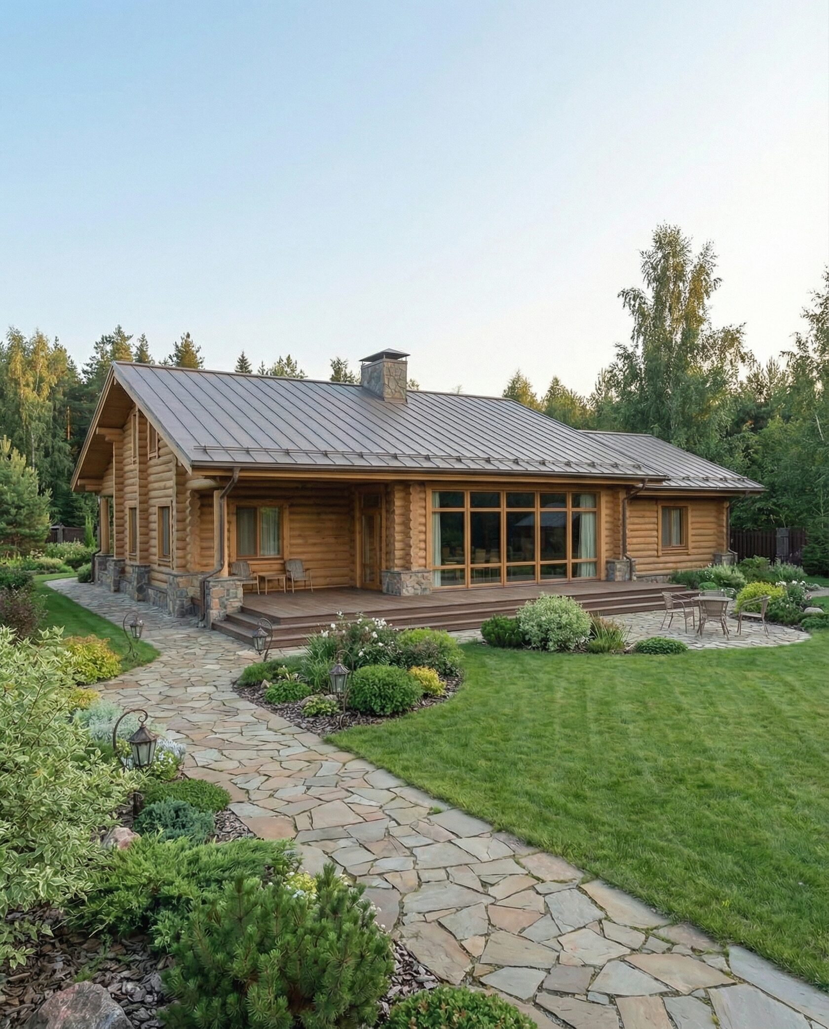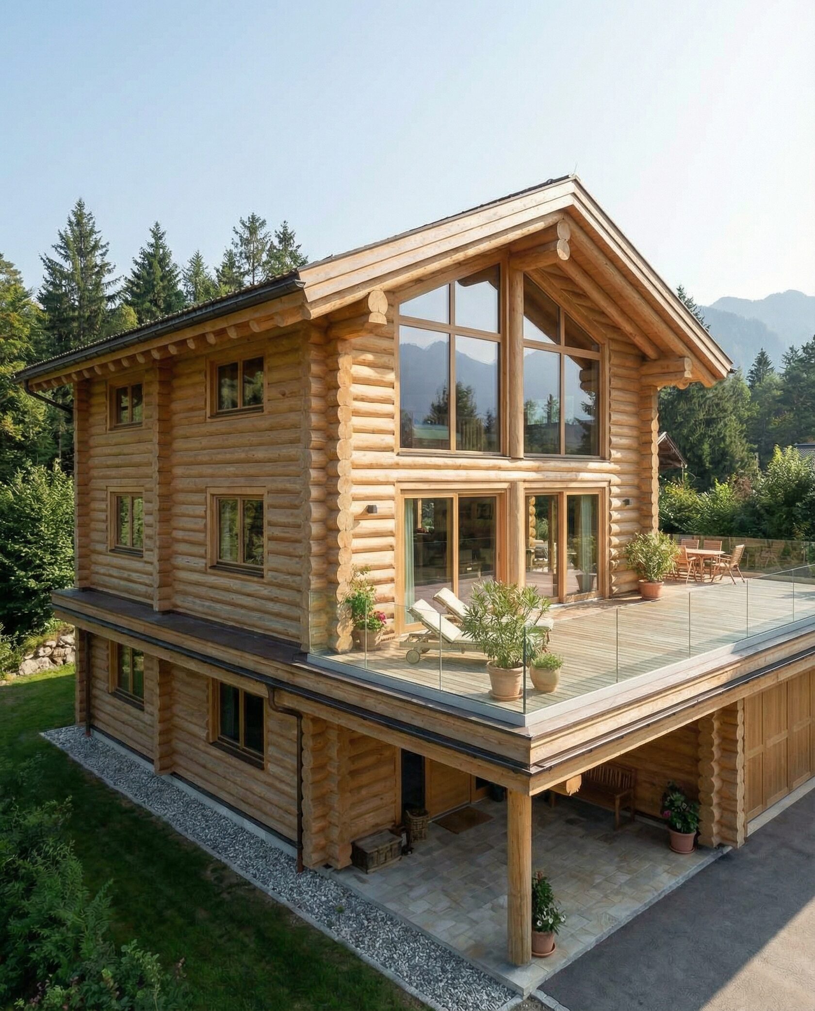 Дом «Мирафед» — современный проект из оцилиндрованного бревна, сочетающий традиционные деревянные технологии и актуальные архитектурные решения. Строгая геометрия фасада и крупное остекление наполняют помещения естественным светом, создавая ощущение единения с природой. Конструкция выполнена из тщательно обработанного бревна с отличной теплоизоляцией, обеспечивая комфортный микроклимат и экономию в отопительный сезон. Натуральное дерево поддерживает оптимальную влажность и стабильную температуру внутри дома. Фасад выдержан в стиле шале: просторная терраса, широкие свесы кровли, выразительные деревянные балки, панорамные окна визуально объединяют интерьер с ландшафтом. Высокие потолки и открытые конструкции стропильной системы создают ощущение простора. В гостиной центральный элемент — камин, подчёркивающий уют. Планировка продумана с точки зрения функциональности: двусветный зал, объединённый с кухней и обеденной зоной, зона отдыха, современный гараж на два автомобиля с местами для хранения. Преимущества проекта: долговечность, энергоэффективность, шумоизоляция, эстетика и стиль, продуманная организация пространства. Дом «Мирафед» — идеальный выбор для тех, кто ищет надёжный, красивый и функциональный загородный дом с уютом и близостью к природе.